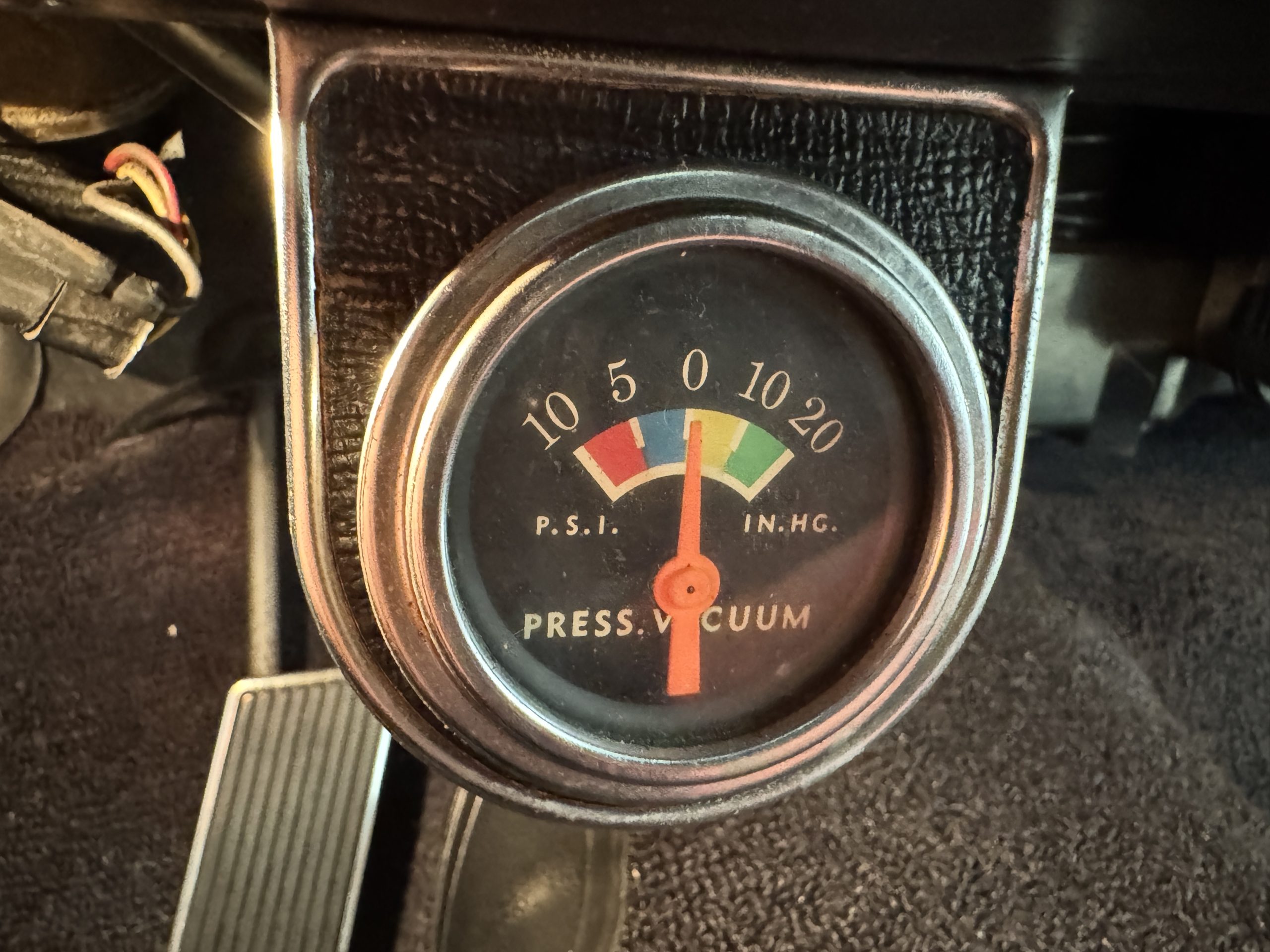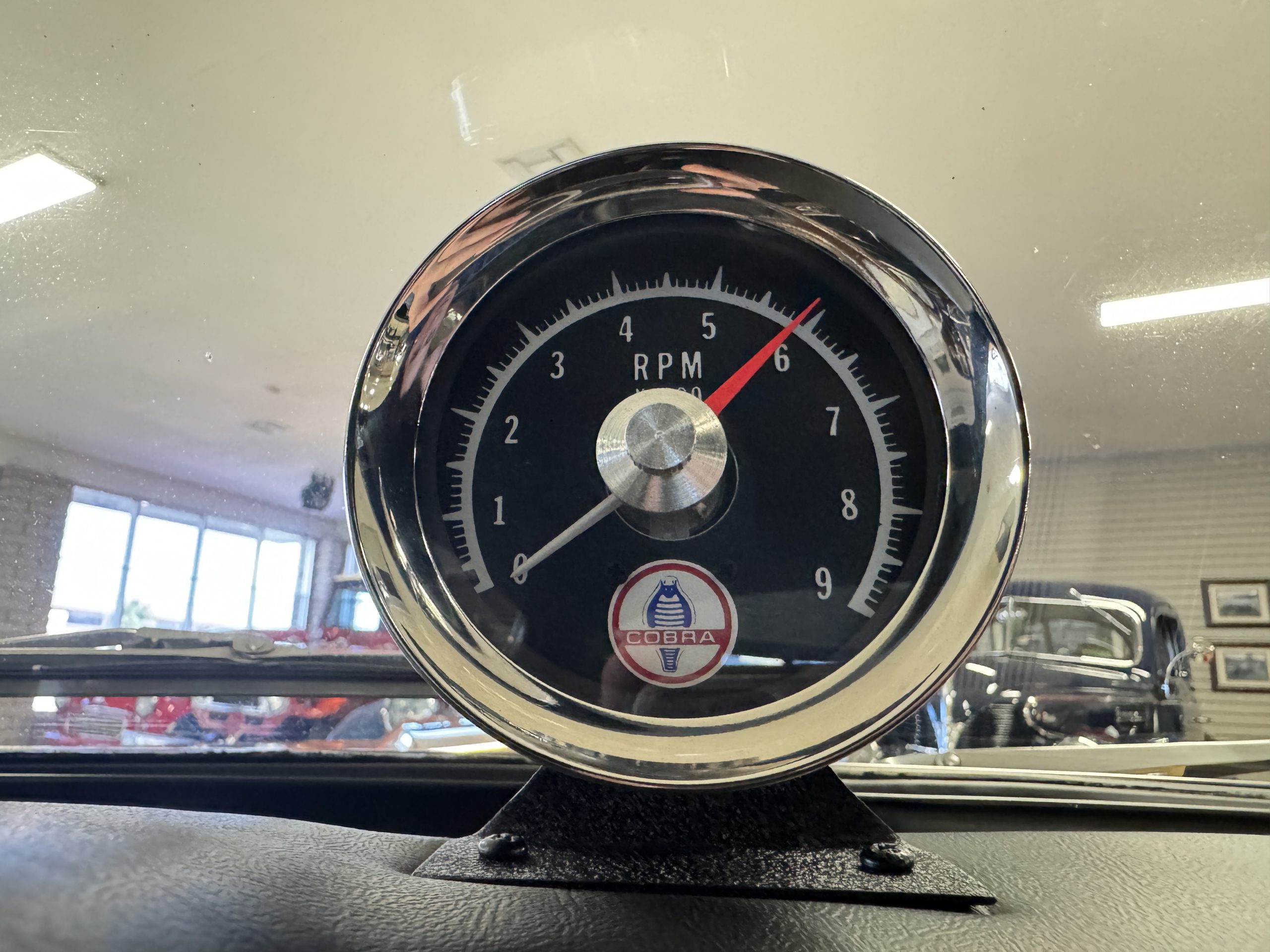 The simulated wood–rimmed tilt-away steering wheel is paired with a Cobra-branded shifter and frames a 140-mph speedometer flanked by gauges for fuel-level, oil-pressure, amperage, and coolant-temperature. A Cobra-branded 9k-rpm tachometer is mounted atop the dash, while a vacuum pressure gauge has been added below. The five-digit odometer shows 80k miles, approximately 150 of which have been added under current ownership.