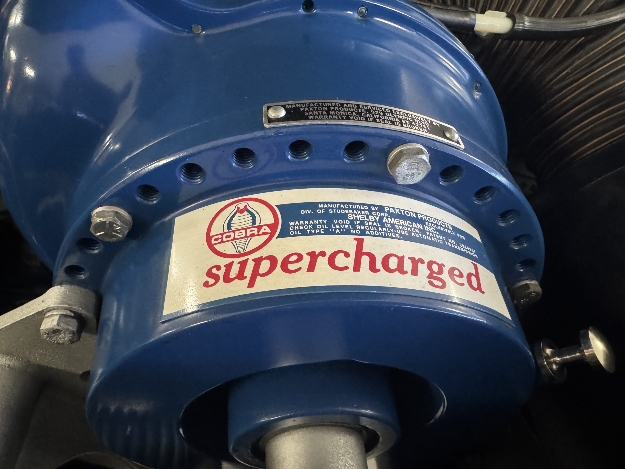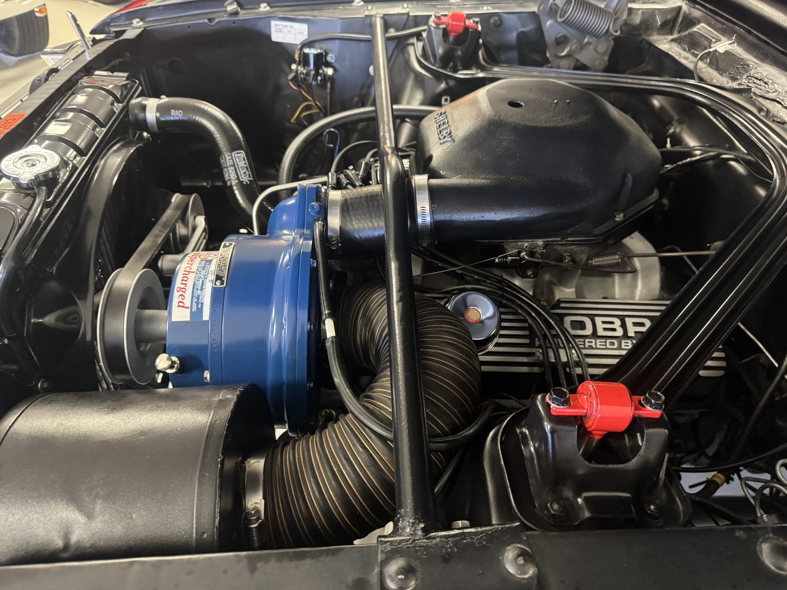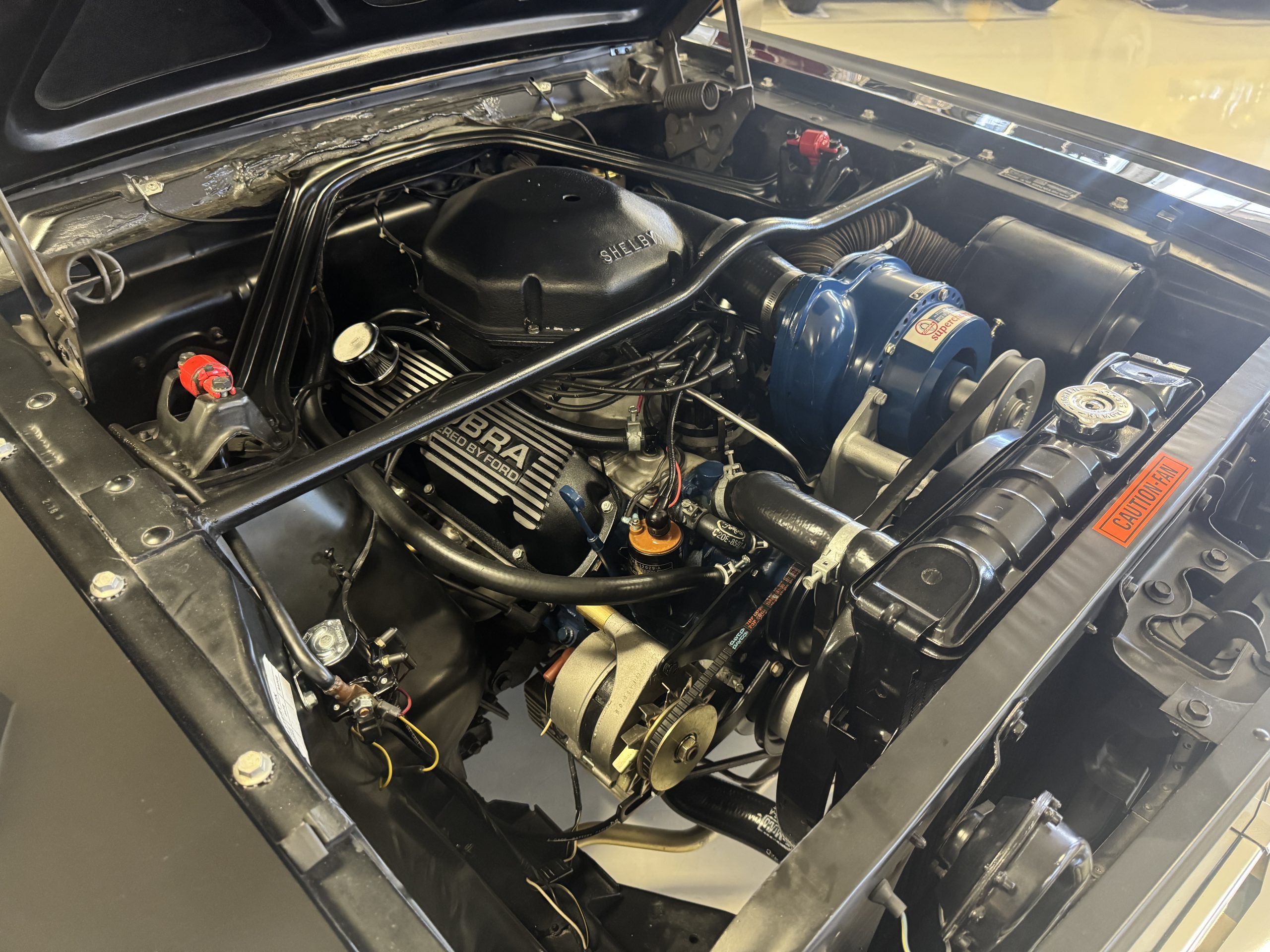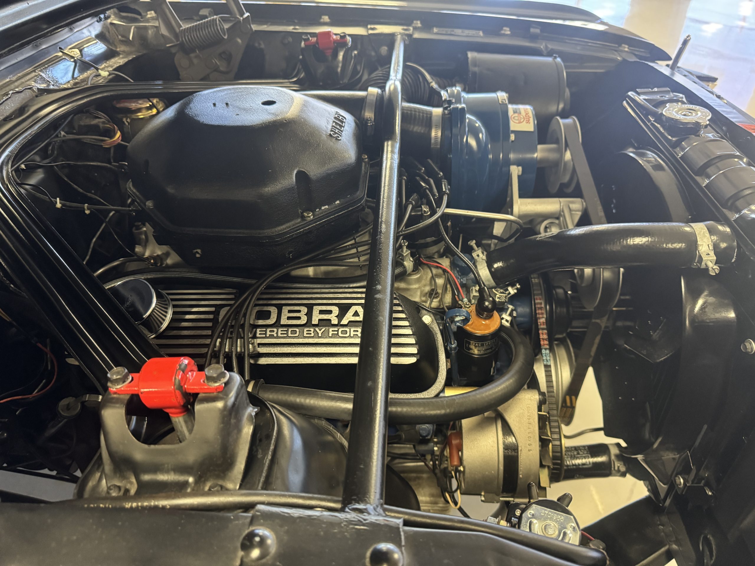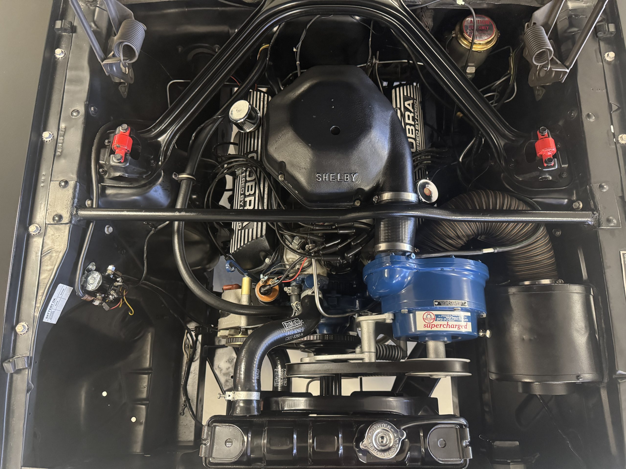 Shelby modified the 289ci HiPo V8 with a cast-aluminum high-rise intake manifold for the 595-CFM Autolite carburetor as well as a baffled aluminum oil pan. This unit has been fitted with a Paxton supercharger and wears black-finished Cobra-branded valve covers.