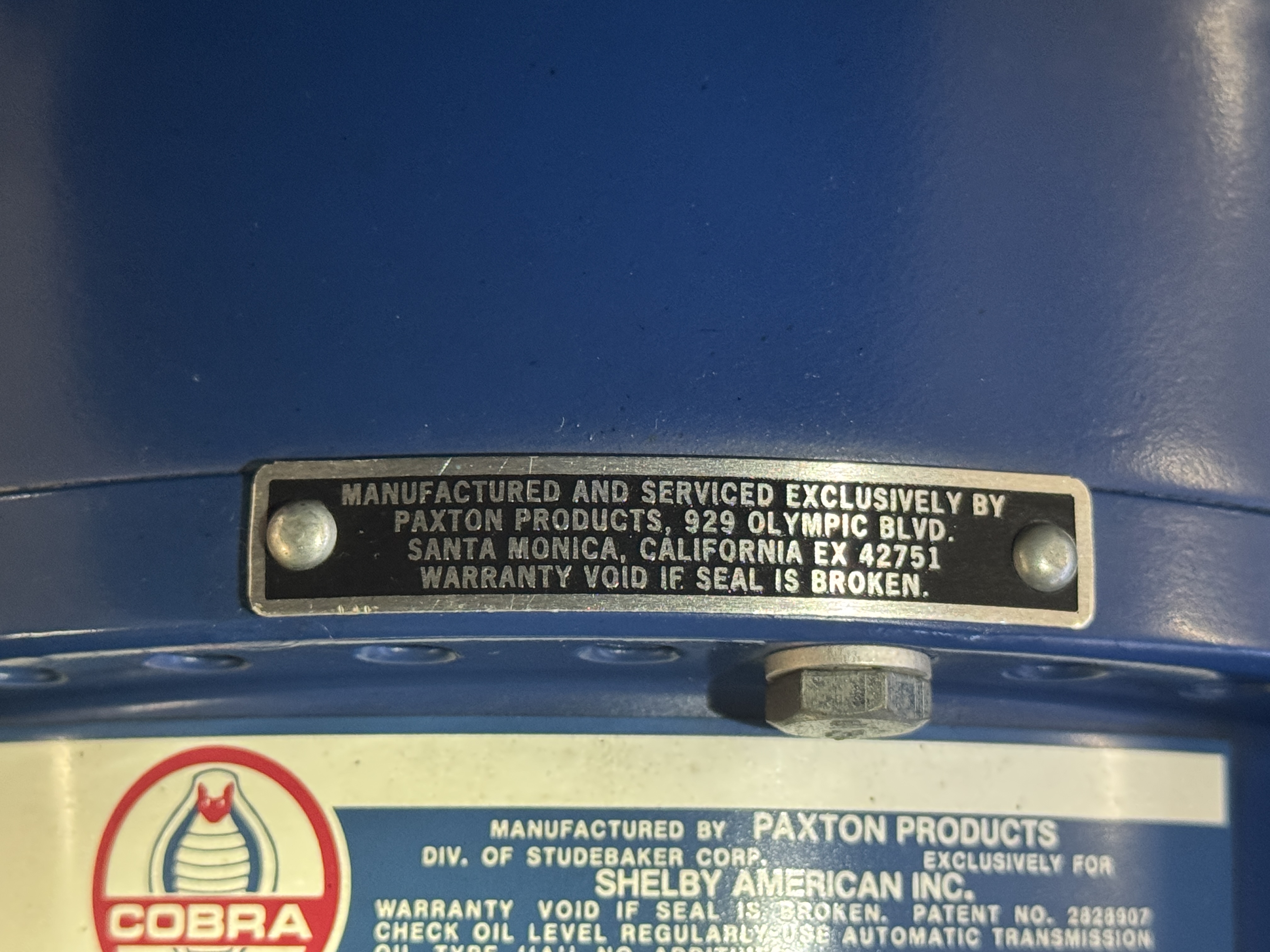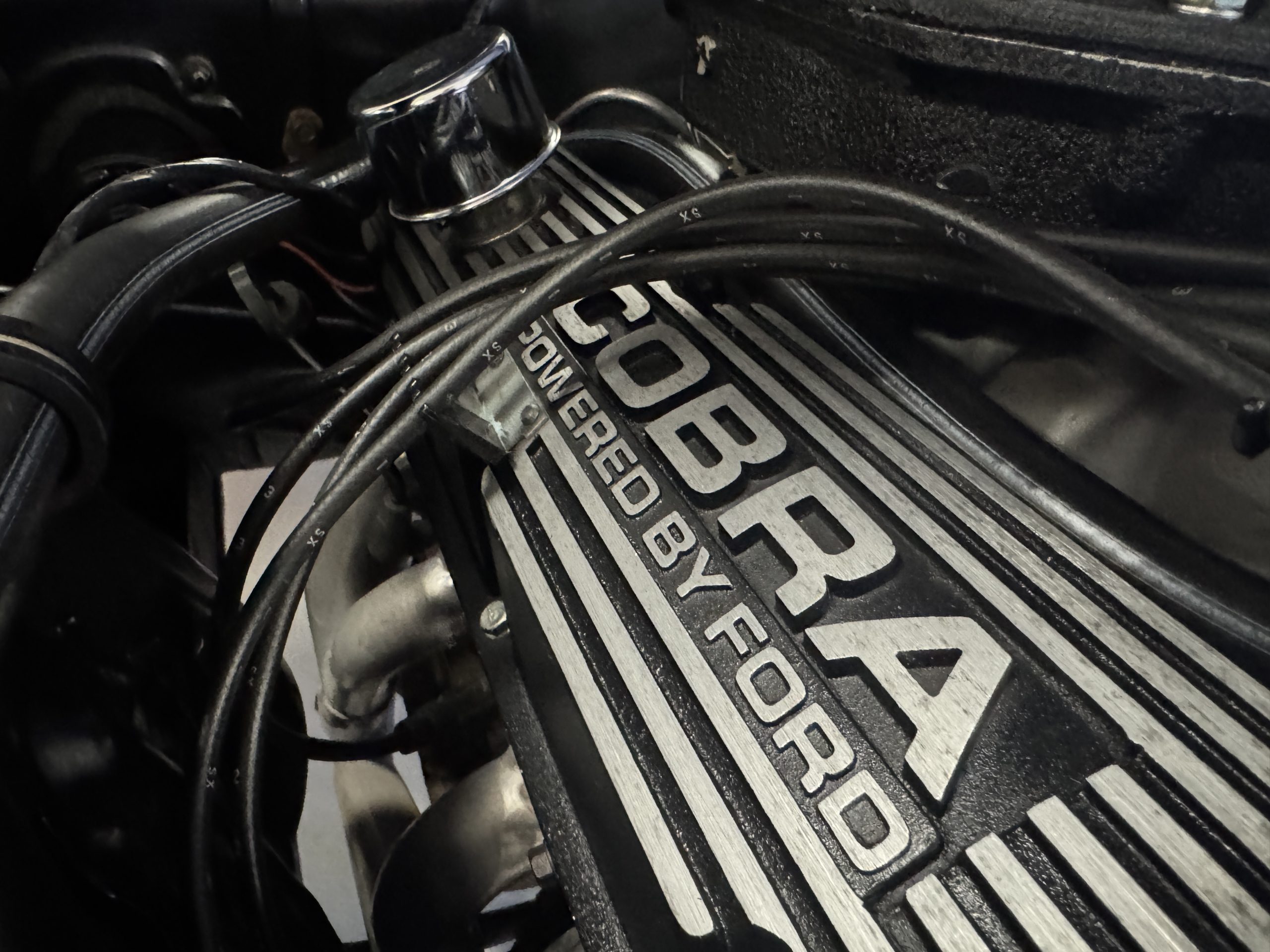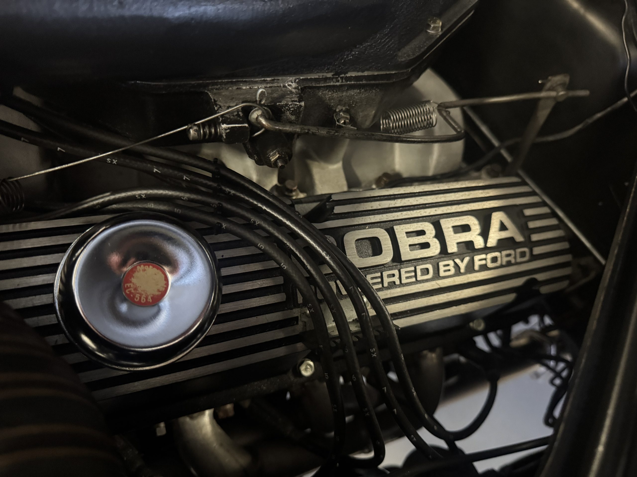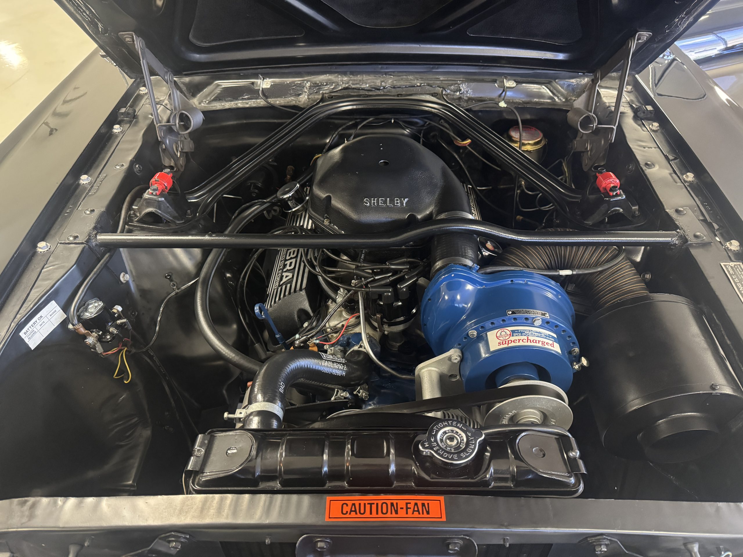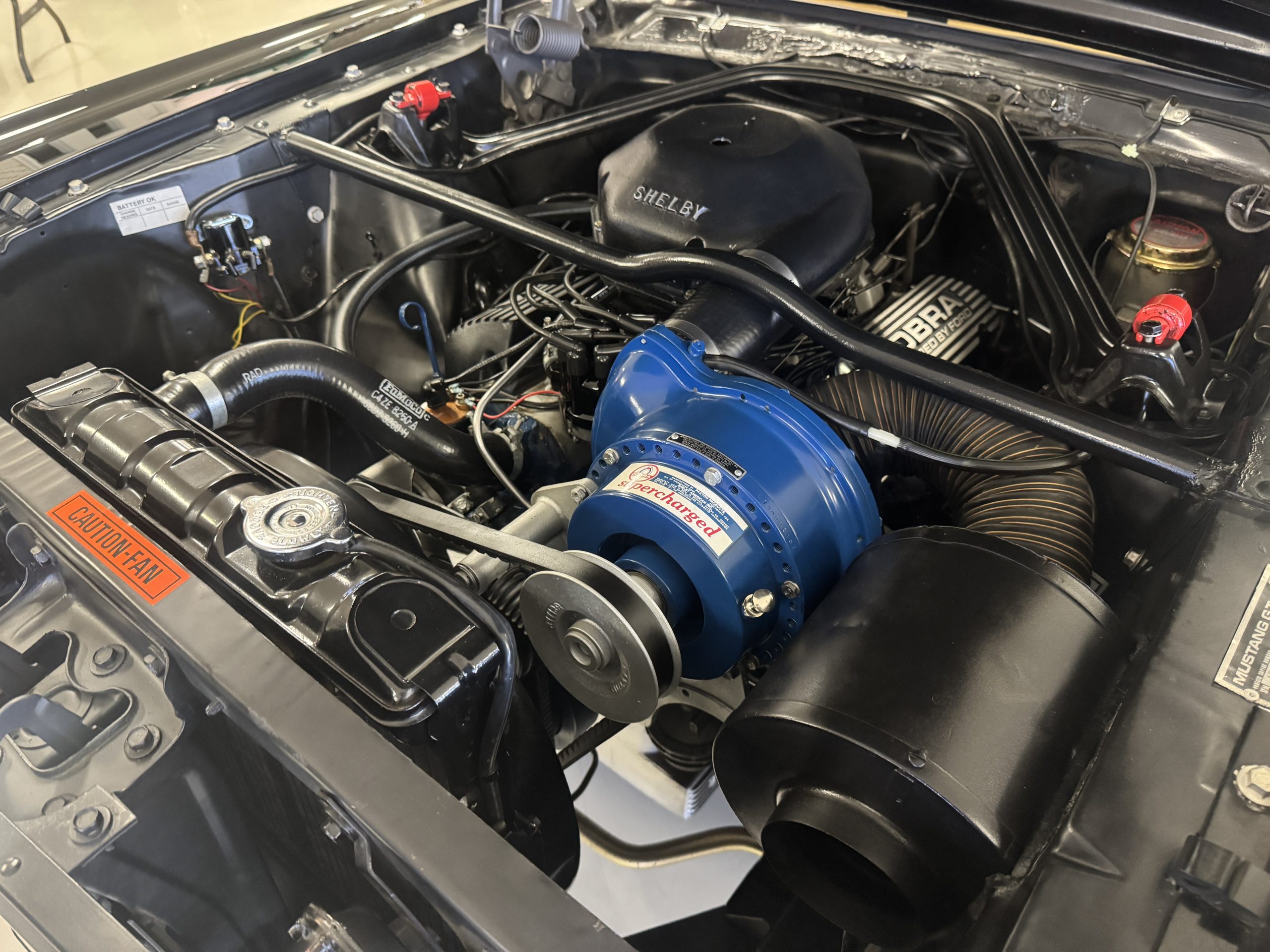 Shelby modified the 289ci HiPo V8 with a cast-aluminum high-rise intake manifold for the 595-CFM Autolite carburetor as well as a baffled aluminum oil pan. This unit has been fitted with a Paxton supercharger and wears black-finished Cobra-branded valve covers.
