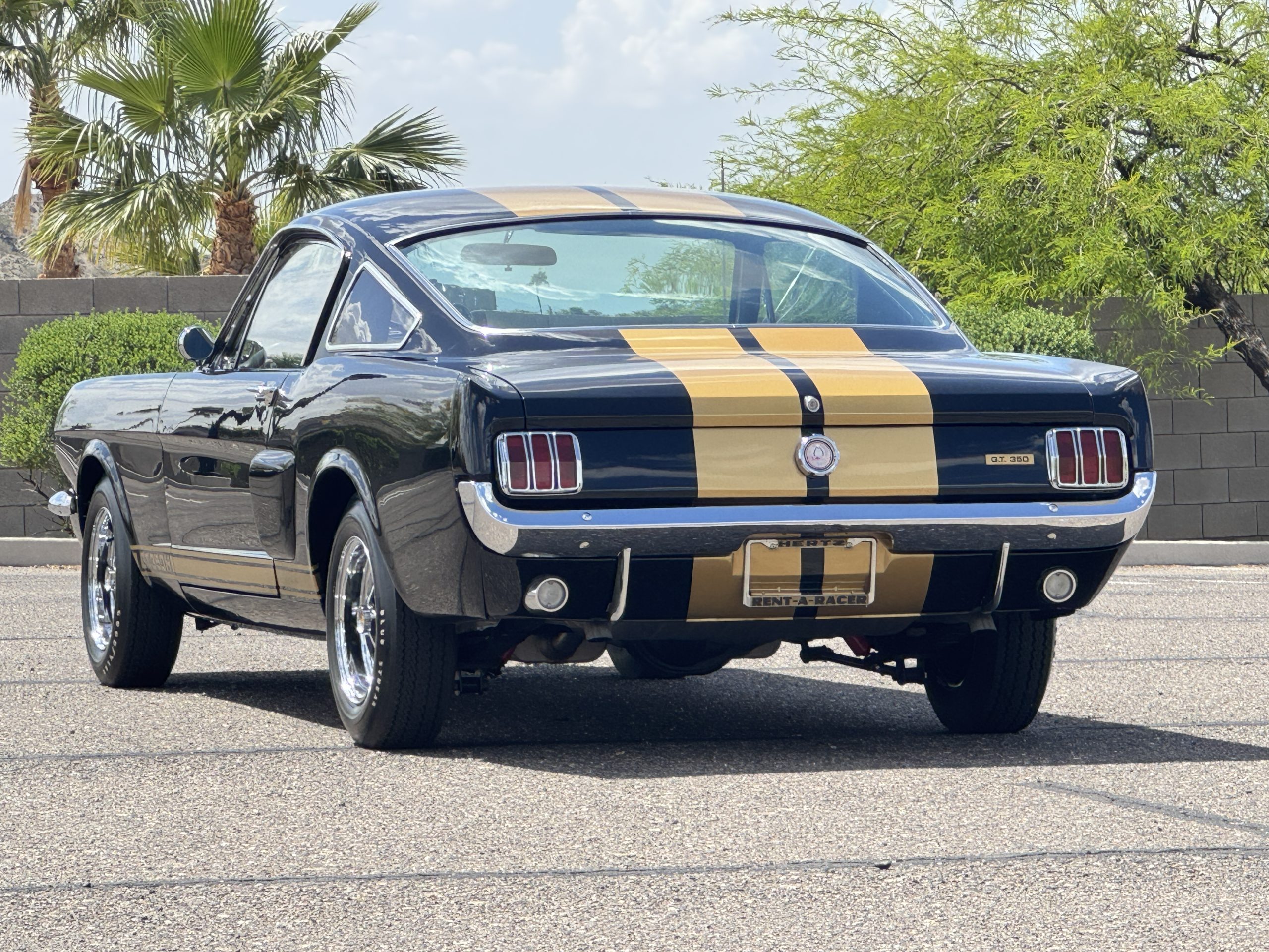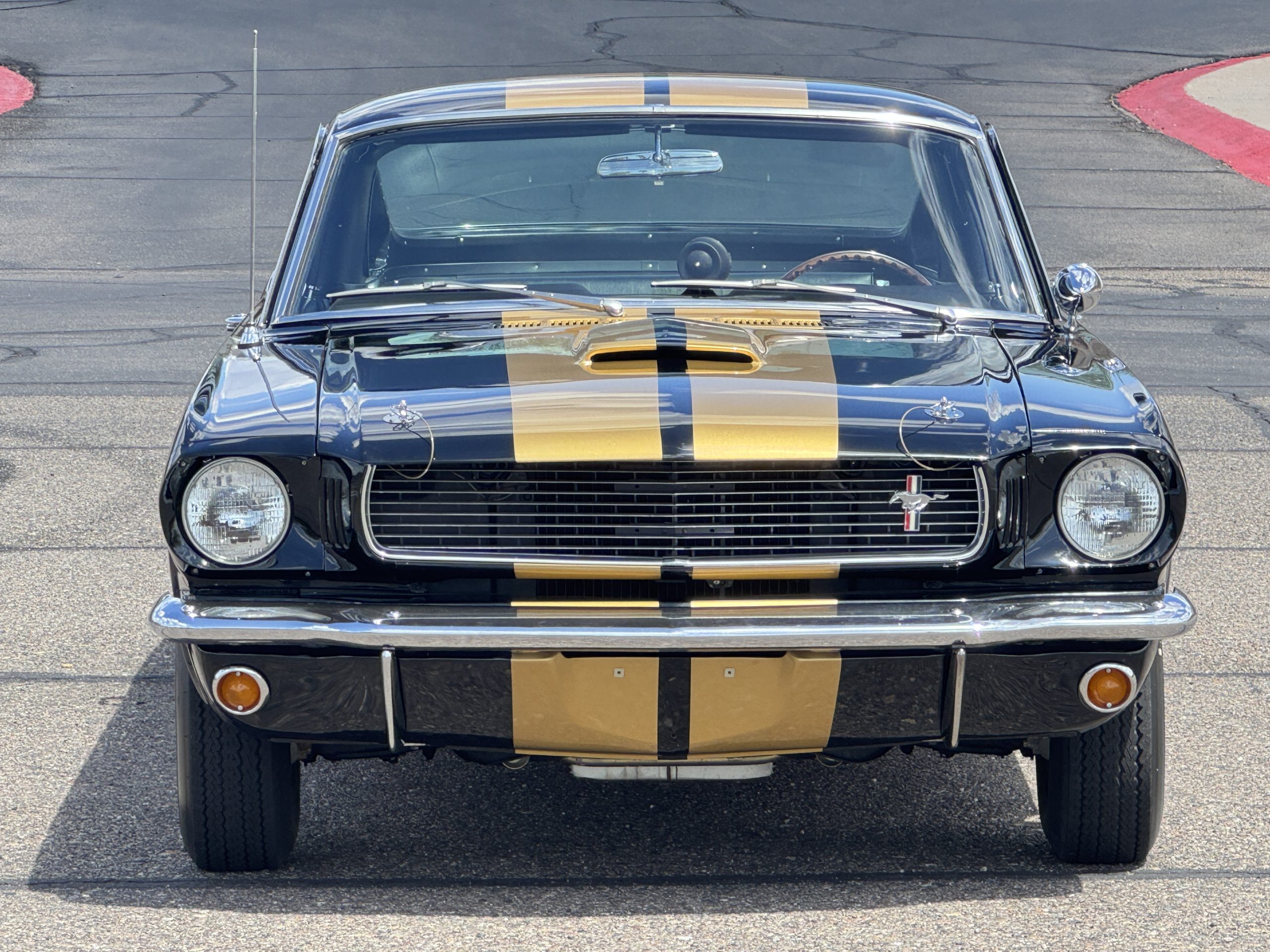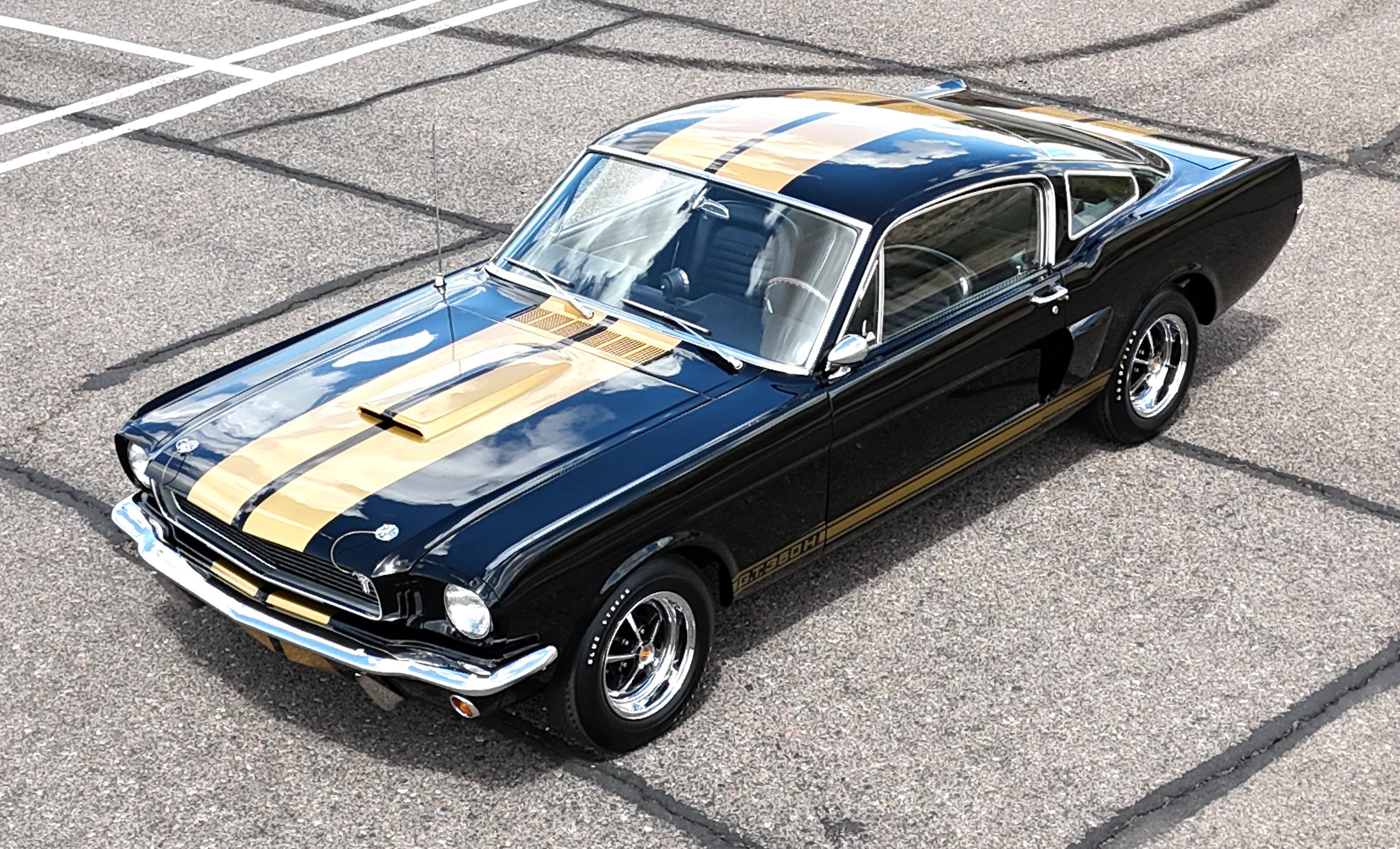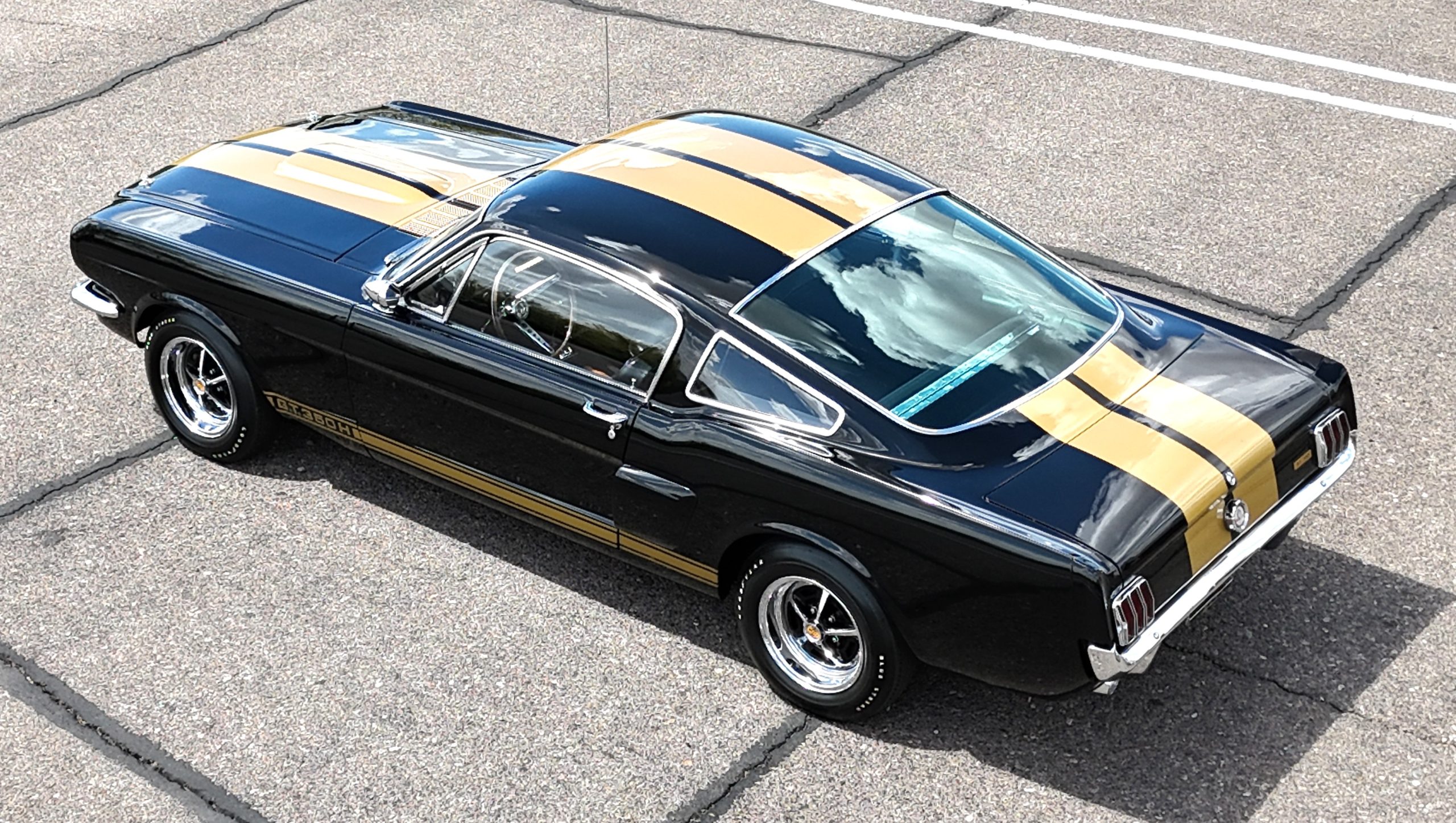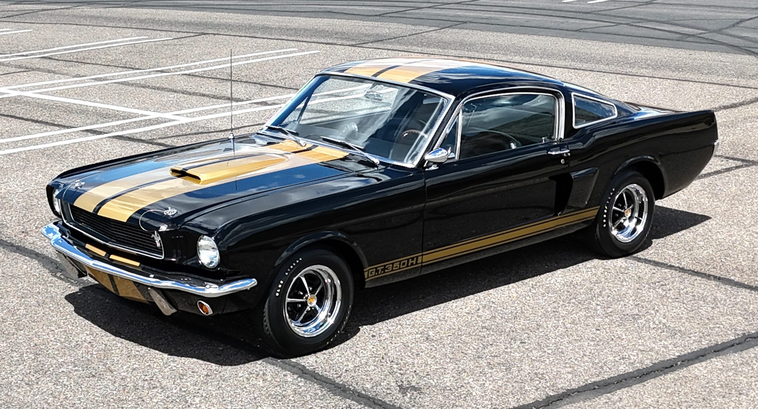 Approximately 1,000 GT350H examples were produced as part of a partnership between Ford and the Hertz car rental company. This example was delivered new in Raven Black (A) and was repainted as part of the aforementioned refurbishment completed under previous ownership. The car wears gold over-the-top stripes and GT350H side stripes as well as a driver-side mirror, hood pins, and chrome bumpers.