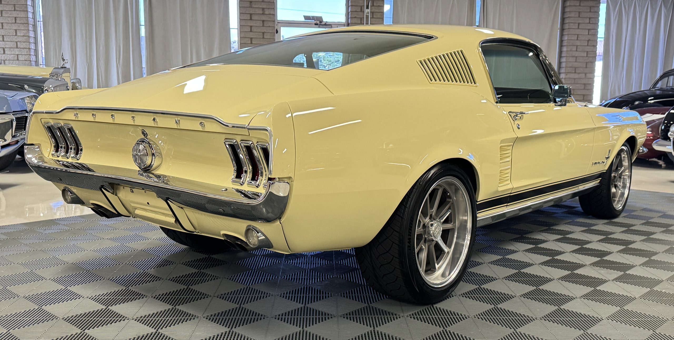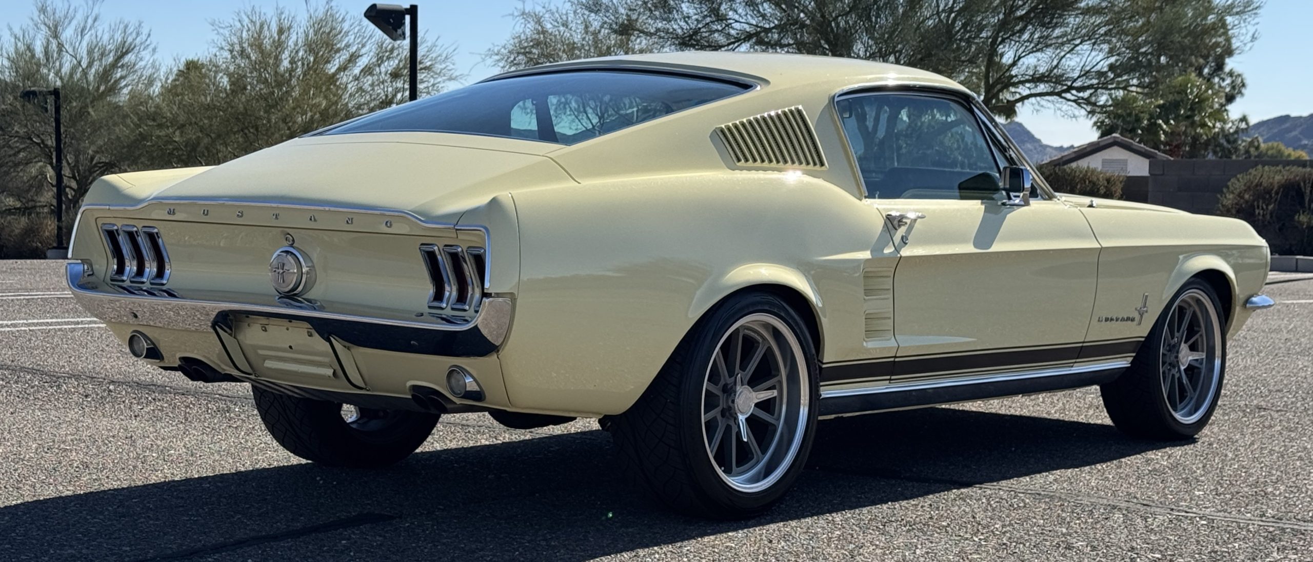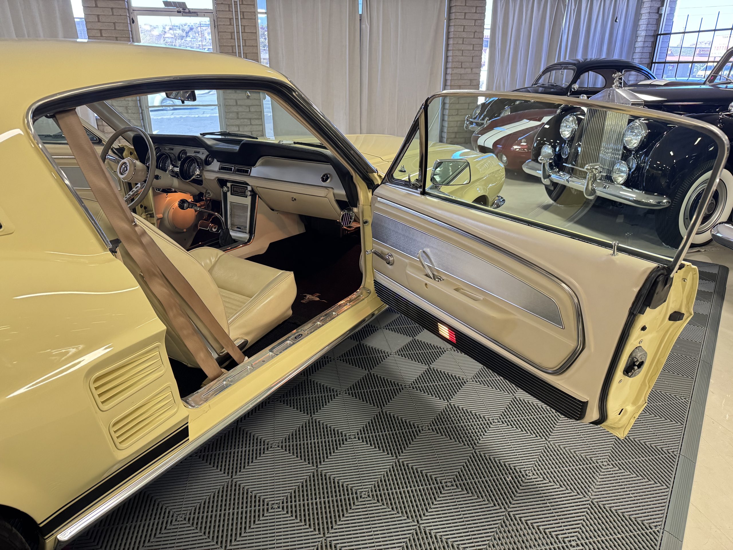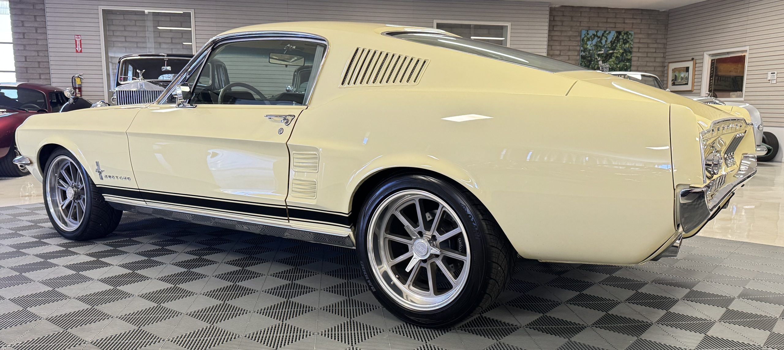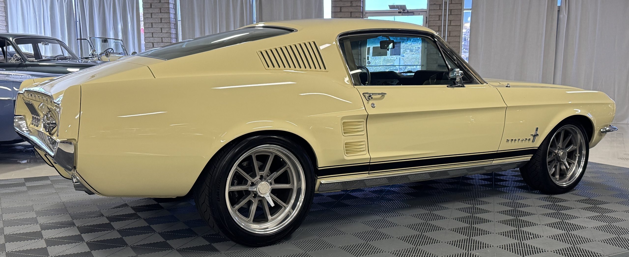 The exterior is finished in Springtime Yellow, with paintwork that remains in excellent condition and highlights the muscular proportions unique to the 1967 redesign. The longer roofline, sculpted quarter panels with integrated scoops, and distinctive front grille with centered Mustang emblem define the fastback’s visual identity, while the twelve-louver side vents and triple vertical taillights reinforce its iconic status. Aluminum wheels with Shelby-style three-ear knockoffs are wrapped in newer Otani 275/40R18 tires, providing a modern stance and traction that complement the upgraded chassis beneath.