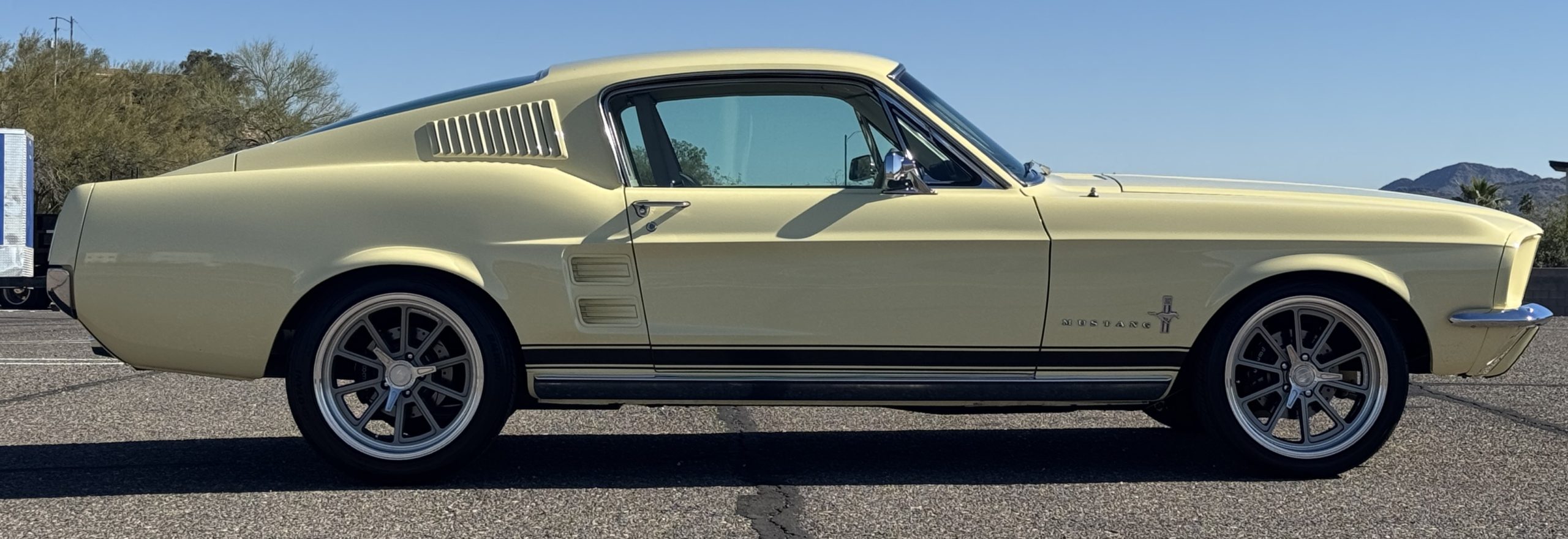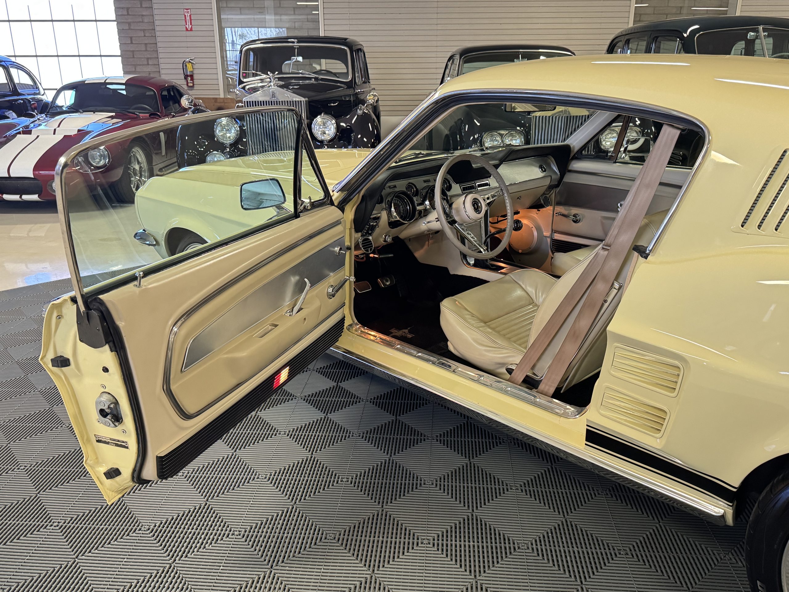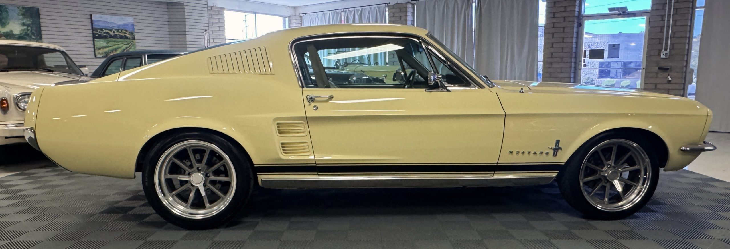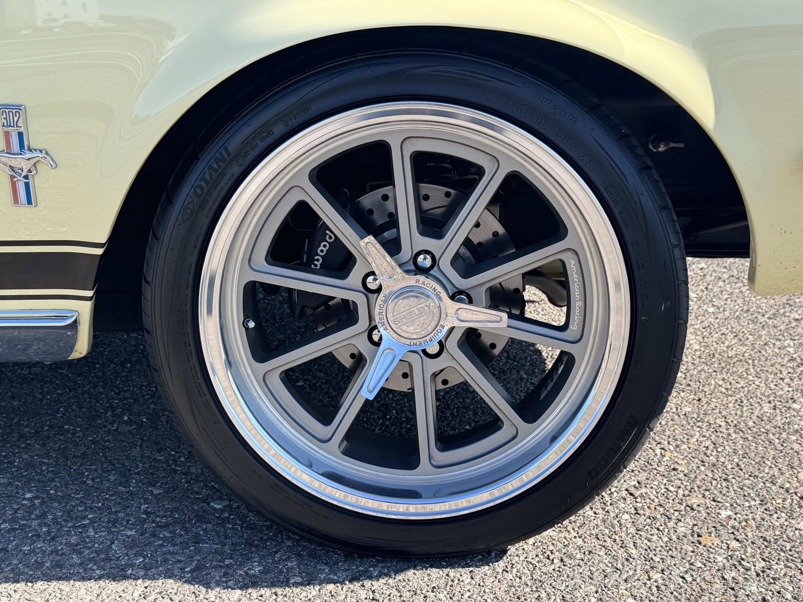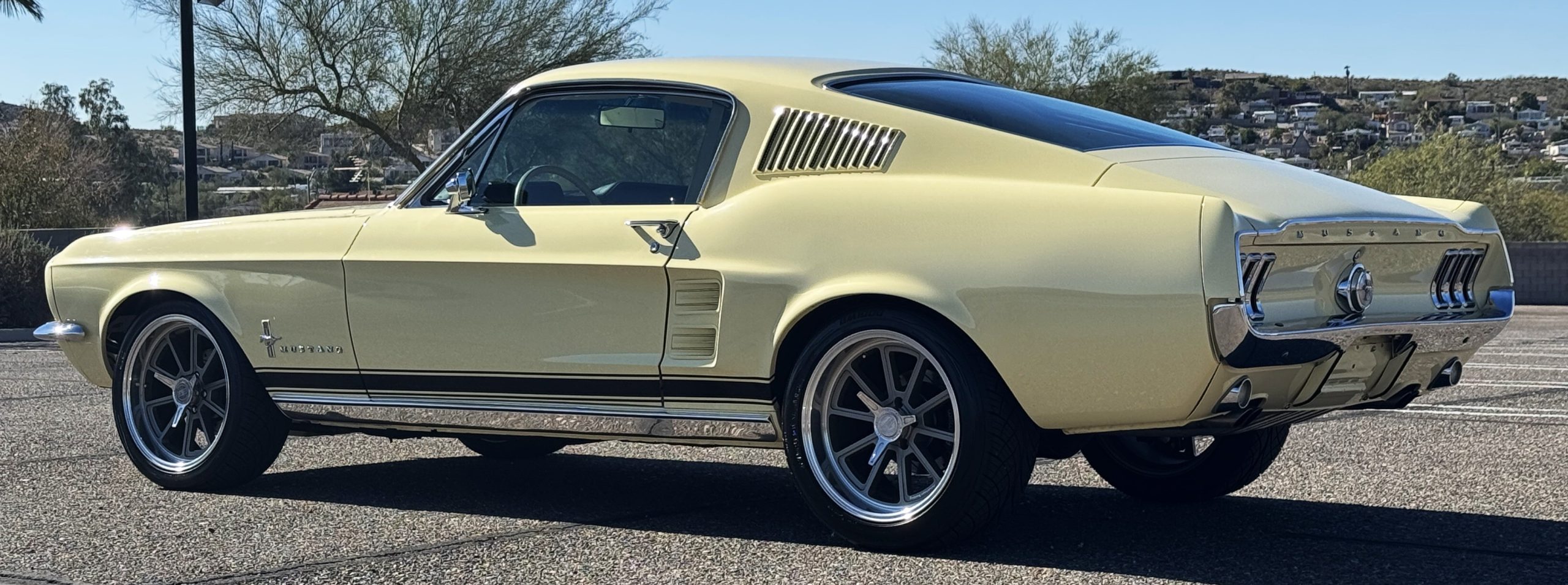The exterior is finished in Springtime Yellow, with paintwork that remains in excellent condition and highlights the muscular proportions unique to the 1967 redesign. The longer roofline, sculpted quarter panels with integrated scoops, and distinctive front grille with centered Mustang emblem define the fastback’s visual identity, while the twelve-louver side vents and triple vertical taillights reinforce its iconic status. Aluminum wheels with Shelby-style three-ear knockoffs are wrapped in newer Otani 275/40R18 tires, providing a modern stance and traction that complement the upgraded chassis beneath.