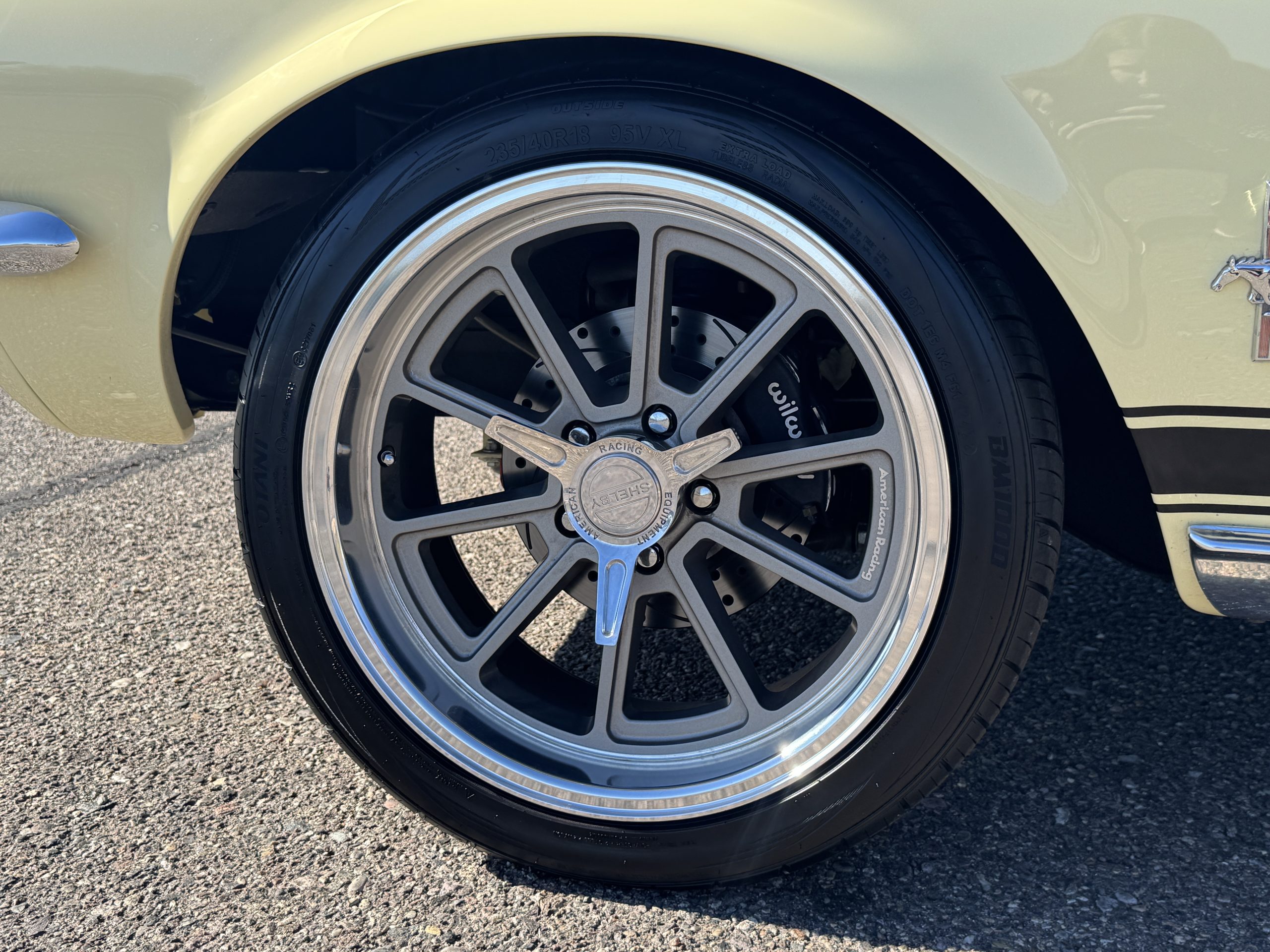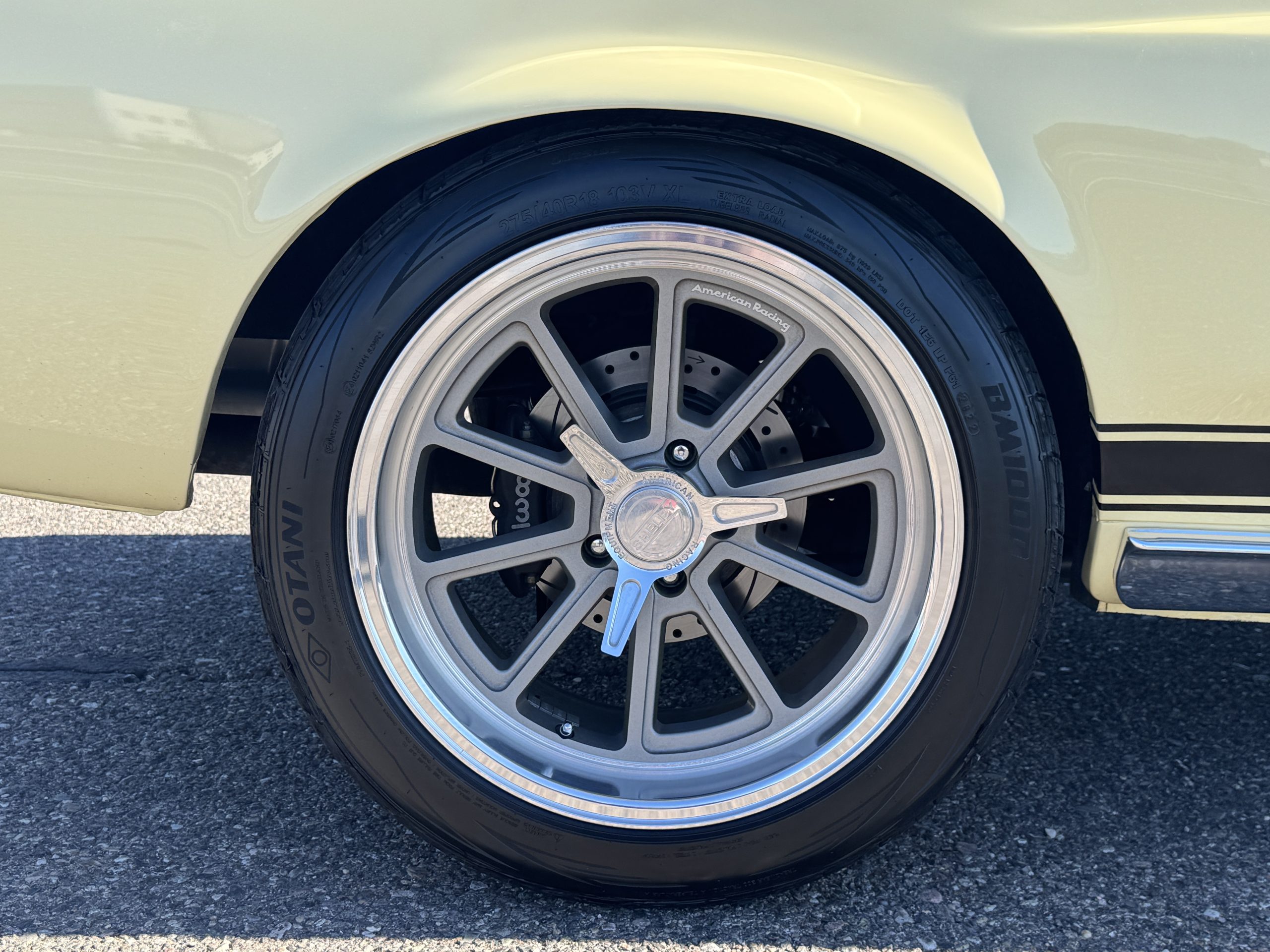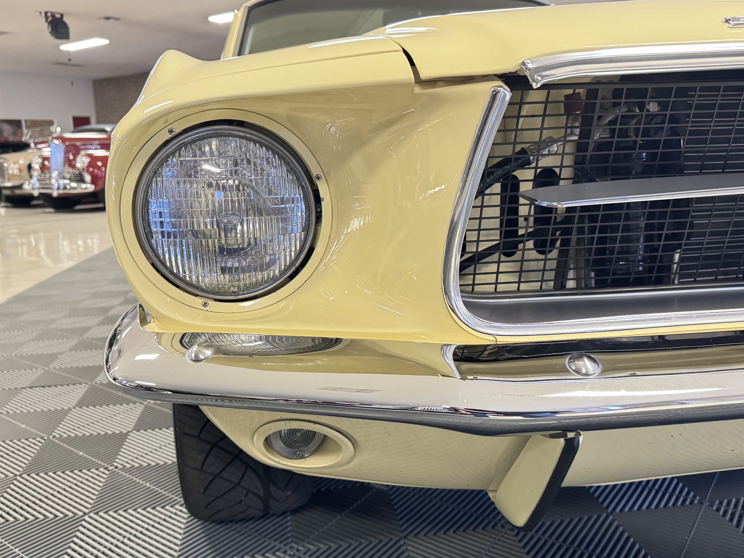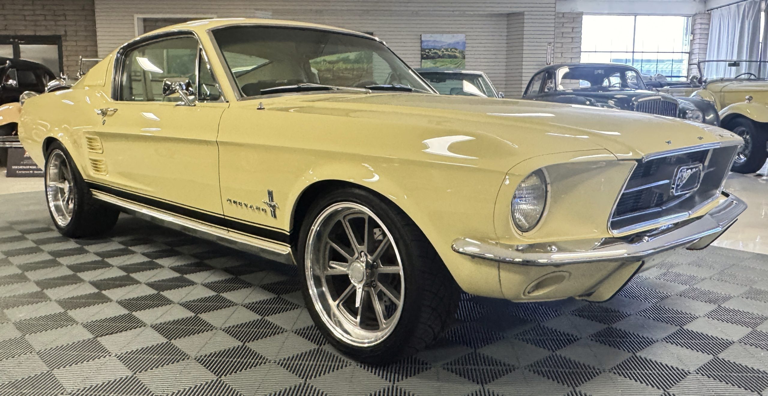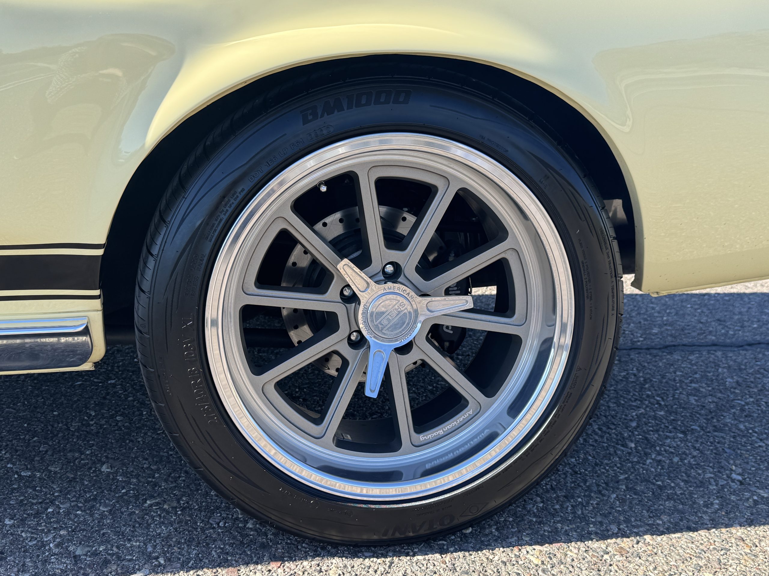 The exterior is finished in Springtime Yellow, with paintwork that remains in excellent condition and highlights the muscular proportions unique to the 1967 redesign. The longer roofline, sculpted quarter panels with integrated scoops, and distinctive front grille with centered Mustang emblem define the fastback’s visual identity, while the twelve-louver side vents and triple vertical taillights reinforce its iconic status. Aluminum wheels with Shelby-style three-ear knockoffs are wrapped in newer Otani 275/40R18 tires, providing a modern stance and traction that complement the upgraded chassis beneath.