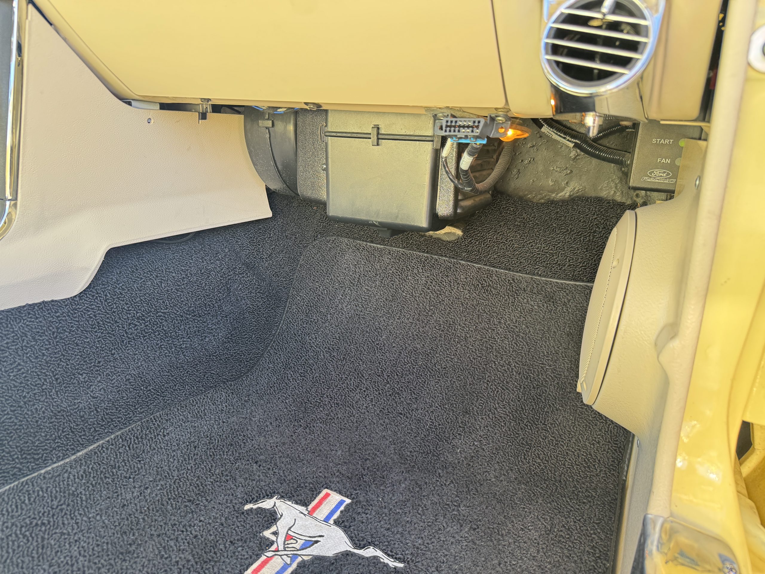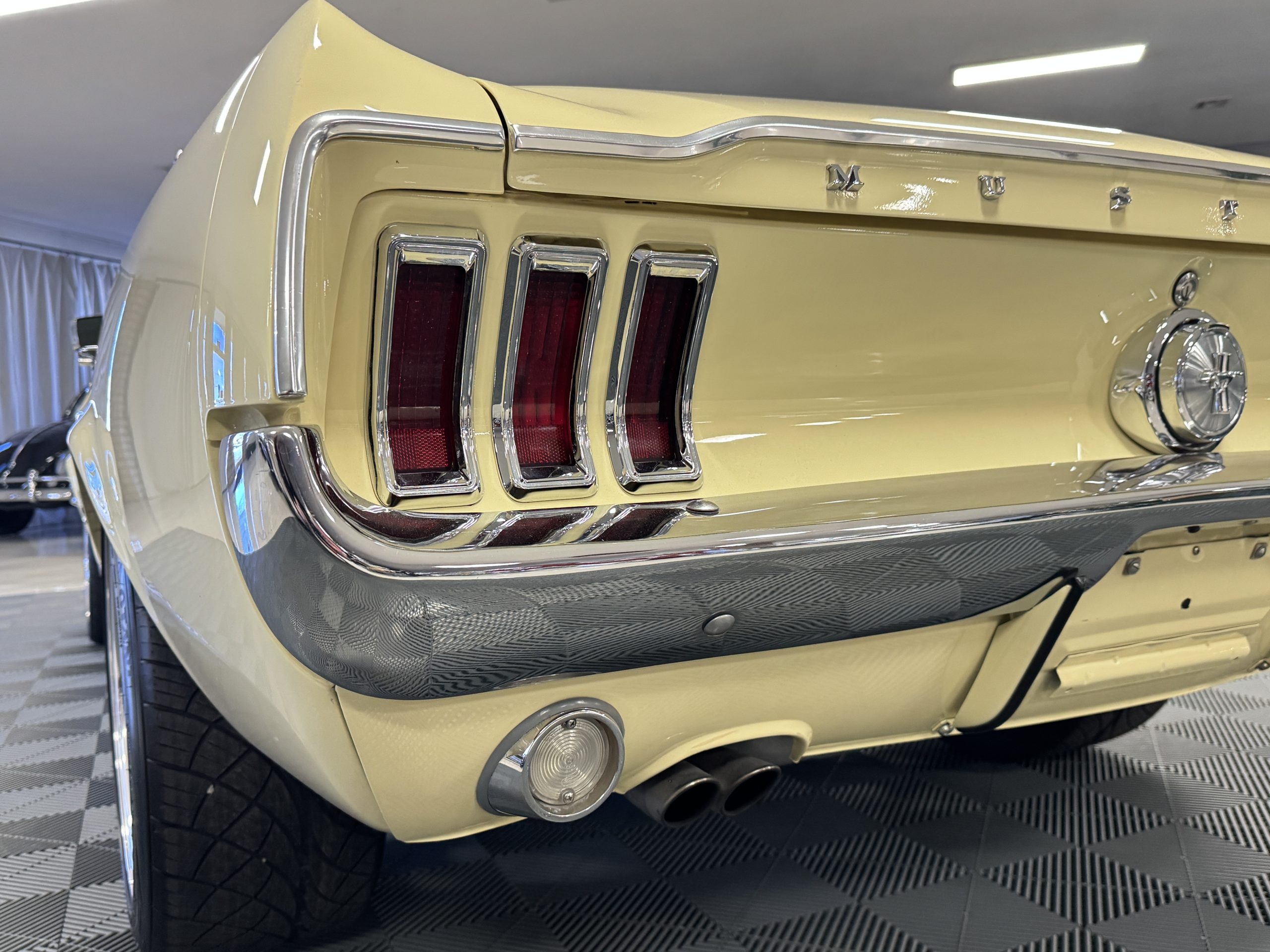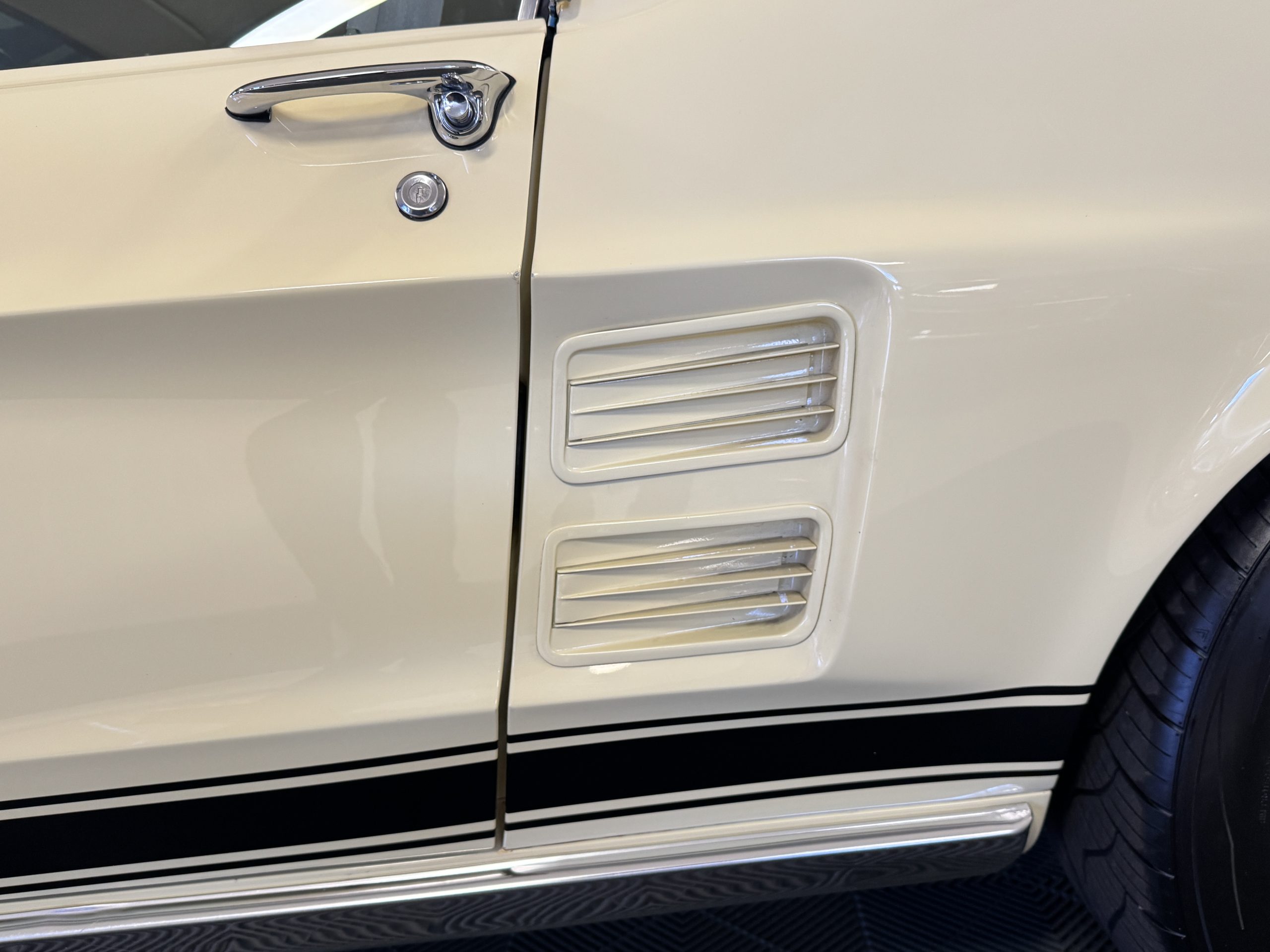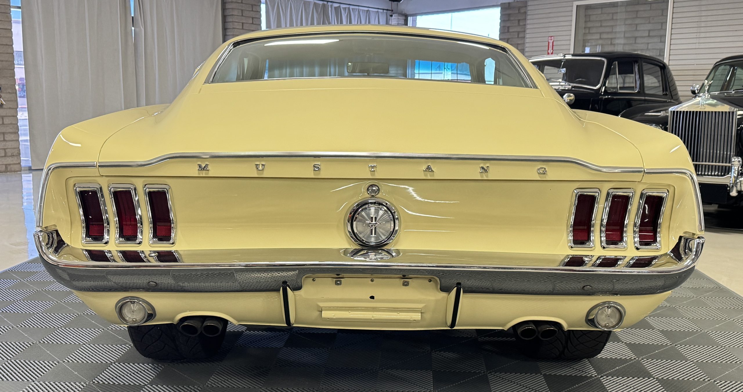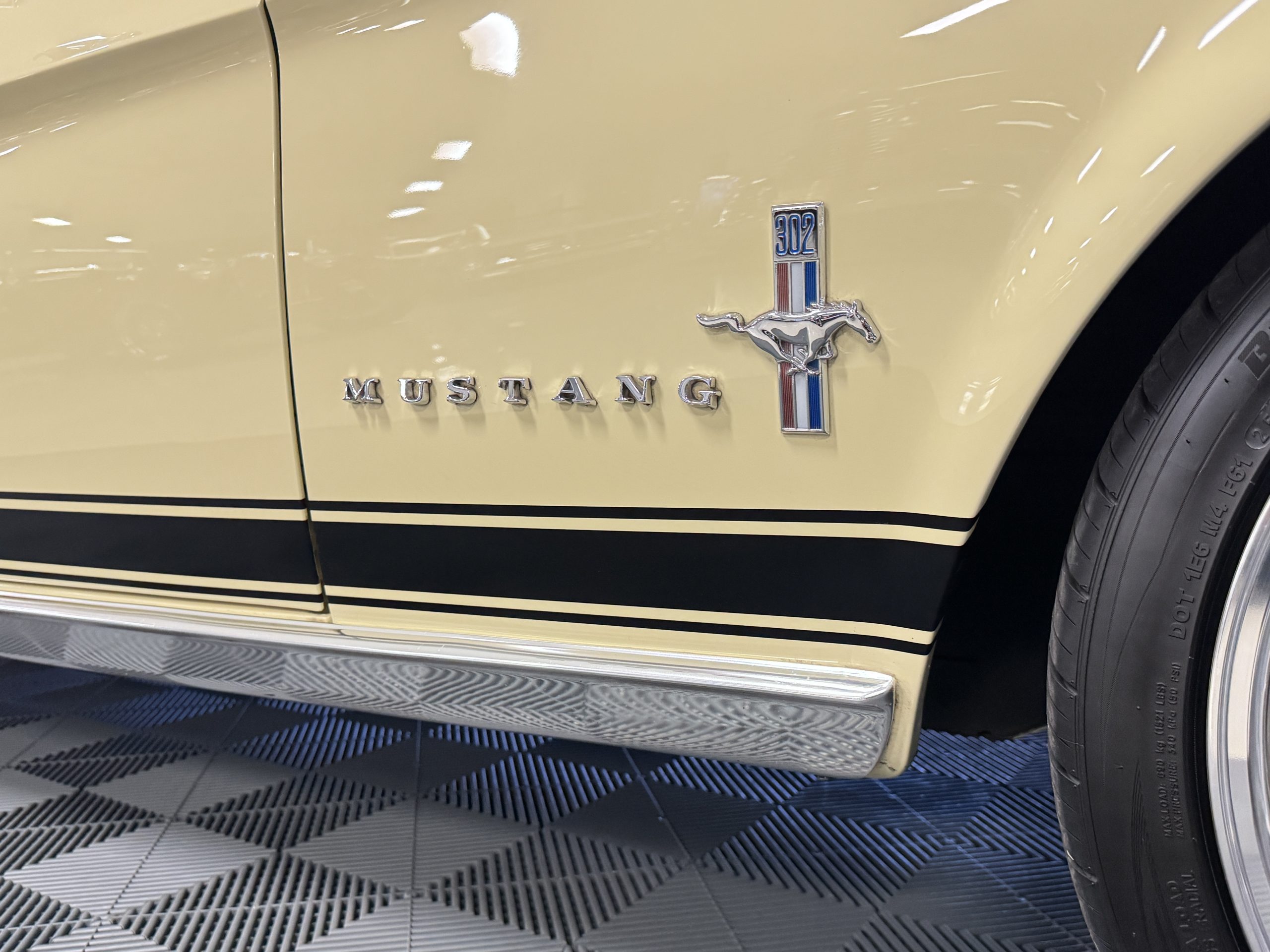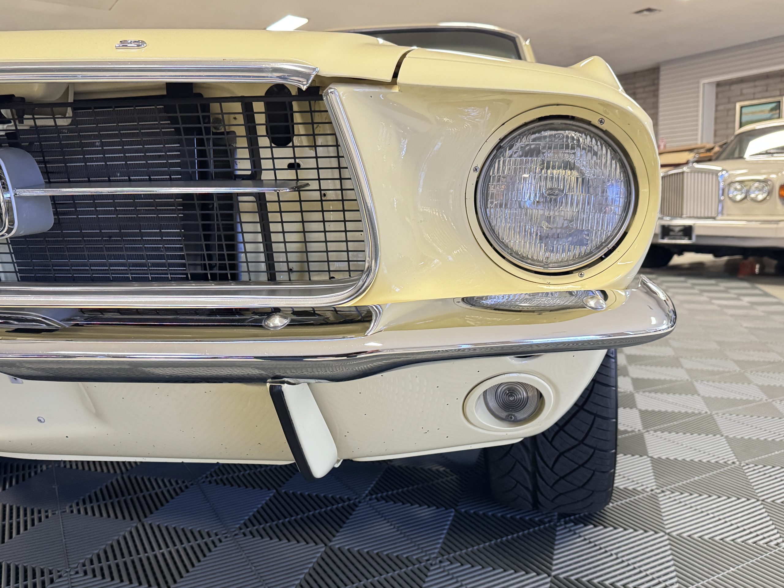 The exterior is finished in Springtime Yellow, with paintwork that remains in excellent condition and highlights the muscular proportions unique to the 1967 redesign. The longer roofline, sculpted quarter panels with integrated scoops, and distinctive front grille with centered Mustang emblem define the fastback’s visual identity, while the twelve-louver side vents and triple vertical taillights reinforce its iconic status. Aluminum wheels with Shelby-style three-ear knockoffs are wrapped in newer Otani 275/40R18 tires, providing a modern stance and traction that complement the upgraded chassis beneath.