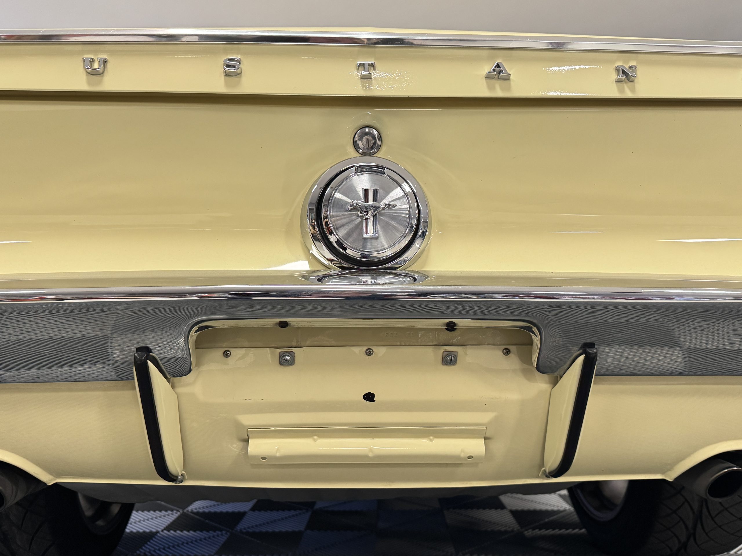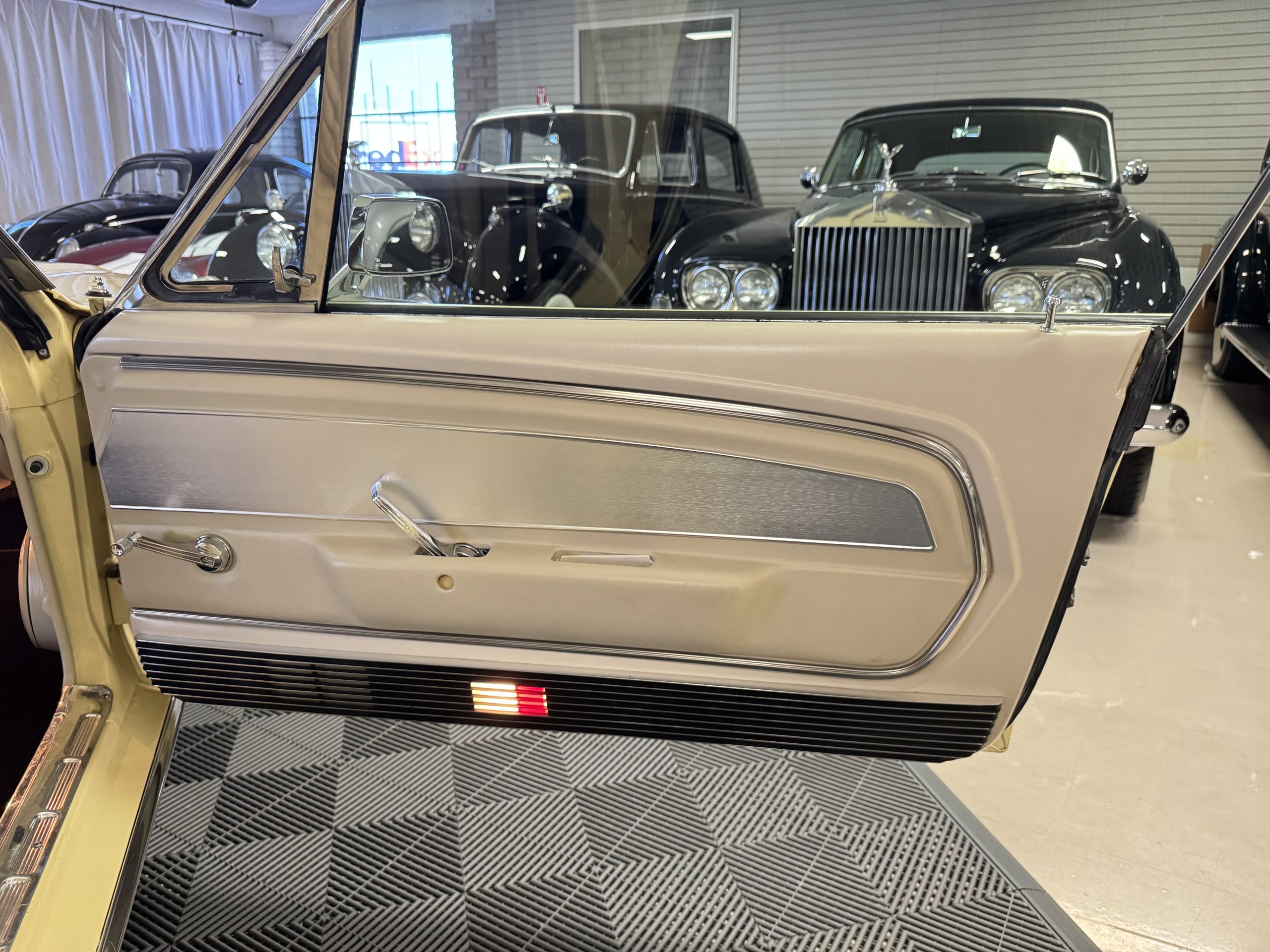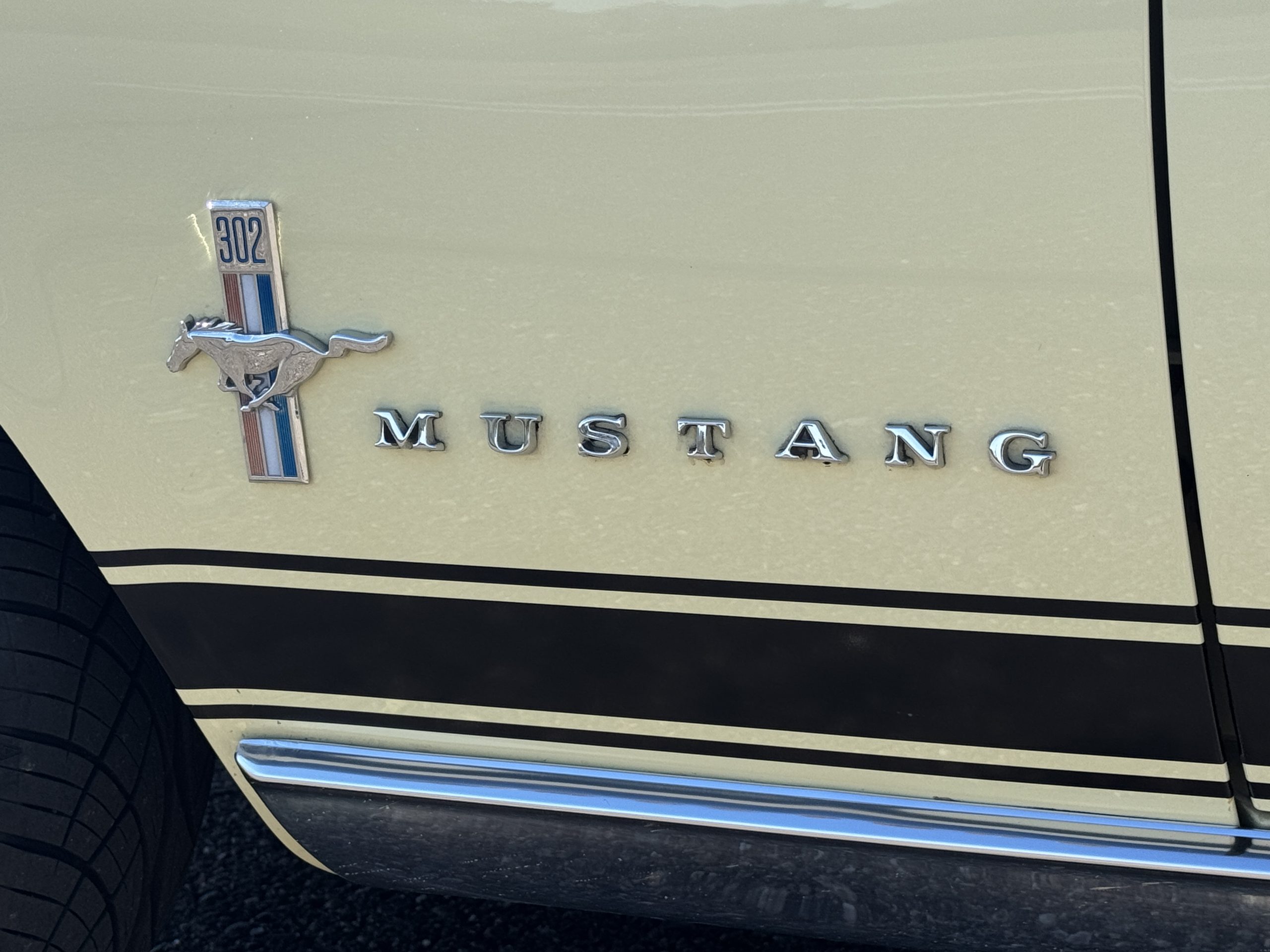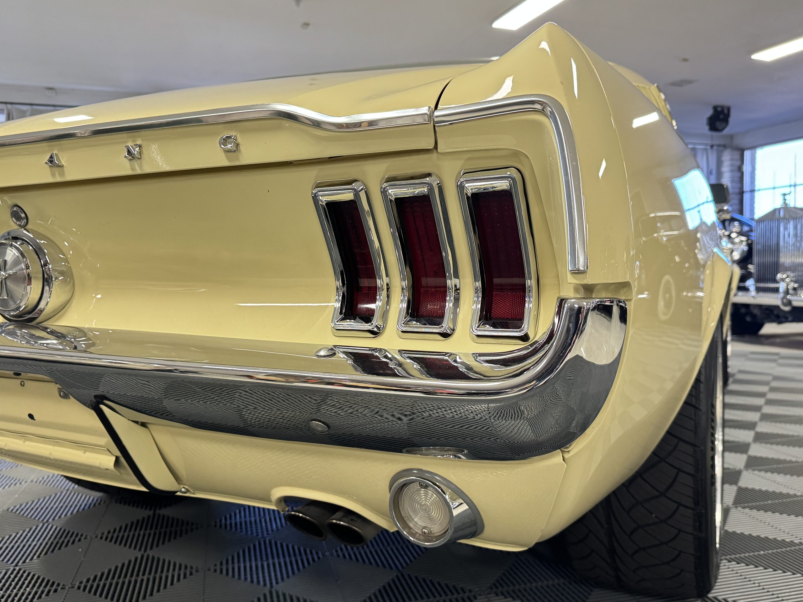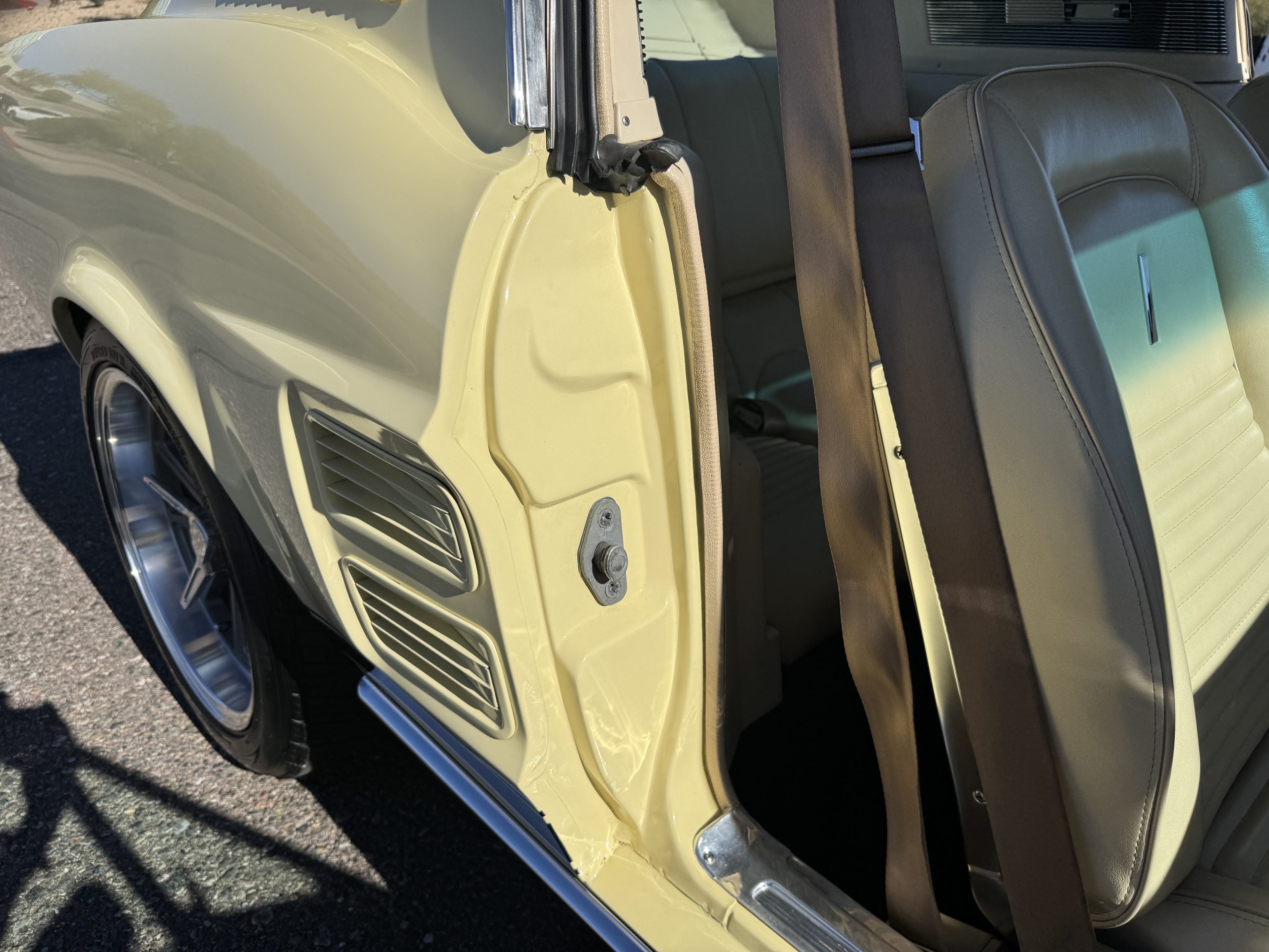 The exterior is finished in Springtime Yellow, with paintwork that remains in excellent condition and highlights the muscular proportions unique to the 1967 redesign. The longer roofline, sculpted quarter panels with integrated scoops, and distinctive front grille with centered Mustang emblem define the fastback’s visual identity, while the twelve-louver side vents and triple vertical taillights reinforce its iconic status. Aluminum wheels with Shelby-style three-ear knockoffs are wrapped in newer Otani 275/40R18 tires, providing a modern stance and traction that complement the upgraded chassis beneath.