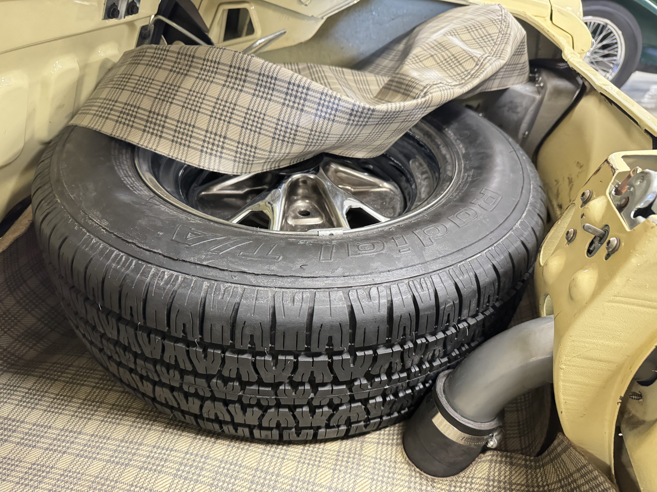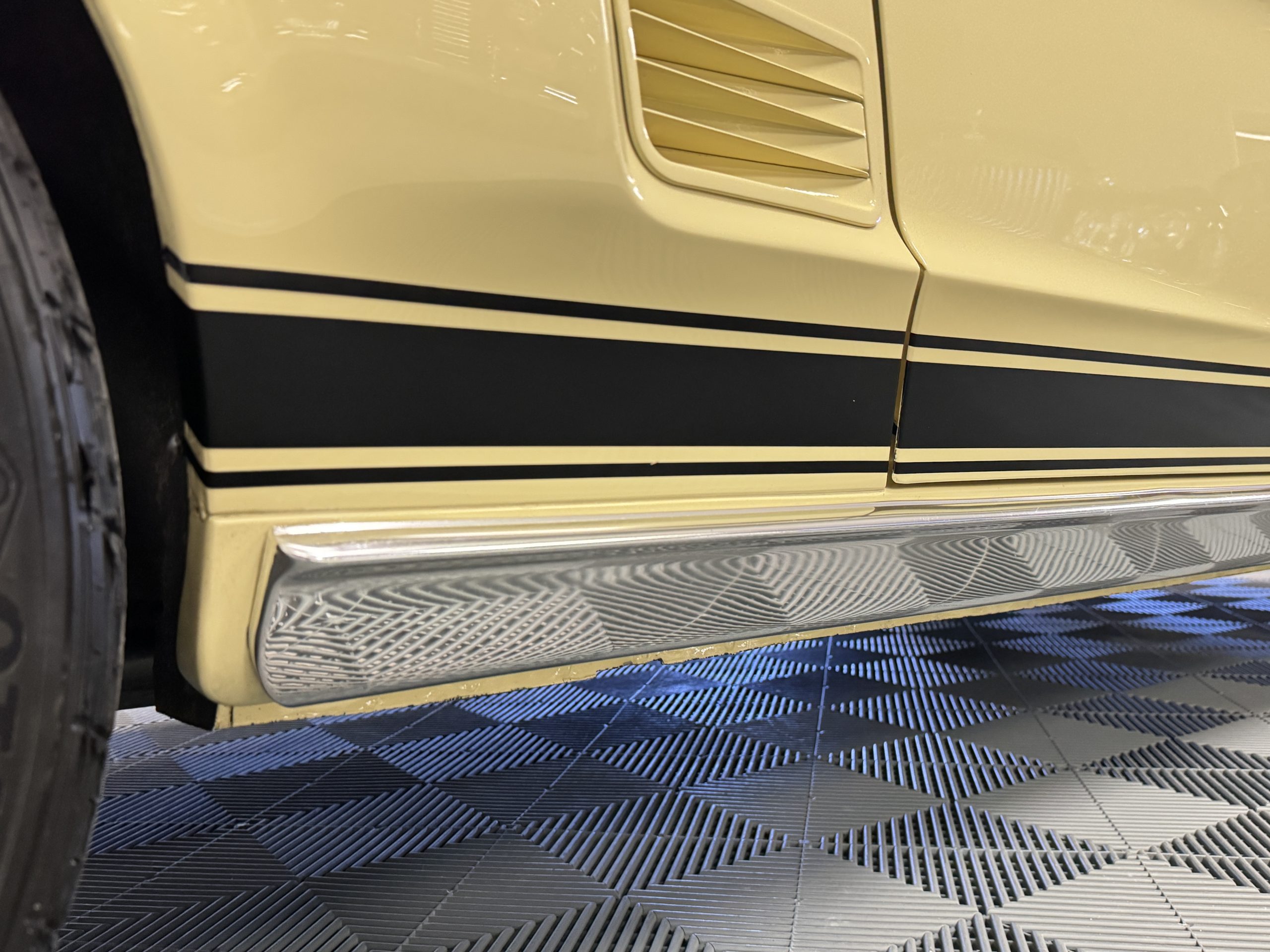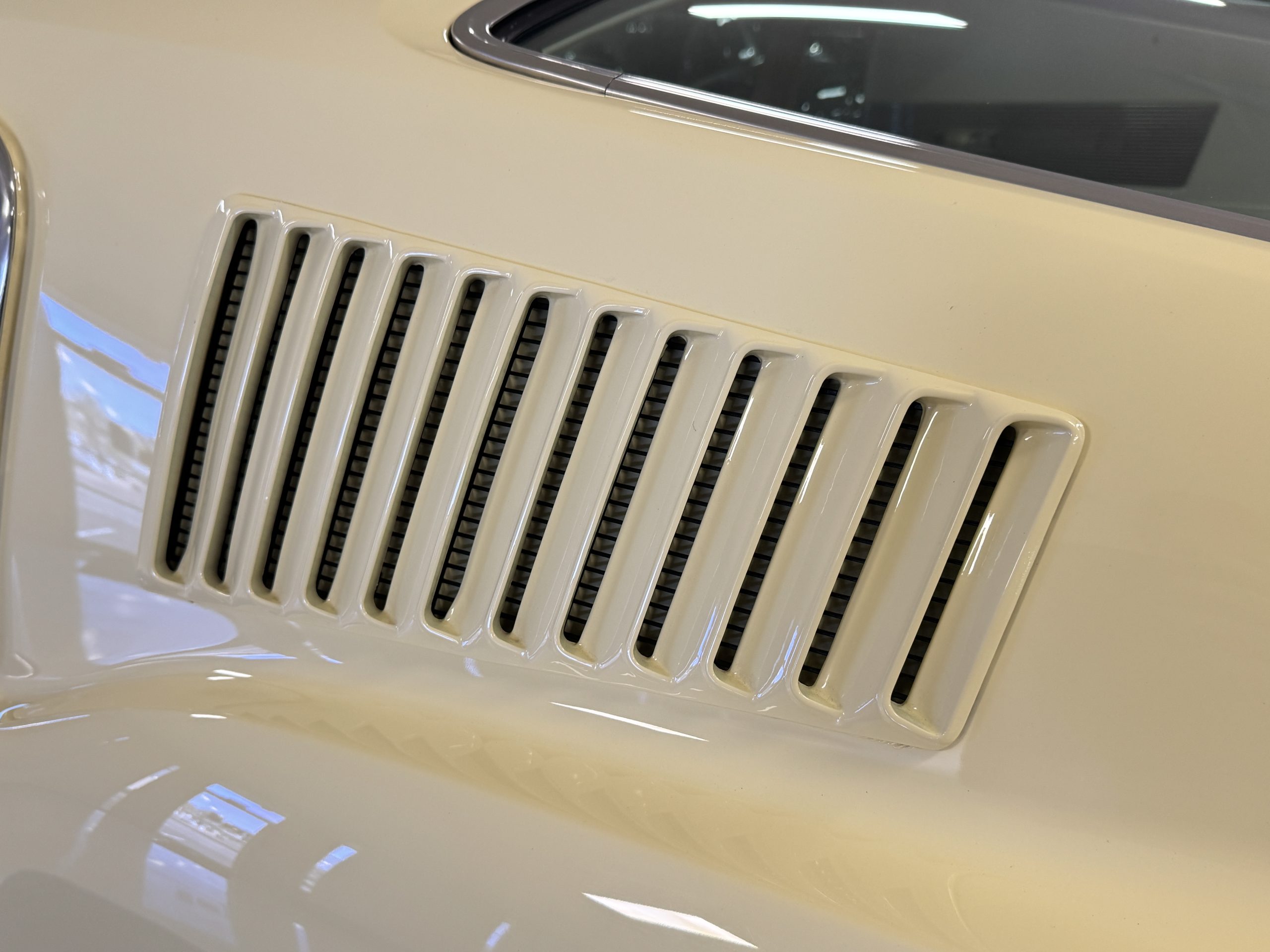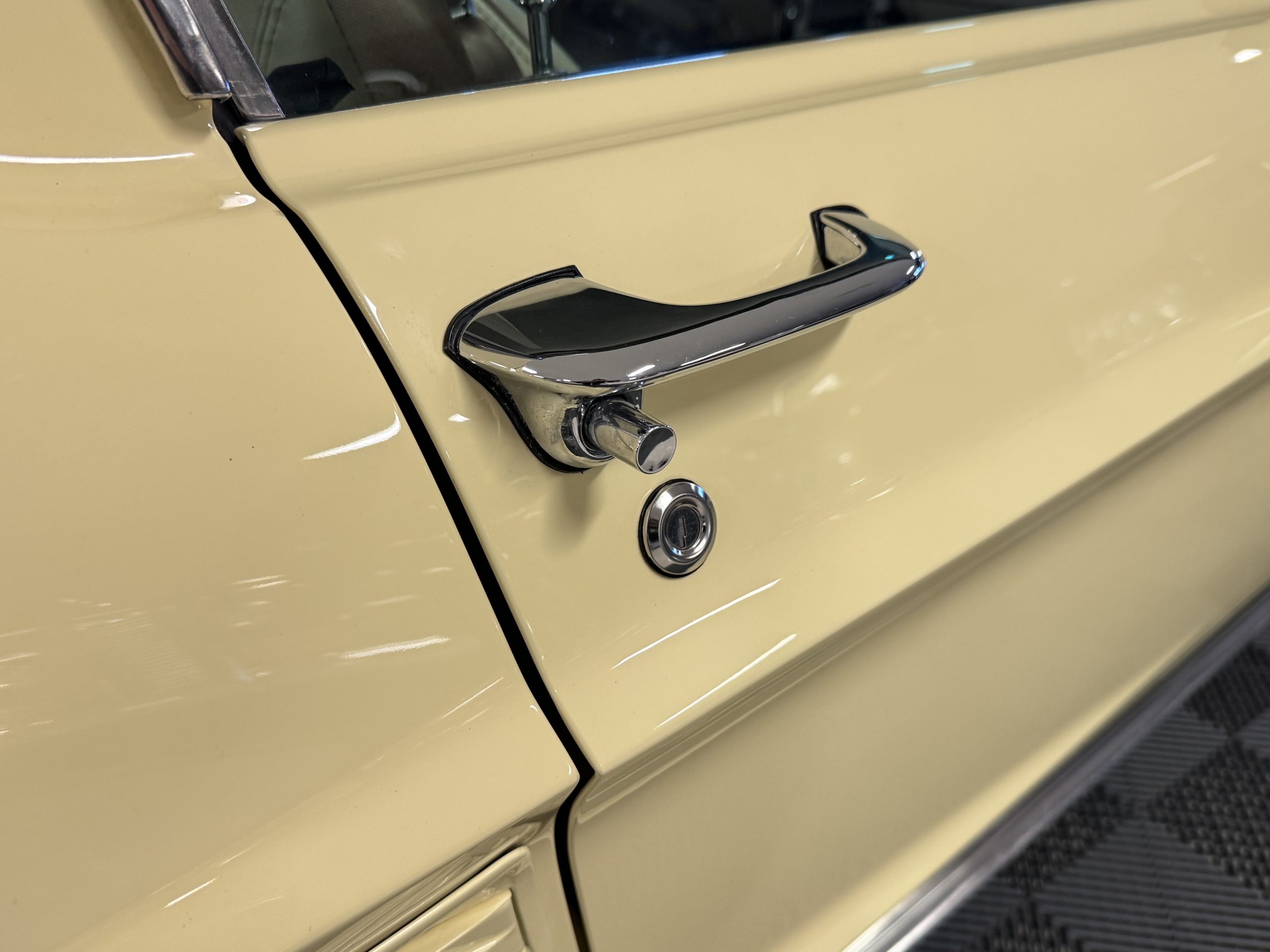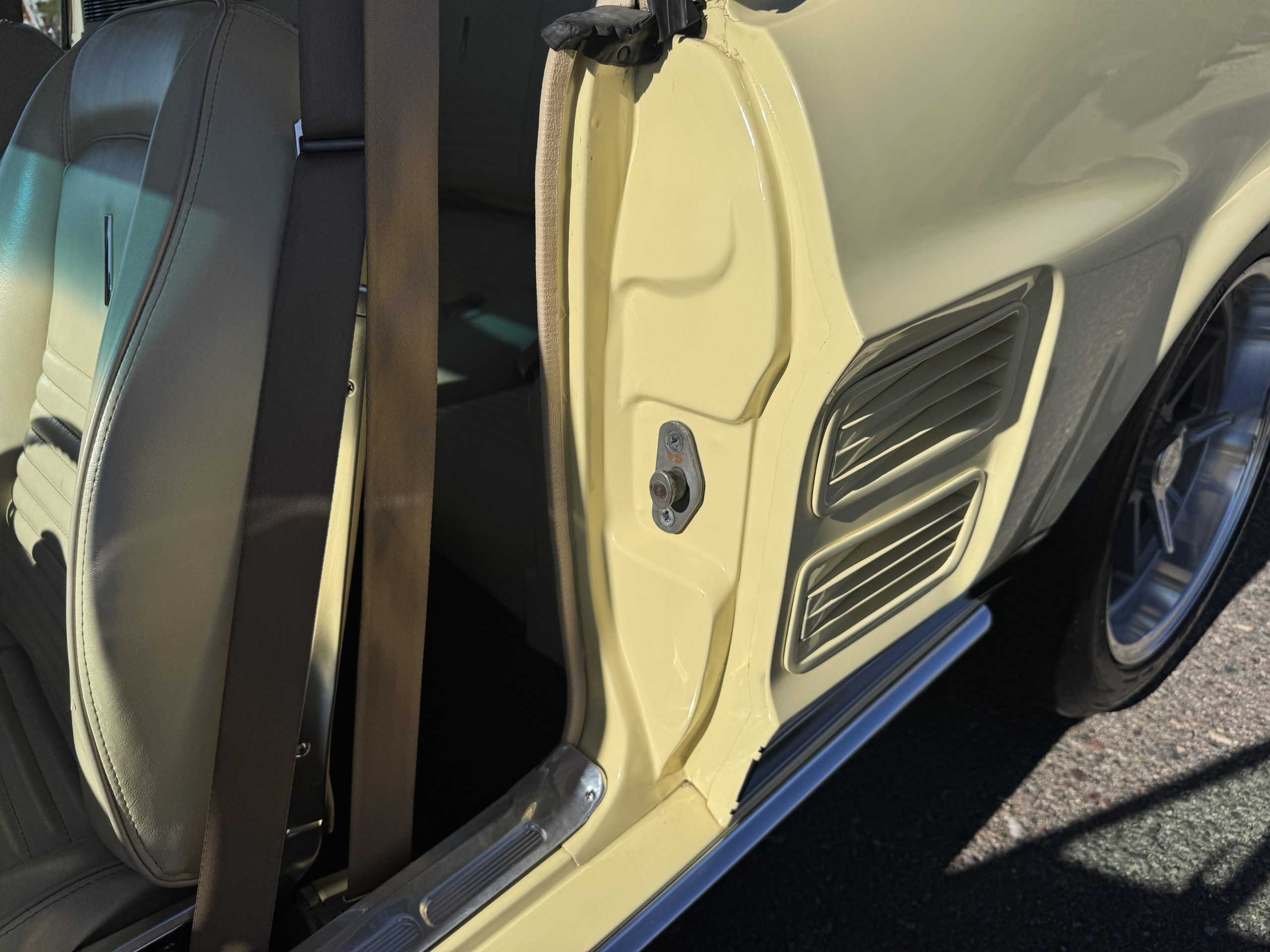 The exterior is finished in Springtime Yellow, with paintwork that remains in excellent condition and highlights the muscular proportions unique to the 1967 redesign. The longer roofline, sculpted quarter panels with integrated scoops, and distinctive front grille with centered Mustang emblem define the fastback’s visual identity, while the twelve-louver side vents and triple vertical taillights reinforce its iconic status. Aluminum wheels with Shelby-style three-ear knockoffs are wrapped in newer Otani 275/40R18 tires, providing a modern stance and traction that complement the upgraded chassis beneath.