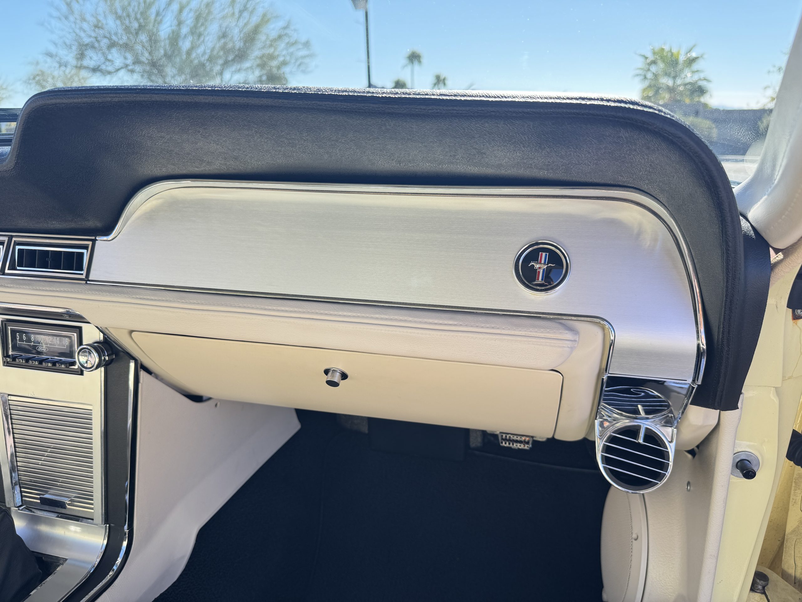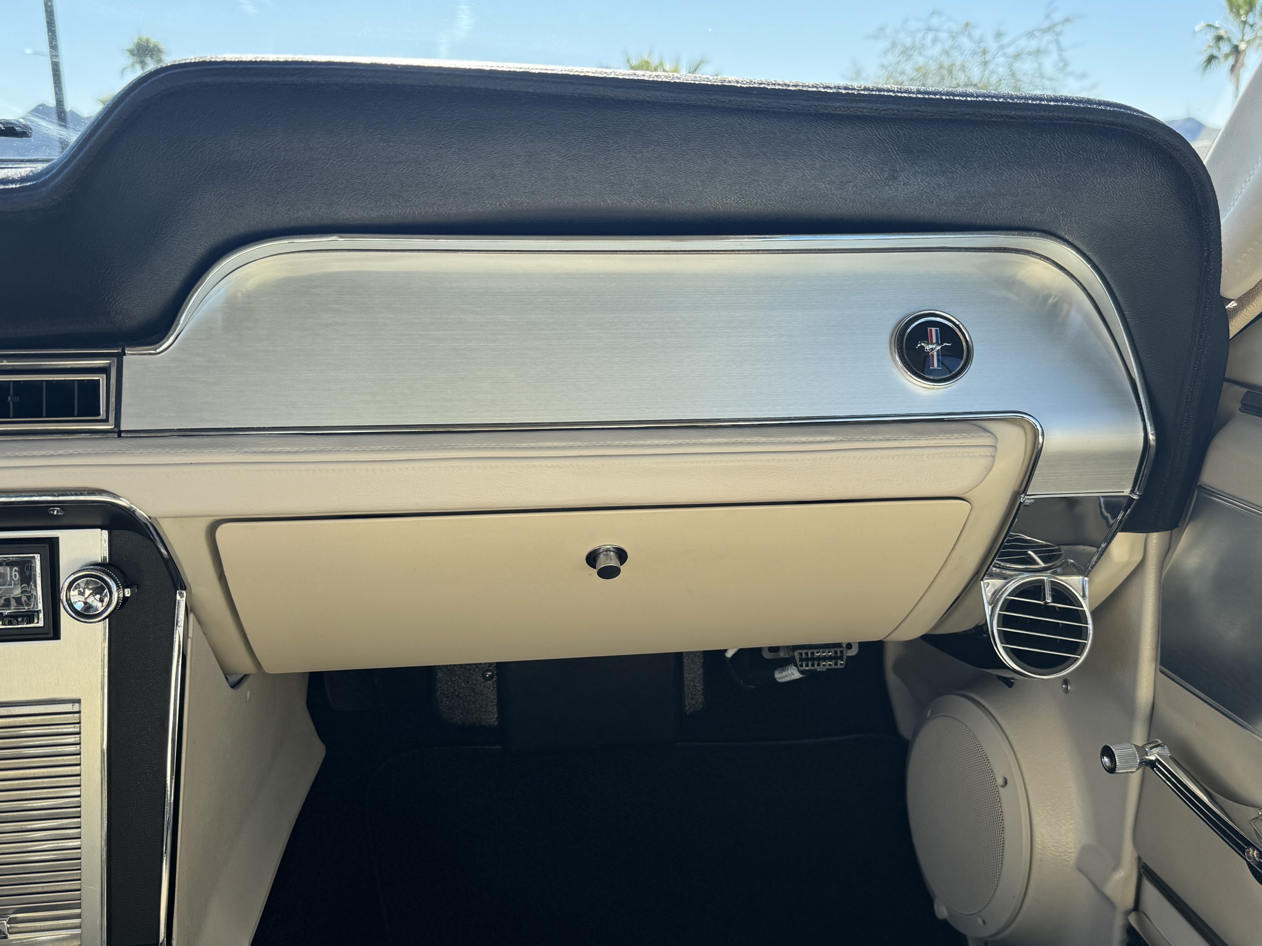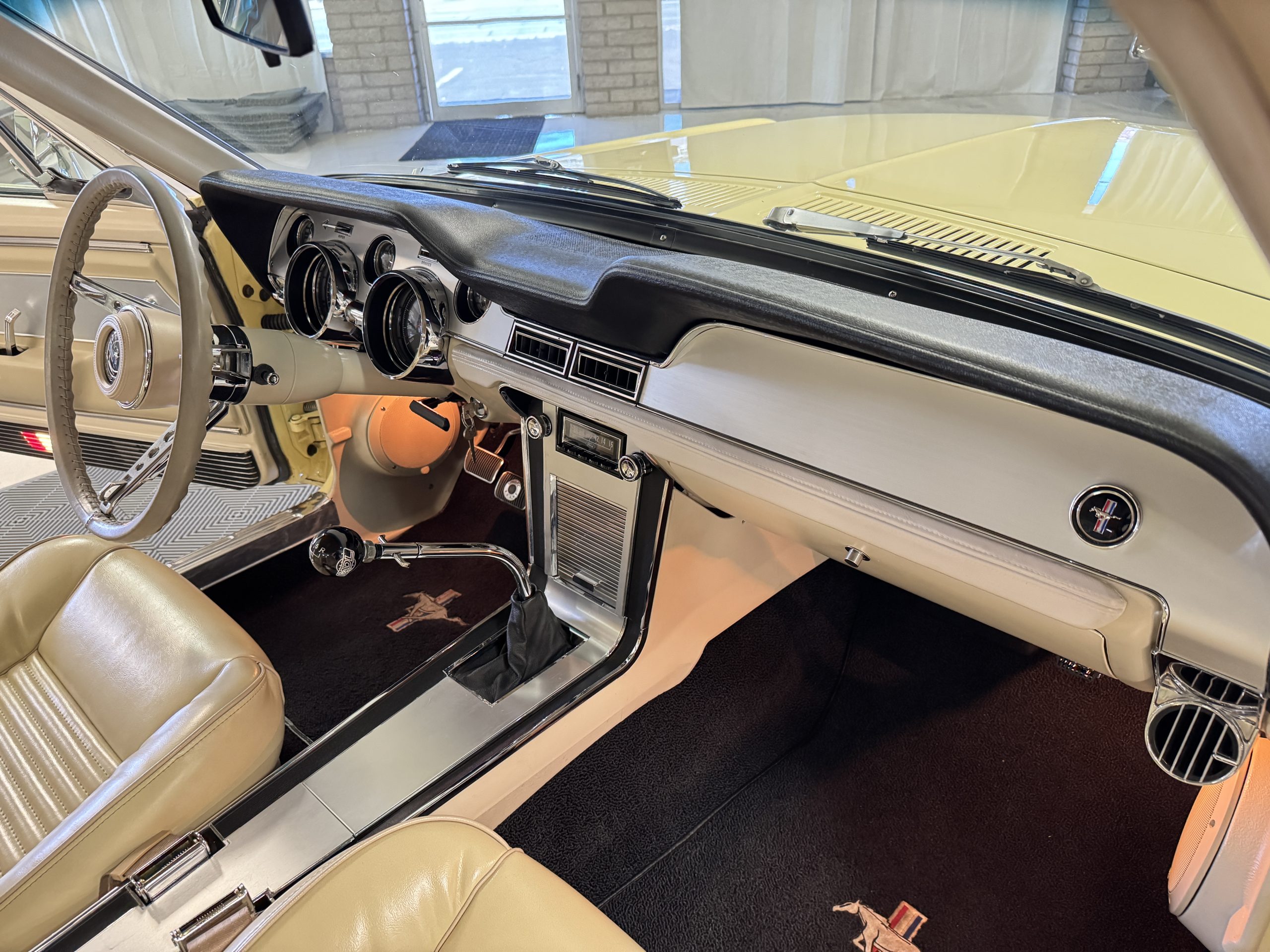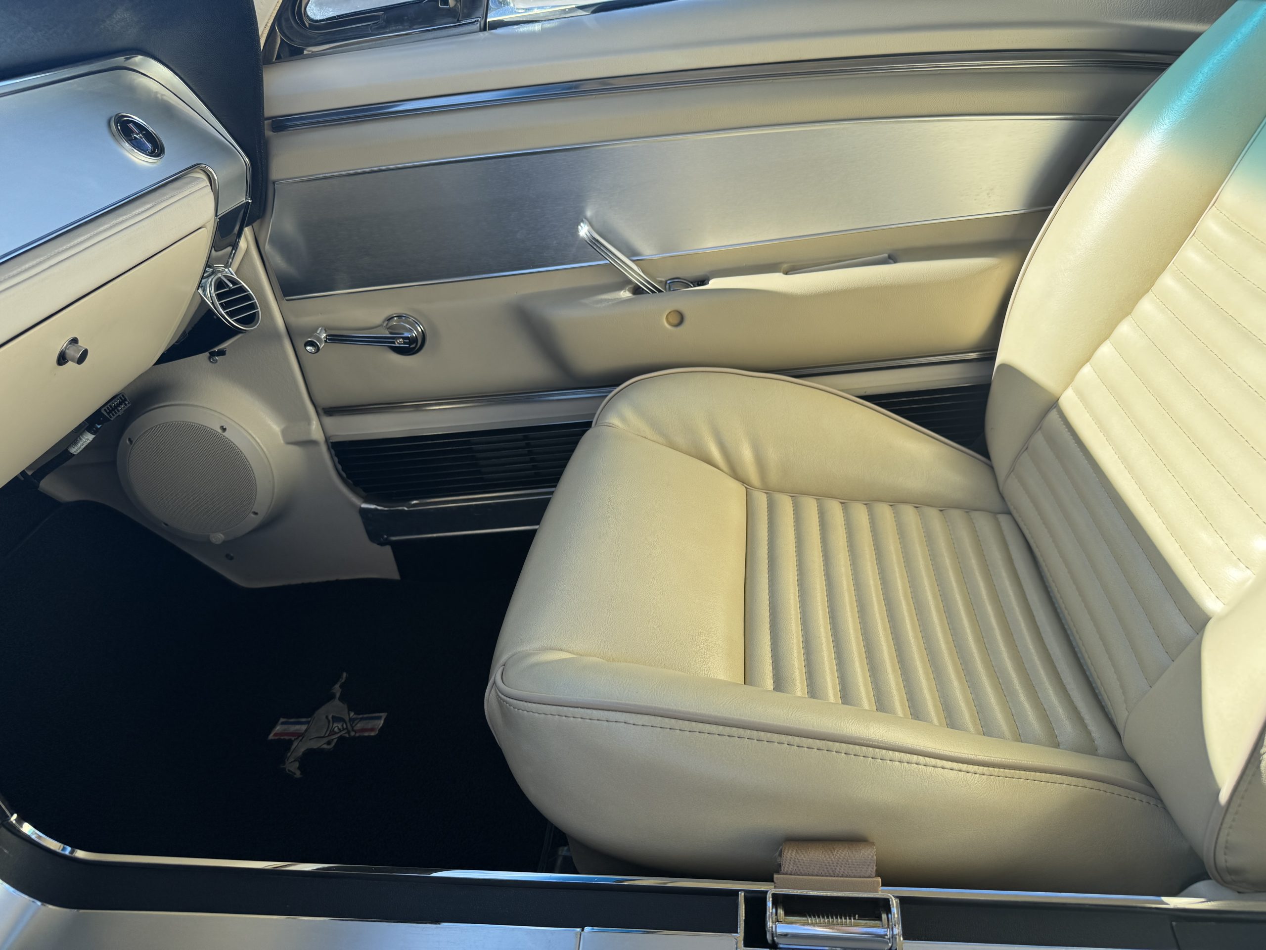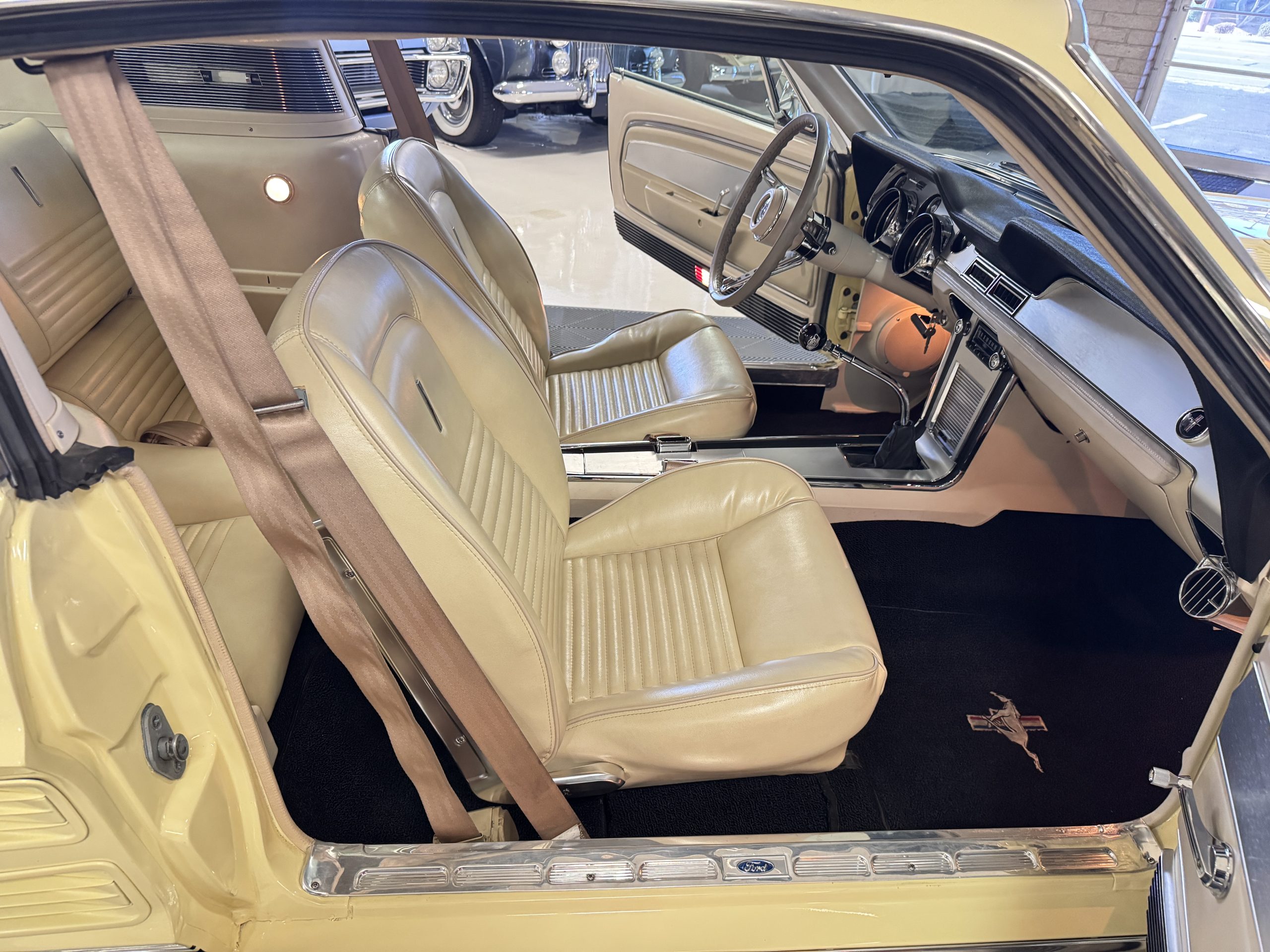 Inside, the Mustang features a Palomino vinyl interior with front bucket seats and a folding Sport Deck rear seat, with deluxe seatbelts, all in very good condition and consistent with the Mustang’s period-correct presentation. Black carpeting with Mustang floor mats remains clean and serviceable, while the 1967-year-only padded horn pad on the wrapped steering wheel shows light wear consistent with careful use. The brushed chrome gauge cluster houses fully functional original instrumentation, including a 140-mph speedometer with digital odometer, and the light gray polyurethane dash pad remains in very good condition. Factory-style amenities include power windows designed to resemble original roll-up glass, power steering, an AM radio plate over upgraded stereo, functional factory air conditioning, and fully operational interior lighting.