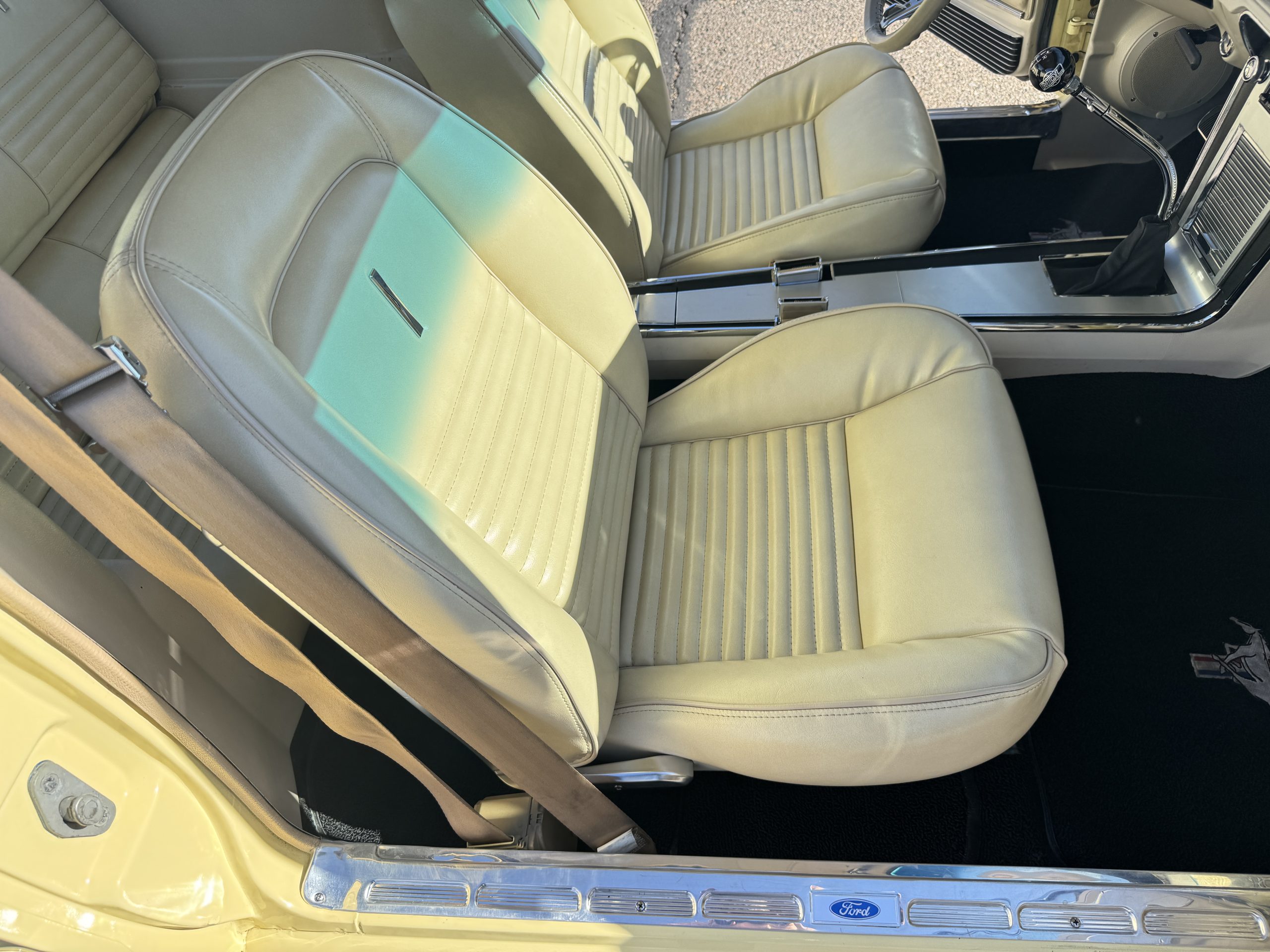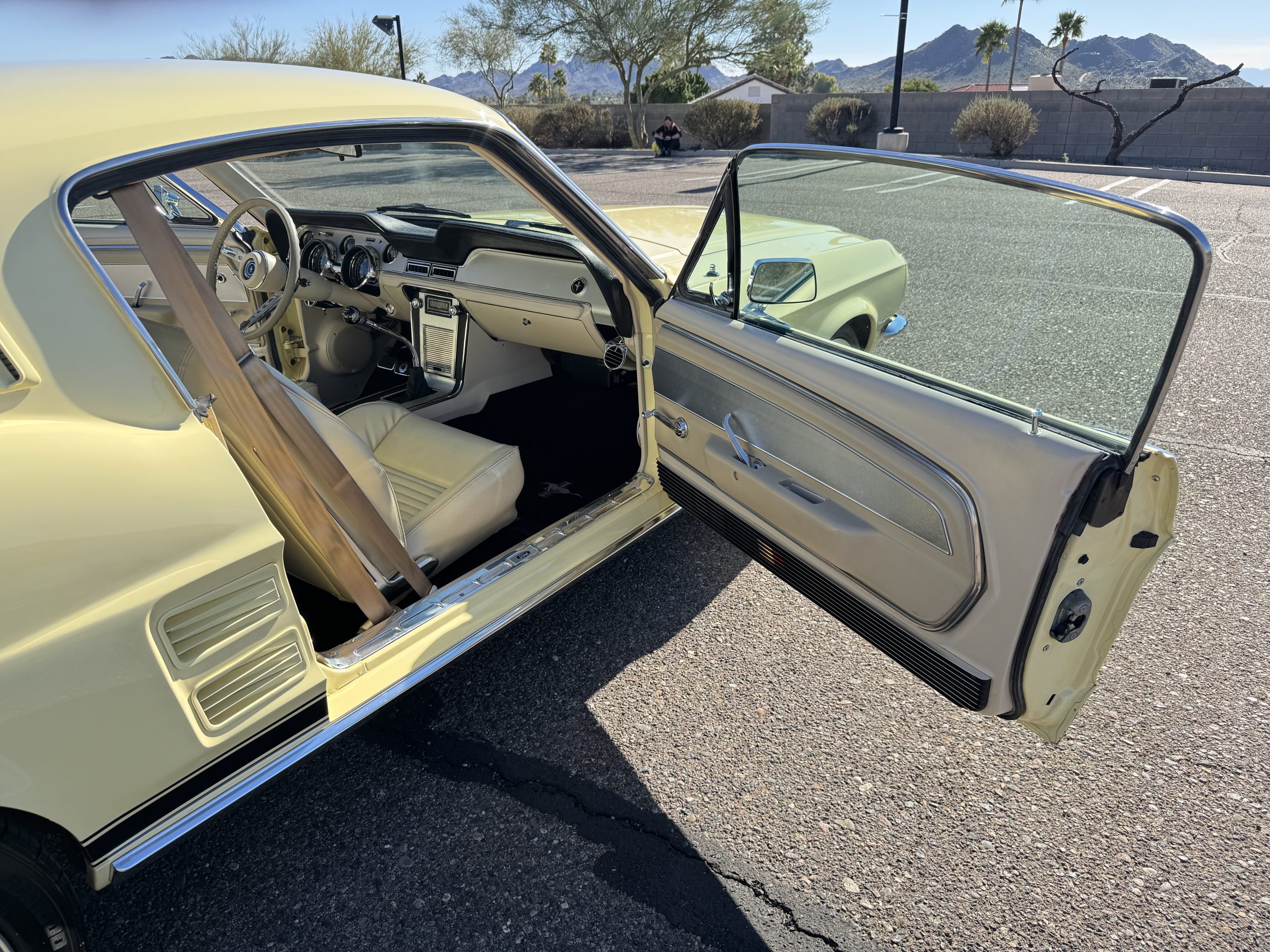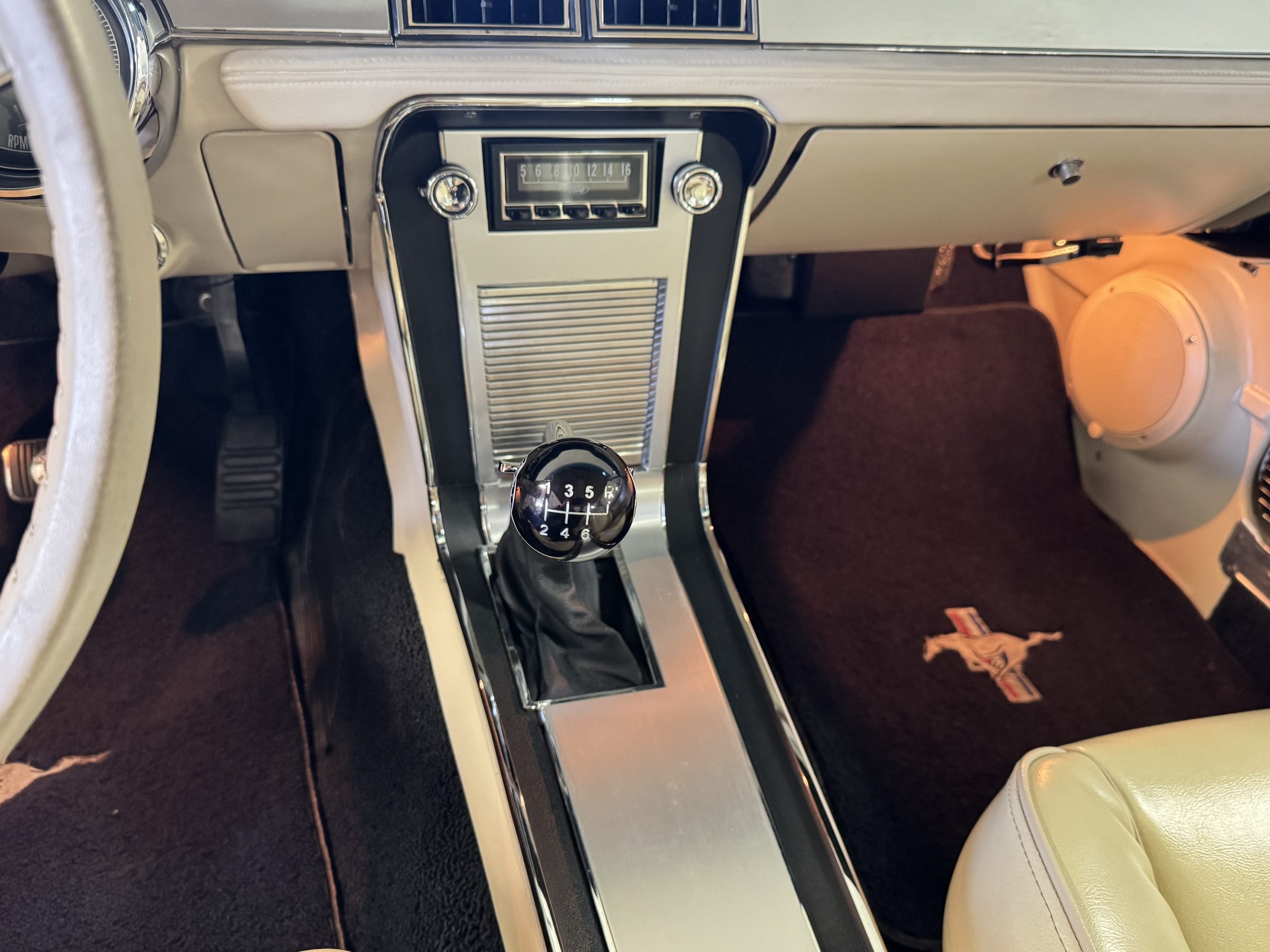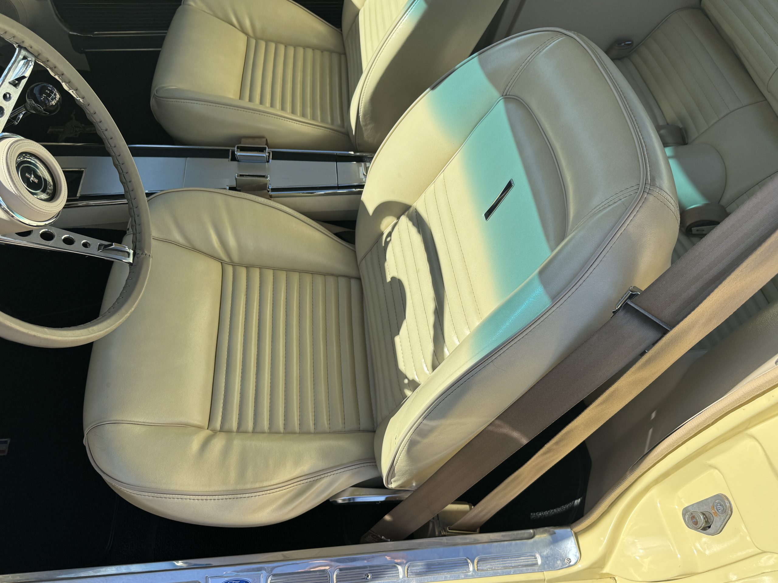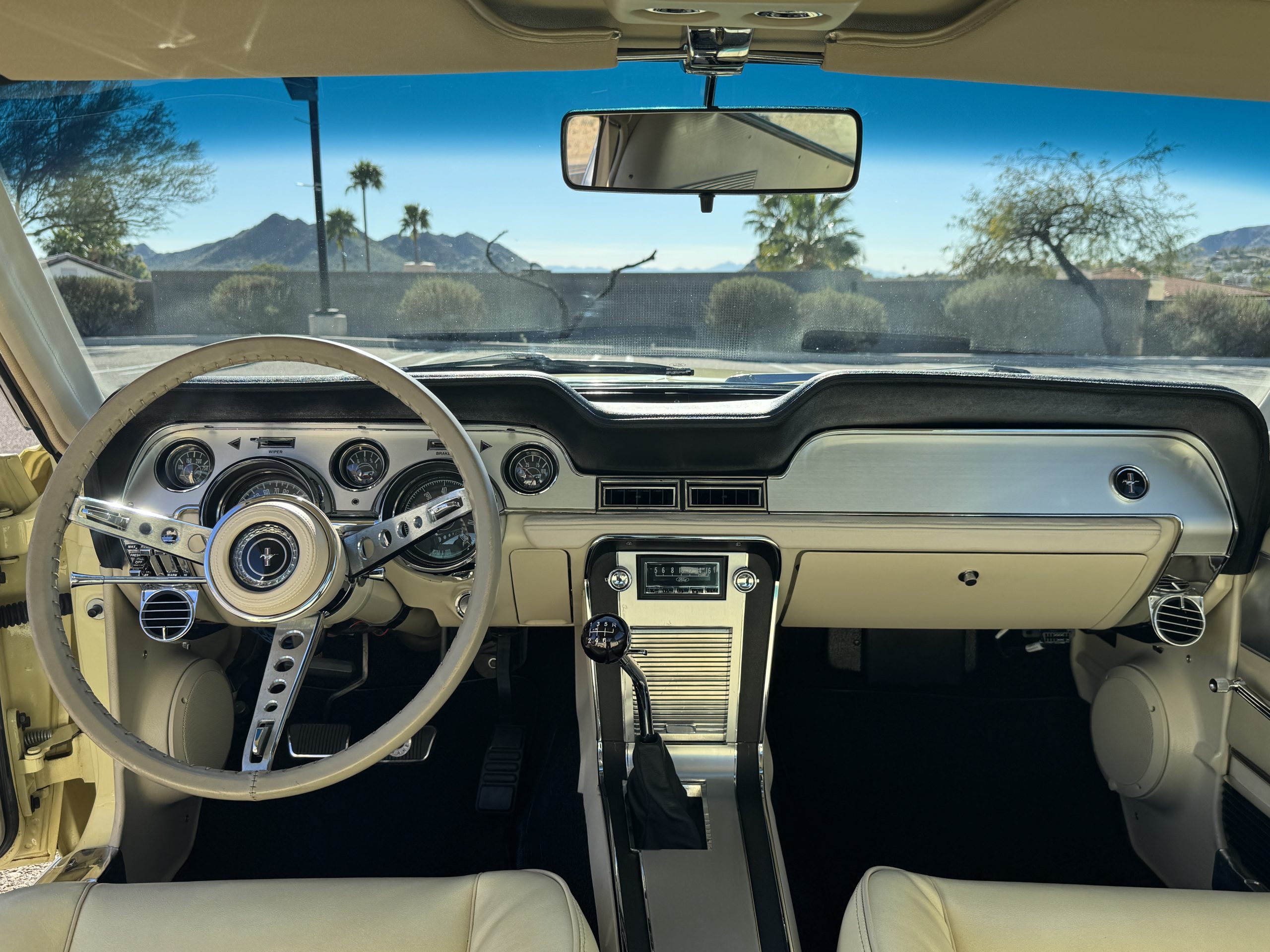 Inside, the Mustang features a Palomino vinyl interior with front bucket seats and a folding Sport Deck rear seat, with deluxe seatbelts, all in very good condition and consistent with the Mustang’s period-correct presentation. Black carpeting with Mustang floor mats remains clean and serviceable, while the 1967-year-only padded horn pad on the wrapped steering wheel shows light wear consistent with careful use. The brushed chrome gauge cluster houses fully functional original instrumentation, including a 140-mph speedometer with digital odometer, and the light gray polyurethane dash pad remains in very good condition. Factory-style amenities include power windows designed to resemble original roll-up glass, power steering, an AM radio plate over upgraded stereo, functional factory air conditioning, and fully operational interior lighting.