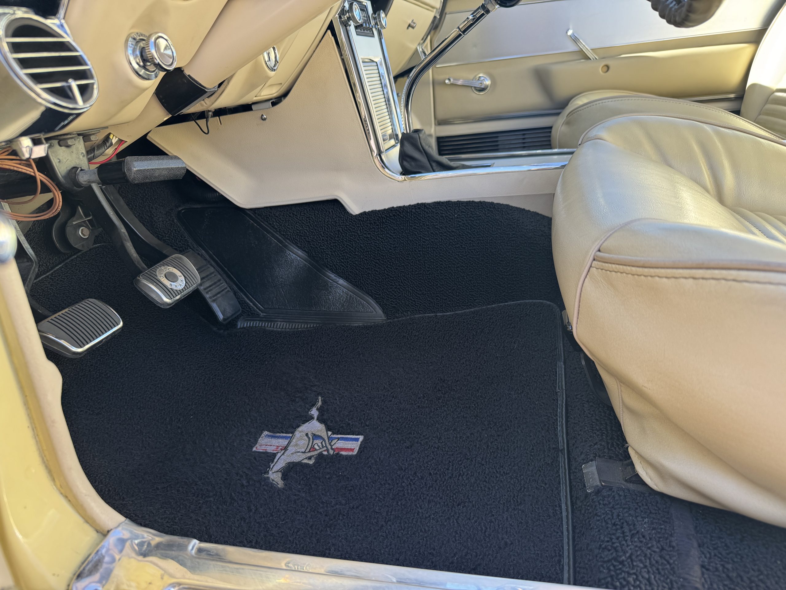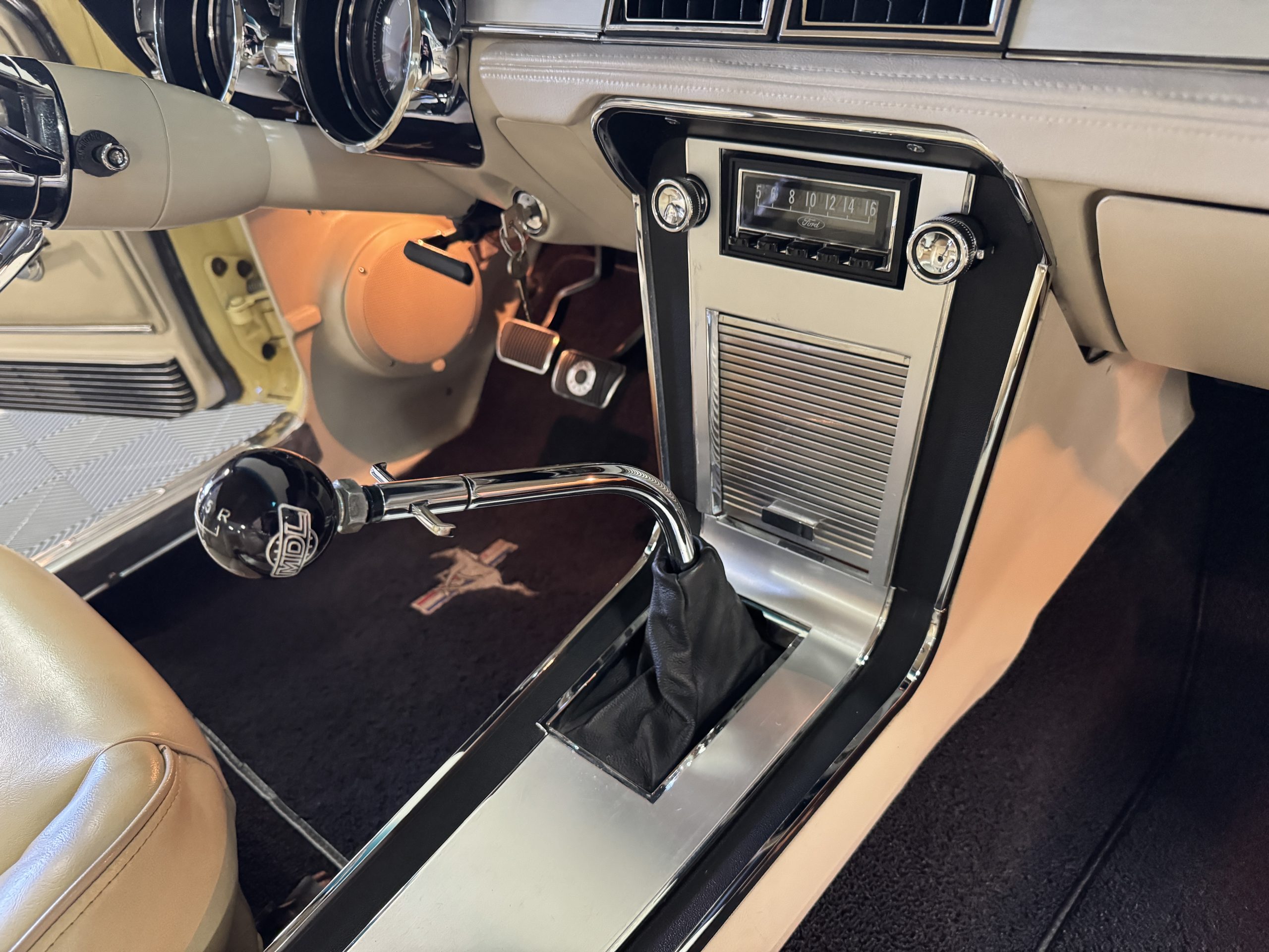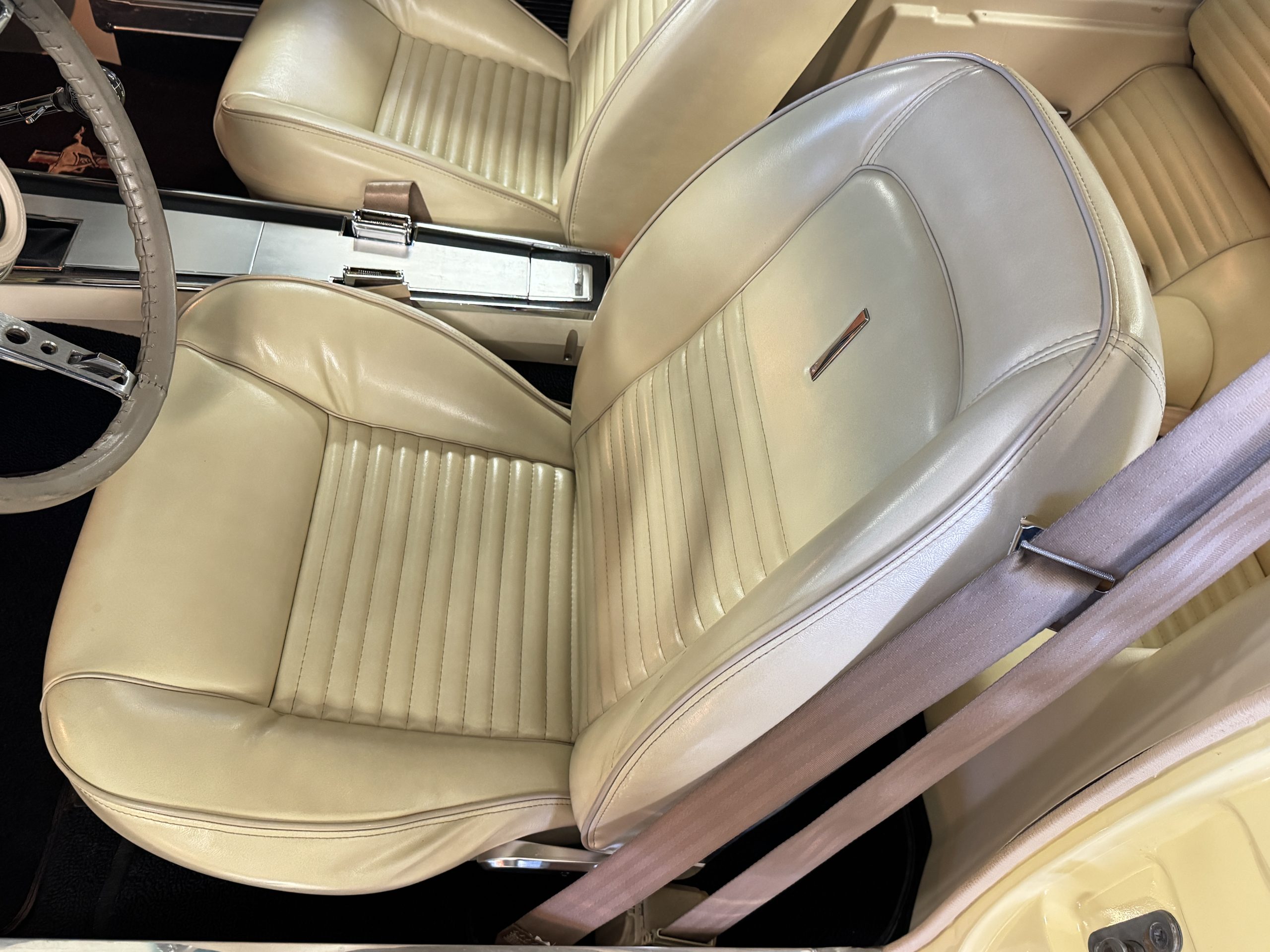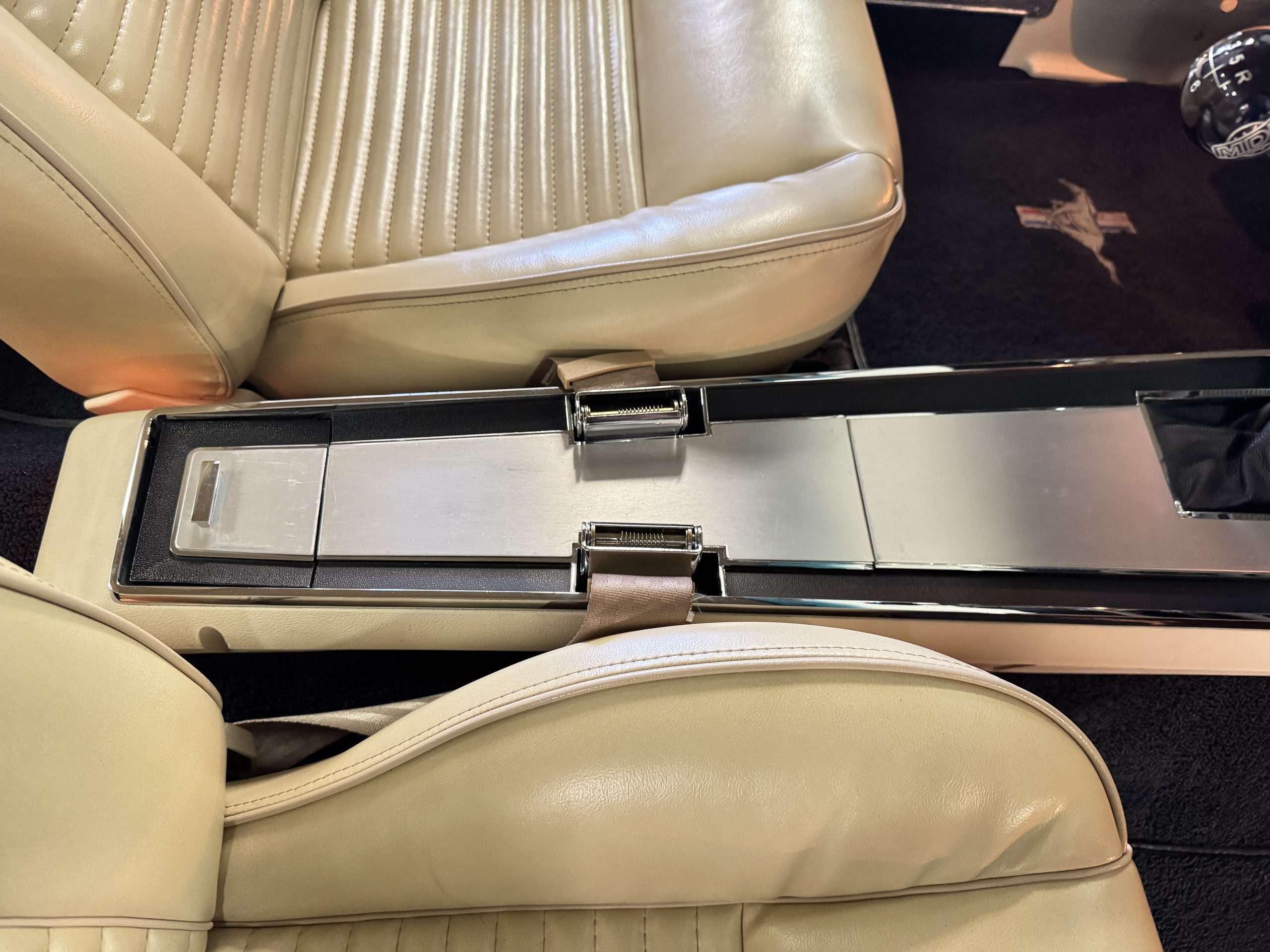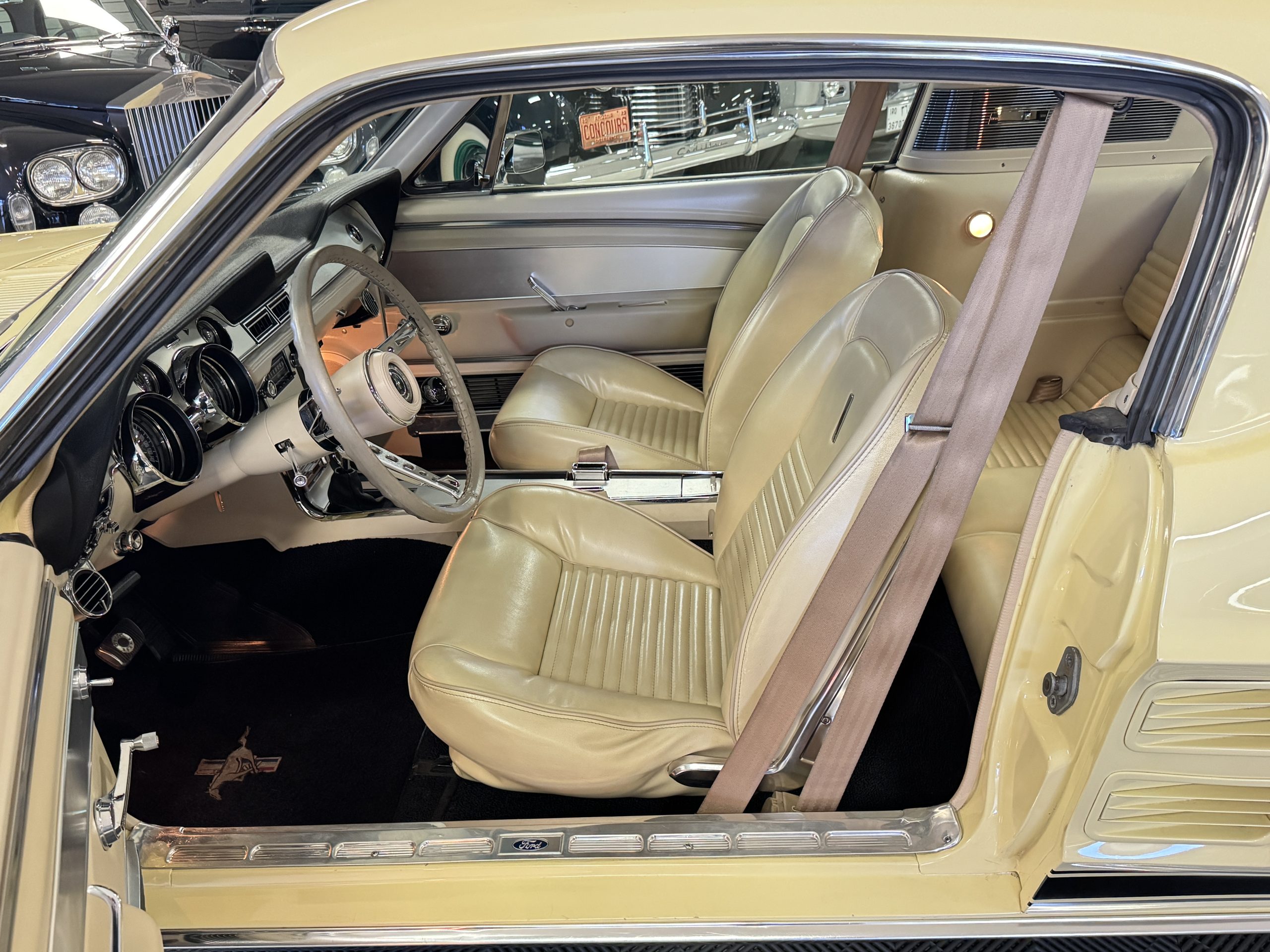 Inside, the Mustang features a Palomino vinyl interior with front bucket seats and a folding Sport Deck rear seat, with deluxe seatbelts, all in very good condition and consistent with the Mustang’s period-correct presentation. Black carpeting with Mustang floor mats remains clean and serviceable, while the 1967-year-only padded horn pad on the wrapped steering wheel shows light wear consistent with careful use. The brushed chrome gauge cluster houses fully functional original instrumentation, including a 140-mph speedometer with digital odometer, and the light gray polyurethane dash pad remains in very good condition. Factory-style amenities include power windows designed to resemble original roll-up glass, power steering, an AM radio plate over upgraded stereo, functional factory air conditioning, and fully operational interior lighting.