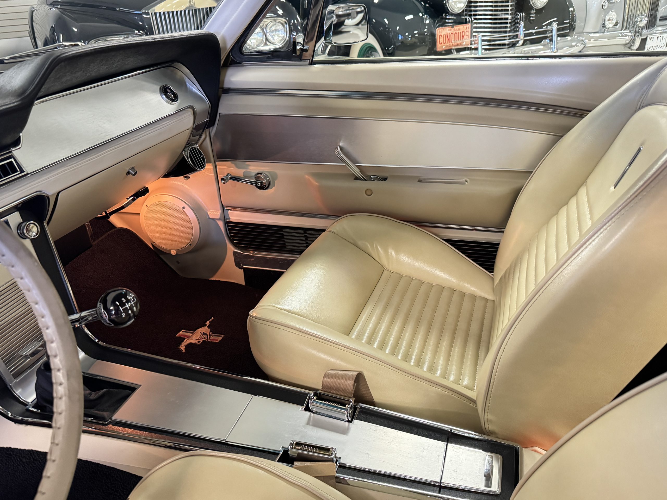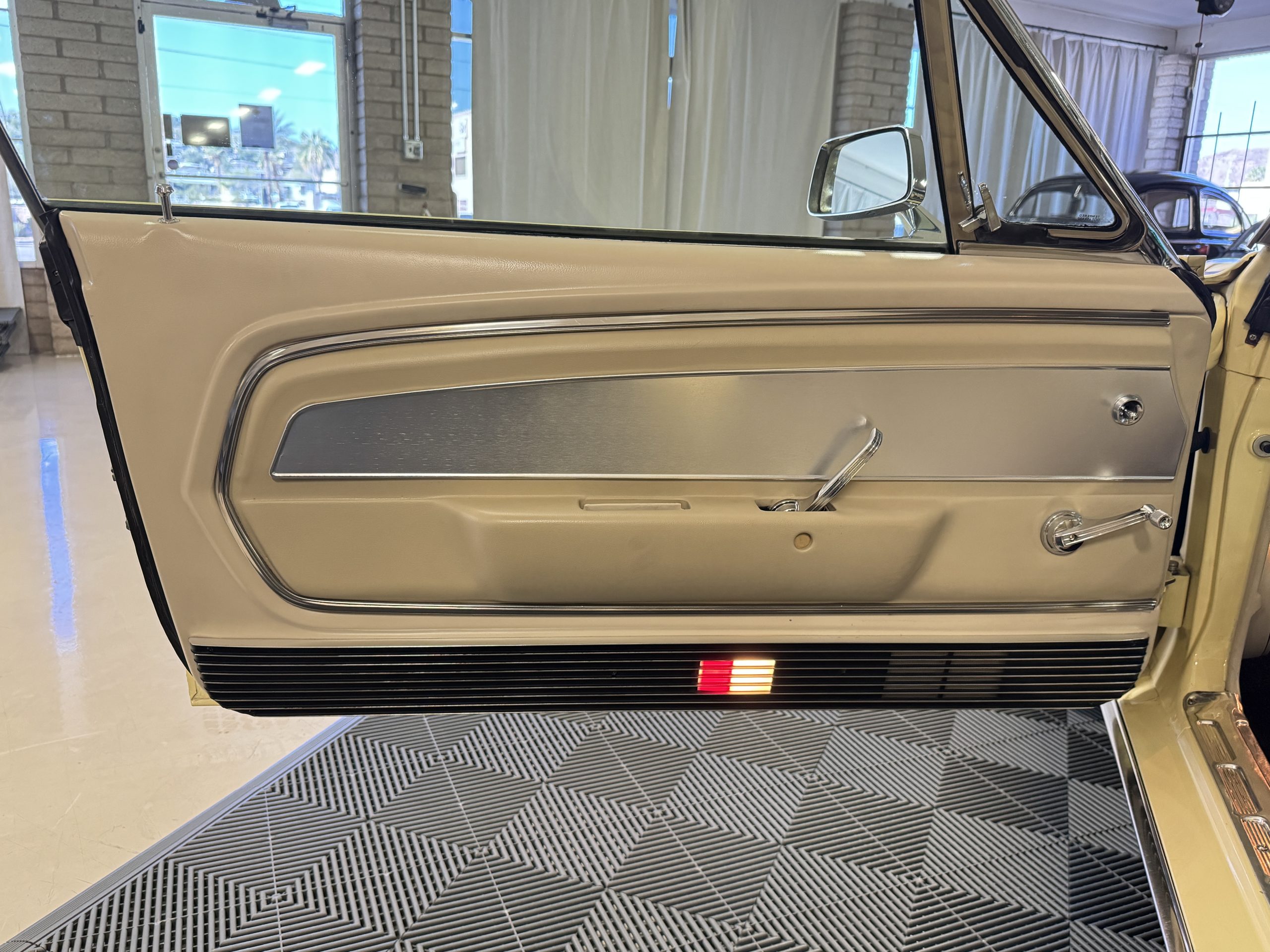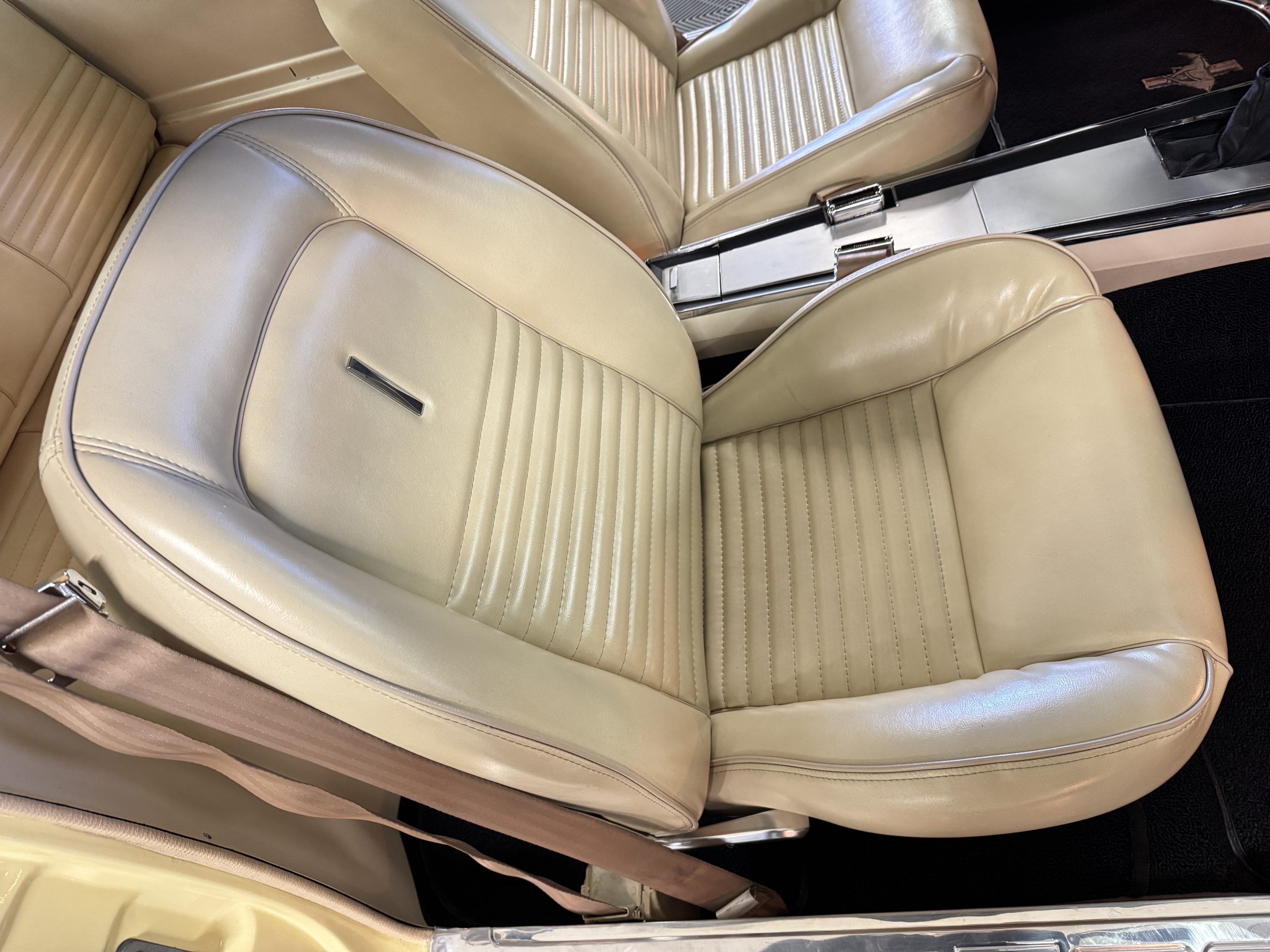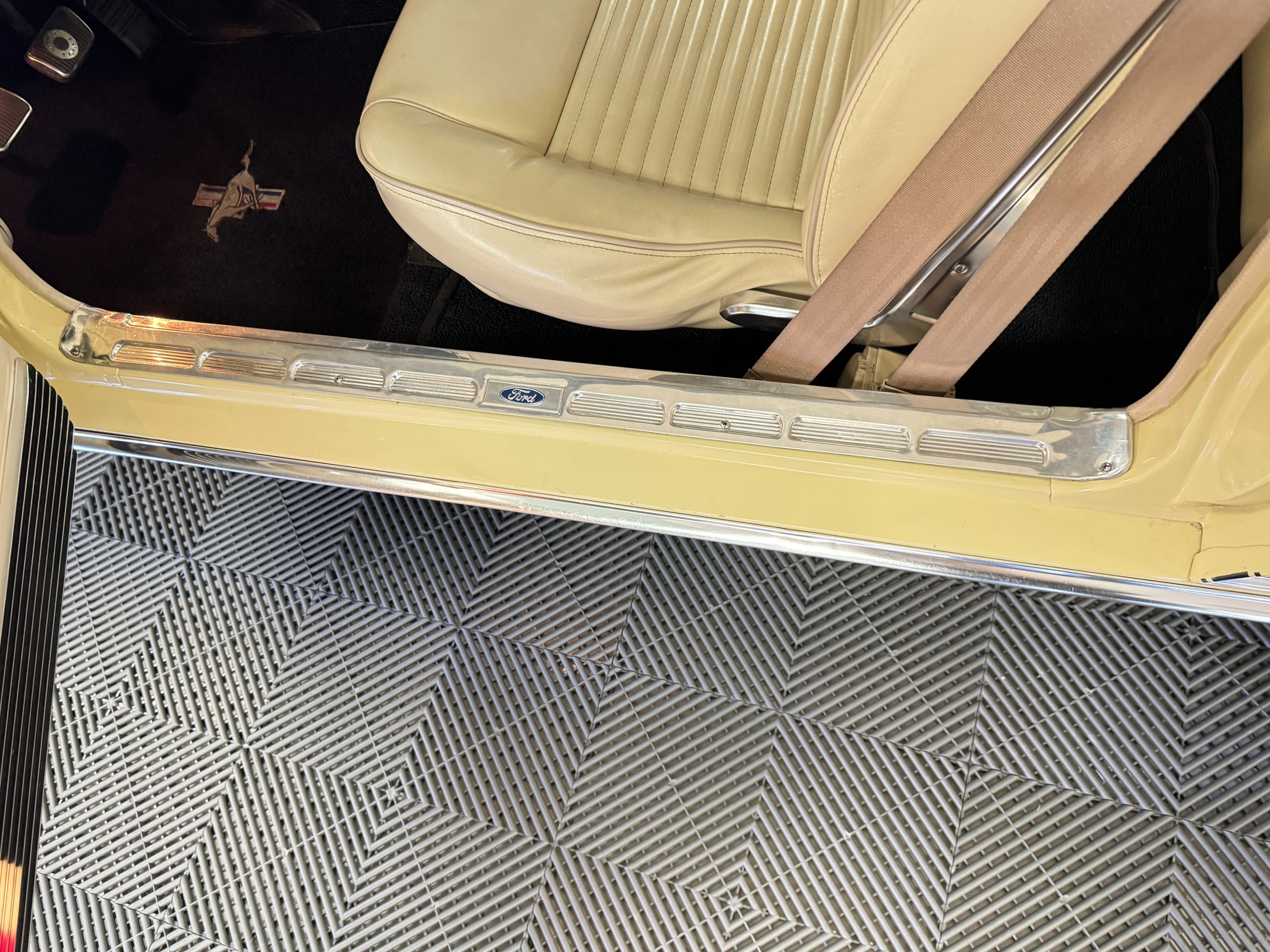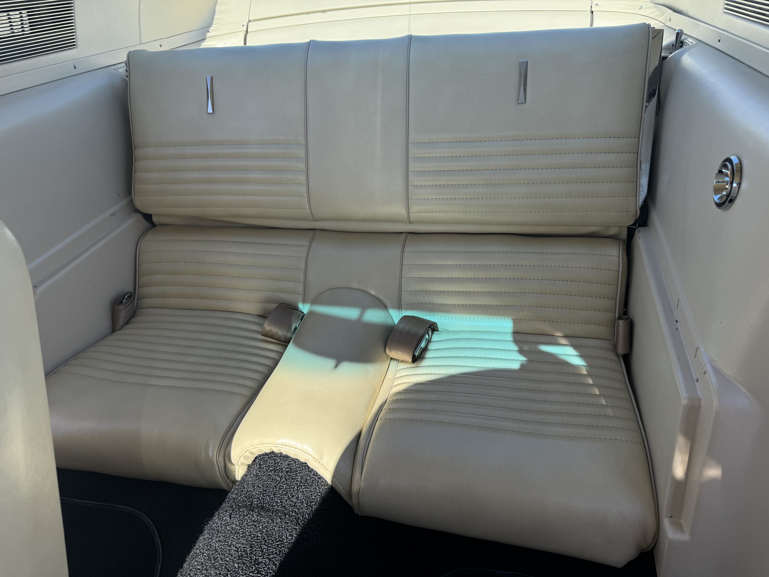 Inside, the Mustang features a Palomino vinyl interior with front bucket seats and a folding Sport Deck rear seat, with deluxe seatbelts, all in very good condition and consistent with the Mustang’s period-correct presentation. Black carpeting with Mustang floor mats remains clean and serviceable, while the 1967-year-only padded horn pad on the wrapped steering wheel shows light wear consistent with careful use. The brushed chrome gauge cluster houses fully functional original instrumentation, including a 140-mph speedometer with digital odometer, and the light gray polyurethane dash pad remains in very good condition. Factory-style amenities include power windows designed to resemble original roll-up glass, power steering, an AM radio plate over upgraded stereo, functional factory air conditioning, and fully operational interior lighting.