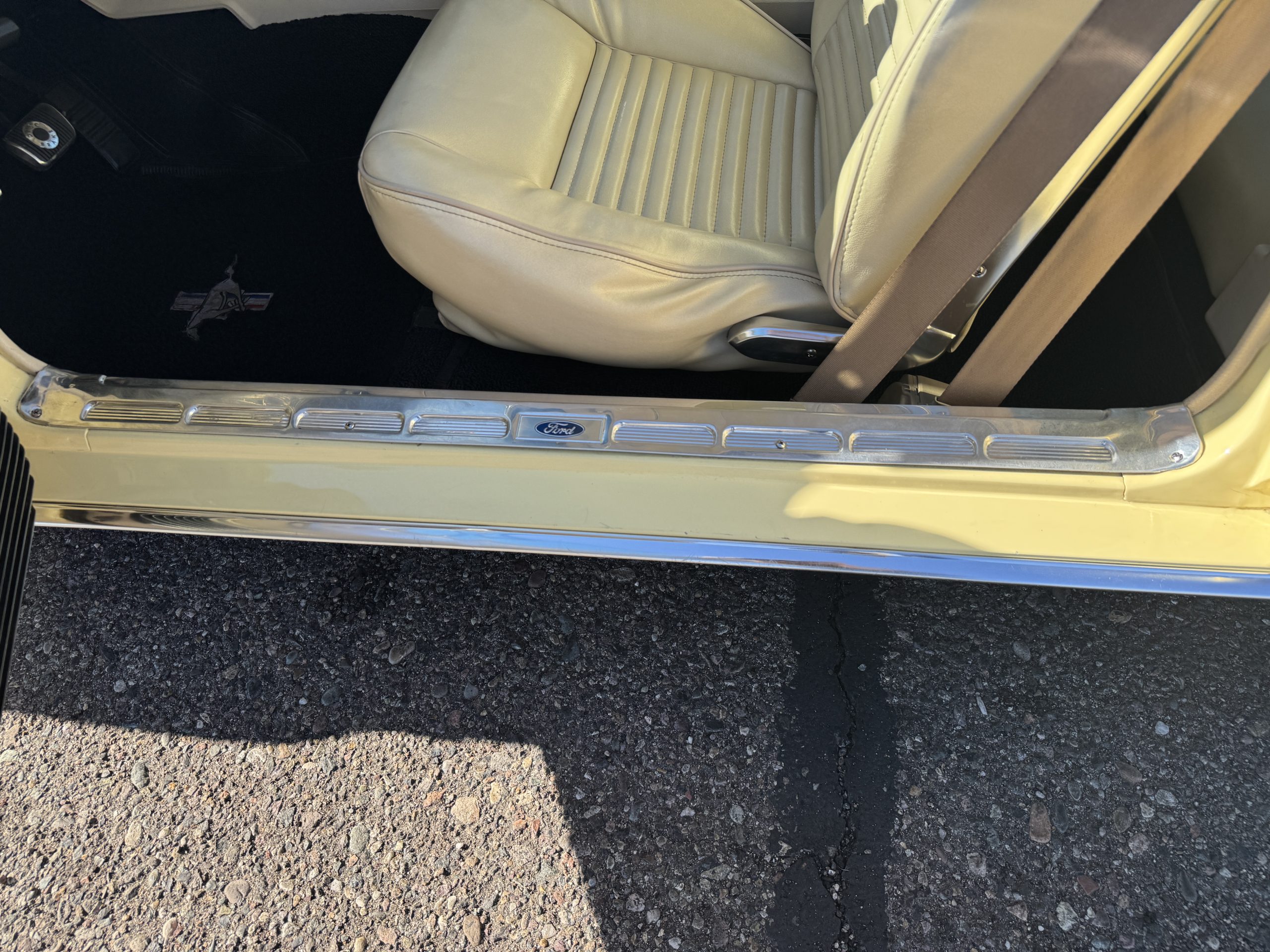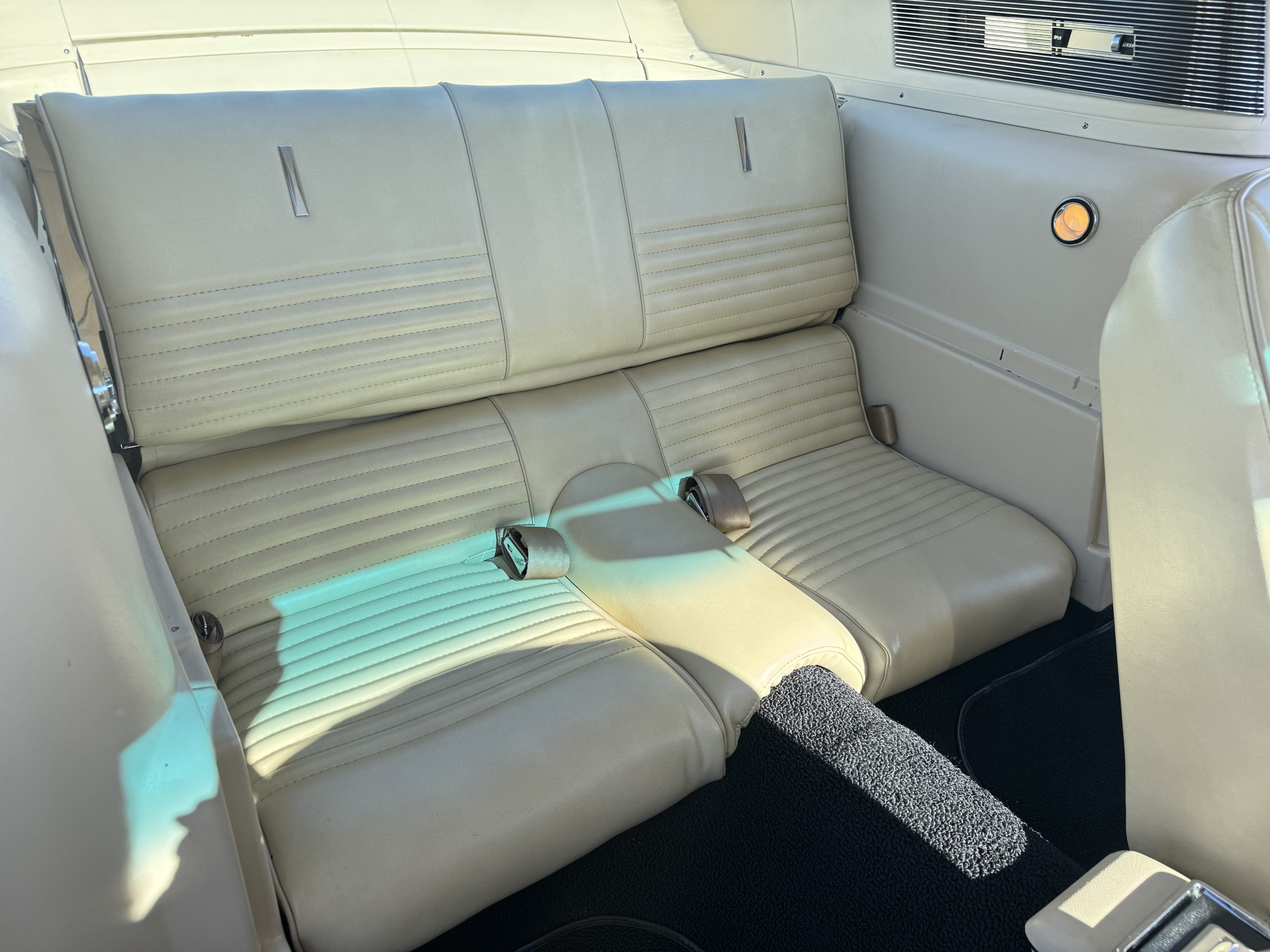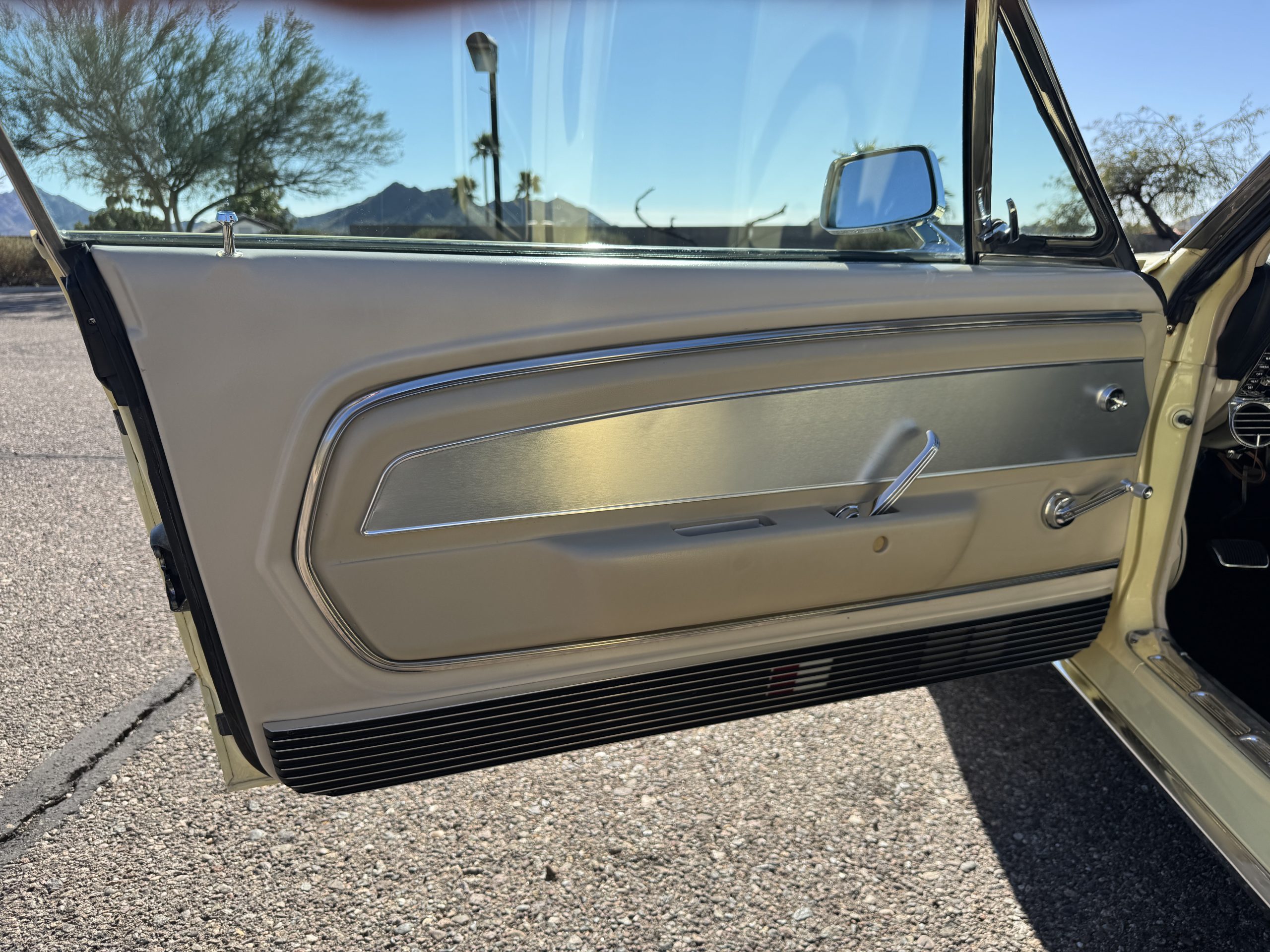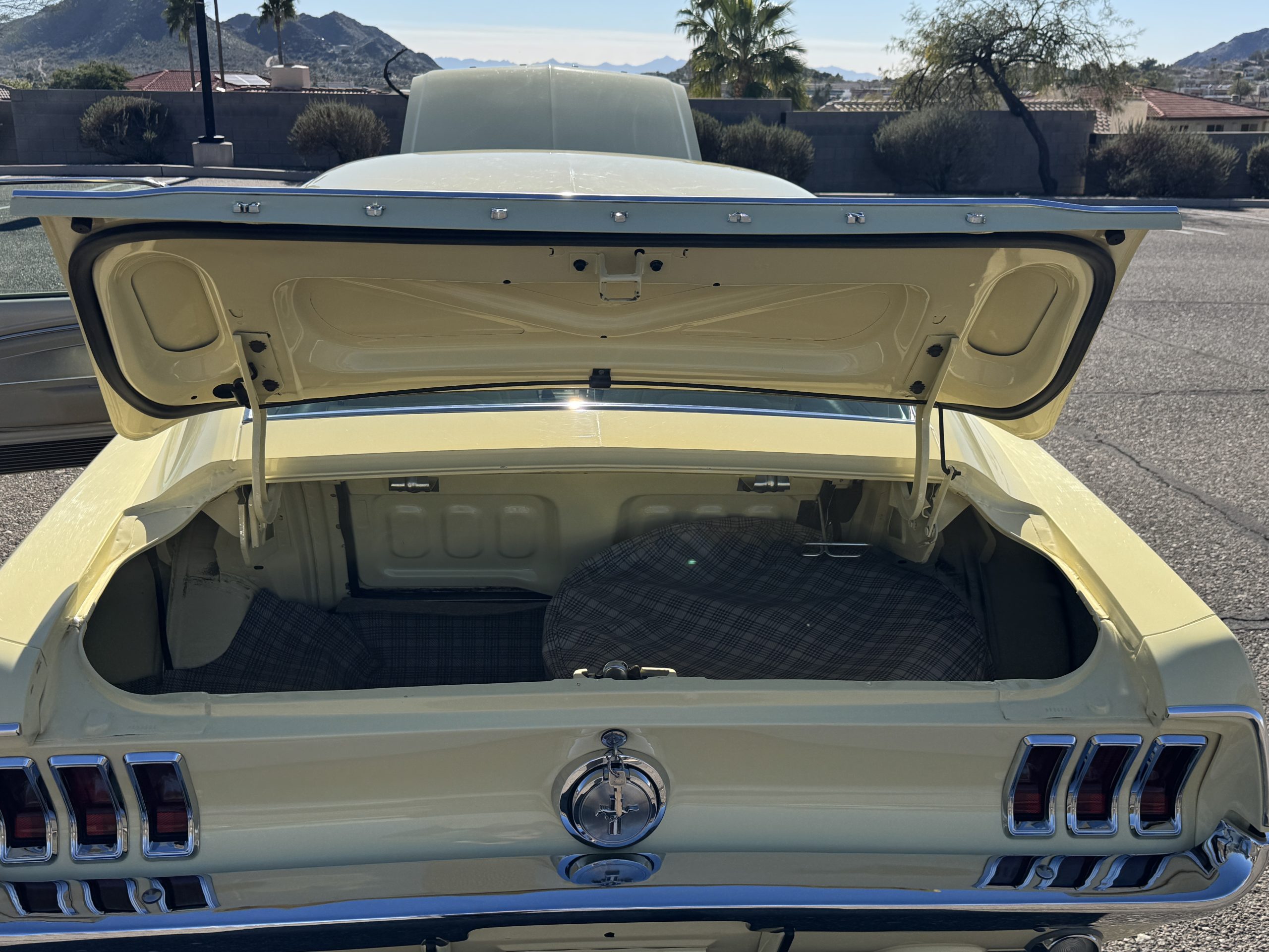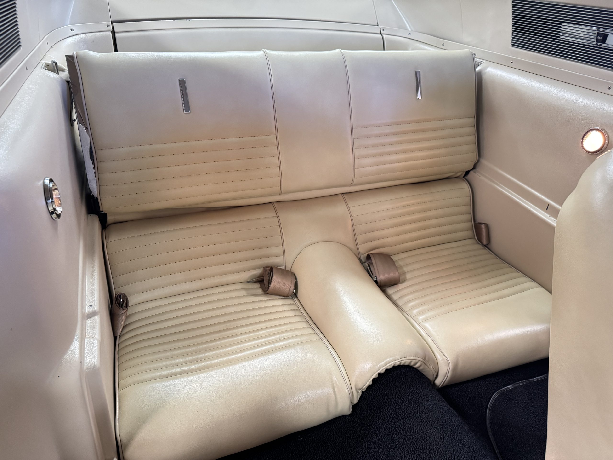 Inside, the Mustang features a Palomino vinyl interior with front bucket seats and a folding Sport Deck rear seat, with deluxe seatbelts, all in very good condition and consistent with the Mustang’s period-correct presentation. Black carpeting with Mustang floor mats remains clean and serviceable, while the 1967-year-only padded horn pad on the wrapped steering wheel shows light wear consistent with careful use. The brushed chrome gauge cluster houses fully functional original instrumentation, including a 140-mph speedometer with digital odometer, and the light gray polyurethane dash pad remains in very good condition. Factory-style amenities include power windows designed to resemble original roll-up glass, power steering, an AM radio plate over upgraded stereo, functional factory air conditioning, and fully operational interior lighting.