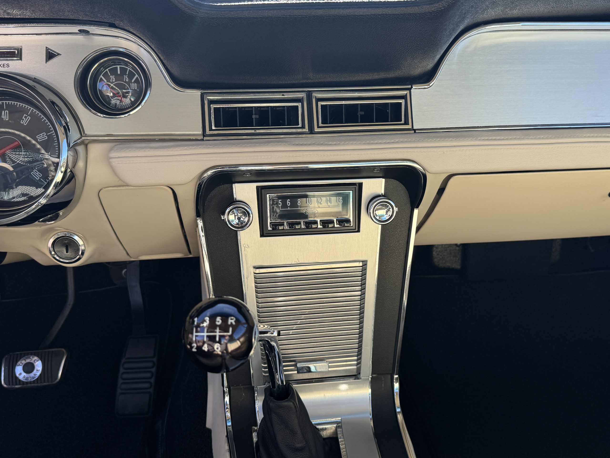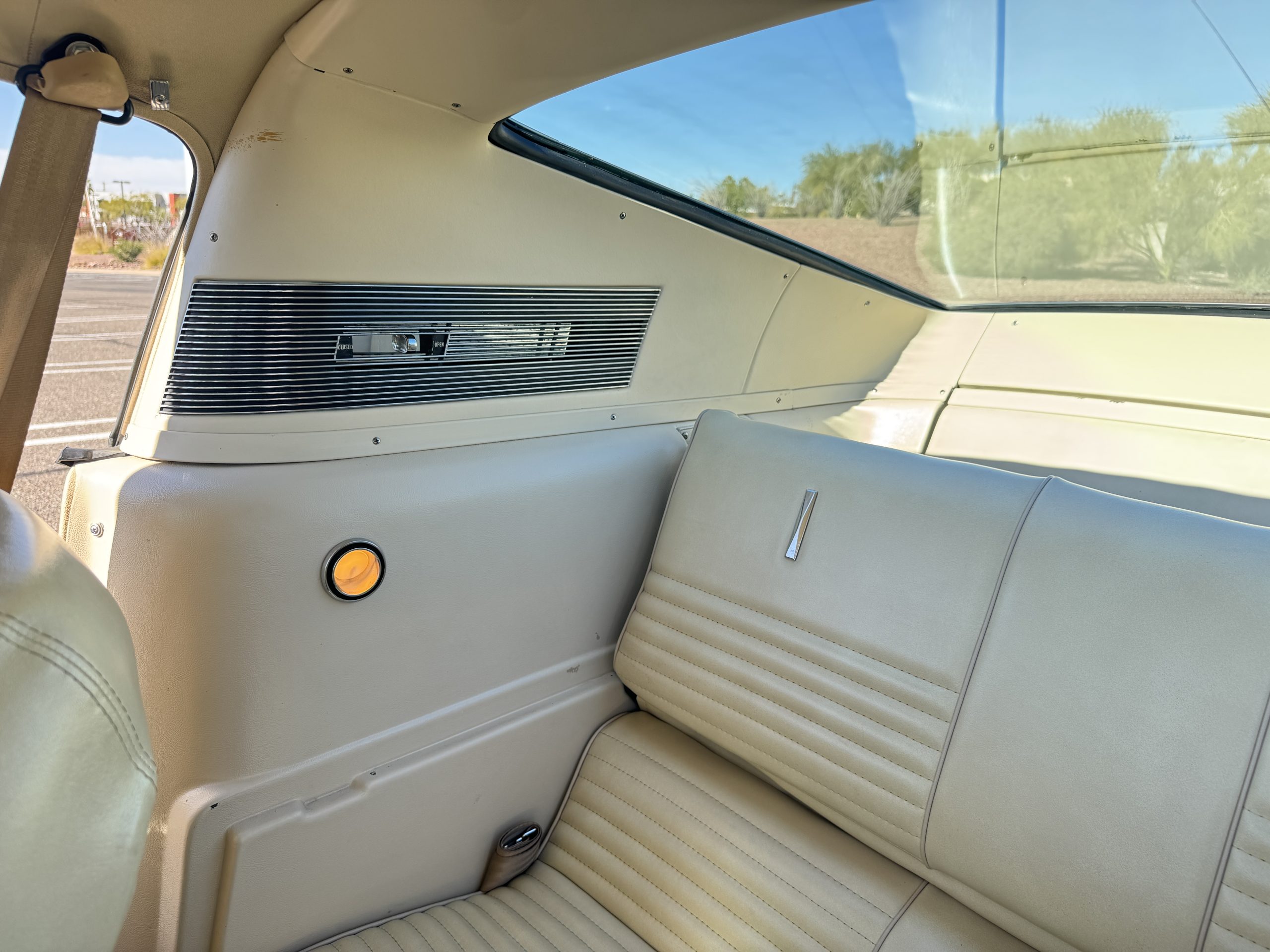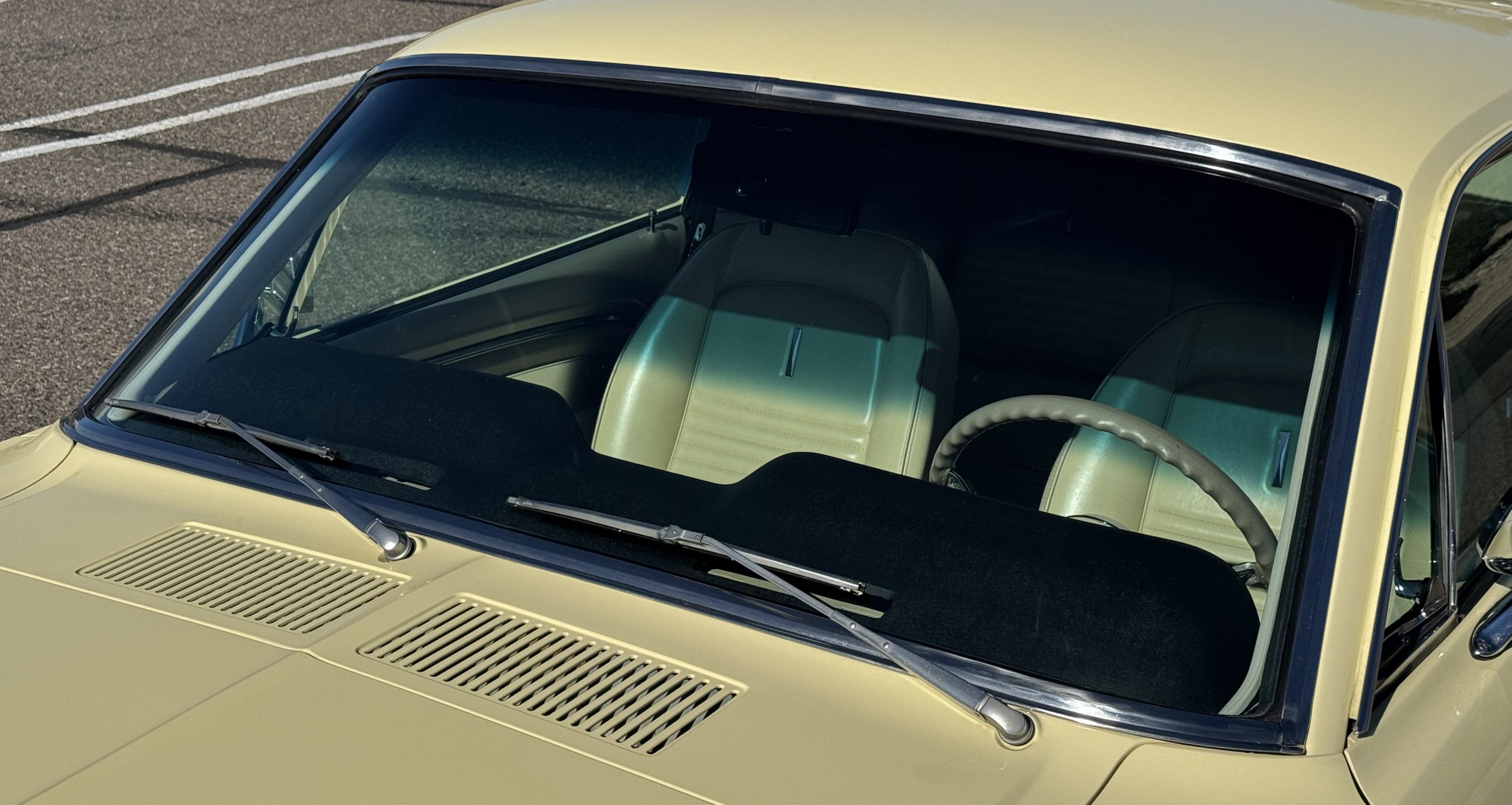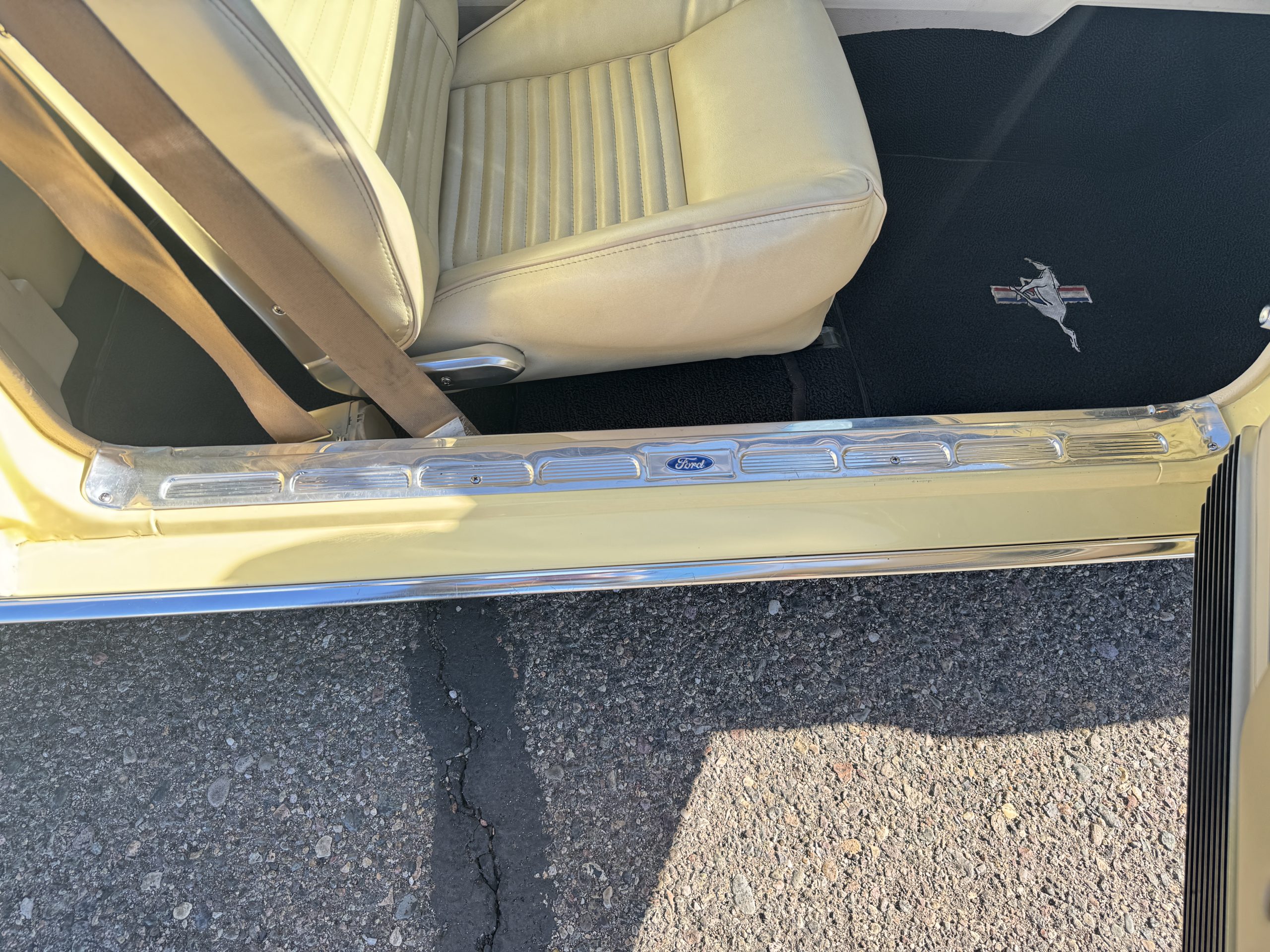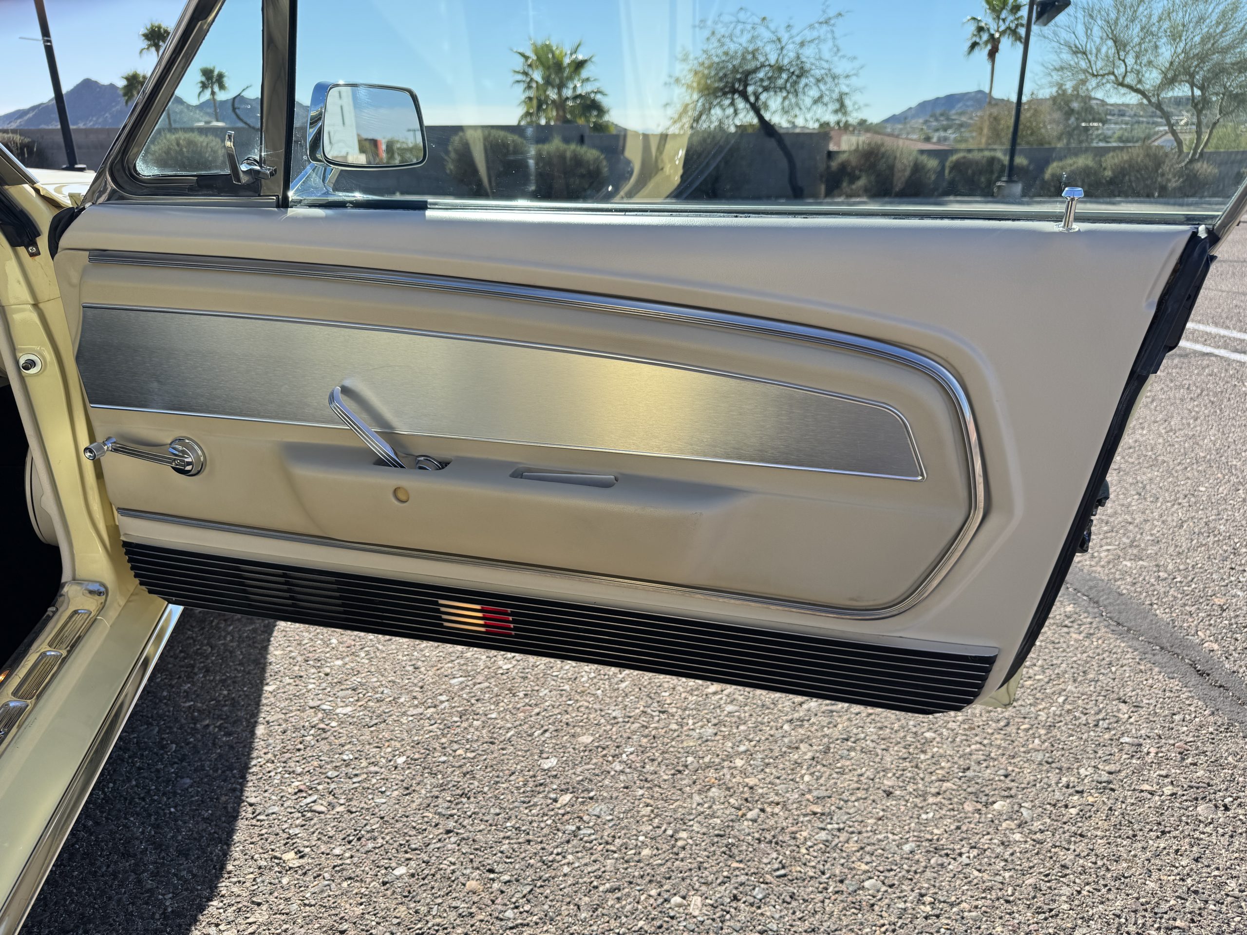 Inside, the Mustang features a Palomino vinyl interior with front bucket seats and a folding Sport Deck rear seat, with deluxe seatbelts, all in very good condition and consistent with the Mustang’s period-correct presentation. Black carpeting with Mustang floor mats remains clean and serviceable, while the 1967-year-only padded horn pad on the wrapped steering wheel shows light wear consistent with careful use. The brushed chrome gauge cluster houses fully functional original instrumentation, including a 140-mph speedometer with digital odometer, and the light gray polyurethane dash pad remains in very good condition. Factory-style amenities include power windows designed to resemble original roll-up glass, power steering, an AM radio plate over upgraded stereo, functional factory air conditioning, and fully operational interior lighting.