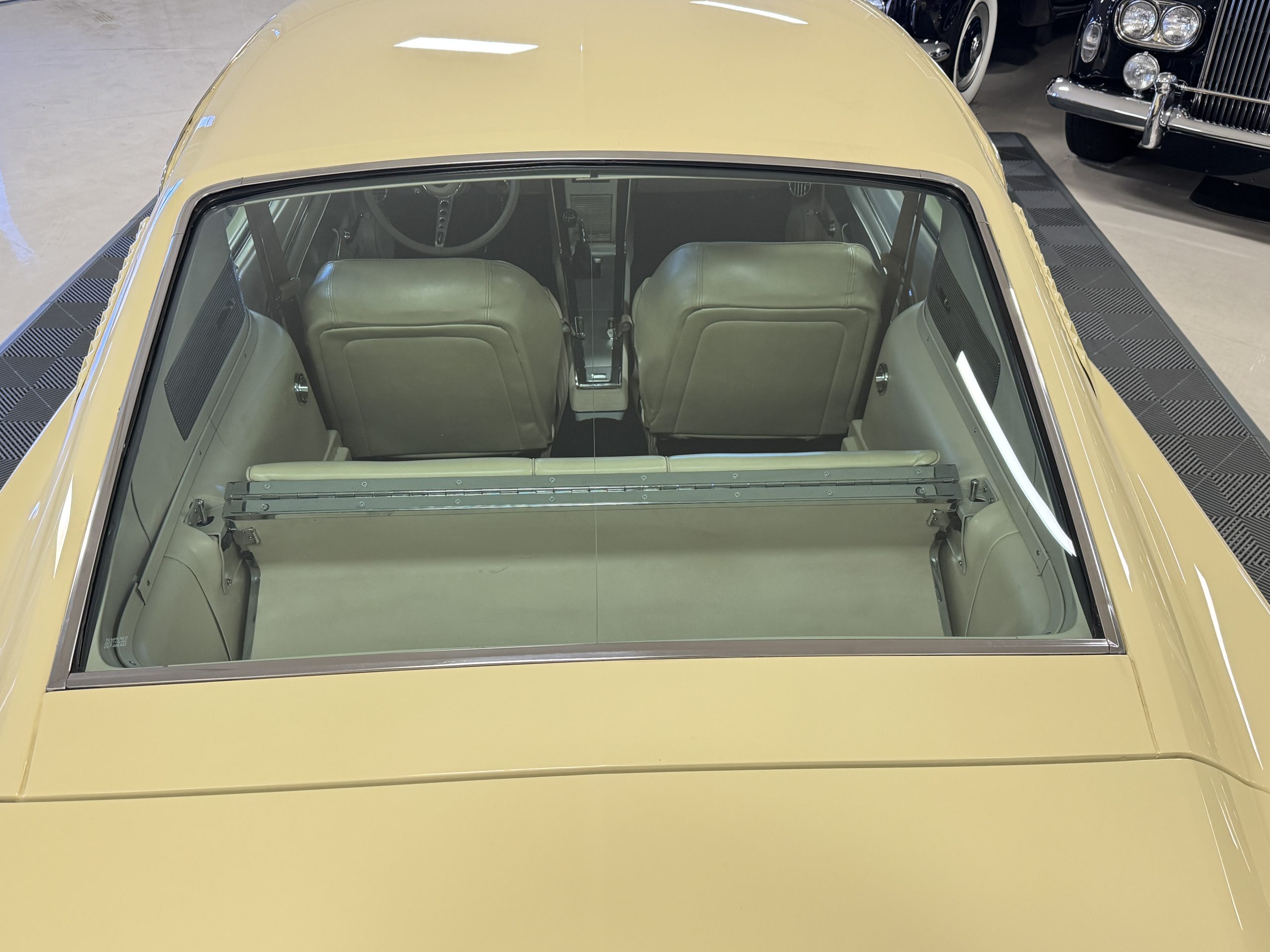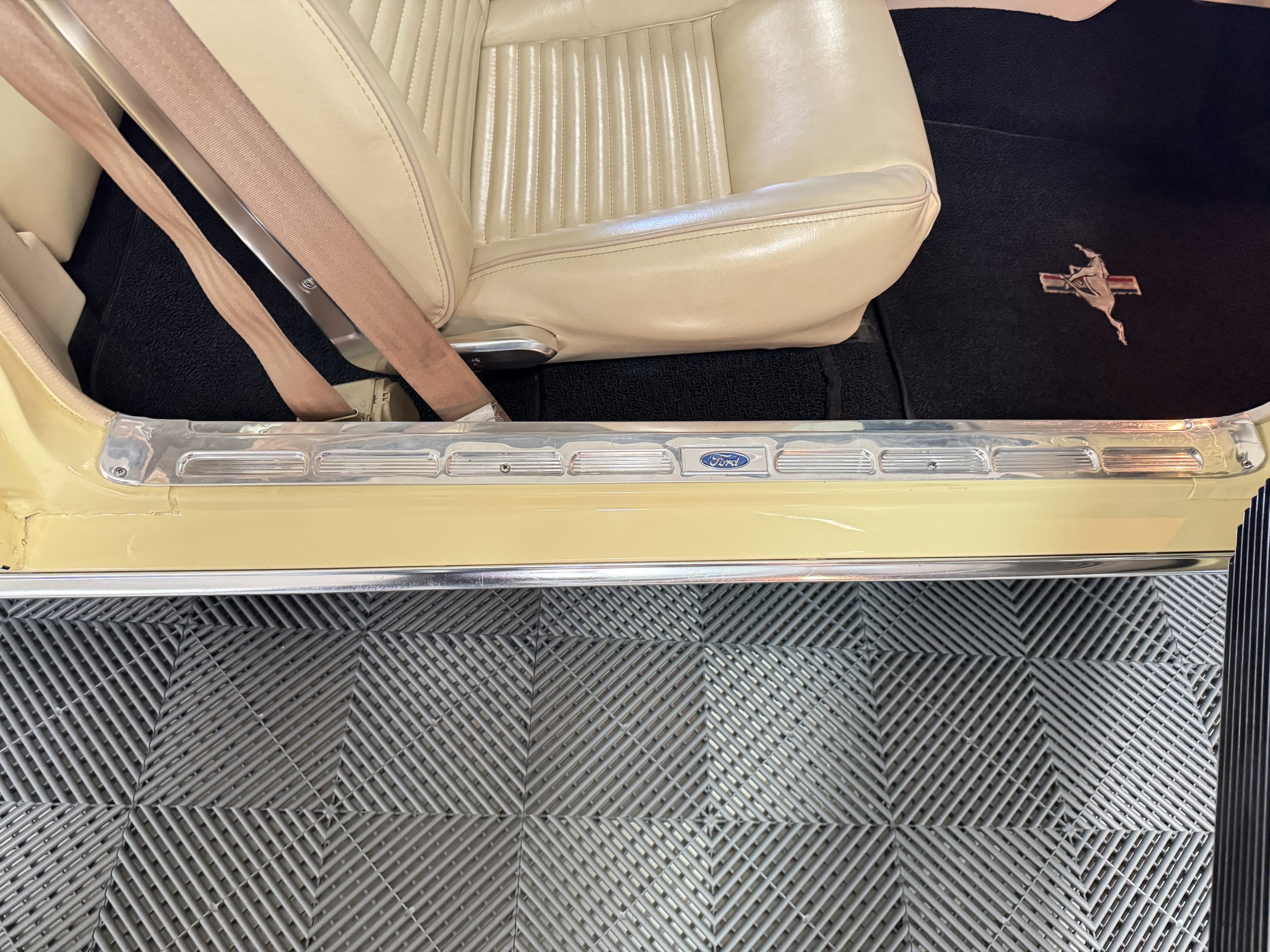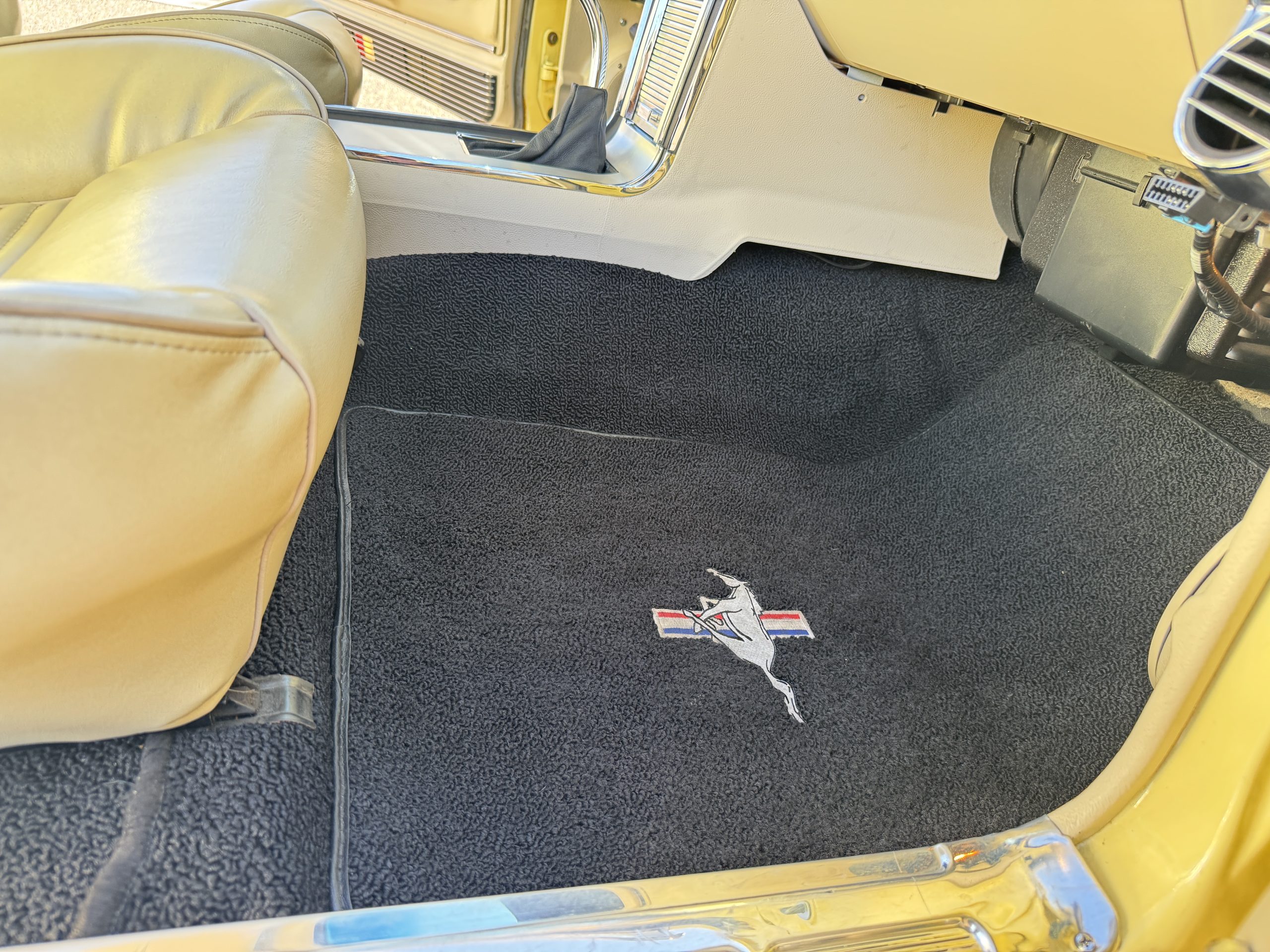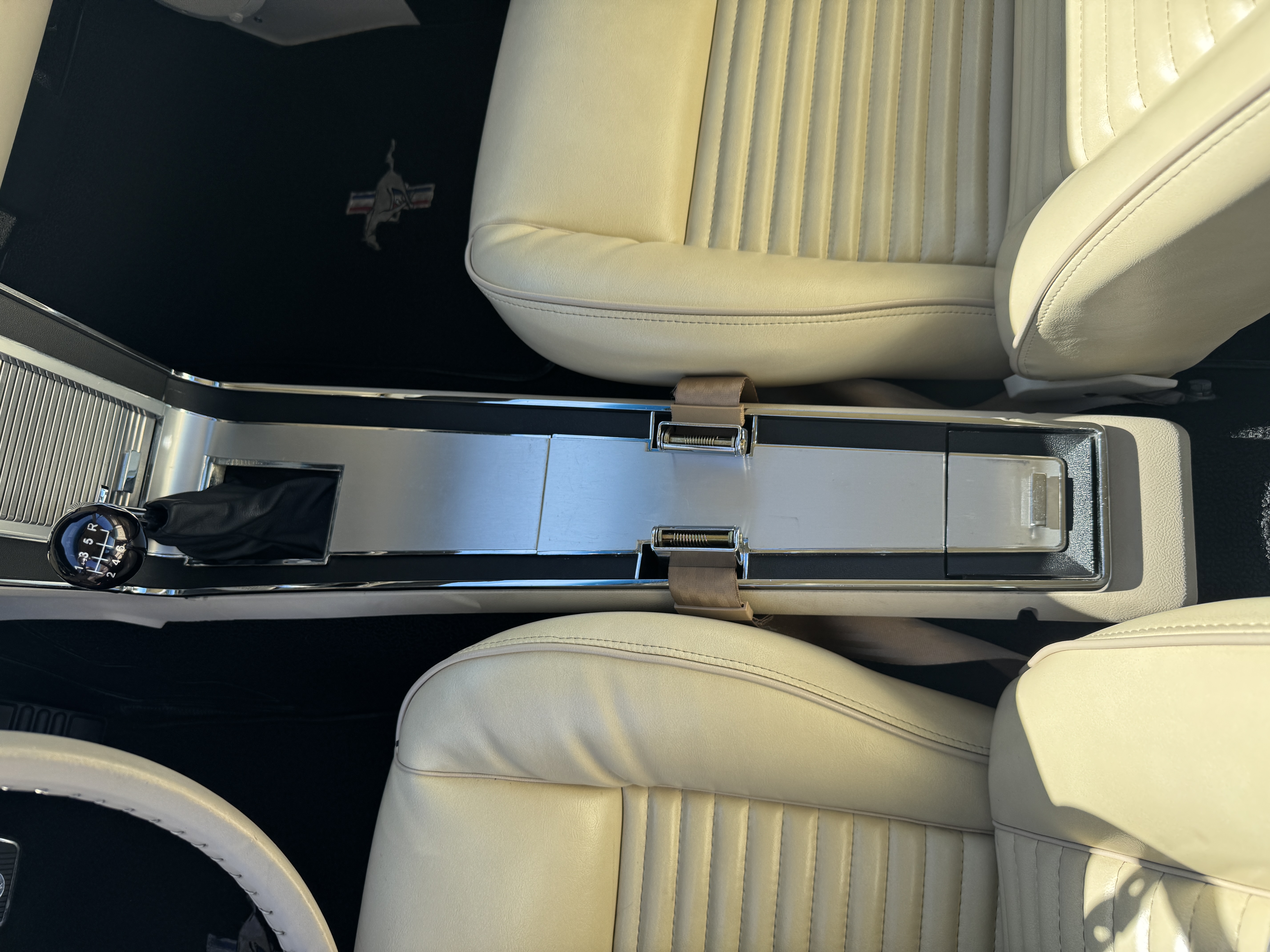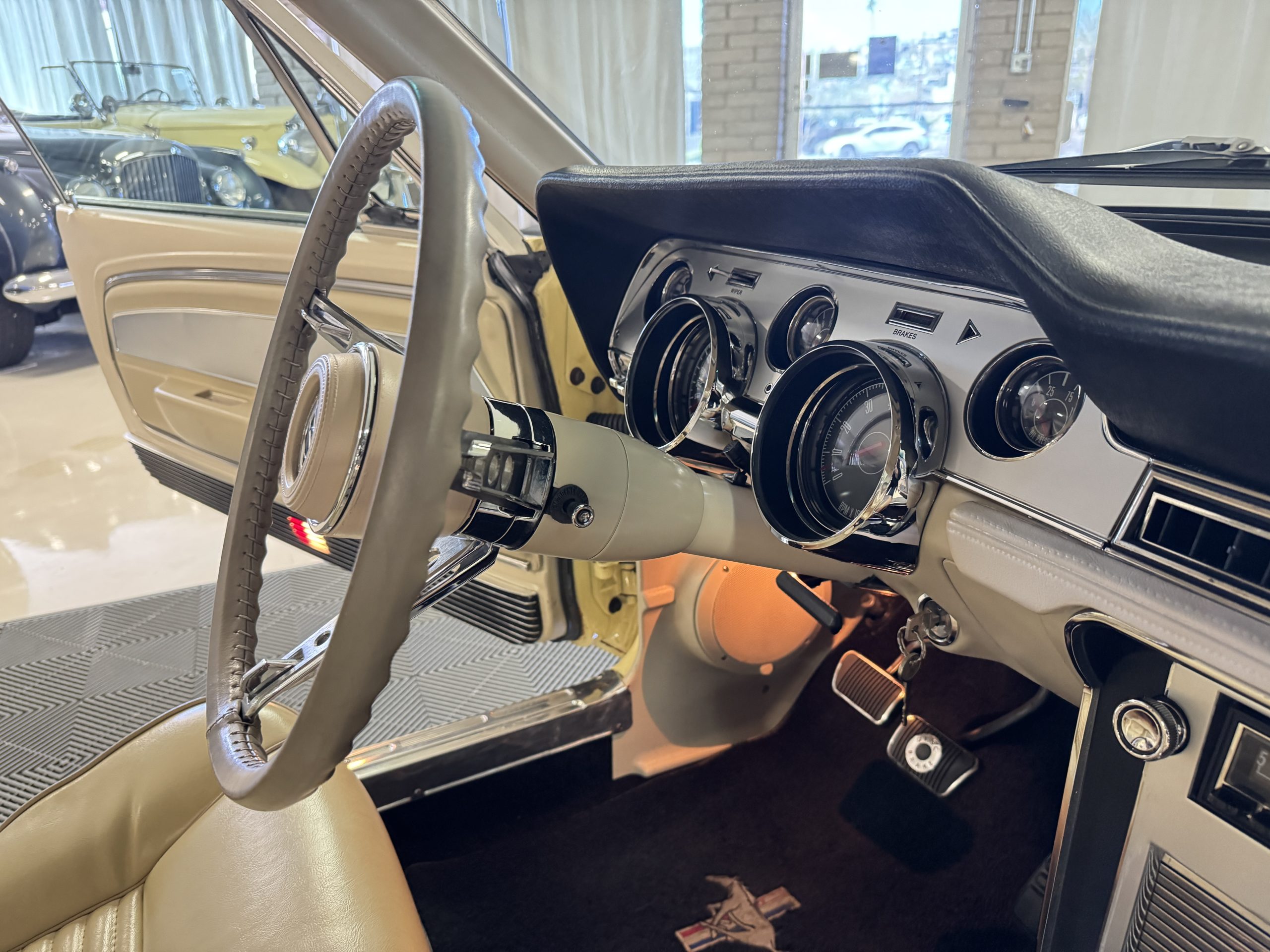 Inside, the Mustang features a Palomino vinyl interior with front bucket seats and a folding Sport Deck rear seat, with deluxe seatbelts, all in very good condition and consistent with the Mustang’s period-correct presentation. Black carpeting with Mustang floor mats remains clean and serviceable, while the 1967-year-only padded horn pad on the wrapped steering wheel shows light wear consistent with careful use. The brushed chrome gauge cluster houses fully functional original instrumentation, including a 140-mph speedometer with digital odometer, and the light gray polyurethane dash pad remains in very good condition. Factory-style amenities include power windows designed to resemble original roll-up glass, power steering, an AM radio plate over upgraded stereo, functional factory air conditioning, and fully operational interior lighting.