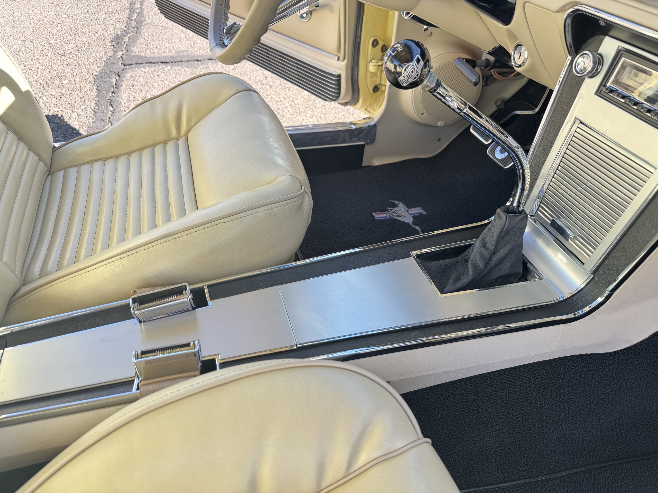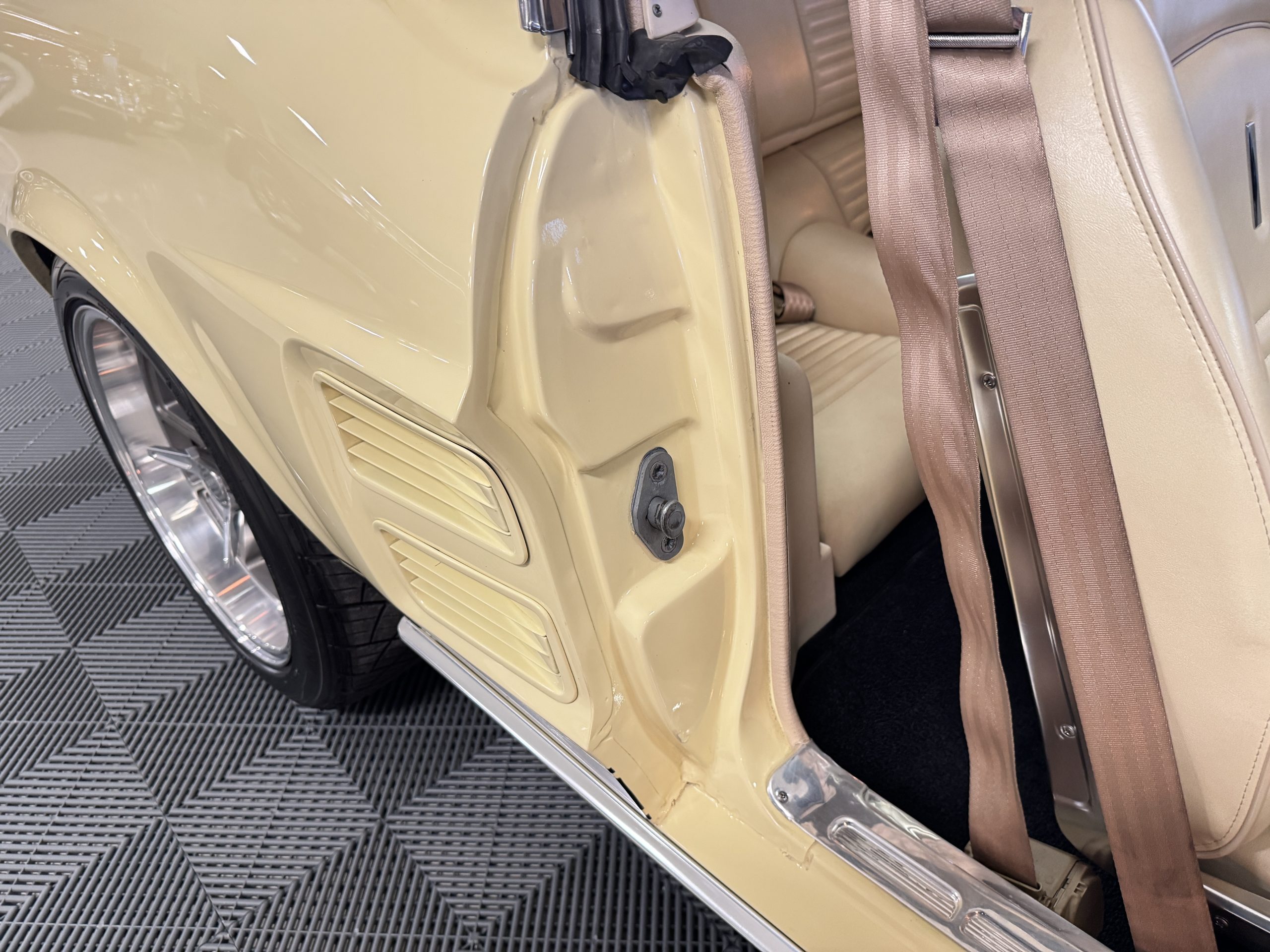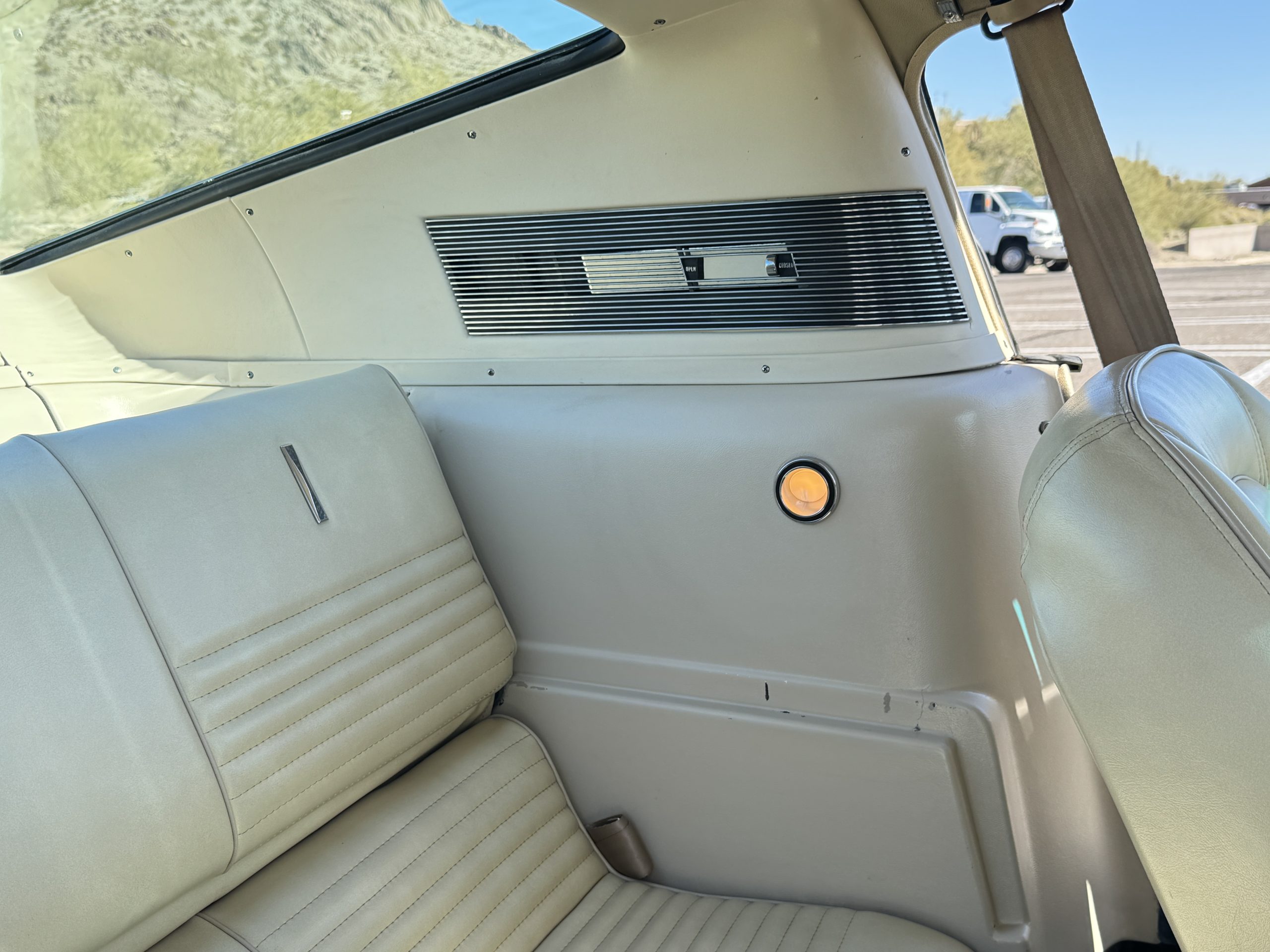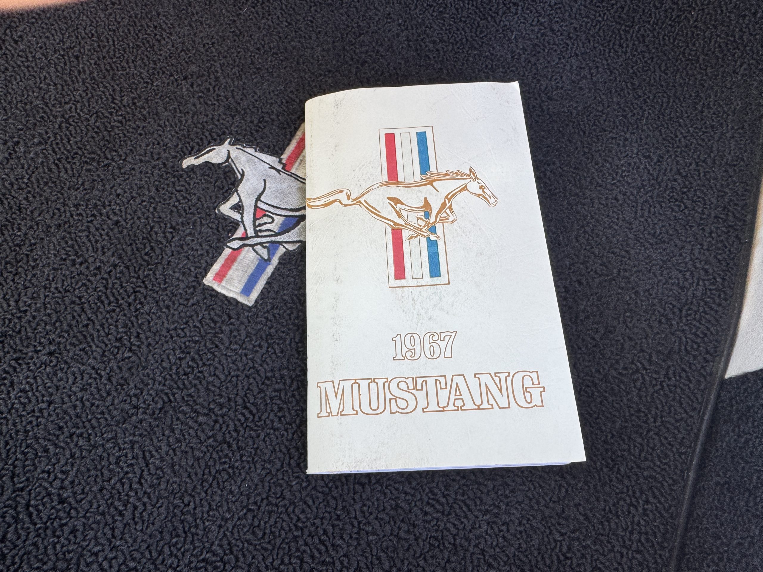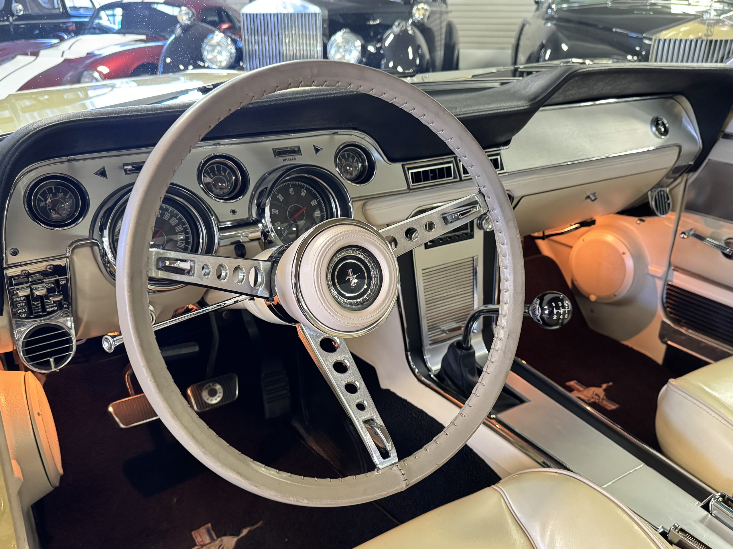 Inside, the Mustang features a Palomino vinyl interior with front bucket seats and a folding Sport Deck rear seat, with deluxe seatbelts, all in very good condition and consistent with the Mustang’s period-correct presentation. Black carpeting with Mustang floor mats remains clean and serviceable, while the 1967-year-only padded horn pad on the wrapped steering wheel shows light wear consistent with careful use. The brushed chrome gauge cluster houses fully functional original instrumentation, including a 140-mph speedometer with digital odometer, and the light gray polyurethane dash pad remains in very good condition. Factory-style amenities include power windows designed to resemble original roll-up glass, power steering, an AM radio plate over upgraded stereo, functional factory air conditioning, and fully operational interior lighting.