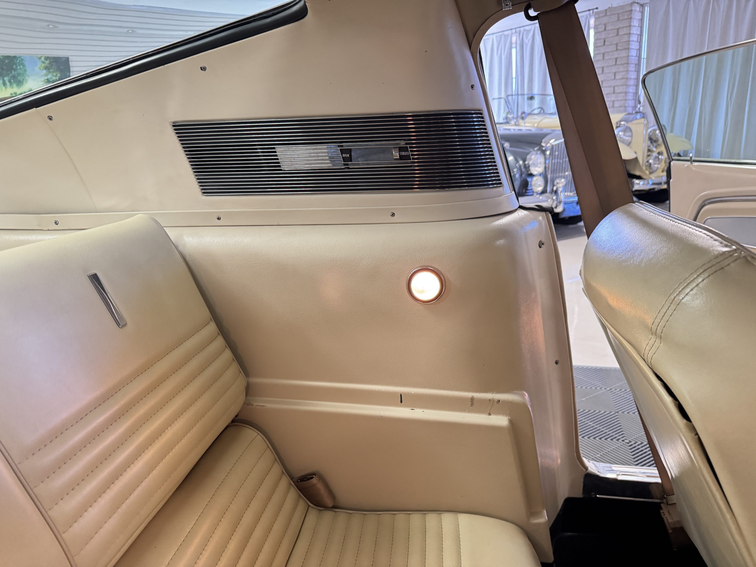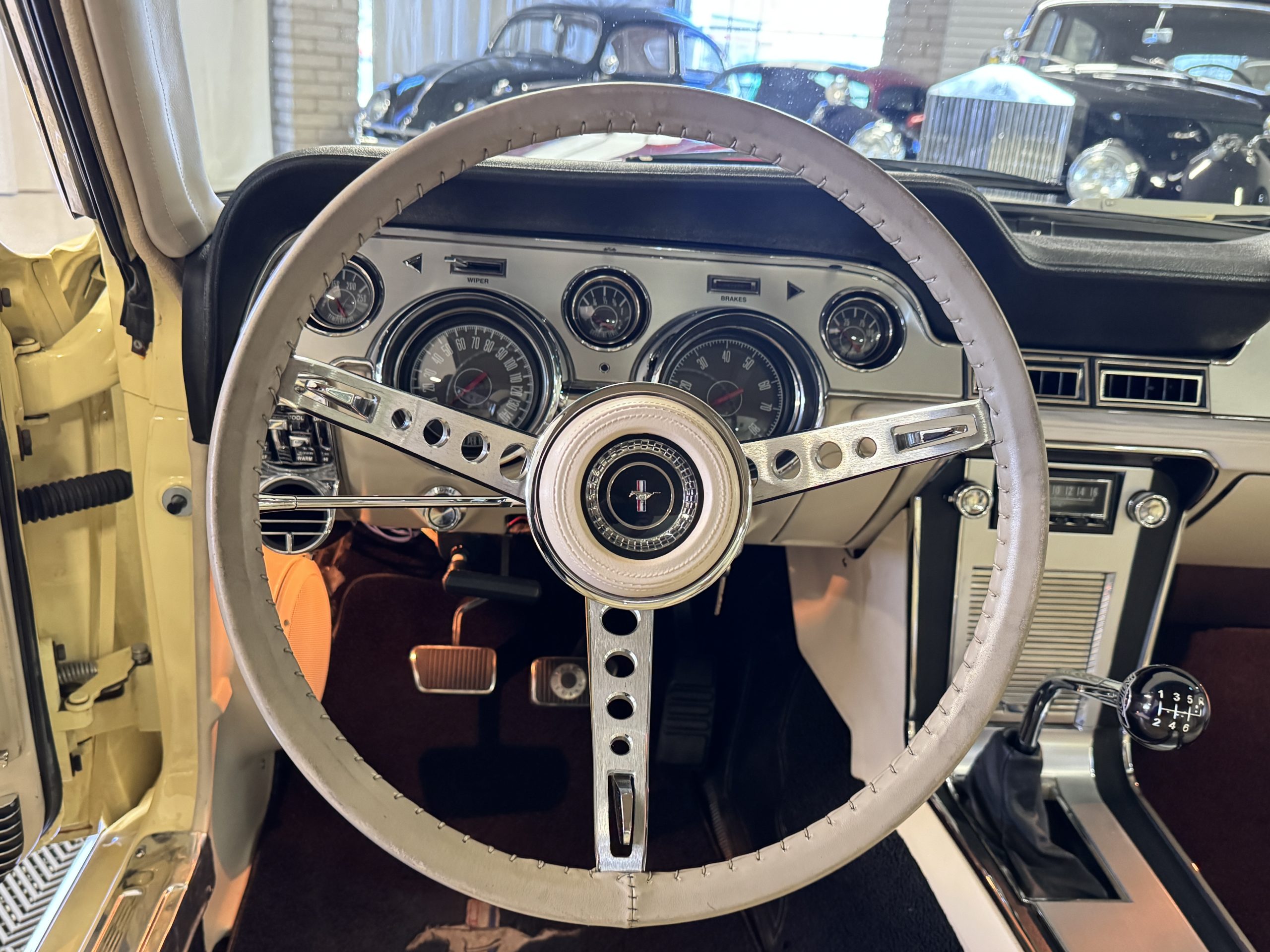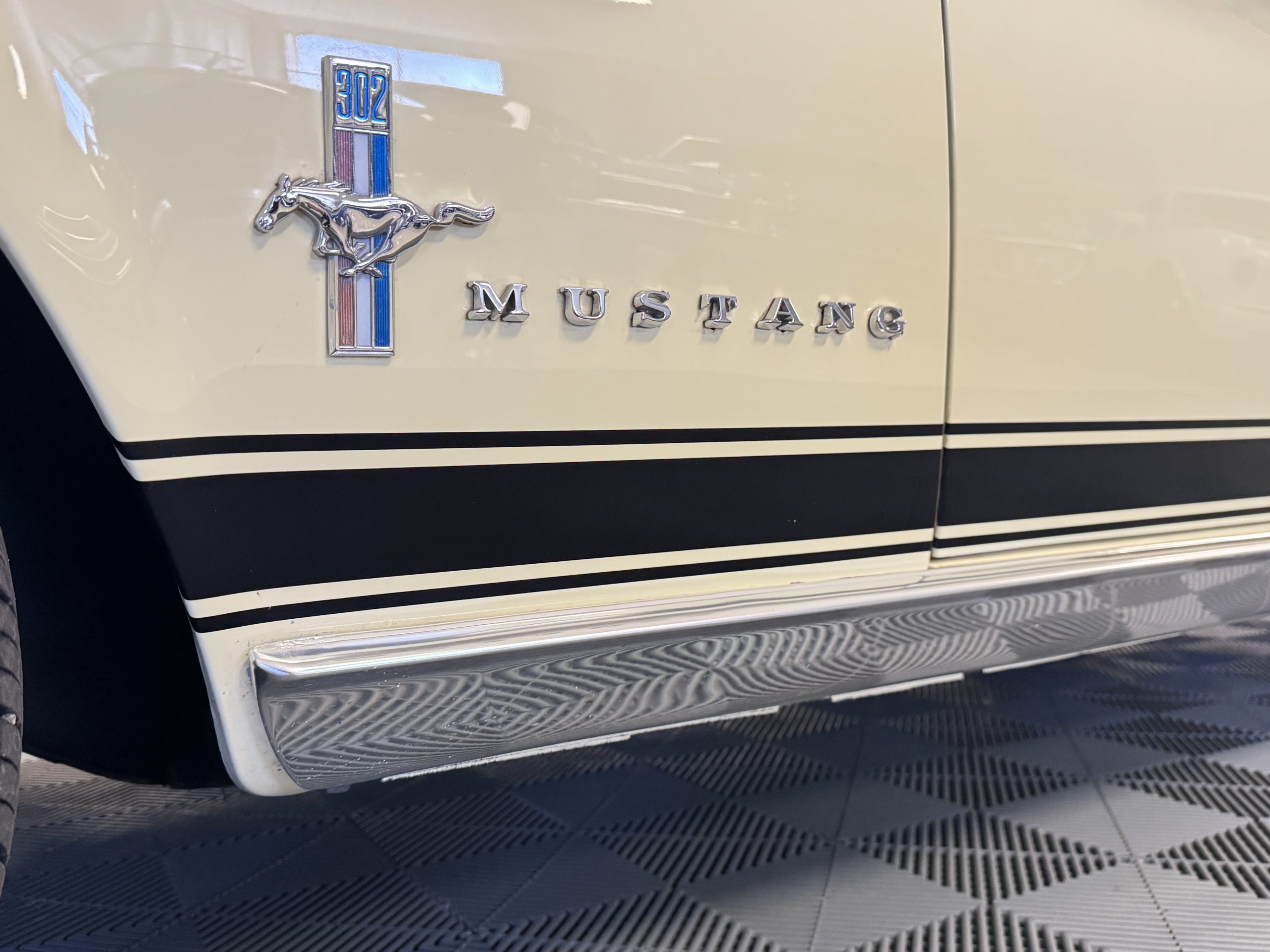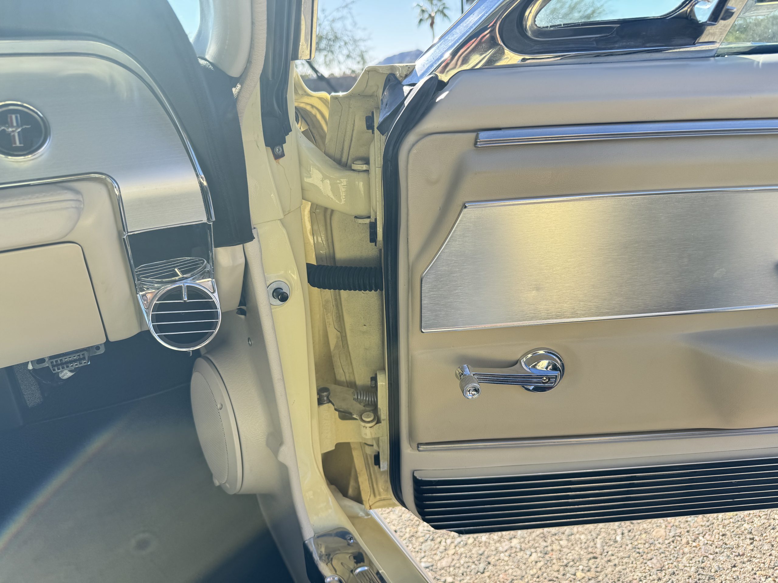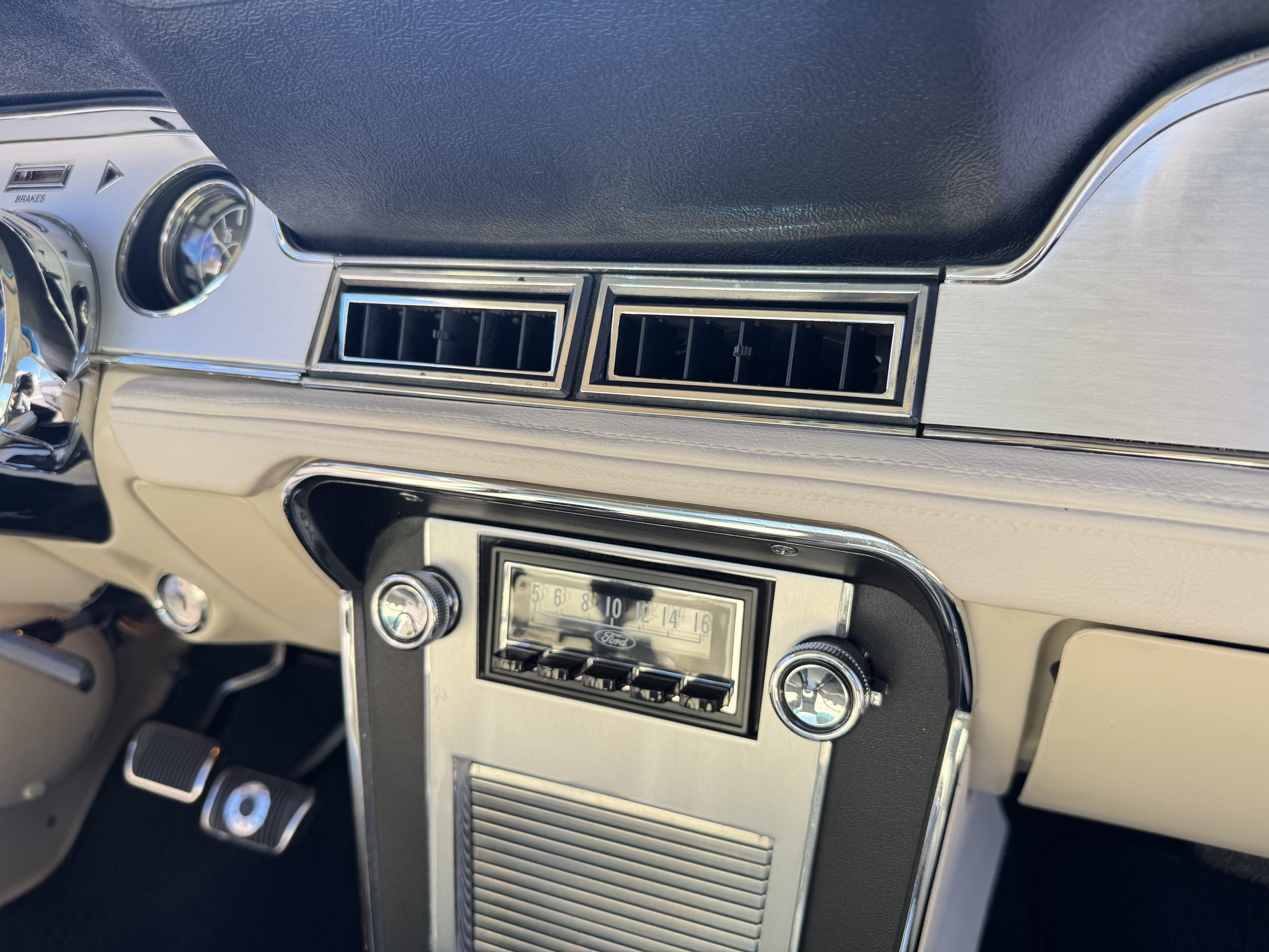 Inside, the Mustang features a Palomino vinyl interior with front bucket seats and a folding Sport Deck rear seat, with deluxe seatbelts, all in very good condition and consistent with the Mustang’s period-correct presentation. Black carpeting with Mustang floor mats remains clean and serviceable, while the 1967-year-only padded horn pad on the wrapped steering wheel shows light wear consistent with careful use. The brushed chrome gauge cluster houses fully functional original instrumentation, including a 140-mph speedometer with digital odometer, and the light gray polyurethane dash pad remains in very good condition. Factory-style amenities include power windows designed to resemble original roll-up glass, power steering, an AM radio plate over upgraded stereo, functional factory air conditioning, and fully operational interior lighting.