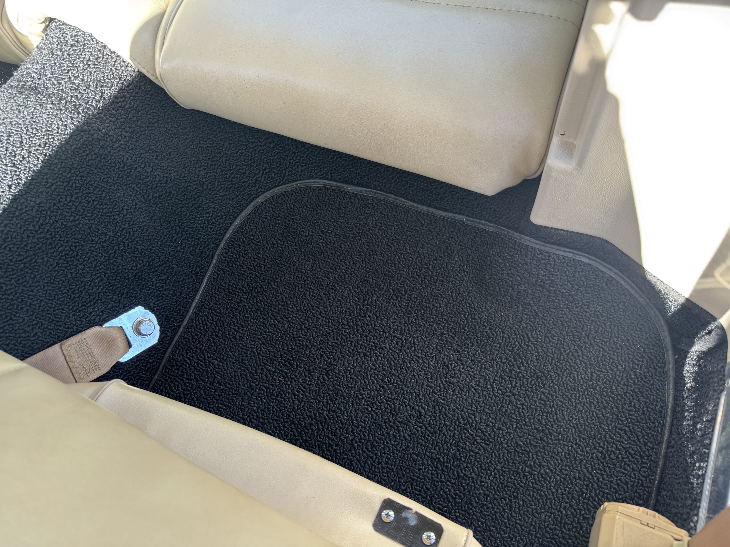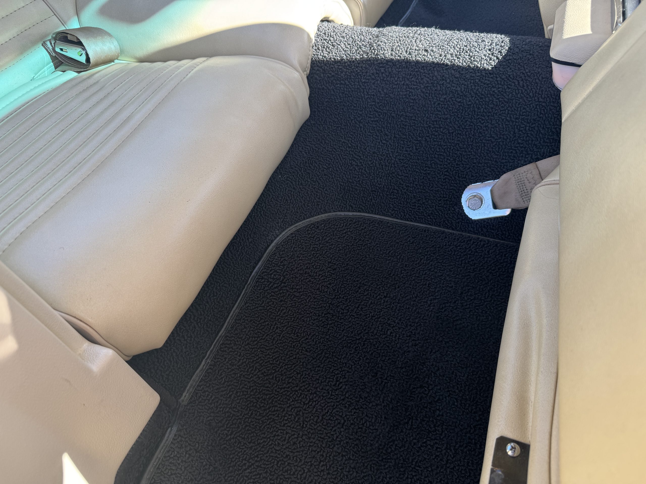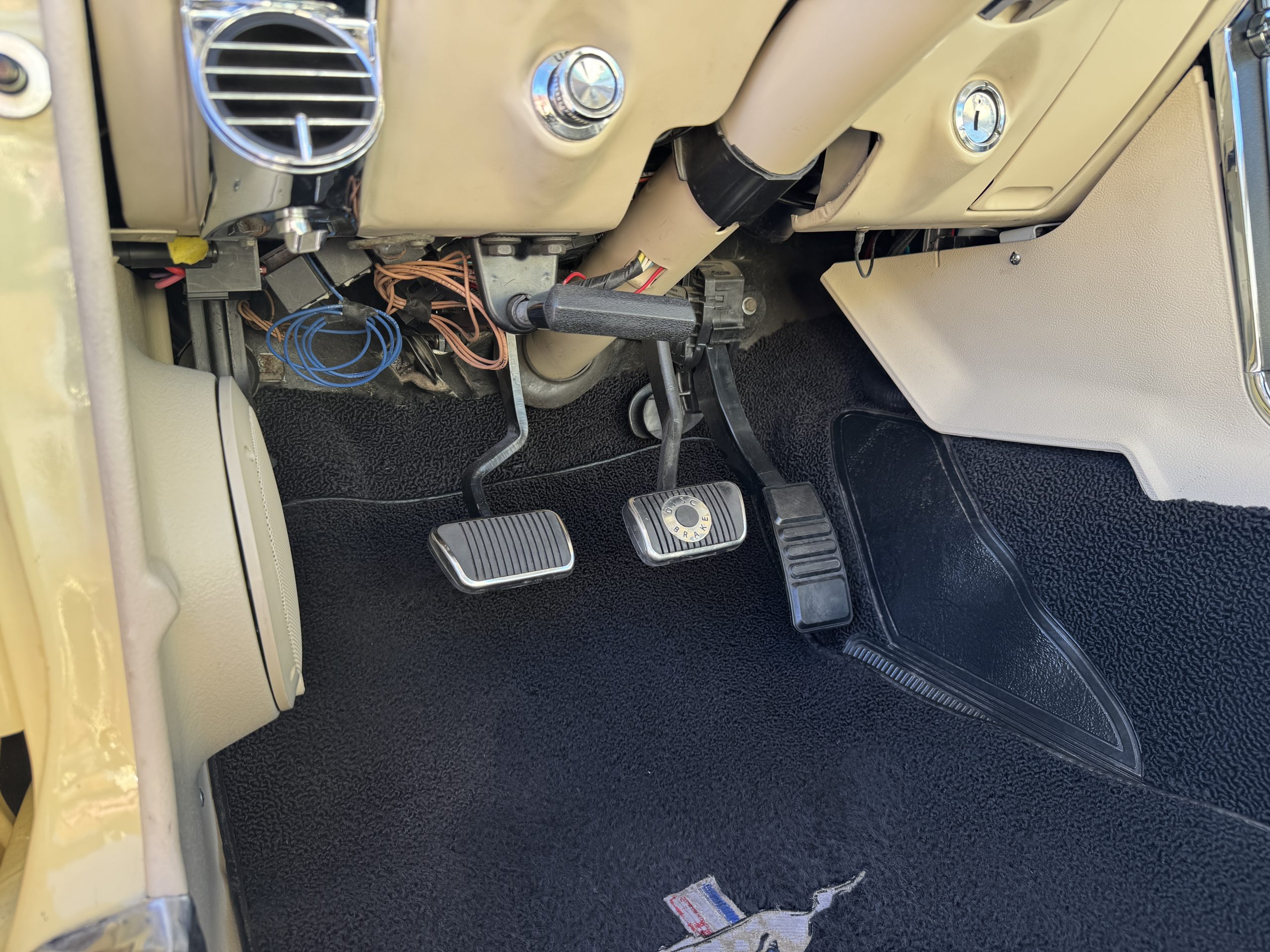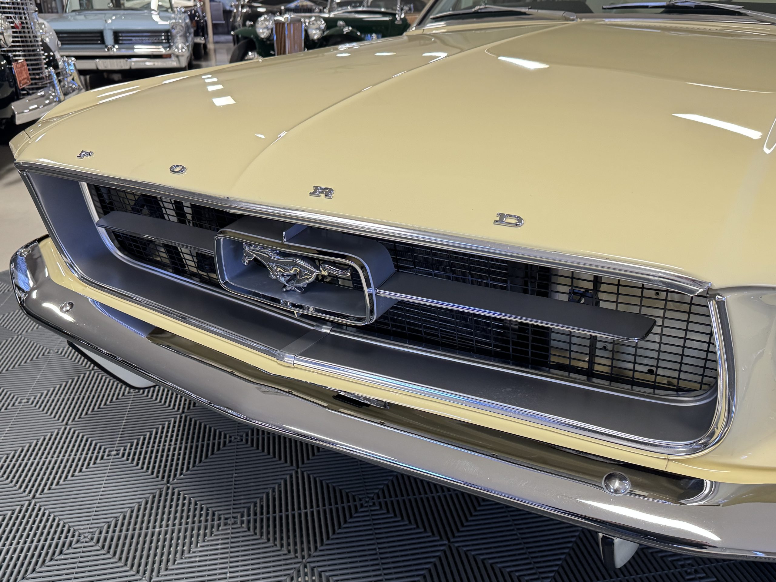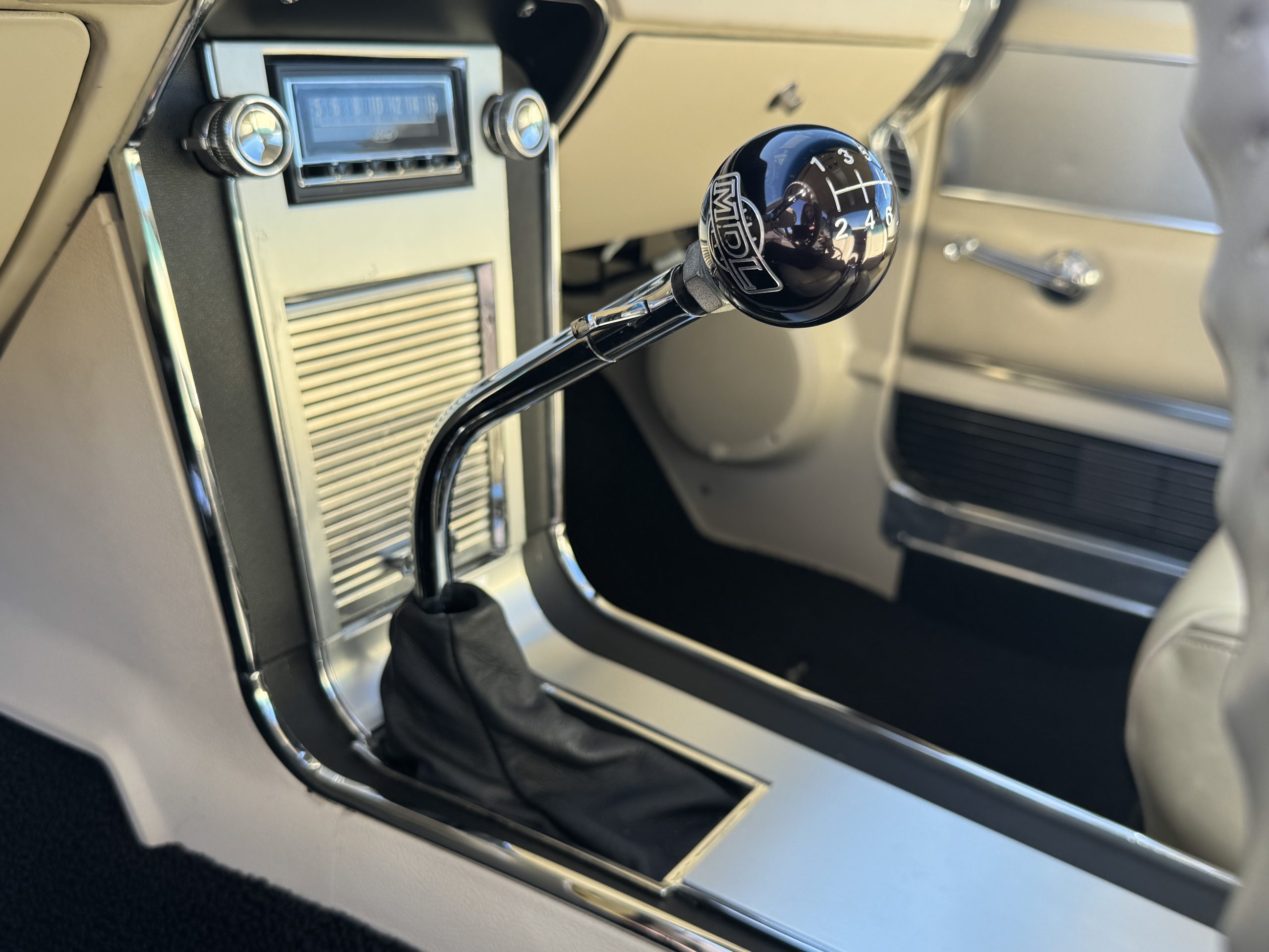 Inside, the Mustang features a Palomino vinyl interior with front bucket seats and a folding Sport Deck rear seat, with deluxe seatbelts, all in very good condition and consistent with the Mustang’s period-correct presentation. Black carpeting with Mustang floor mats remains clean and serviceable, while the 1967-year-only padded horn pad on the wrapped steering wheel shows light wear consistent with careful use. The brushed chrome gauge cluster houses fully functional original instrumentation, including a 140-mph speedometer with digital odometer, and the light gray polyurethane dash pad remains in very good condition. Factory-style amenities include power windows designed to resemble original roll-up glass, power steering, an AM radio plate over upgraded stereo, functional factory air conditioning, and fully operational interior lighting.