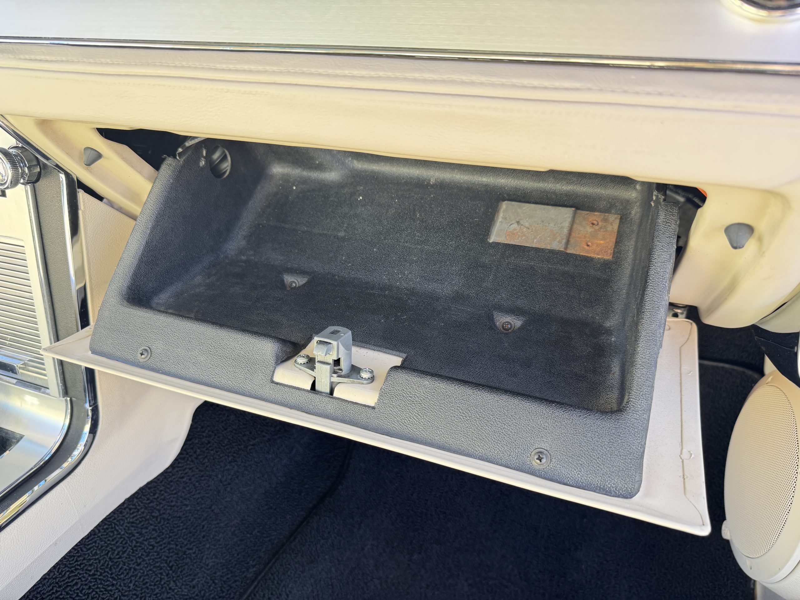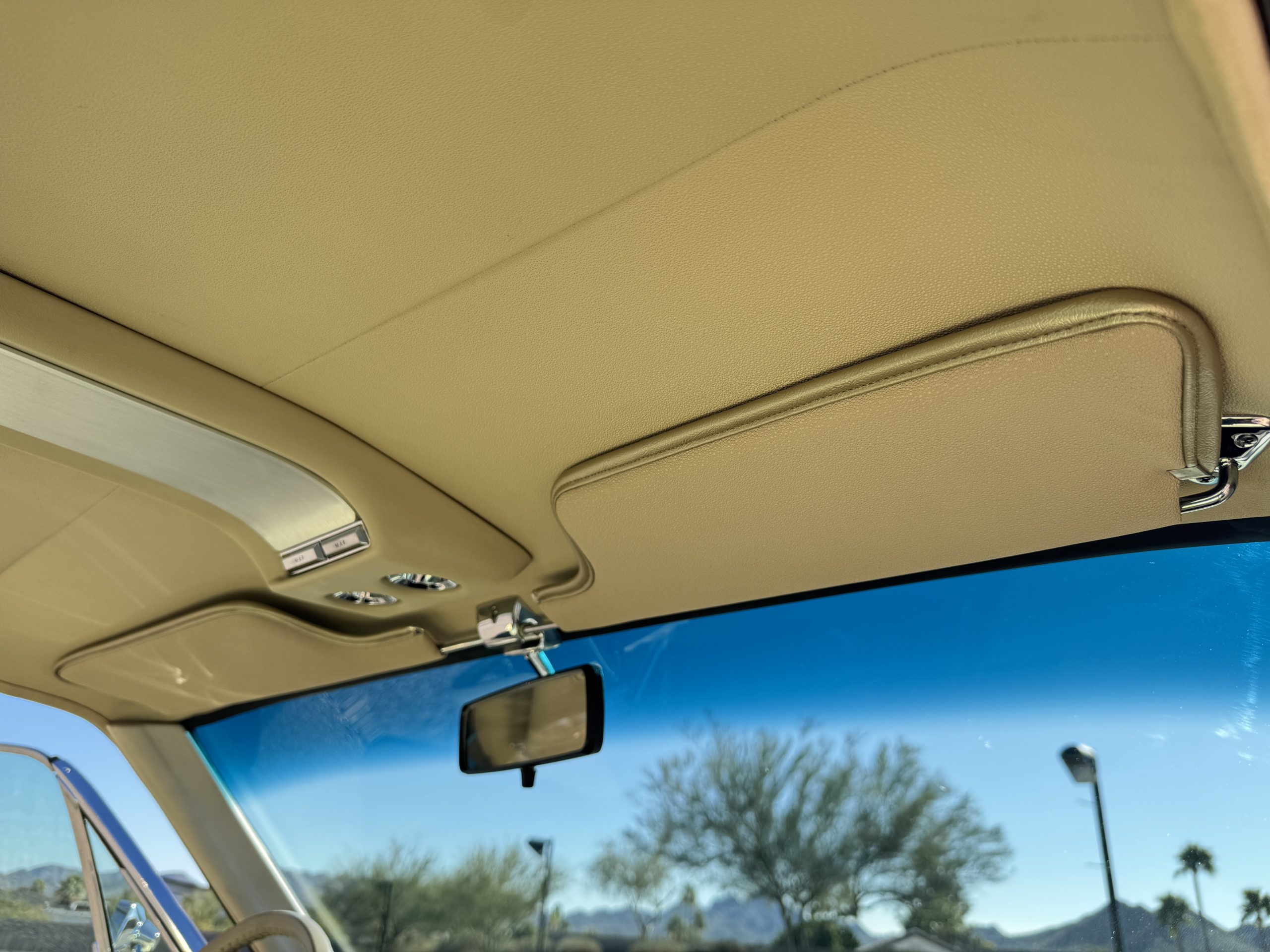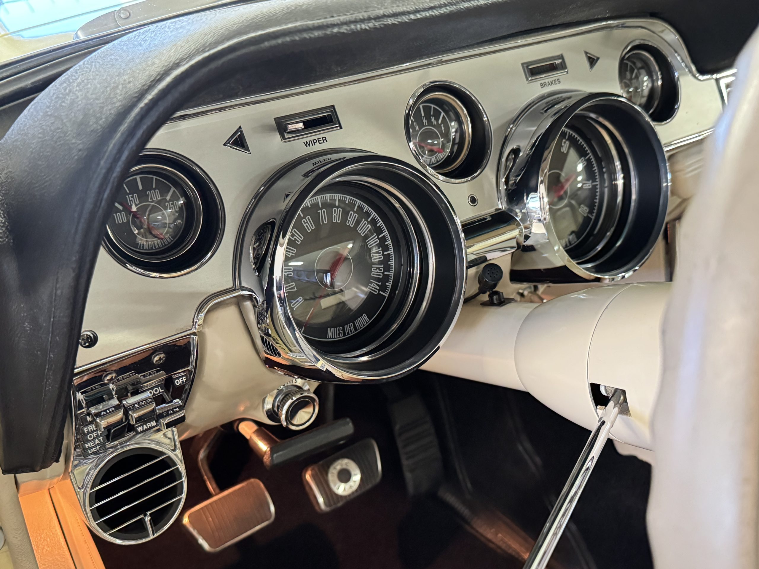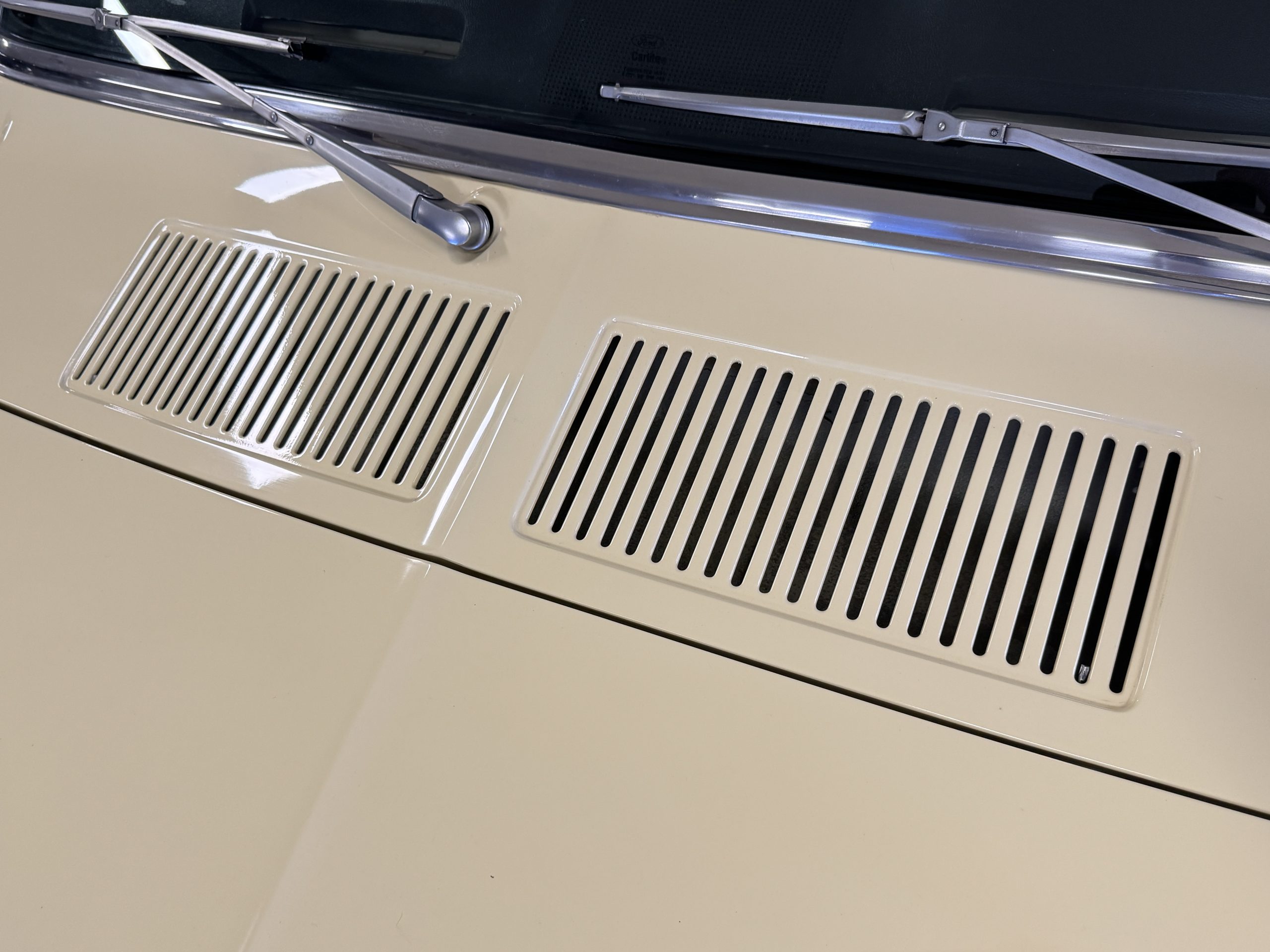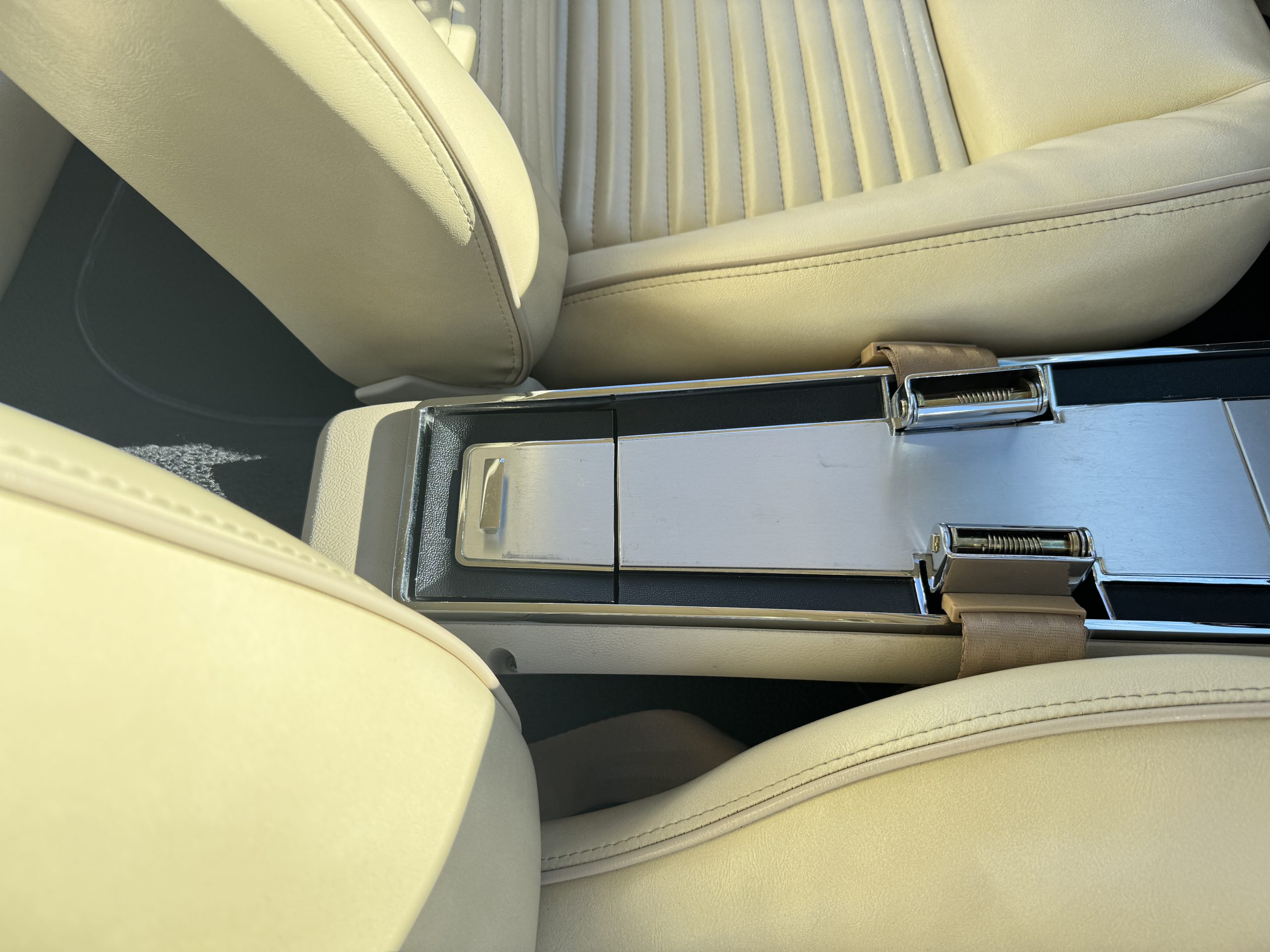 Inside, the Mustang features a Palomino vinyl interior with front bucket seats and a folding Sport Deck rear seat, with deluxe seatbelts, all in very good condition and consistent with the Mustang’s period-correct presentation. Black carpeting with Mustang floor mats remains clean and serviceable, while the 1967-year-only padded horn pad on the wrapped steering wheel shows light wear consistent with careful use. The brushed chrome gauge cluster houses fully functional original instrumentation, including a 140-mph speedometer with digital odometer, and the light gray polyurethane dash pad remains in very good condition. Factory-style amenities include power windows designed to resemble original roll-up glass, power steering, an AM radio plate over upgraded stereo, functional factory air conditioning, and fully operational interior lighting.