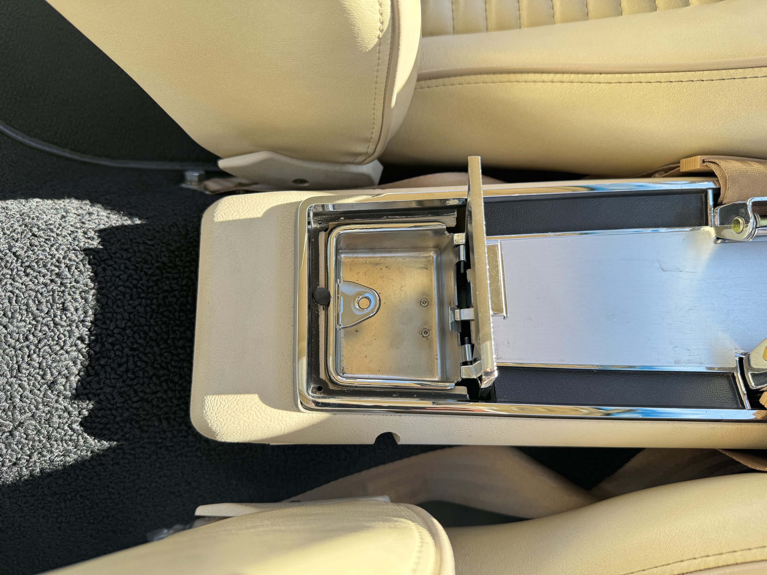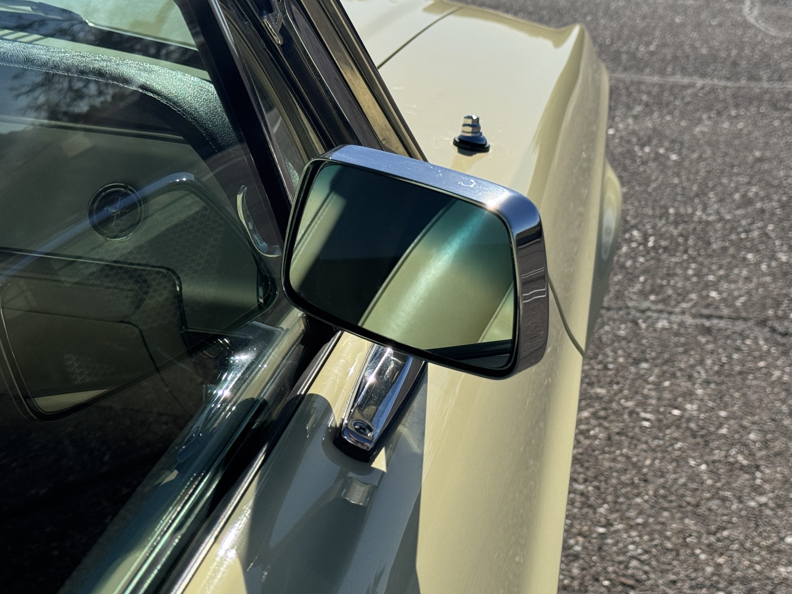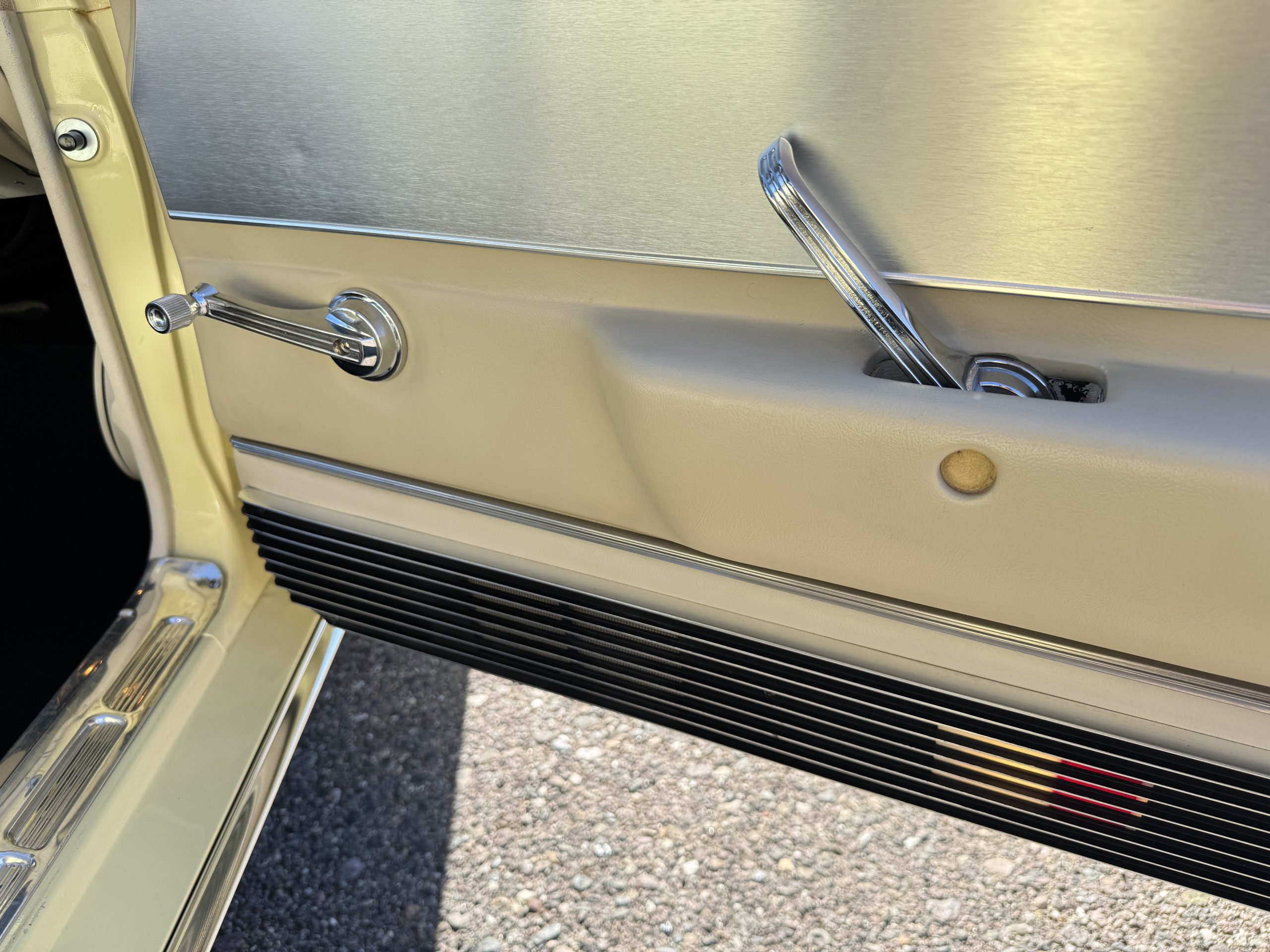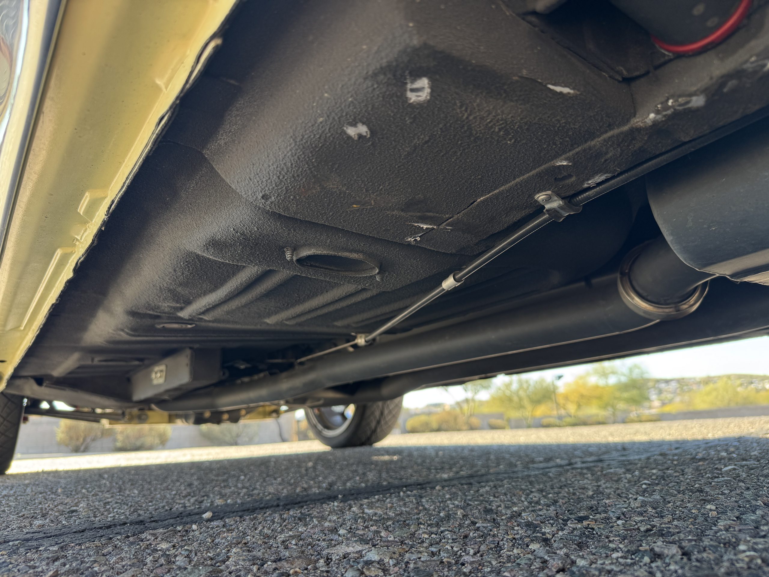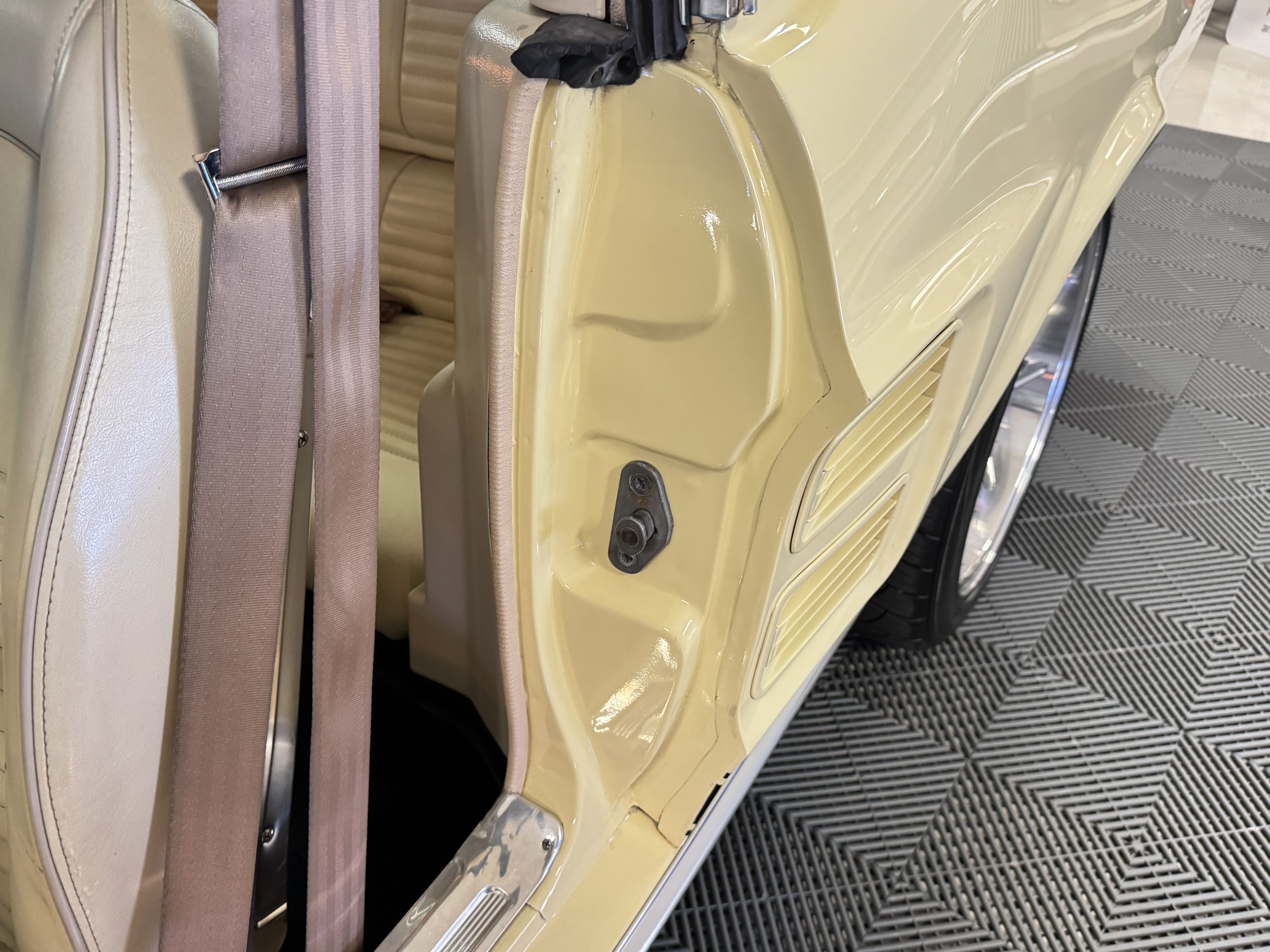 Inside, the Mustang features a Palomino vinyl interior with front bucket seats and a folding Sport Deck rear seat, with deluxe seatbelts, all in very good condition and consistent with the Mustang’s period-correct presentation. Black carpeting with Mustang floor mats remains clean and serviceable, while the 1967-year-only padded horn pad on the wrapped steering wheel shows light wear consistent with careful use. The brushed chrome gauge cluster houses fully functional original instrumentation, including a 140-mph speedometer with digital odometer, and the light gray polyurethane dash pad remains in very good condition. Factory-style amenities include power windows designed to resemble original roll-up glass, power steering, an AM radio plate over upgraded stereo, functional factory air conditioning, and fully operational interior lighting.