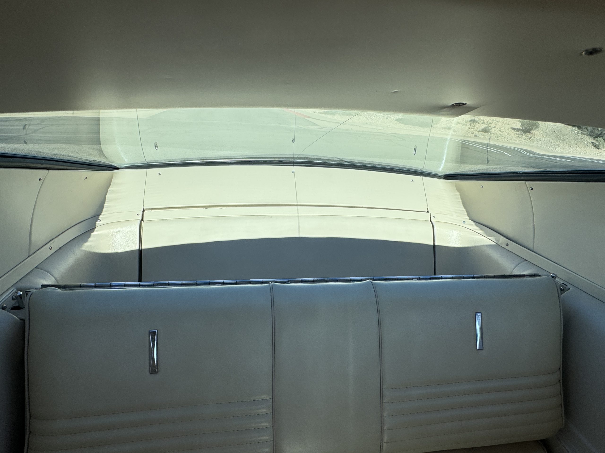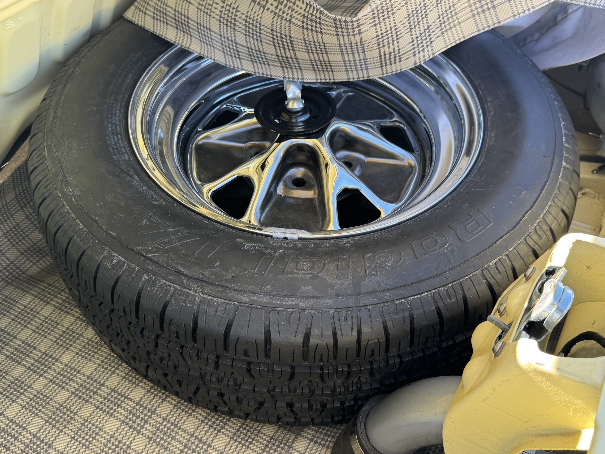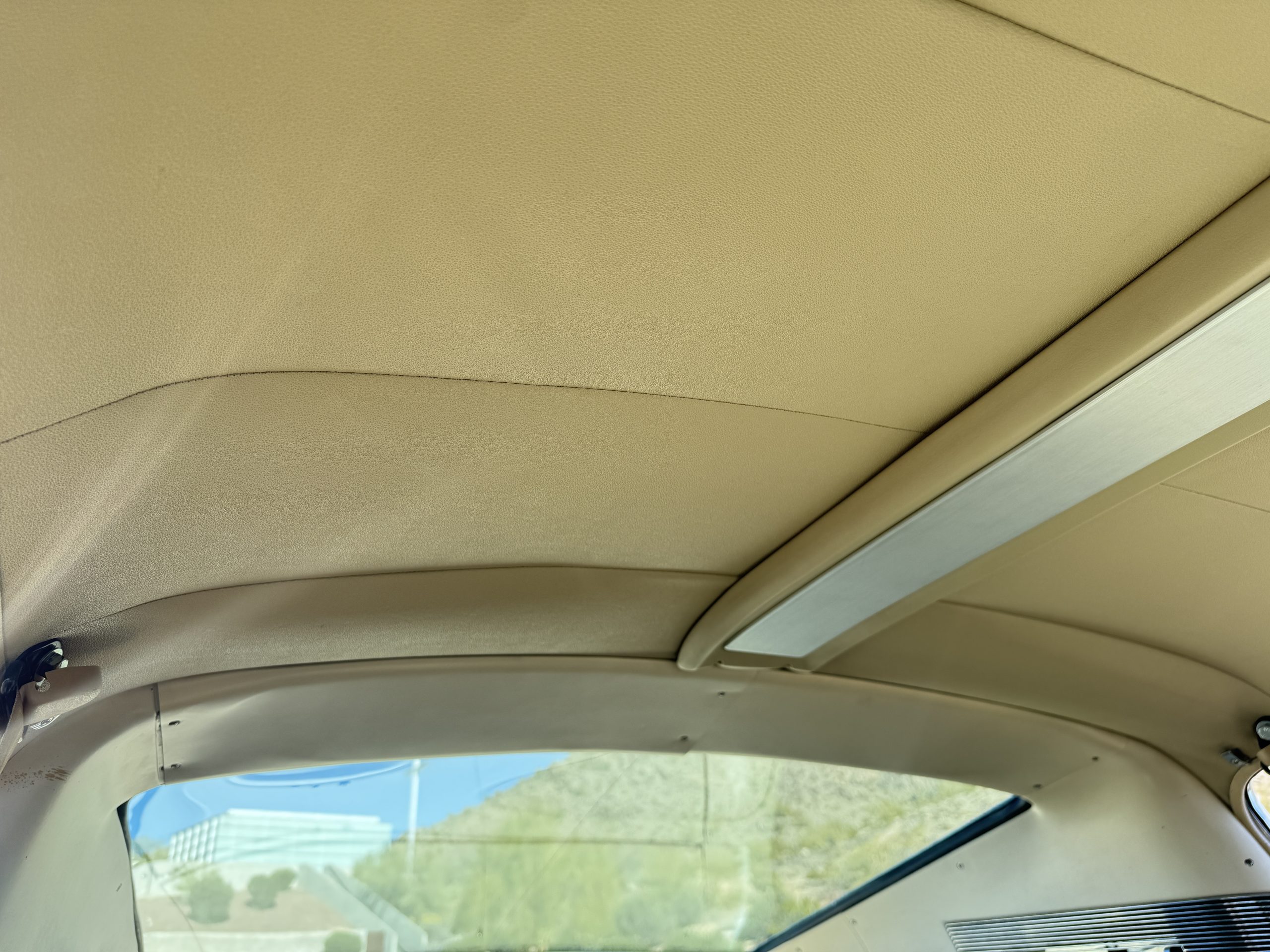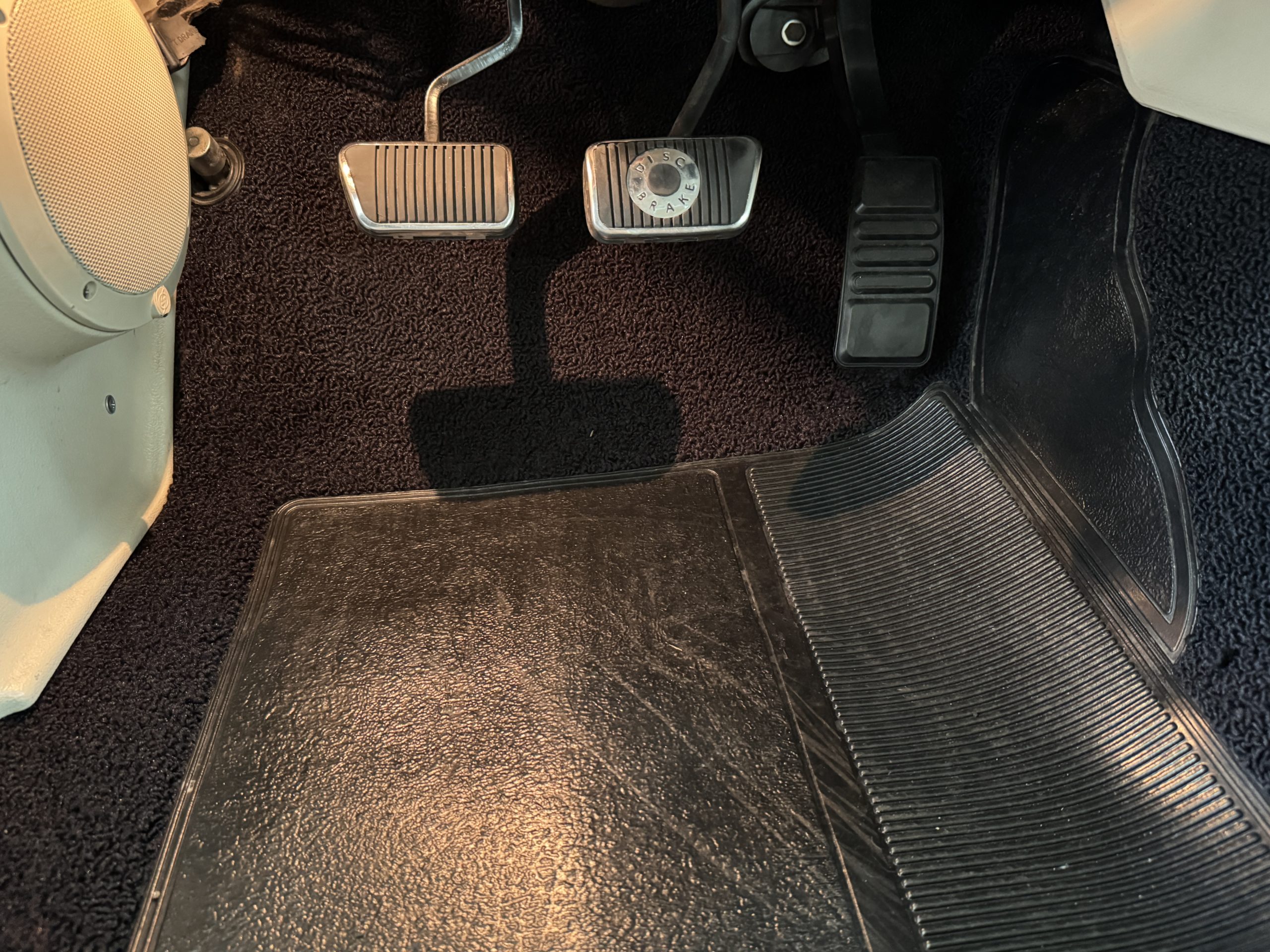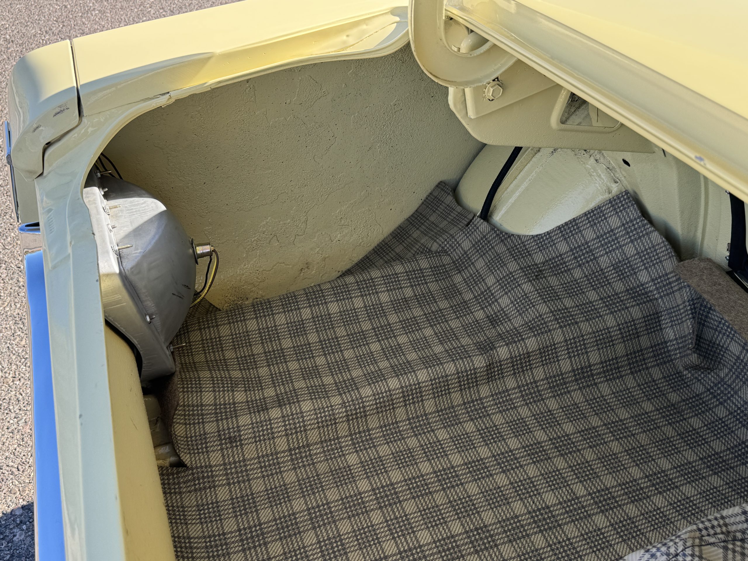 Inside, the Mustang features a Palomino vinyl interior with front bucket seats and a folding Sport Deck rear seat, with deluxe seatbelts, all in very good condition and consistent with the Mustang’s period-correct presentation. Black carpeting with Mustang floor mats remains clean and serviceable, while the 1967-year-only padded horn pad on the wrapped steering wheel shows light wear consistent with careful use. The brushed chrome gauge cluster houses fully functional original instrumentation, including a 140-mph speedometer with digital odometer, and the light gray polyurethane dash pad remains in very good condition. Factory-style amenities include power windows designed to resemble original roll-up glass, power steering, an AM radio plate over upgraded stereo, functional factory air conditioning, and fully operational interior lighting.
