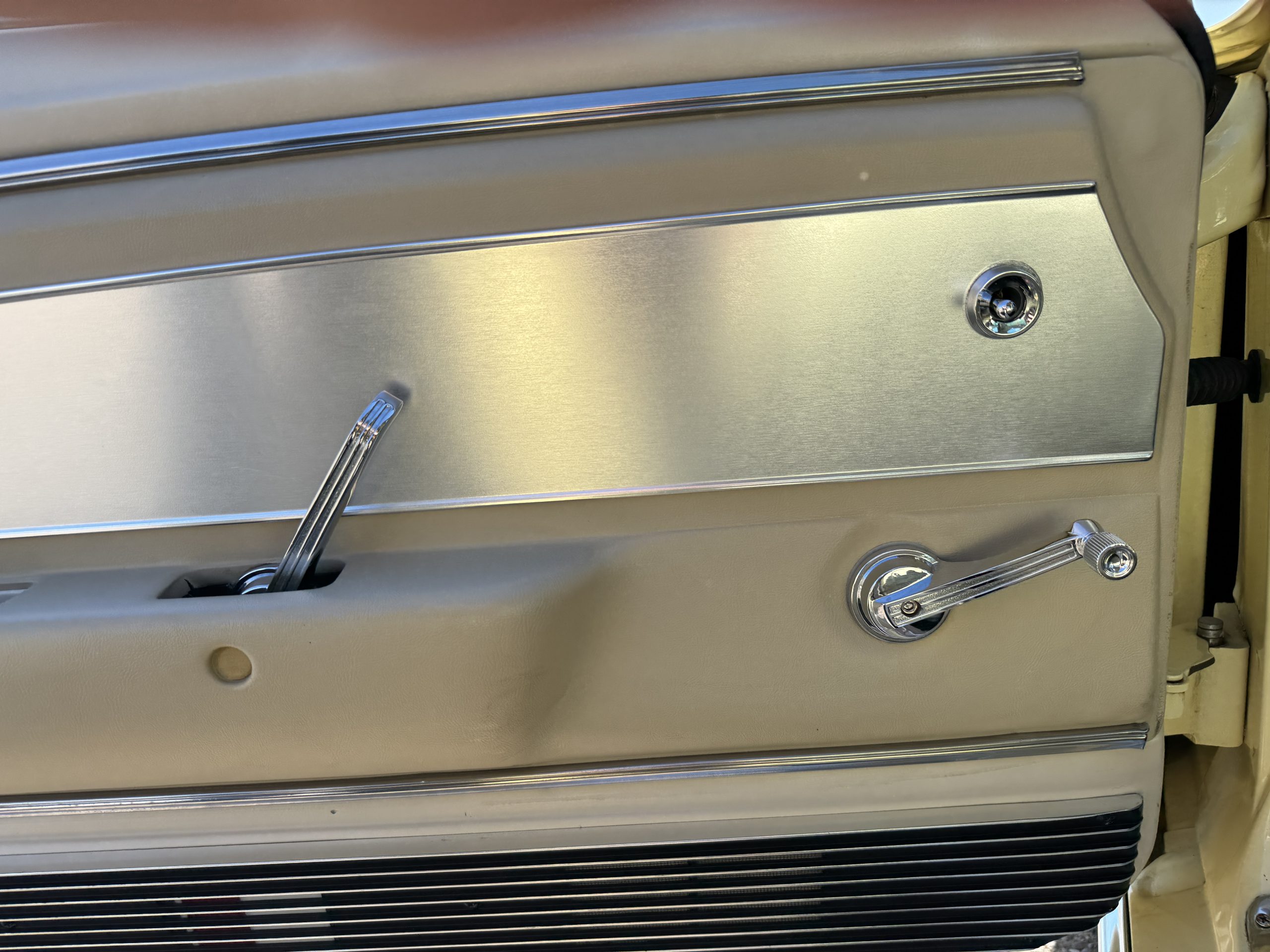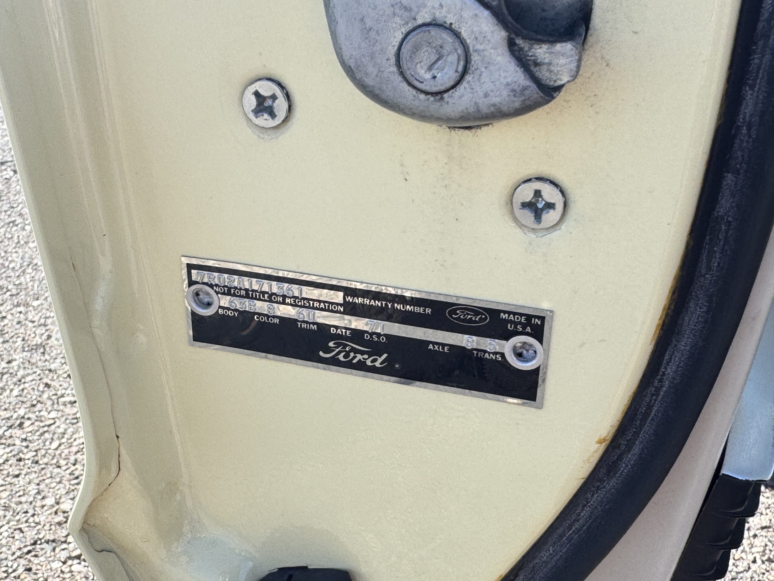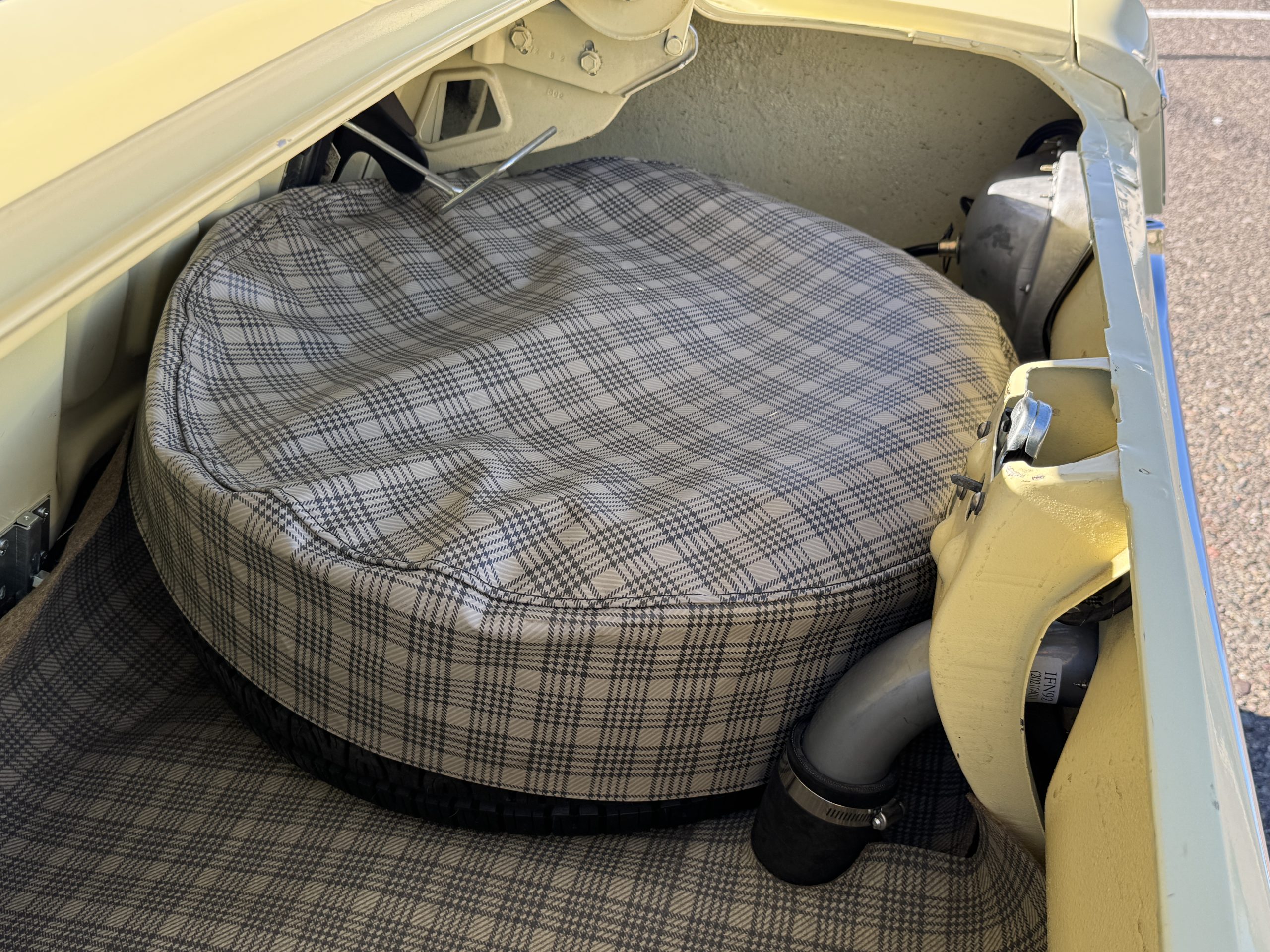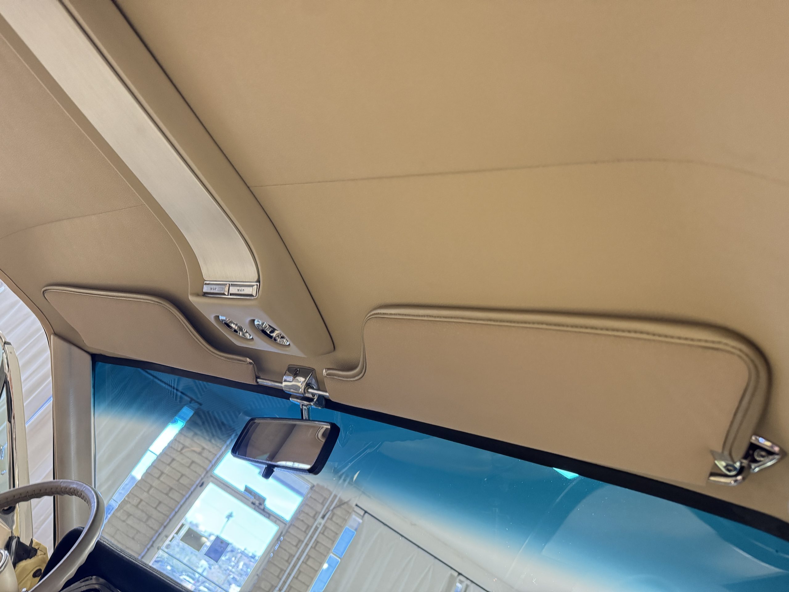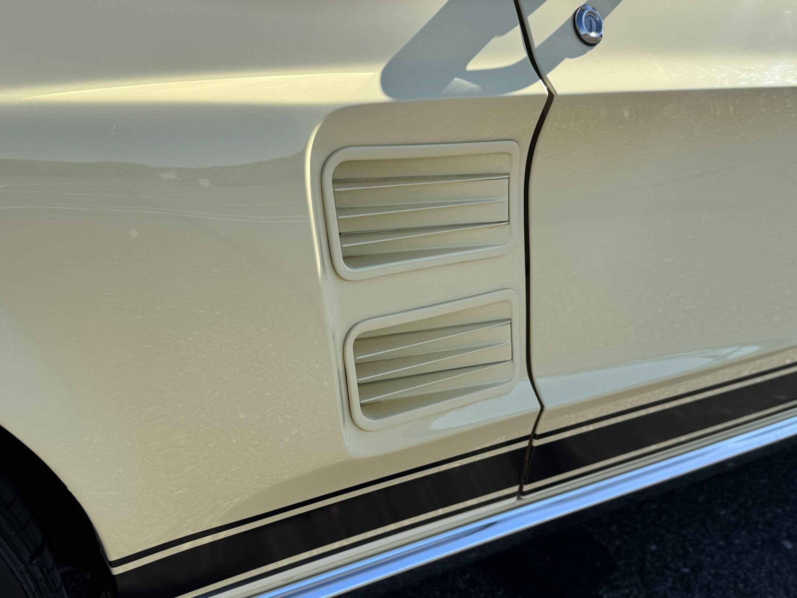 Inside, the Mustang features a Palomino vinyl interior with front bucket seats and a folding Sport Deck rear seat, with deluxe seatbelts, all in very good condition and consistent with the Mustang’s period-correct presentation. Black carpeting with Mustang floor mats remains clean and serviceable, while the 1967-year-only padded horn pad on the wrapped steering wheel shows light wear consistent with careful use. The brushed chrome gauge cluster houses fully functional original instrumentation, including a 140-mph speedometer with digital odometer, and the light gray polyurethane dash pad remains in very good condition. Factory-style amenities include power windows designed to resemble original roll-up glass, power steering, an AM radio plate over upgraded stereo, functional factory air conditioning, and fully operational interior lighting.
