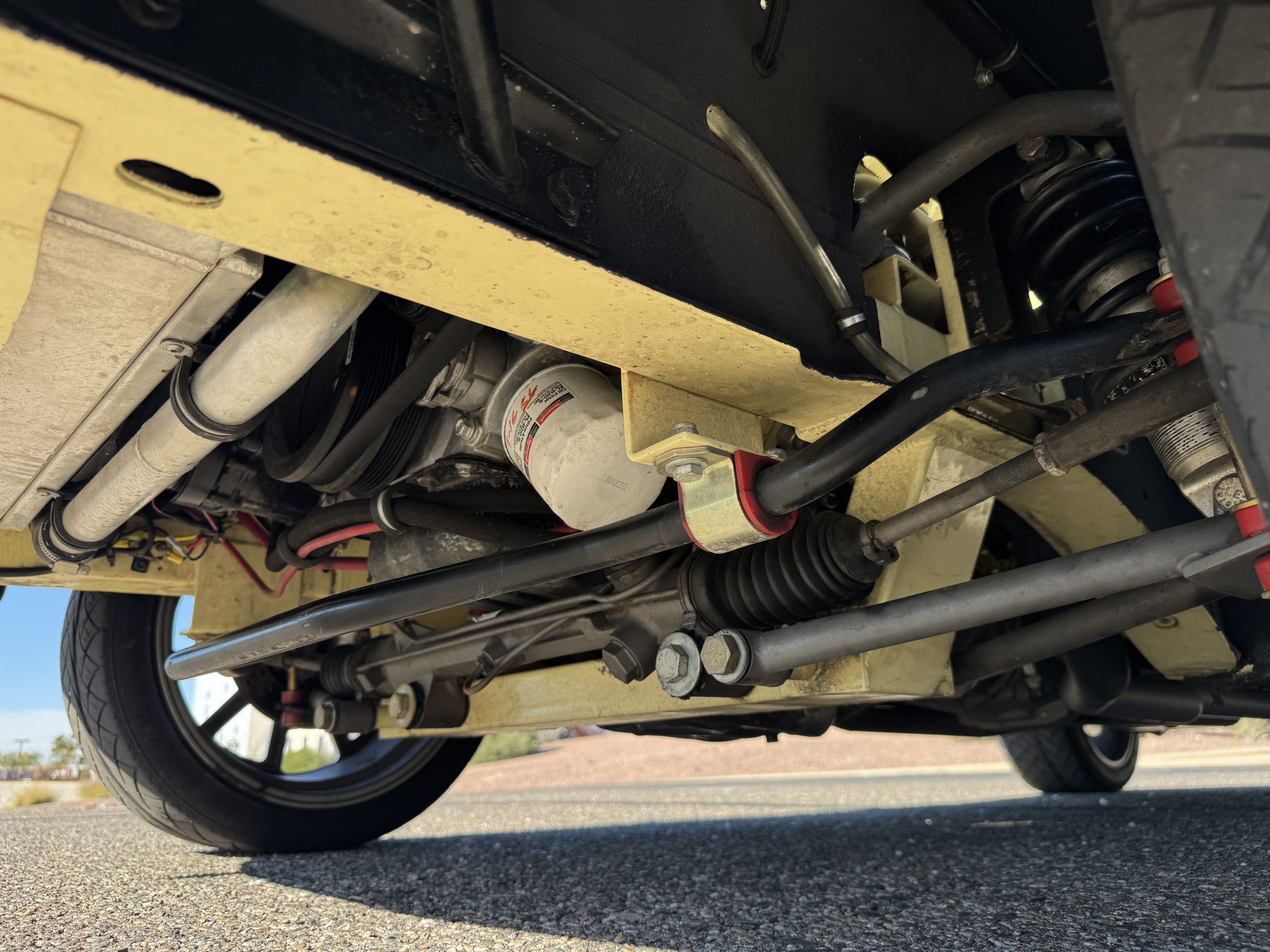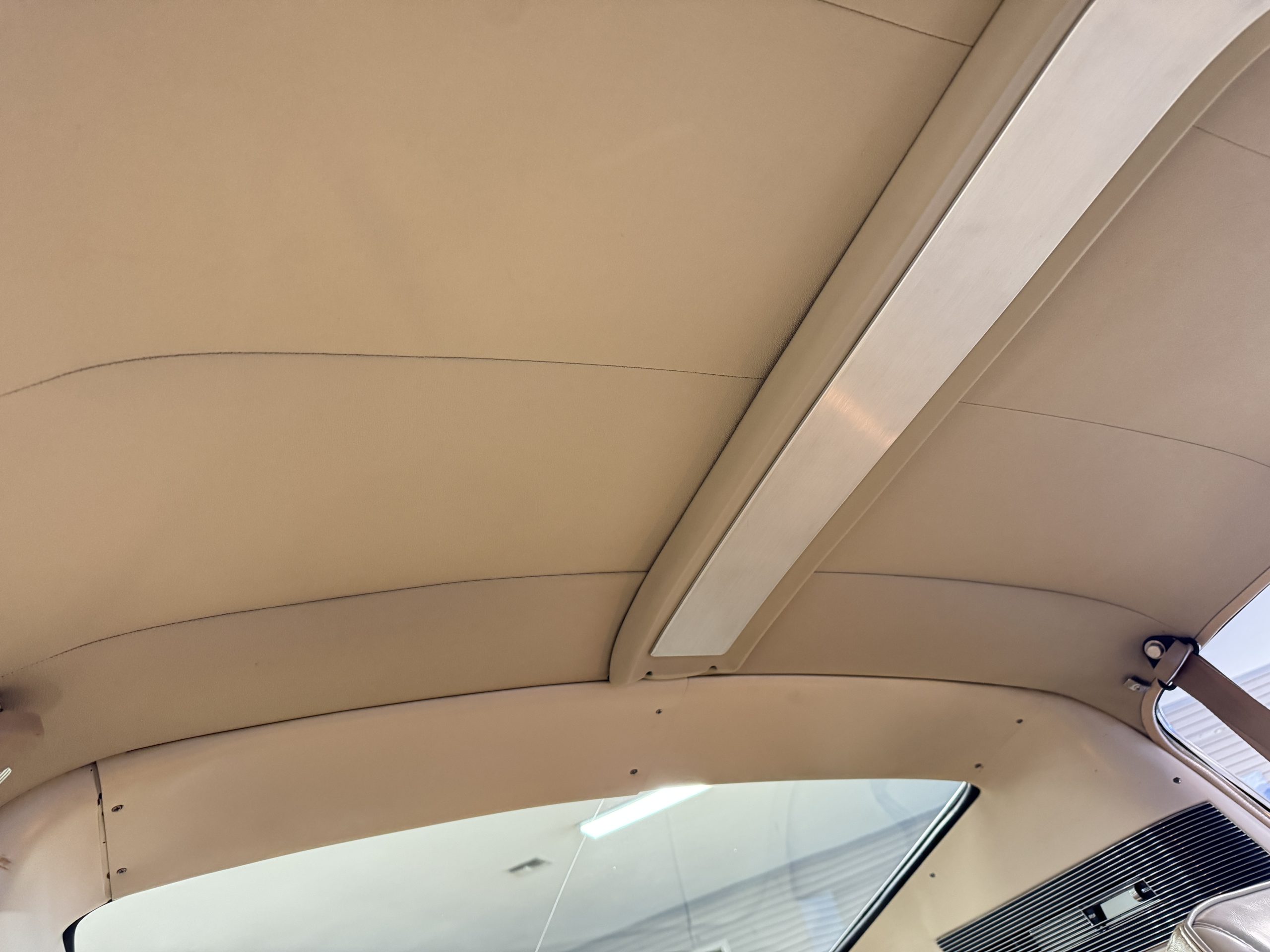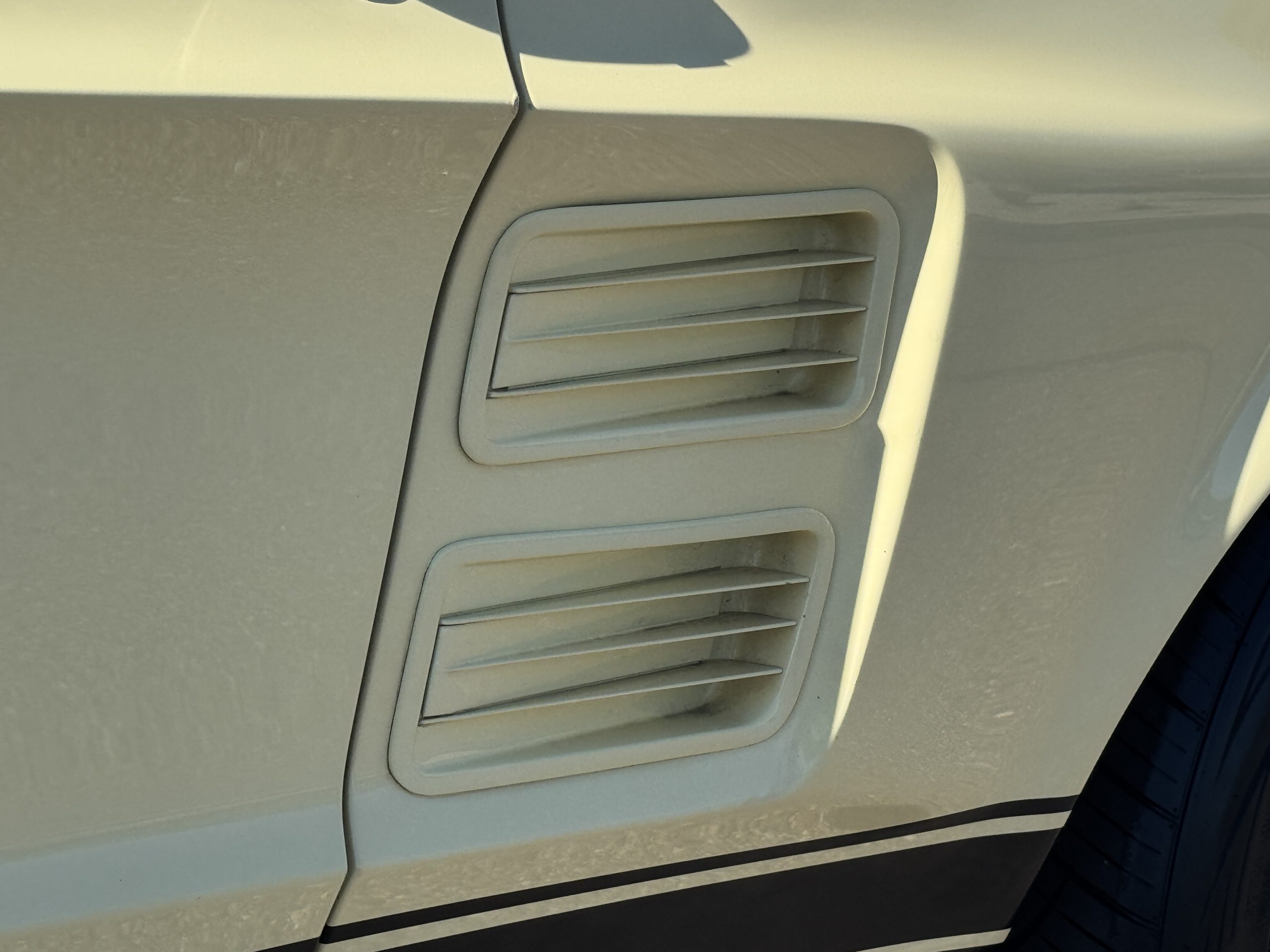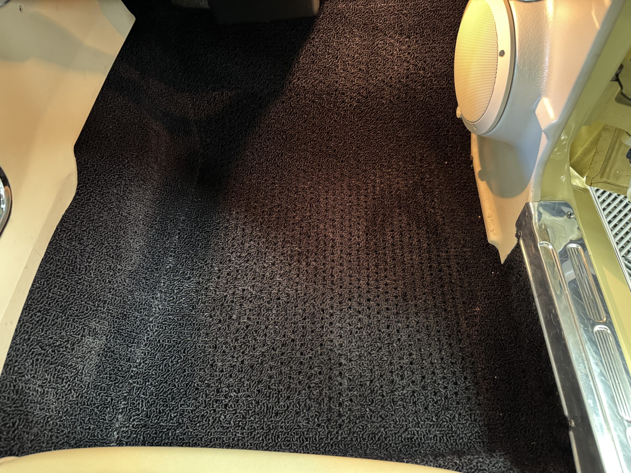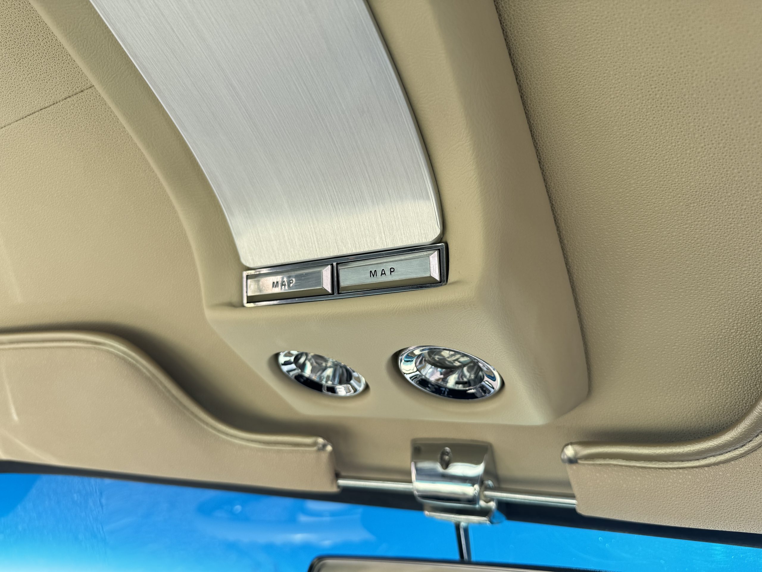 Inside, the Mustang features a Palomino vinyl interior with front bucket seats and a folding Sport Deck rear seat, with deluxe seatbelts, all in very good condition and consistent with the Mustang’s period-correct presentation. Black carpeting with Mustang floor mats remains clean and serviceable, while the 1967-year-only padded horn pad on the wrapped steering wheel shows light wear consistent with careful use. The brushed chrome gauge cluster houses fully functional original instrumentation, including a 140-mph speedometer with digital odometer, and the light gray polyurethane dash pad remains in very good condition. Factory-style amenities include power windows designed to resemble original roll-up glass, power steering, an AM radio plate over upgraded stereo, functional factory air conditioning, and fully operational interior lighting.
