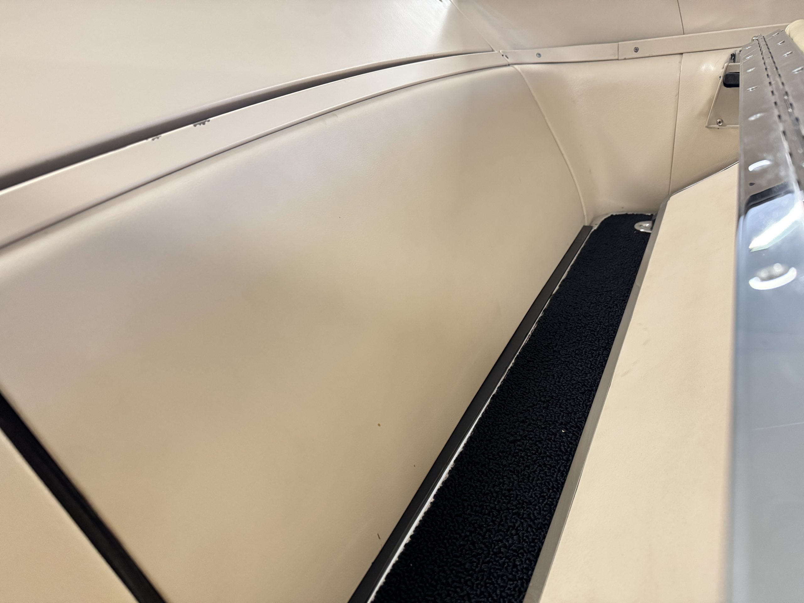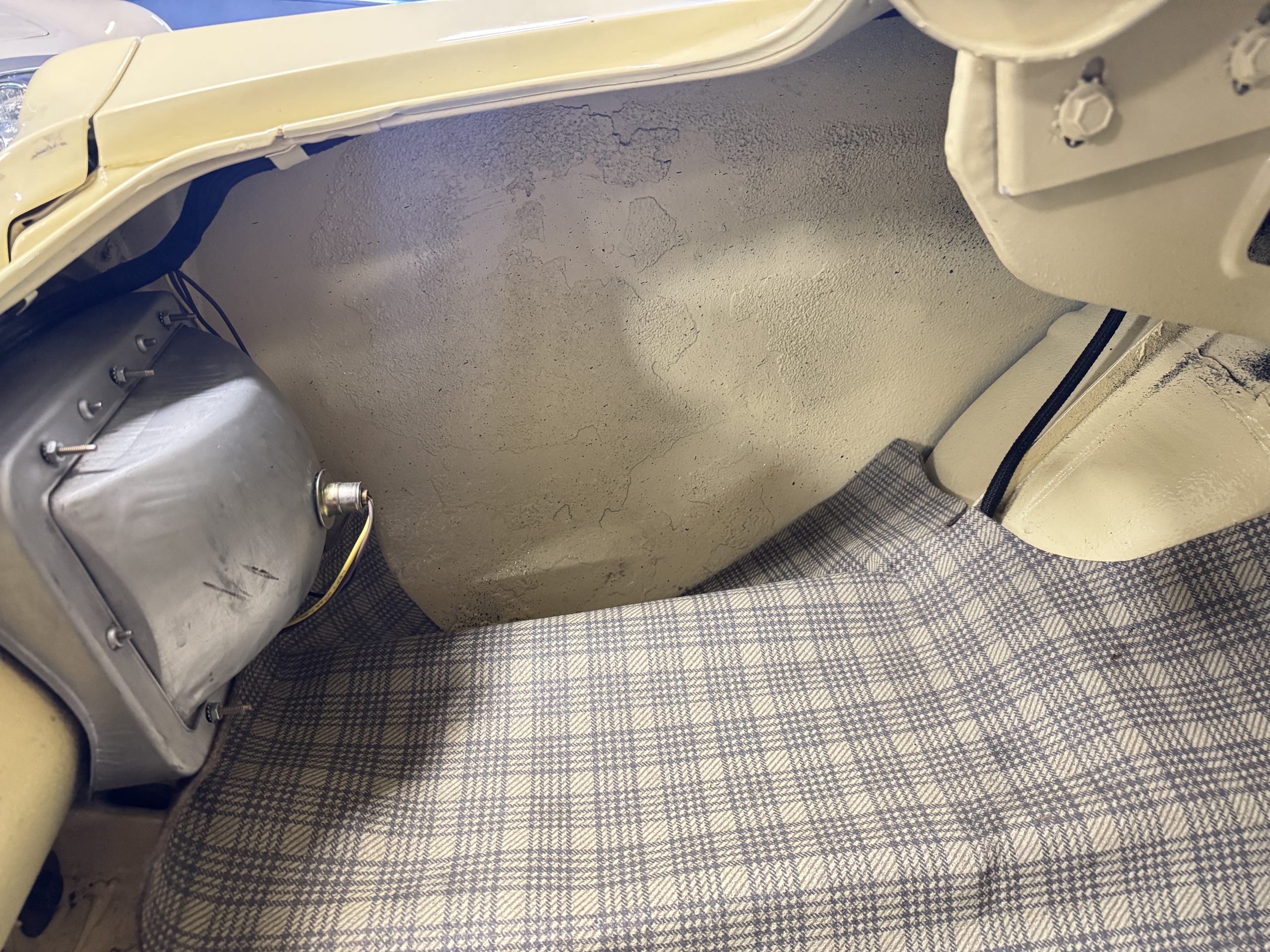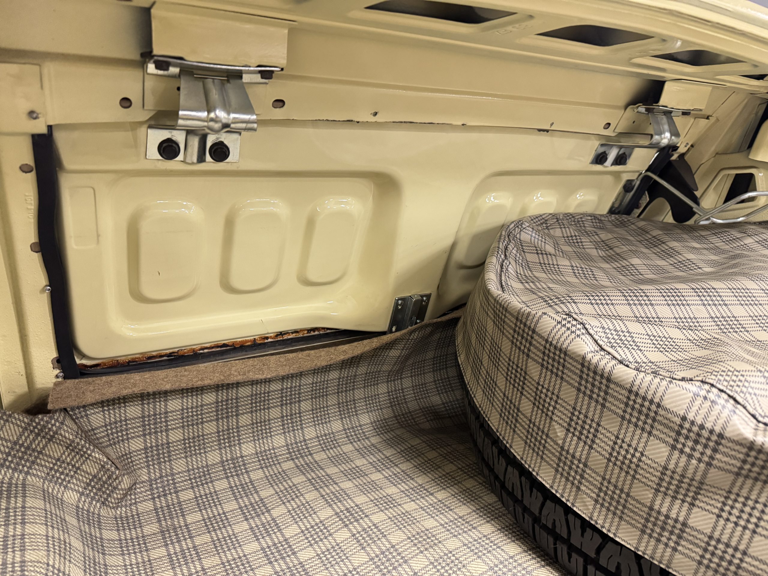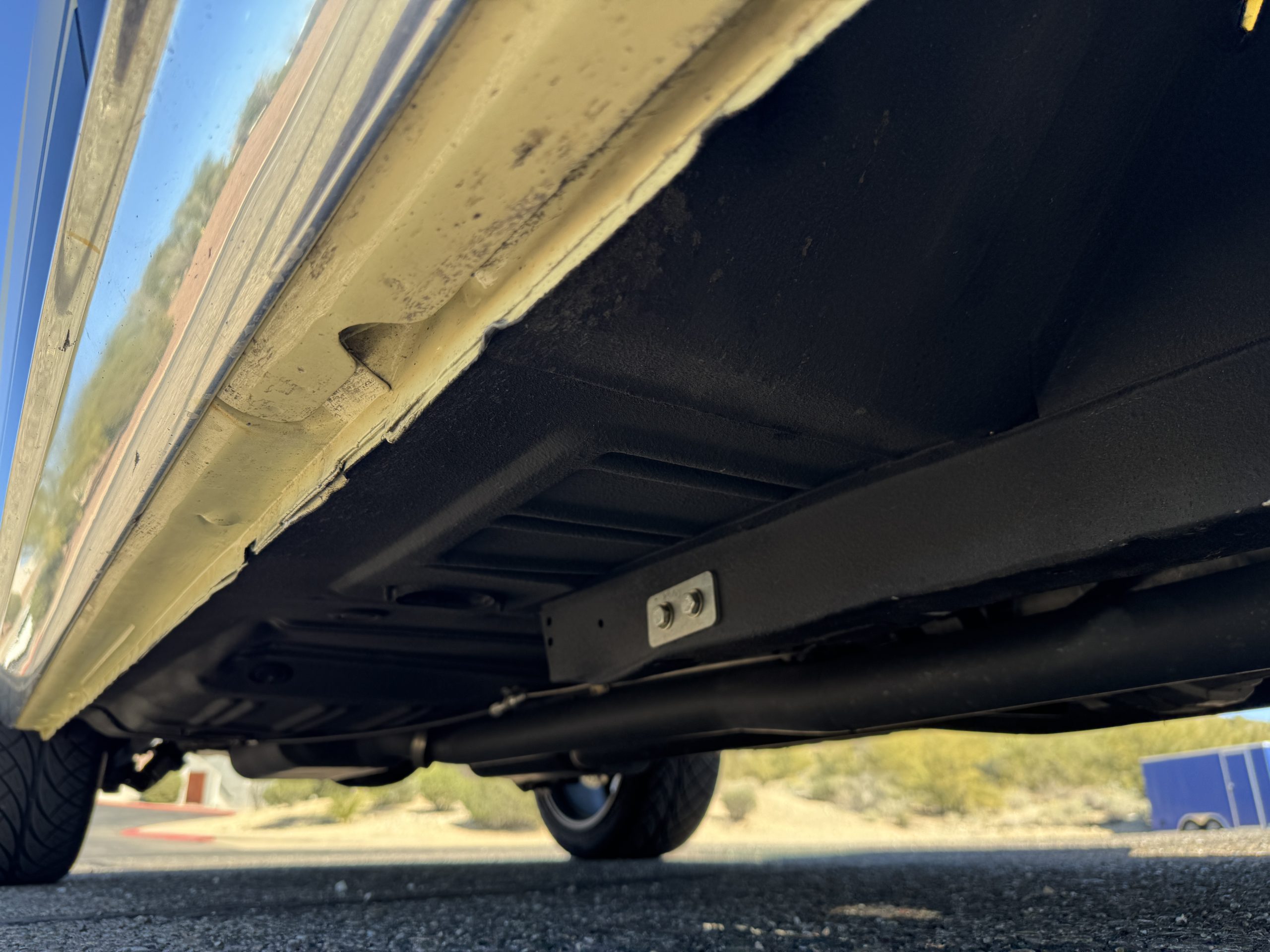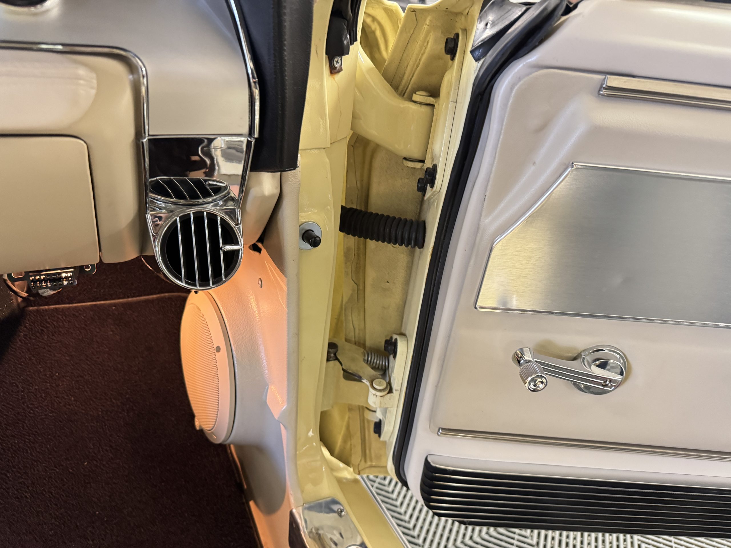 Inside, the Mustang features a Palomino vinyl interior with front bucket seats and a folding Sport Deck rear seat, with deluxe seatbelts, all in very good condition and consistent with the Mustang’s period-correct presentation. Black carpeting with Mustang floor mats remains clean and serviceable, while the 1967-year-only padded horn pad on the wrapped steering wheel shows light wear consistent with careful use. The brushed chrome gauge cluster houses fully functional original instrumentation, including a 140-mph speedometer with digital odometer, and the light gray polyurethane dash pad remains in very good condition. Factory-style amenities include power windows designed to resemble original roll-up glass, power steering, an AM radio plate over upgraded stereo, functional factory air conditioning, and fully operational interior lighting.