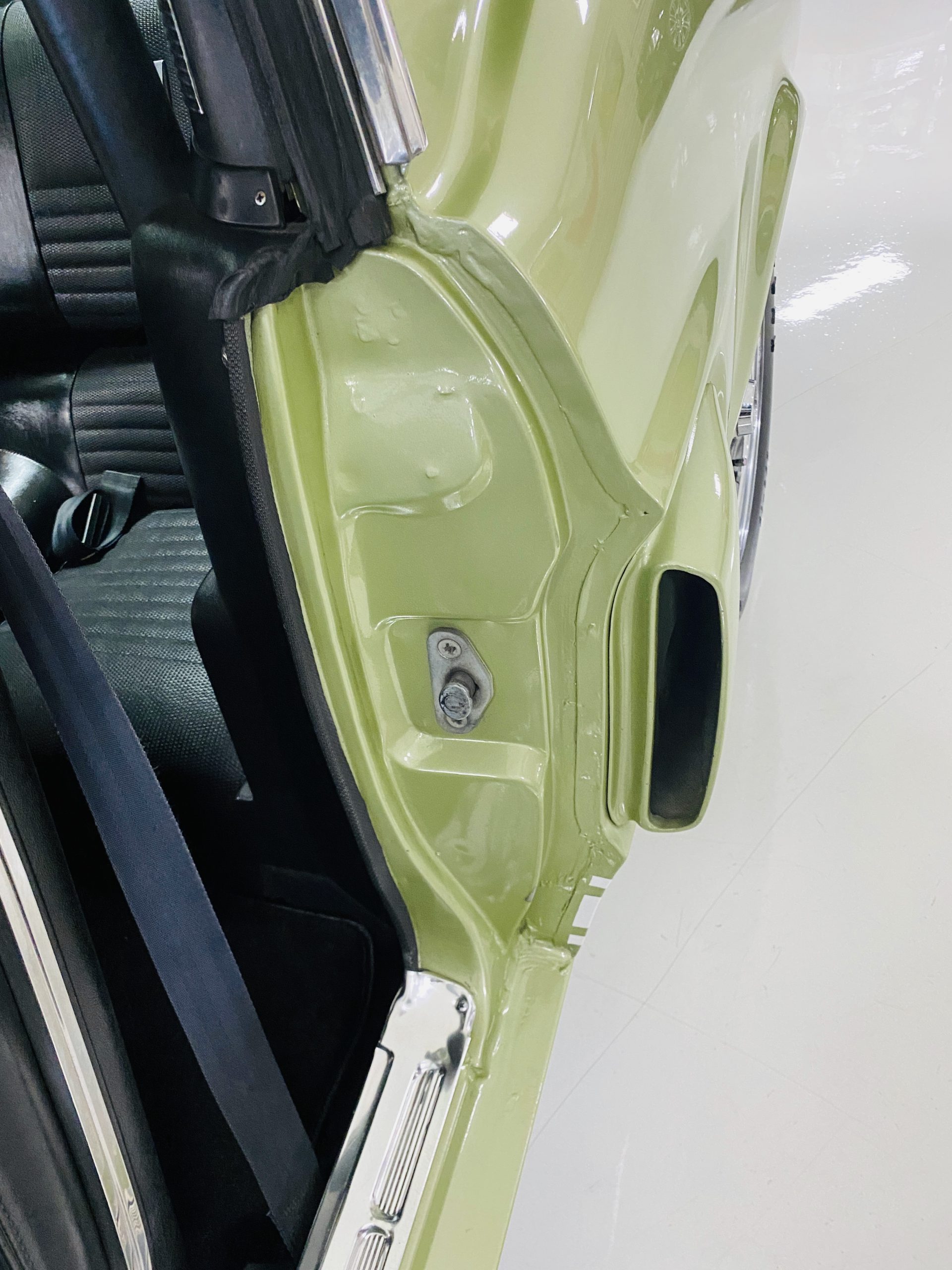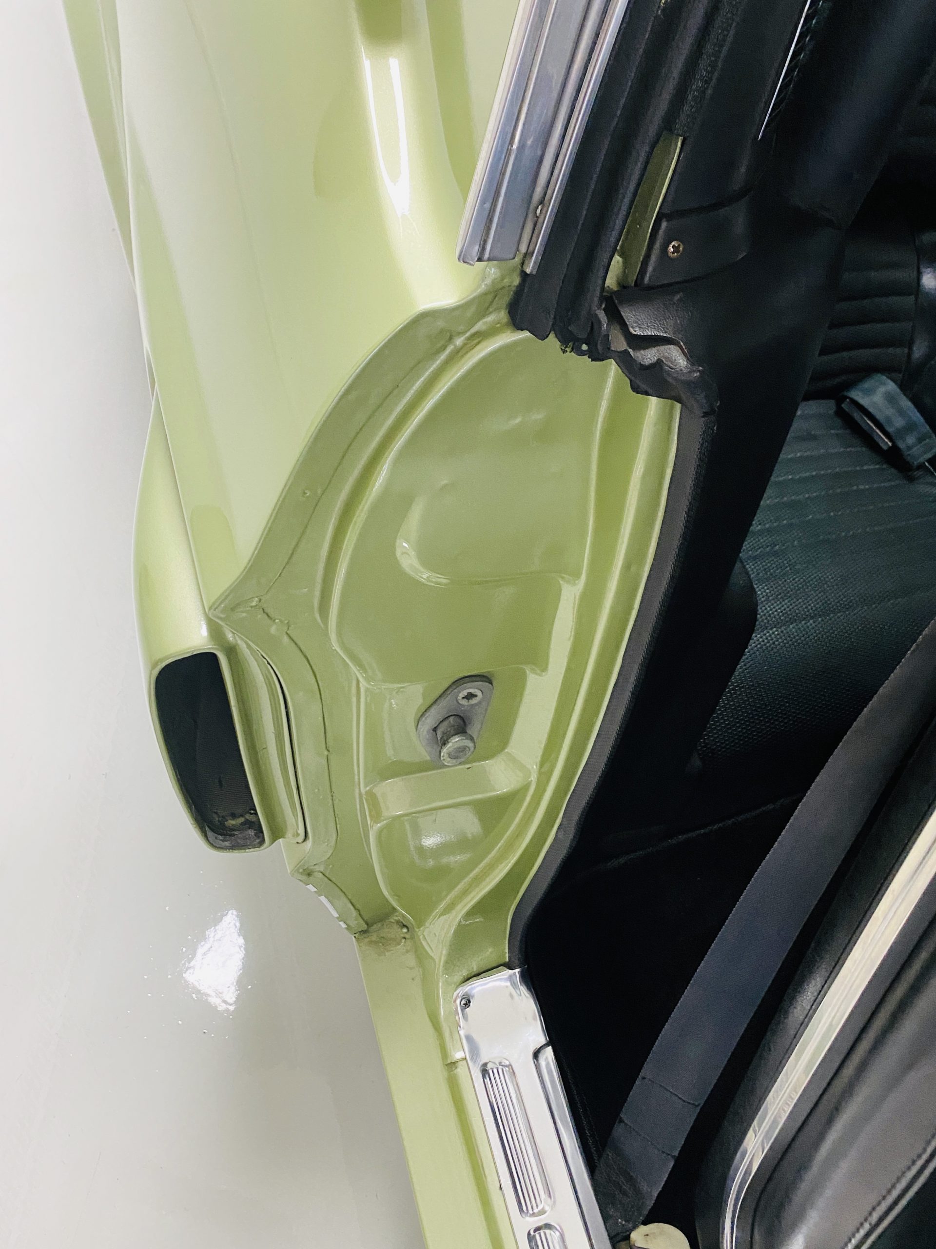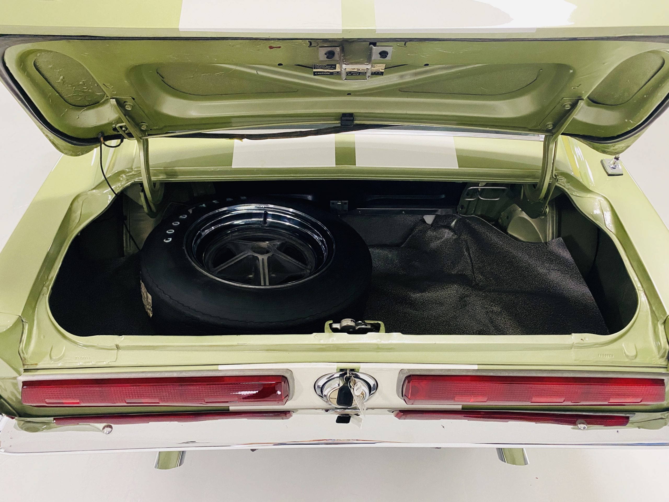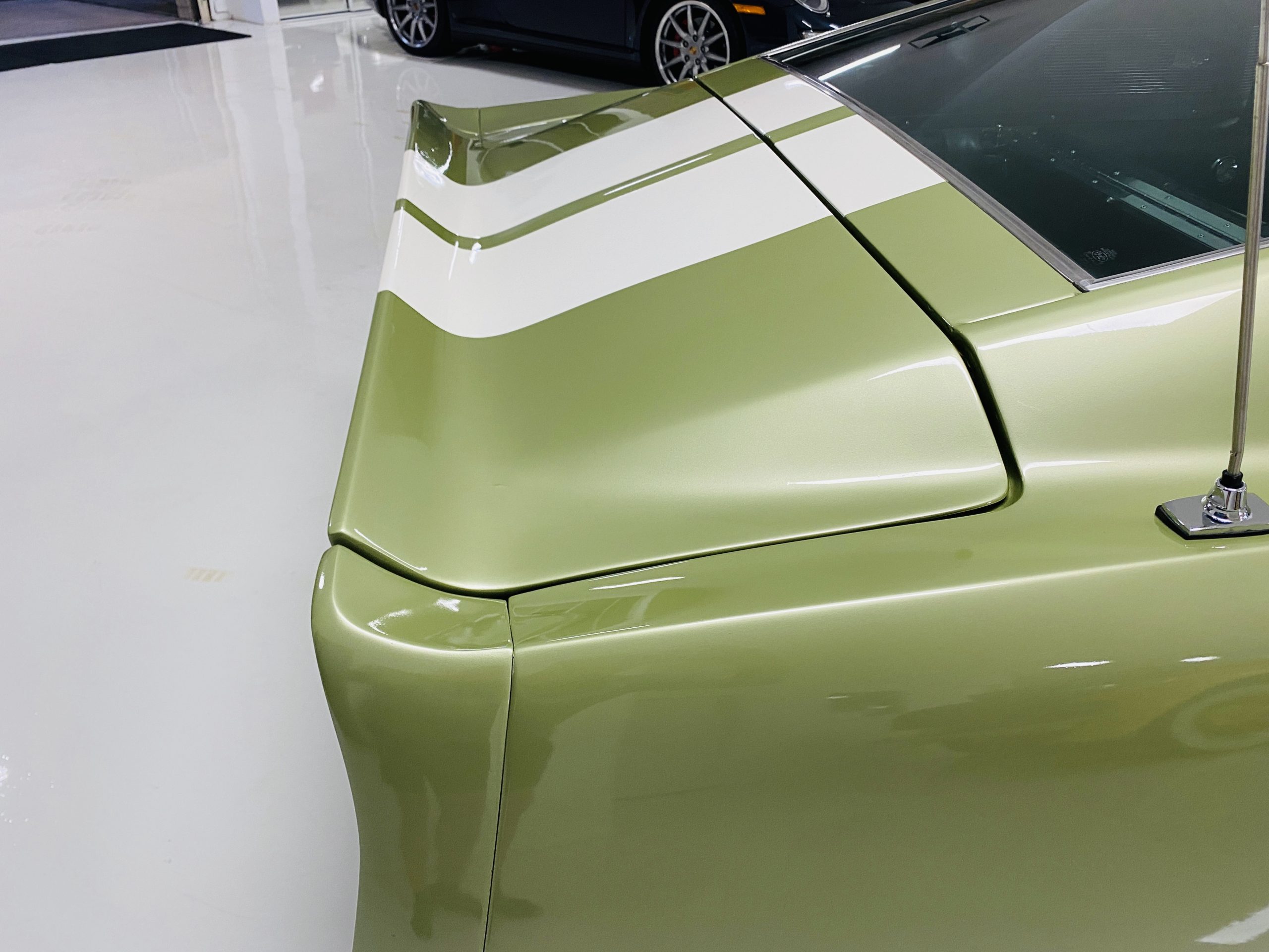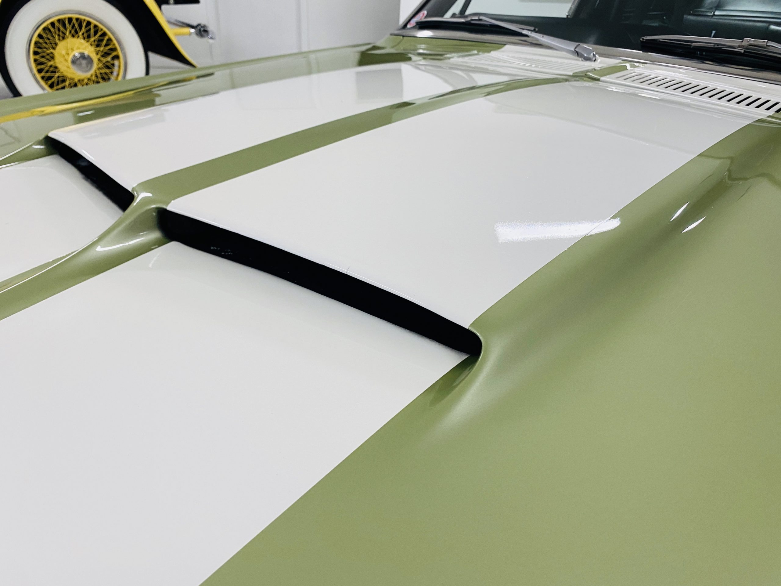 We love the Lime Green metallic paint with the white owner added Le Mans racing stripes.  The paint appears to have many sections of original paint with added clear coat.  Overall, the paint and chrome is good to very good.  There is orange peel evidenced in the paint and a smaller upward dent in the drivers side front fender.  The chrome overall is very original and nice with a few small areas of imperfections.  It has the one piece slanted front grill with the center extensions for the headlights.  It has the Kelsey-Hayes 15-inch Magstar wheels and the functional side brake scoops.