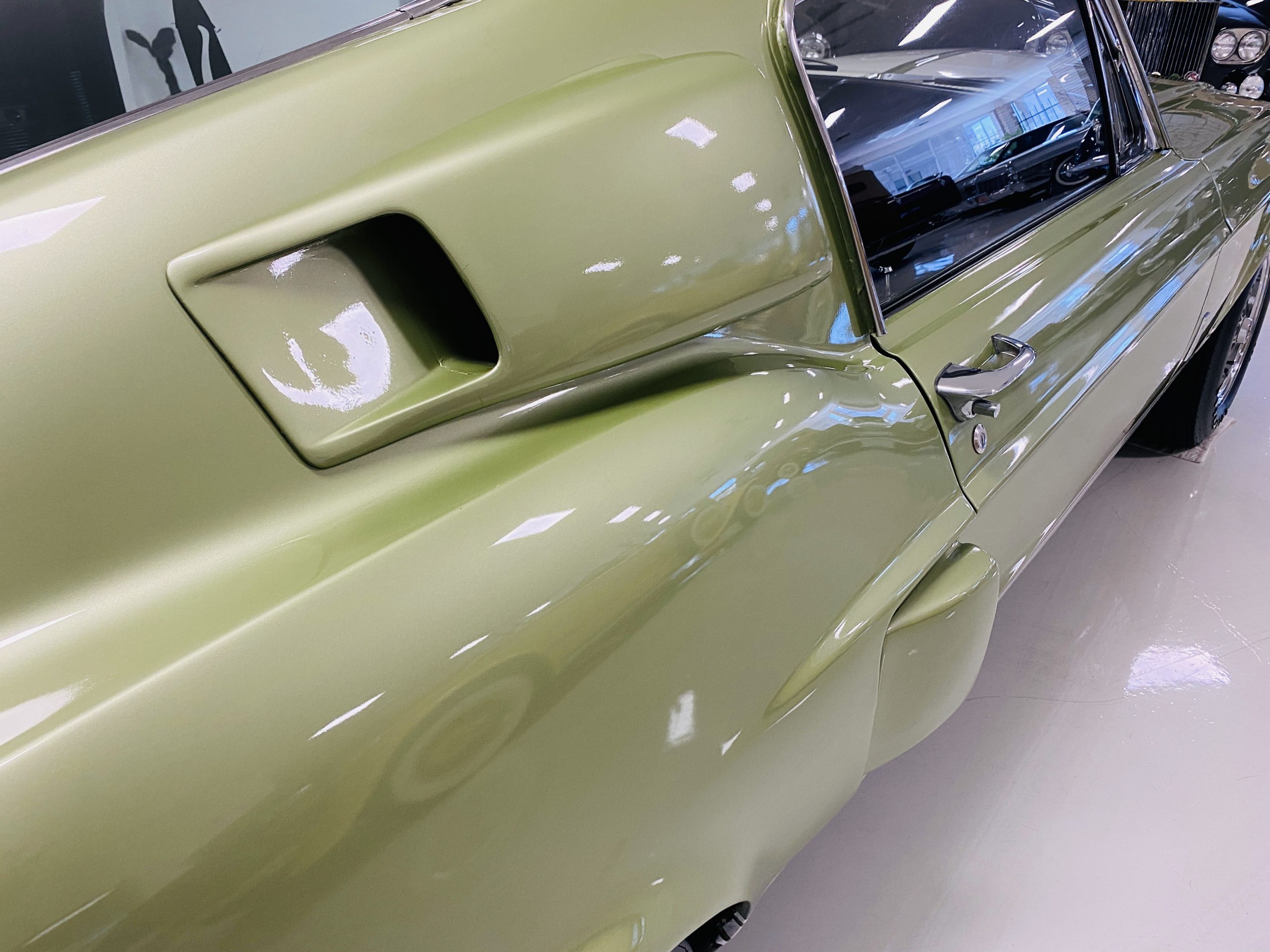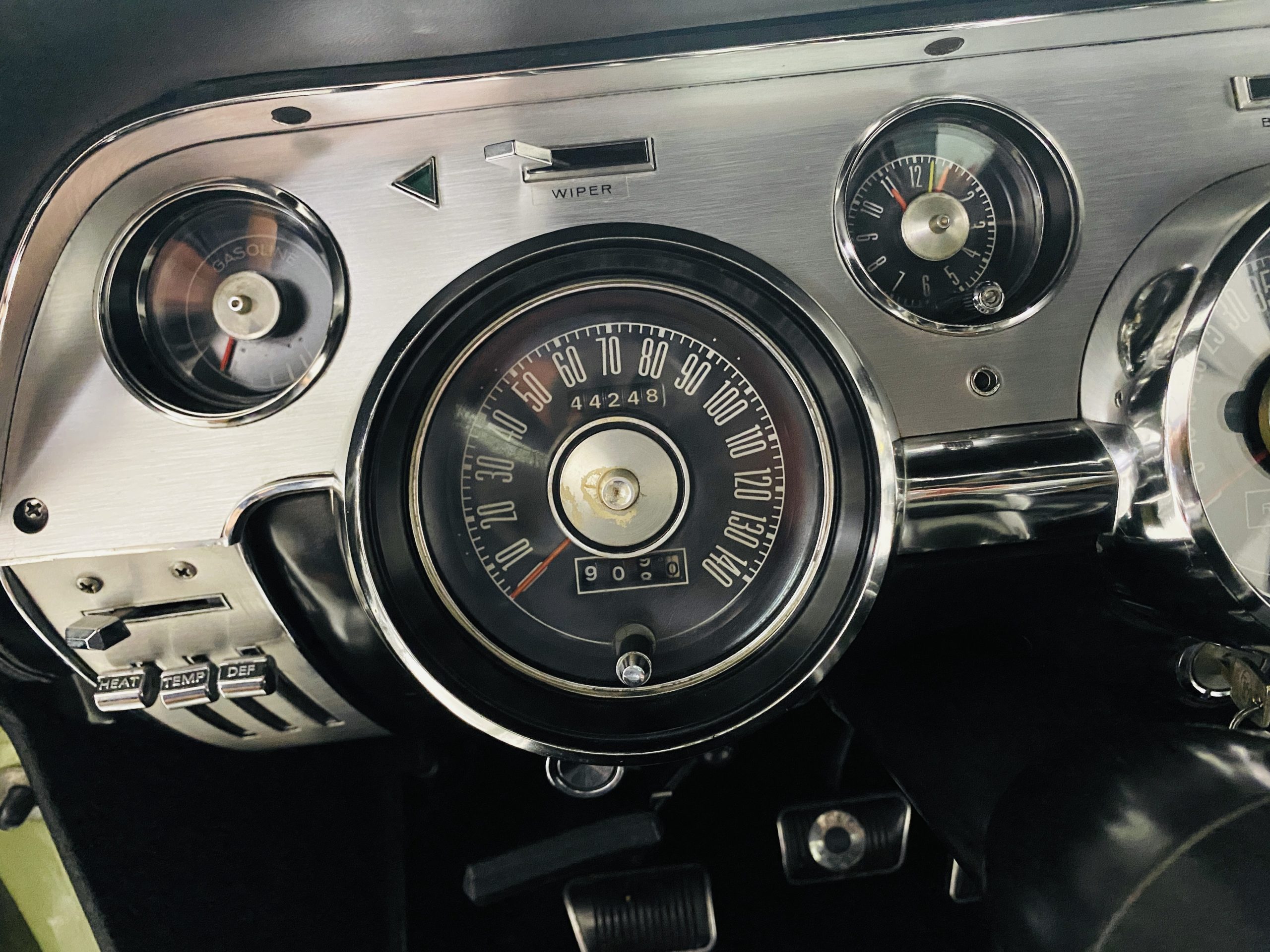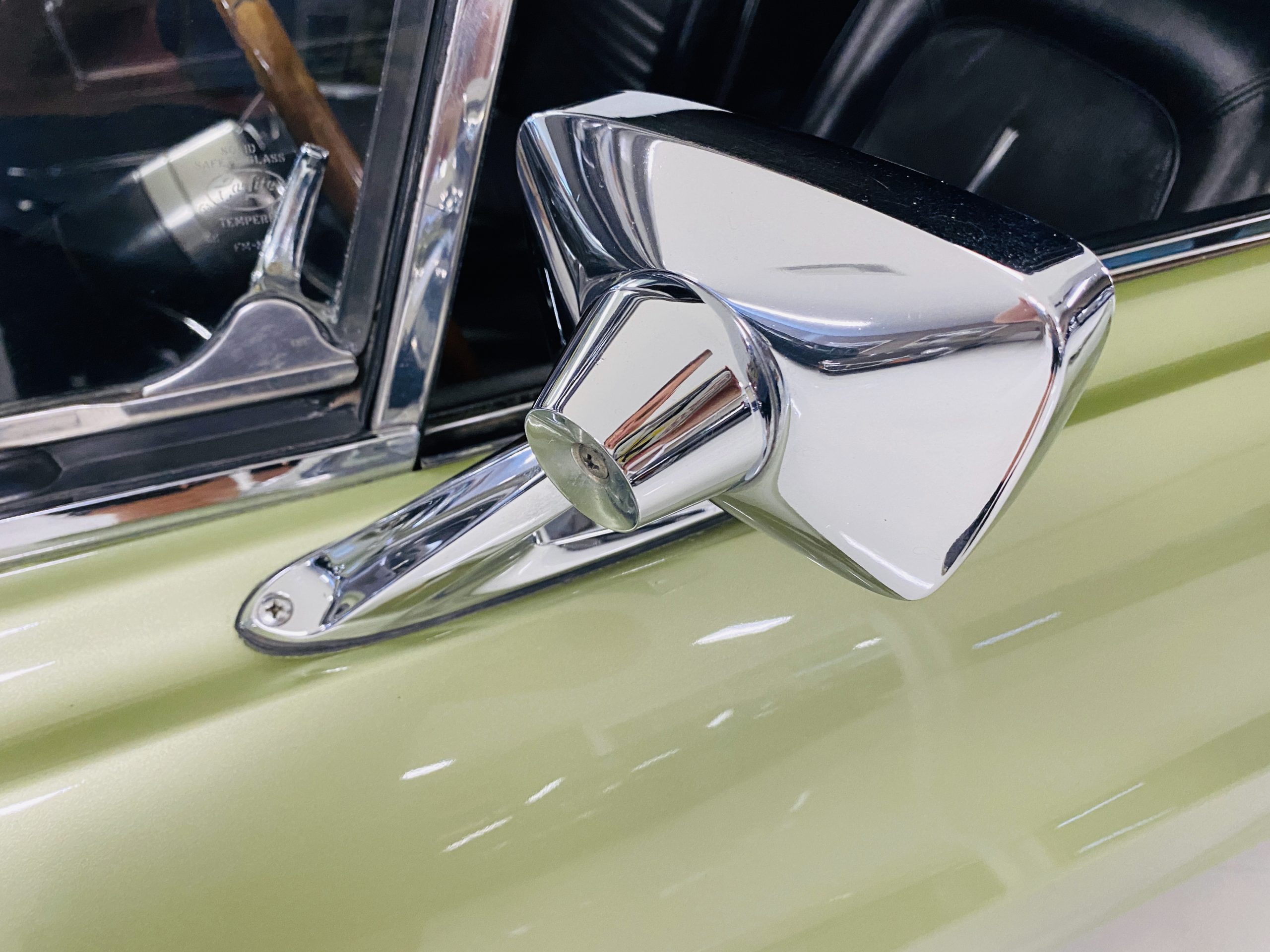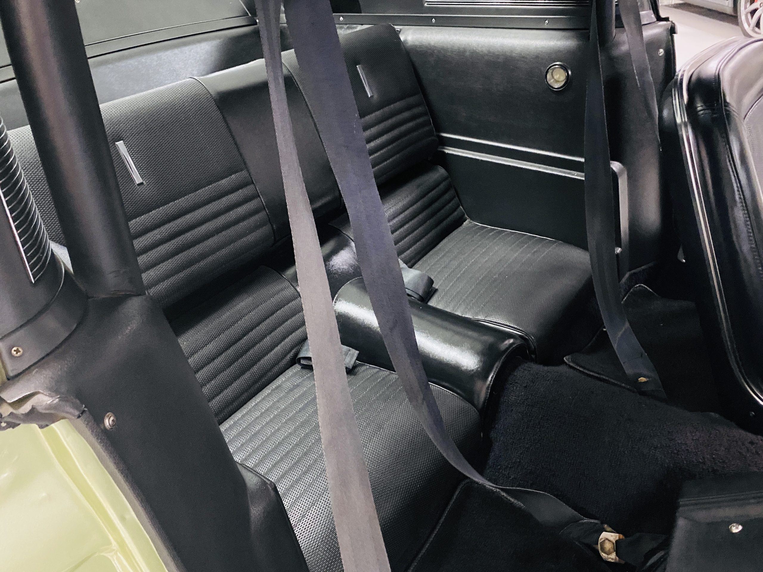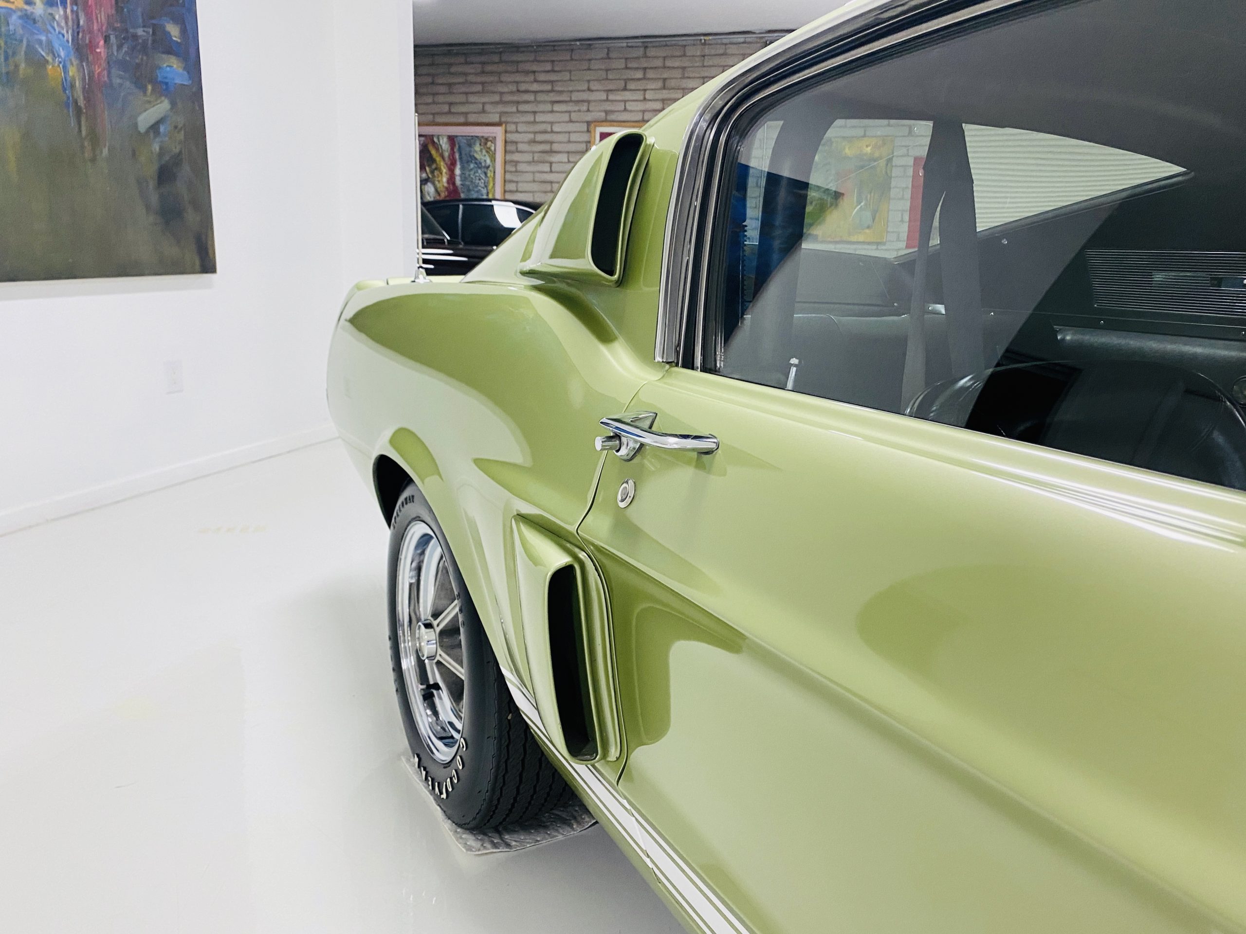 We love the Lime Green metallic paint with the white owner added Le Mans racing stripes.  The paint appears to have many sections of original paint with added clear coat.  Overall, the paint and chrome is good to very good.  There is orange peel evidenced in the paint and a smaller upward dent in the drivers side front fender.  The chrome overall is very original and nice with a few small areas of imperfections.  It has the one piece slanted front grill with the center extensions for the headlights.  It has the Kelsey-Hayes 15-inch Magstar wheels and the functional side brake scoops.