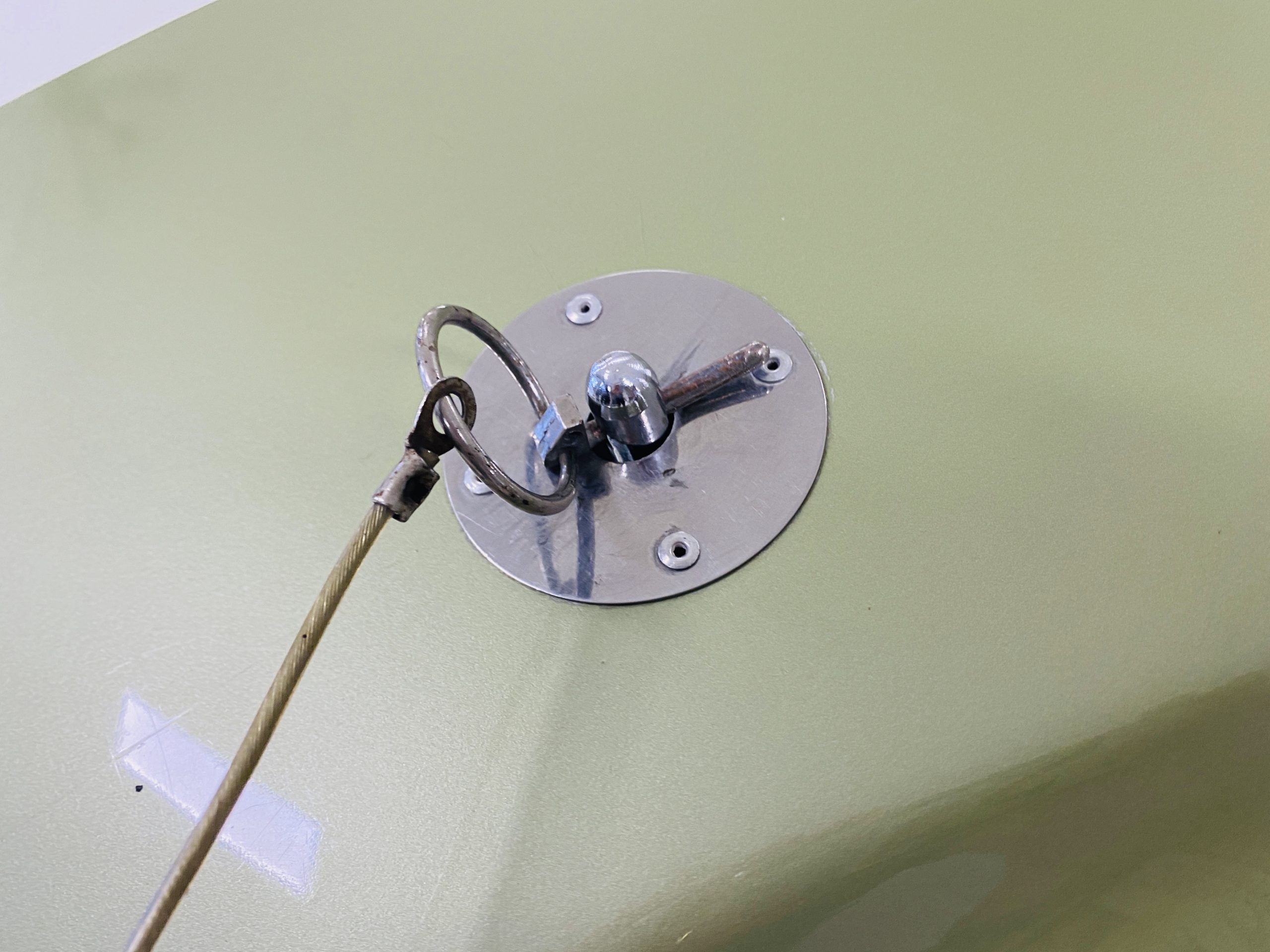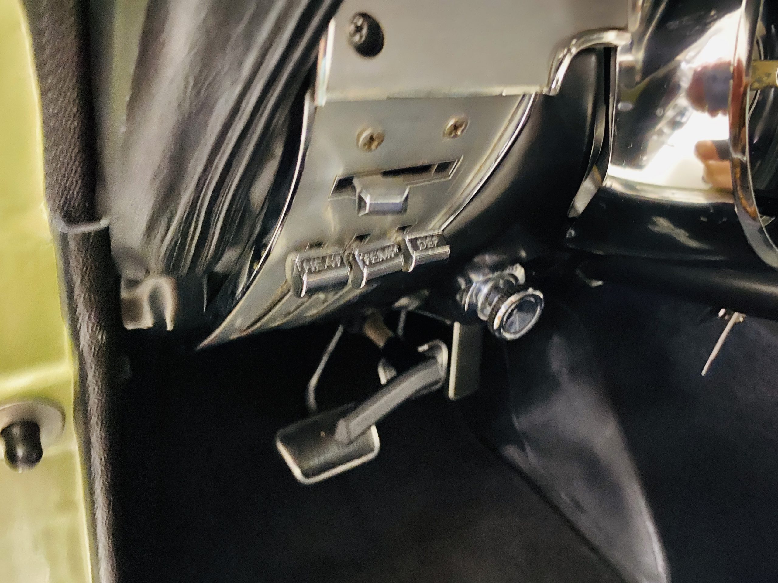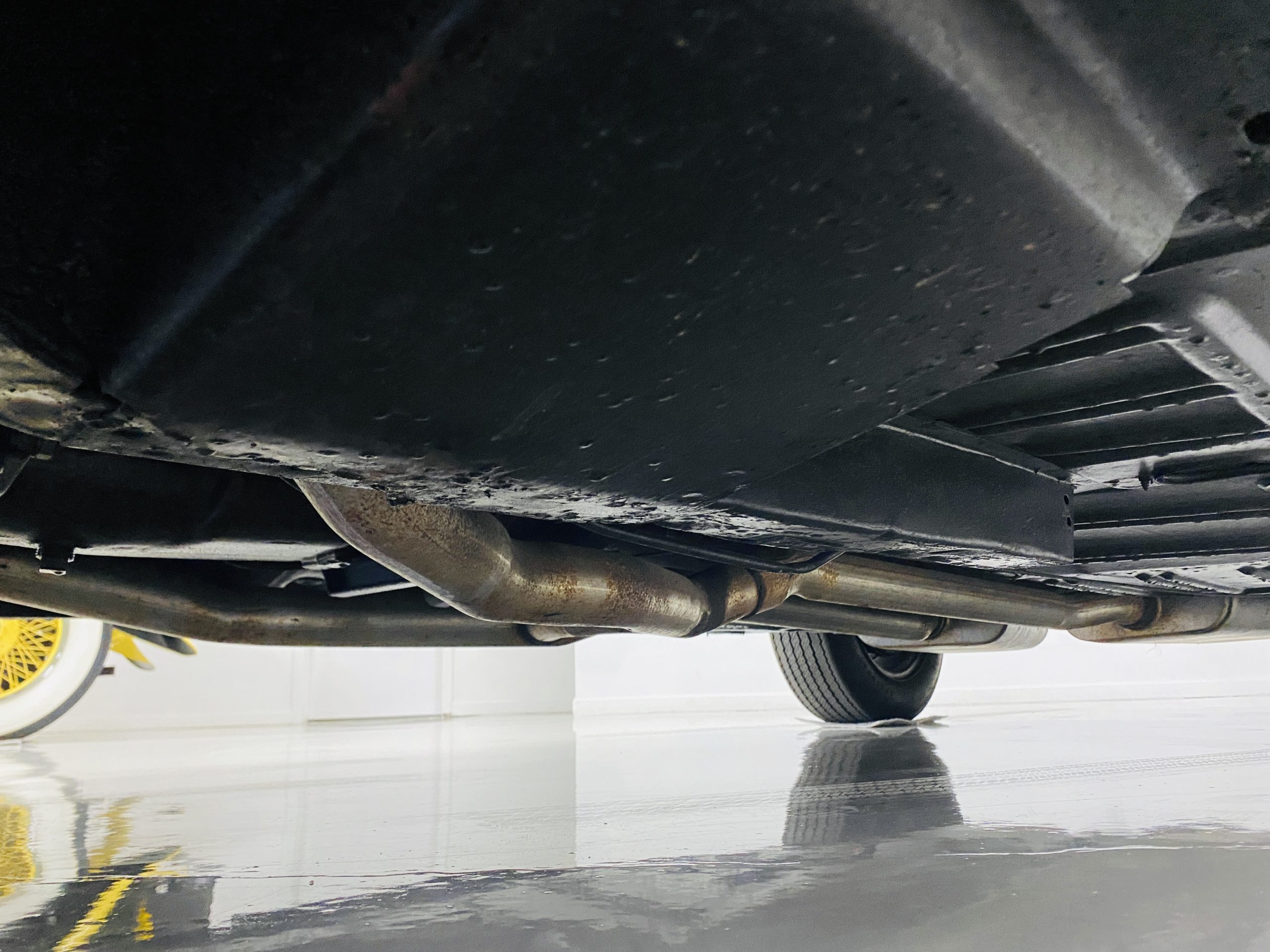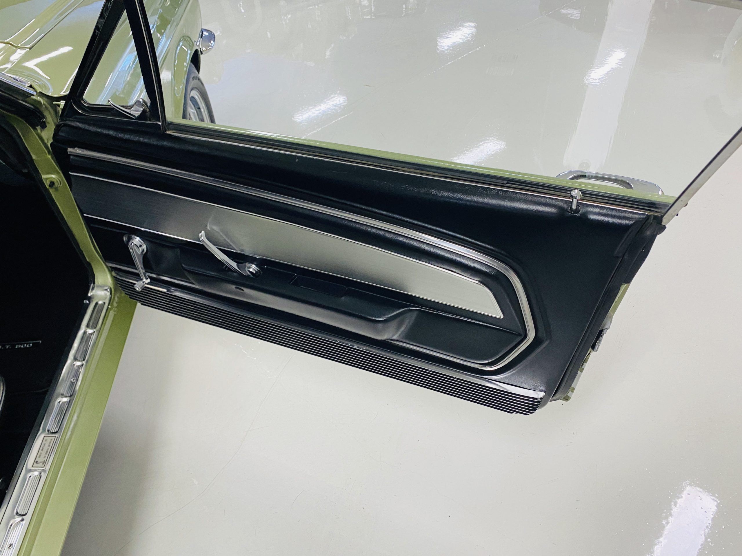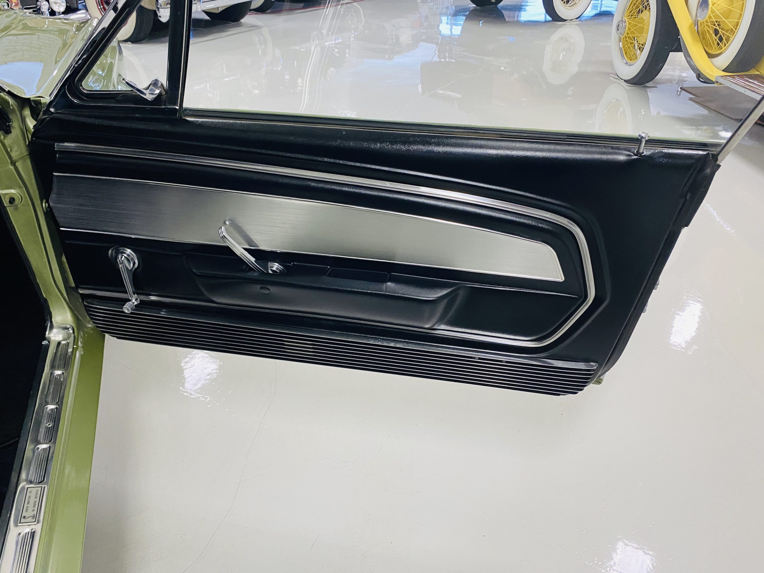 We love the Lime Green metallic paint with the white owner added Le Mans racing stripes.  The paint appears to have many sections of original paint with added clear coat.  Overall, the paint and chrome is good to very good.  There is orange peel evidenced in the paint and a smaller upward dent in the drivers side front fender.  The chrome overall is very original and nice with a few small areas of imperfections.  It has the one piece slanted front grill with the center extensions for the headlights.  It has the Kelsey-Hayes 15-inch Magstar wheels and the functional side brake scoops.