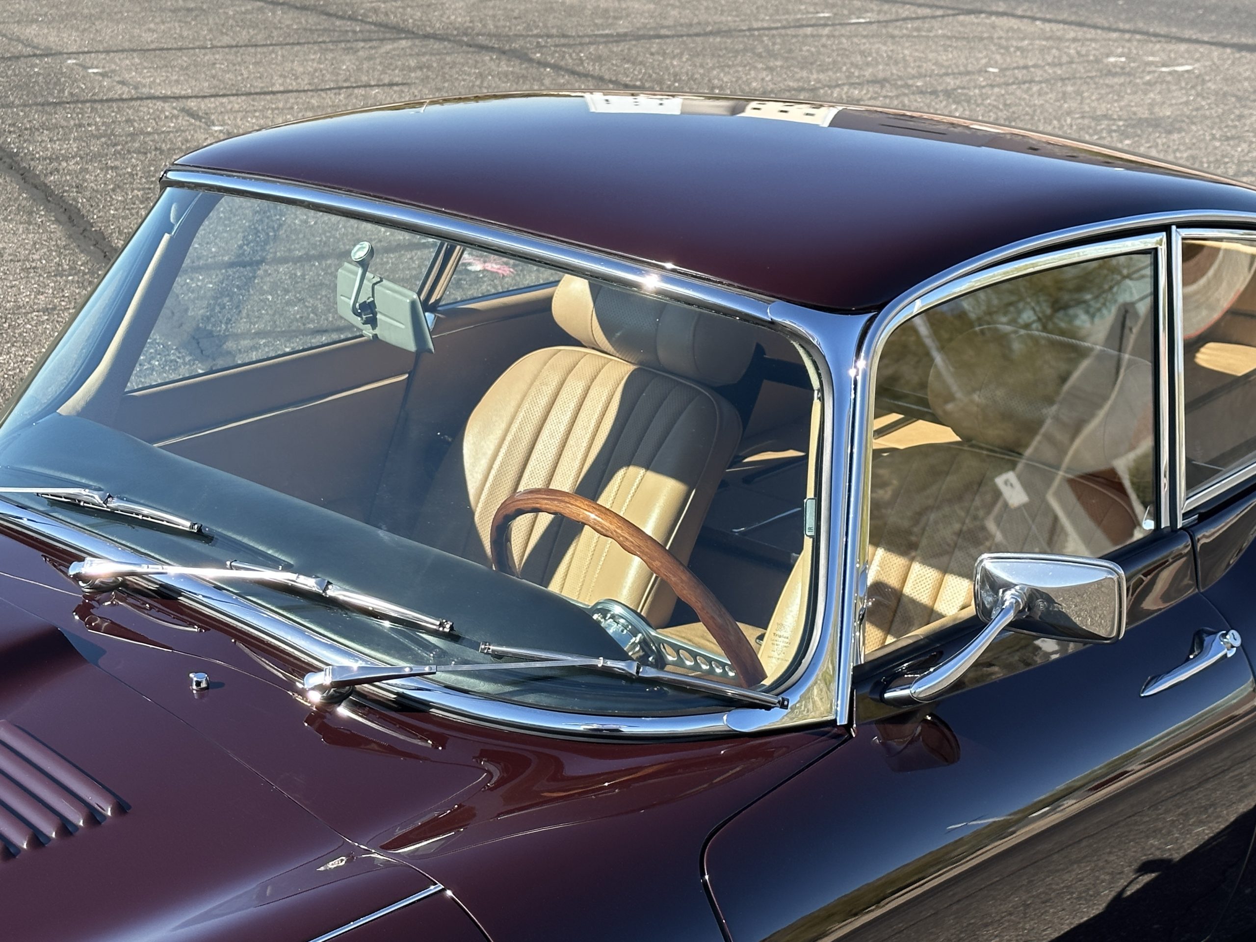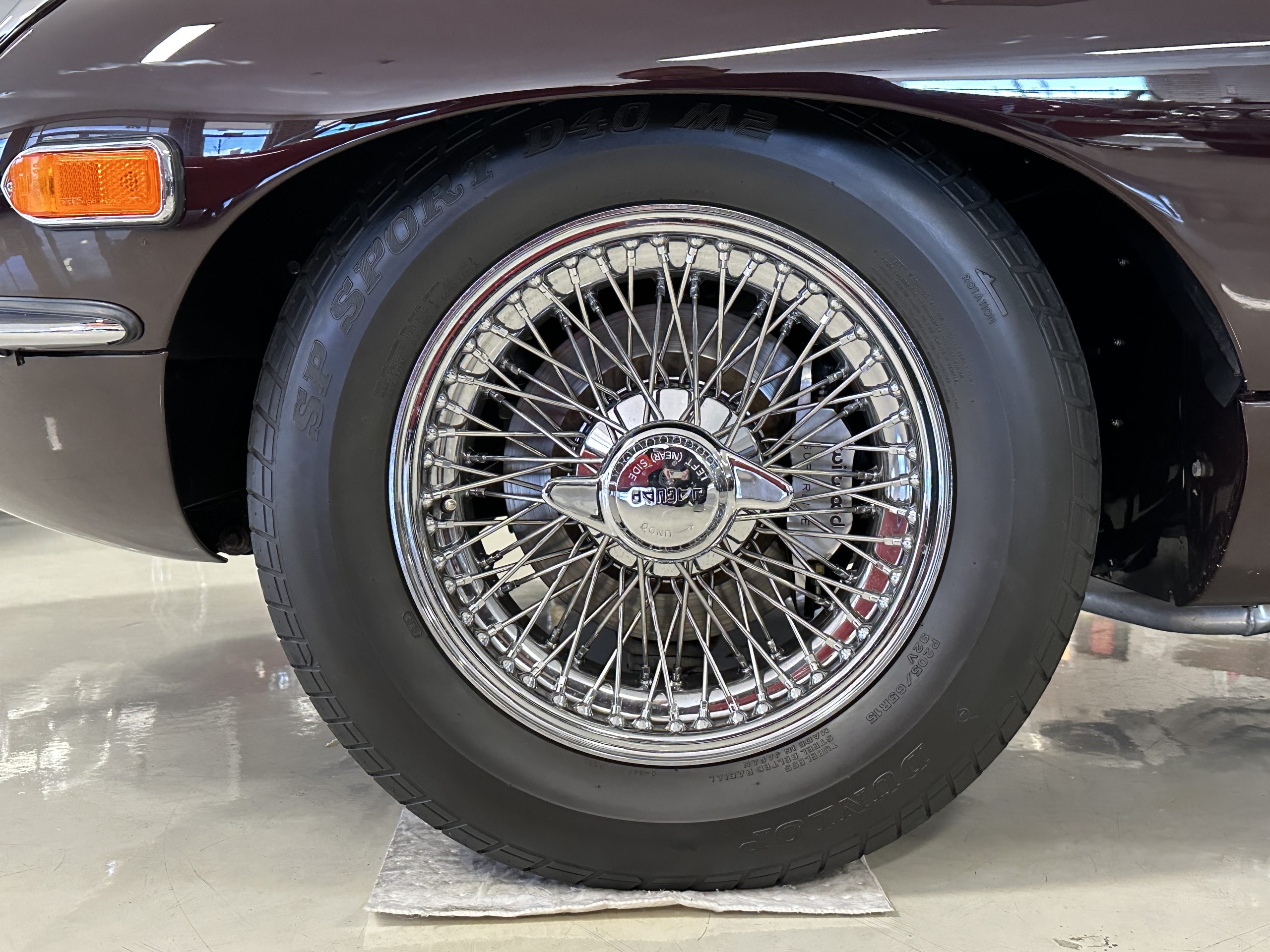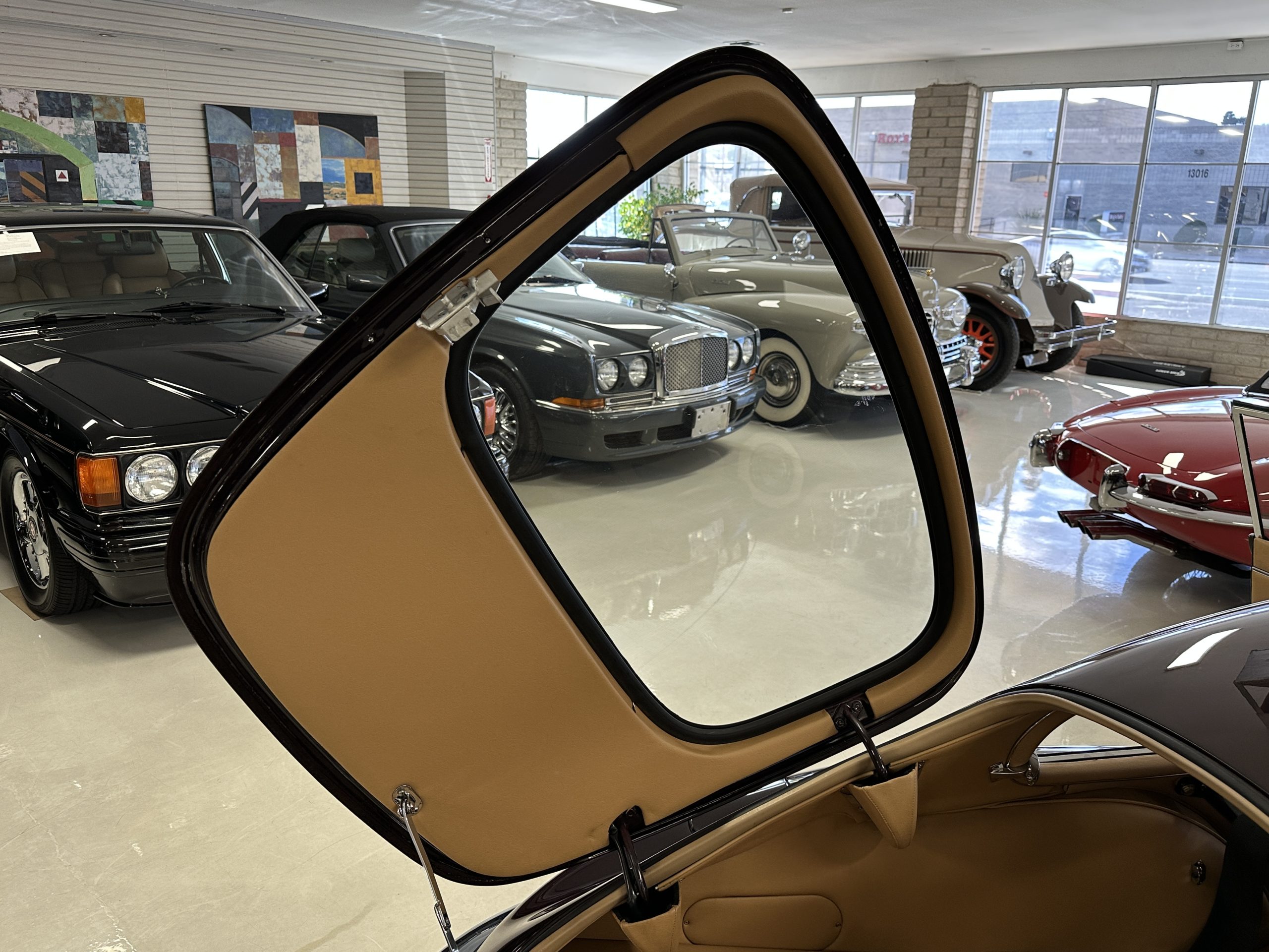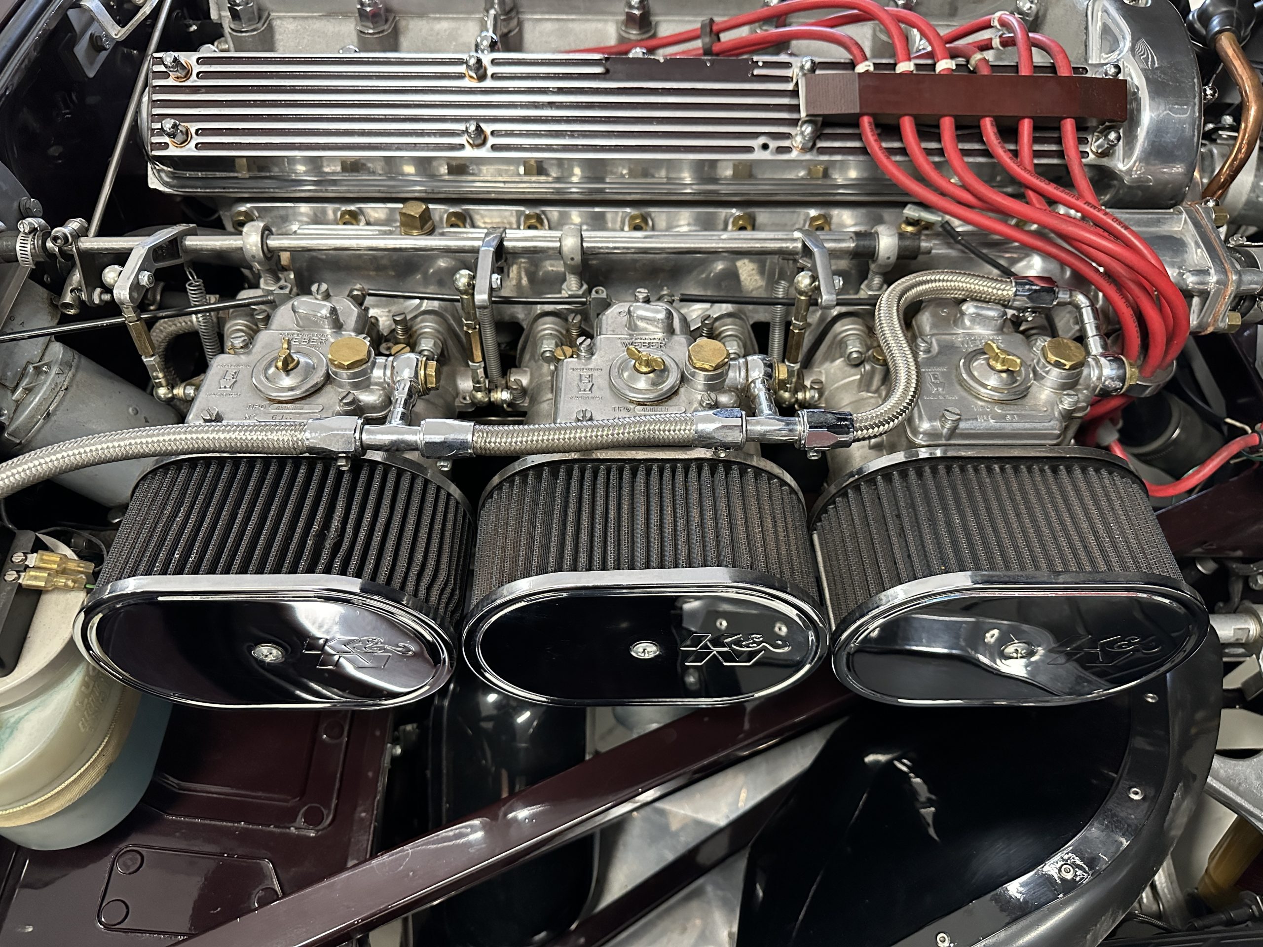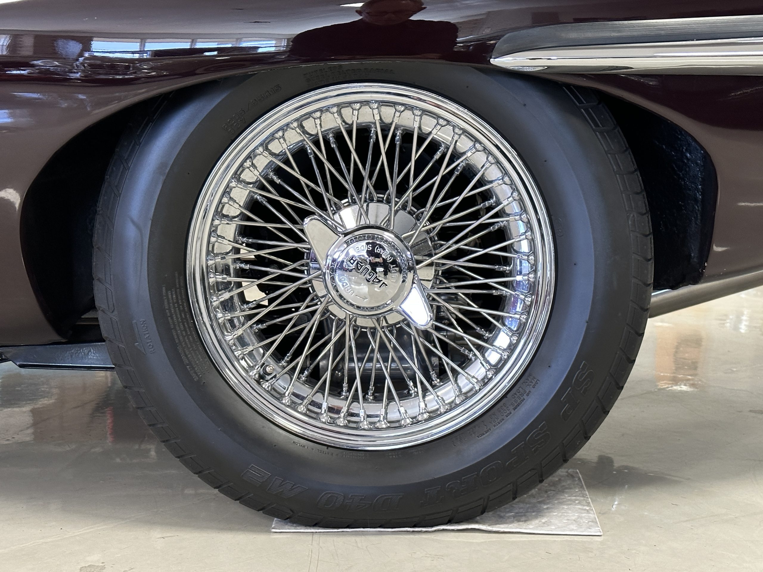 The Claret (Burgundy Paint Code 36) livery is gorgeous and has a uniquely elegant presence. The paint has excellent shine and luster and is in beautiful concours condition today. The Claret paint is its original and correct factory color. The chrome and stainless-steel trim have also been restored to concours condition. The chrome plated knock-off wire wheels are wrapped in era-correct looking Dunlap D40M2 tires and are also in excellent condition.