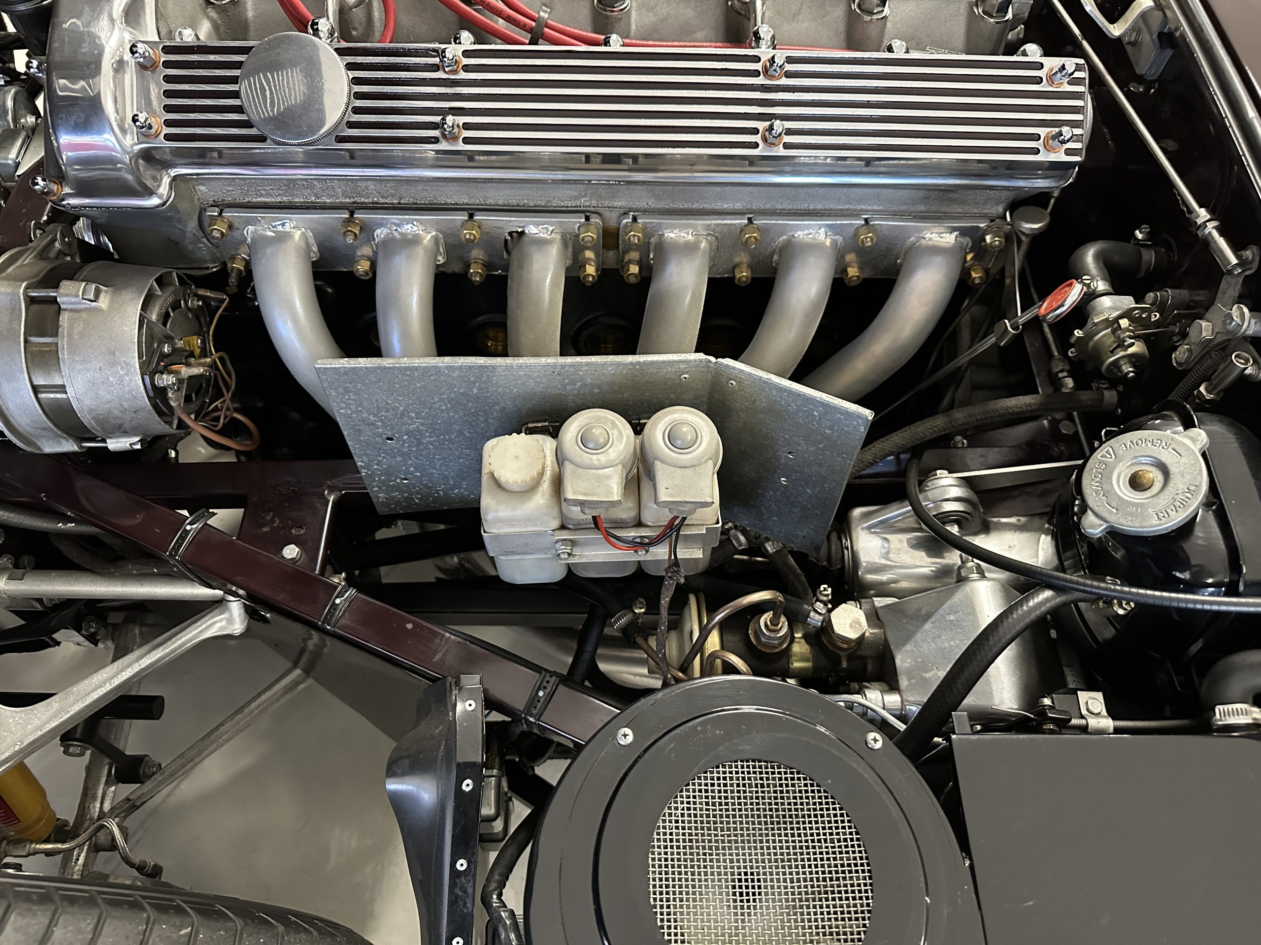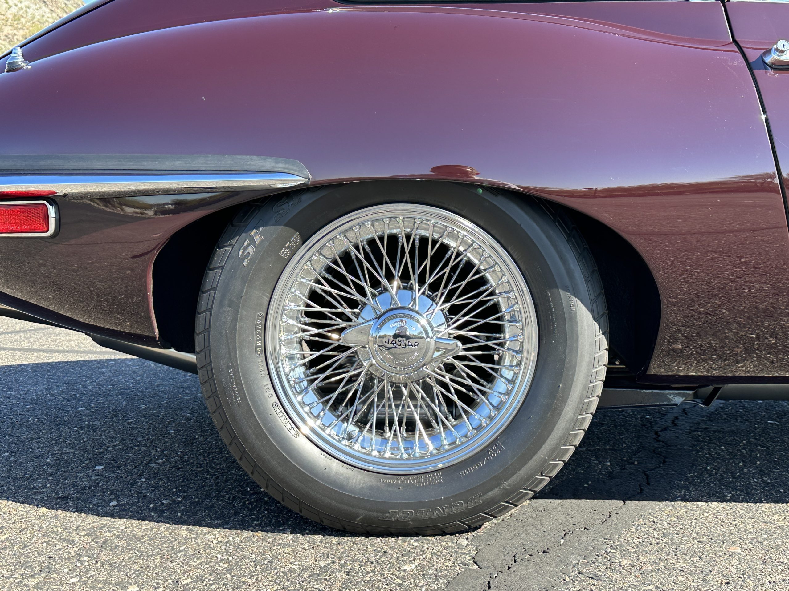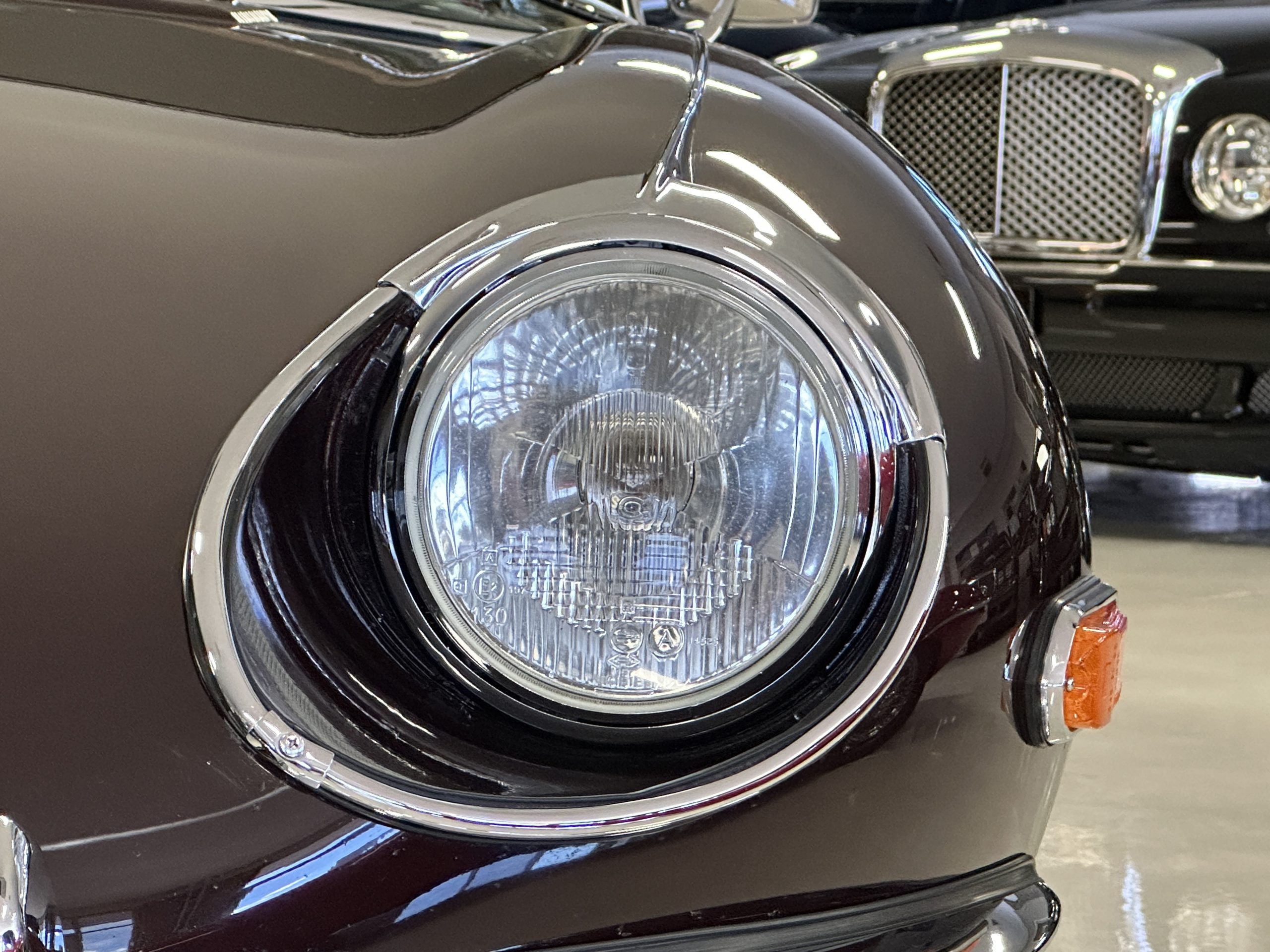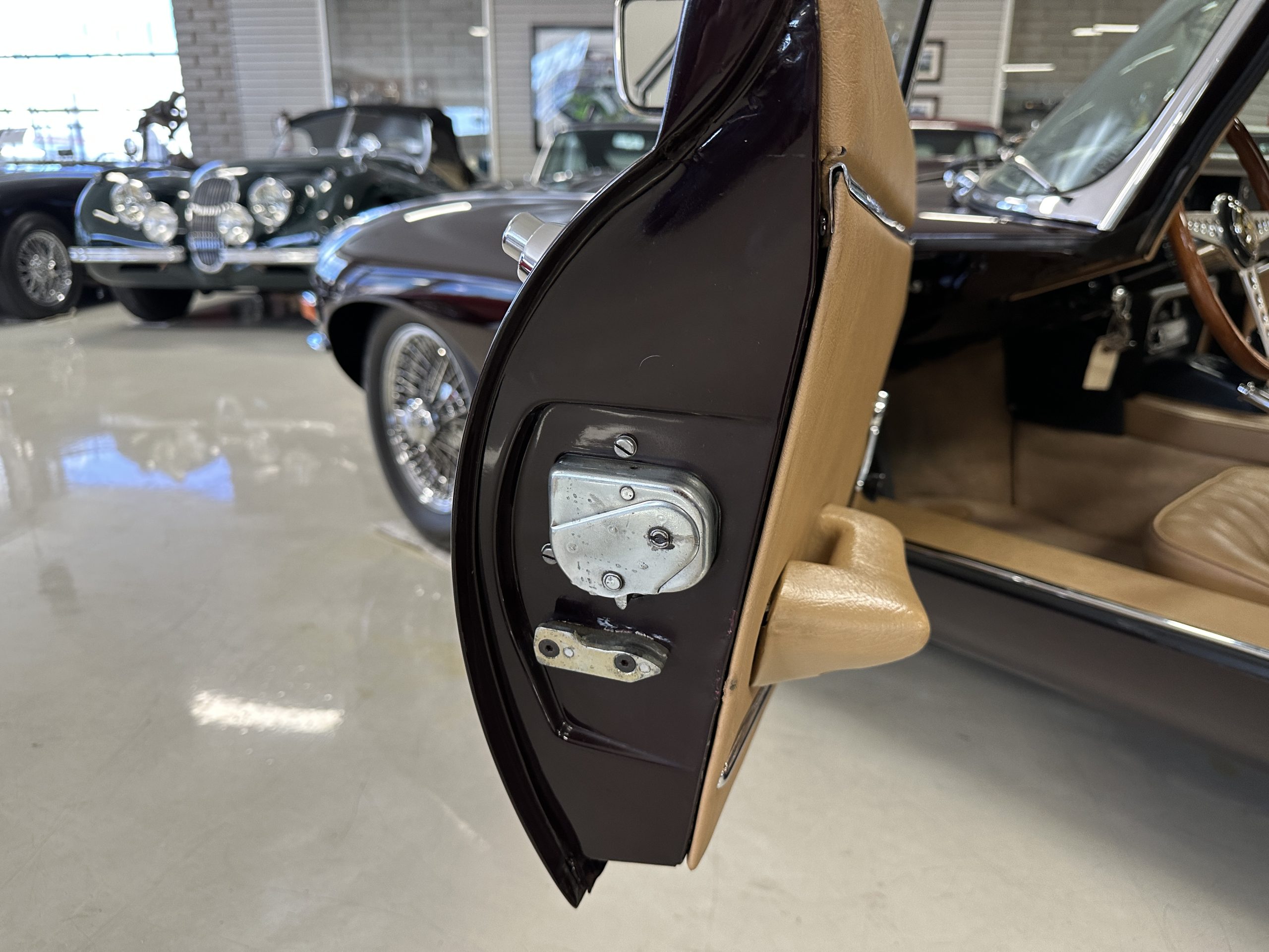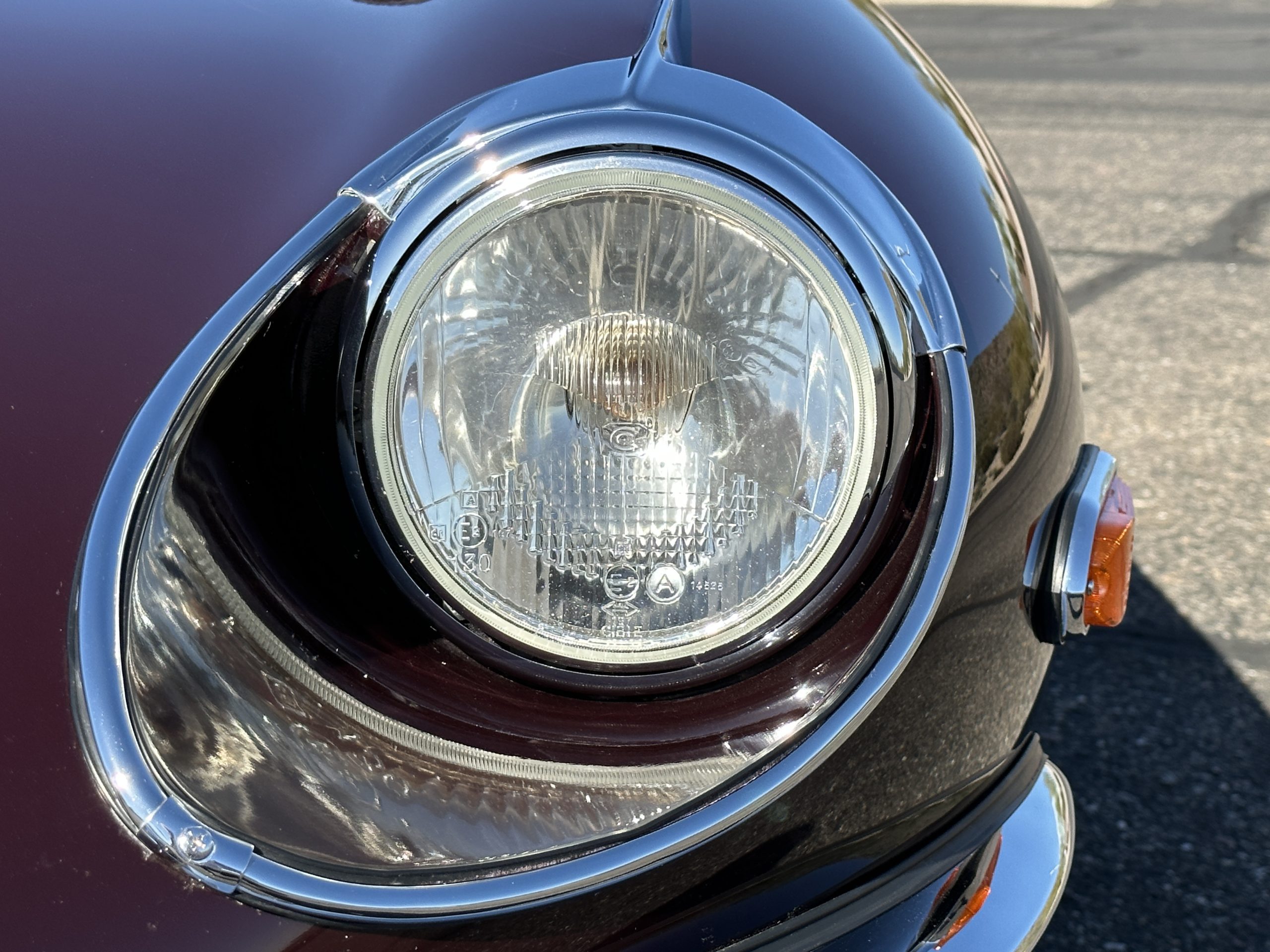 The Claret (Burgundy Paint Code 36) livery is gorgeous and has a uniquely elegant presence. The paint has excellent shine and luster and is in beautiful concours condition today. The Claret paint is its original and correct factory color. The chrome and stainless-steel trim have also been restored to concours condition. The chrome plated knock-off wire wheels are wrapped in era-correct looking Dunlap D40M2 tires and are also in excellent condition.