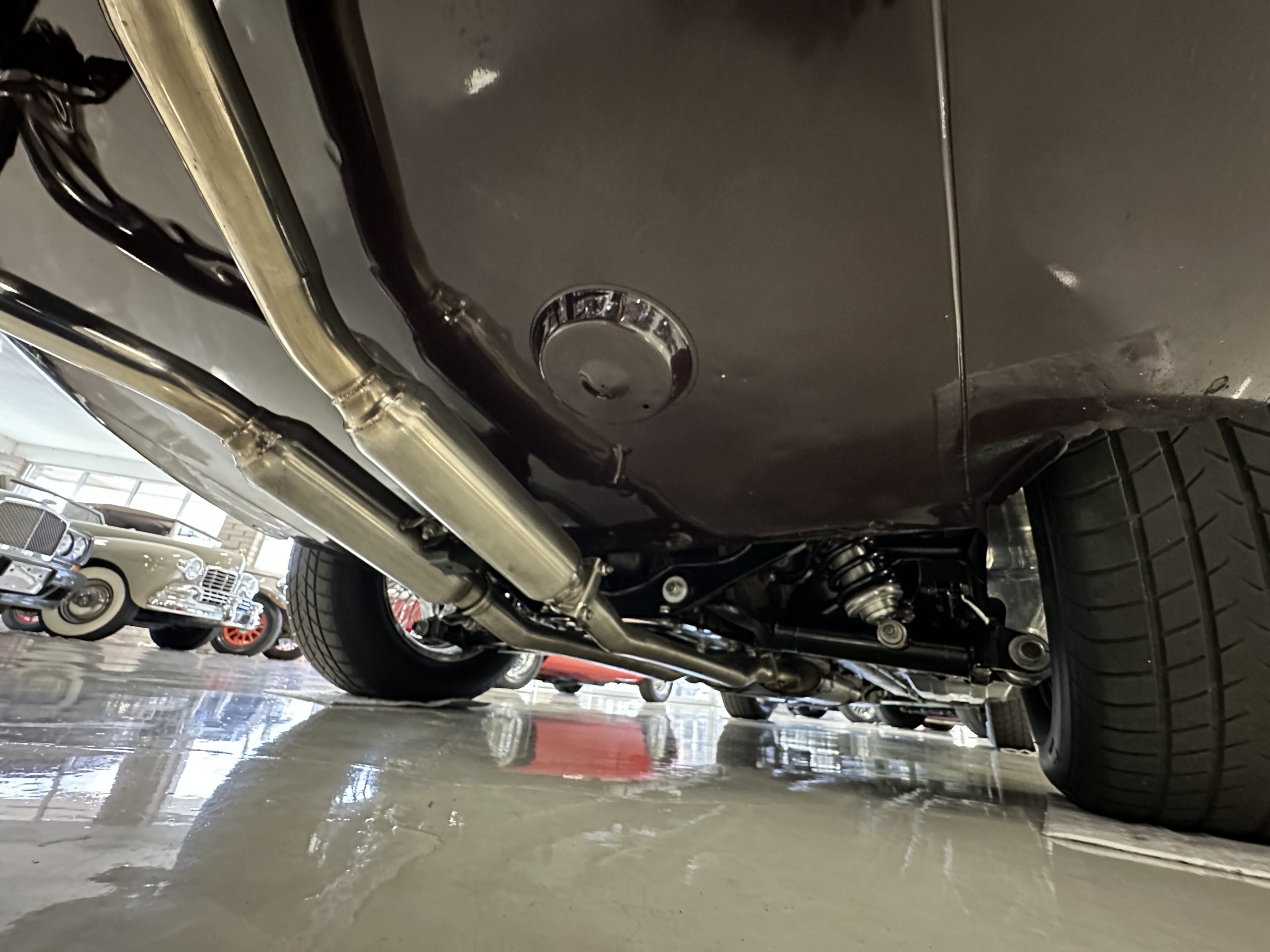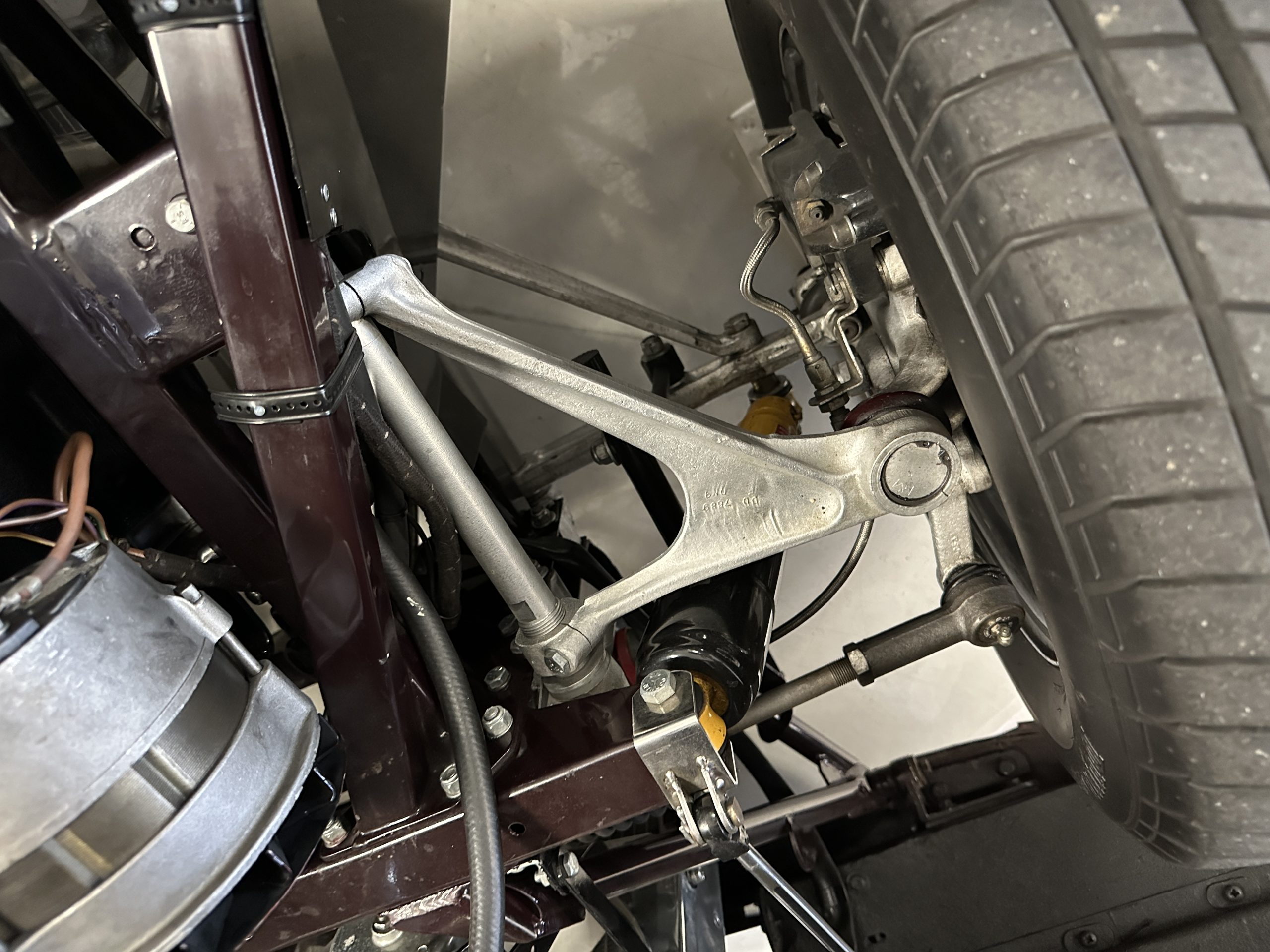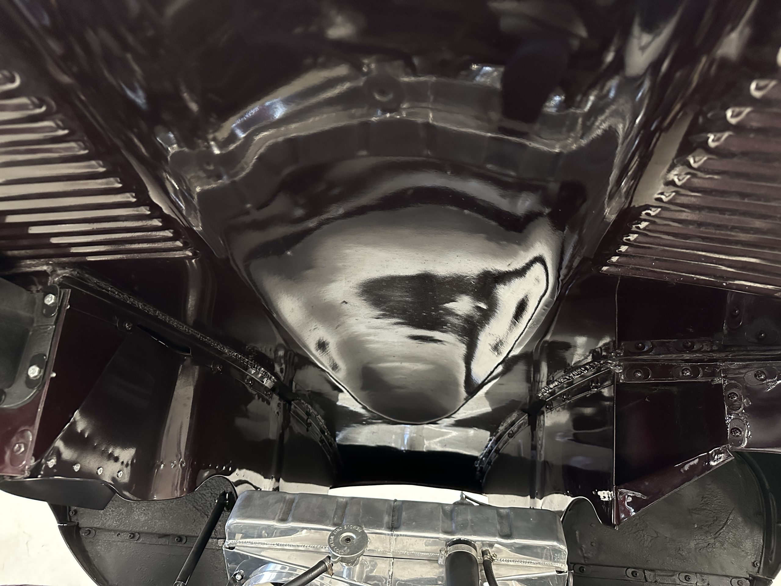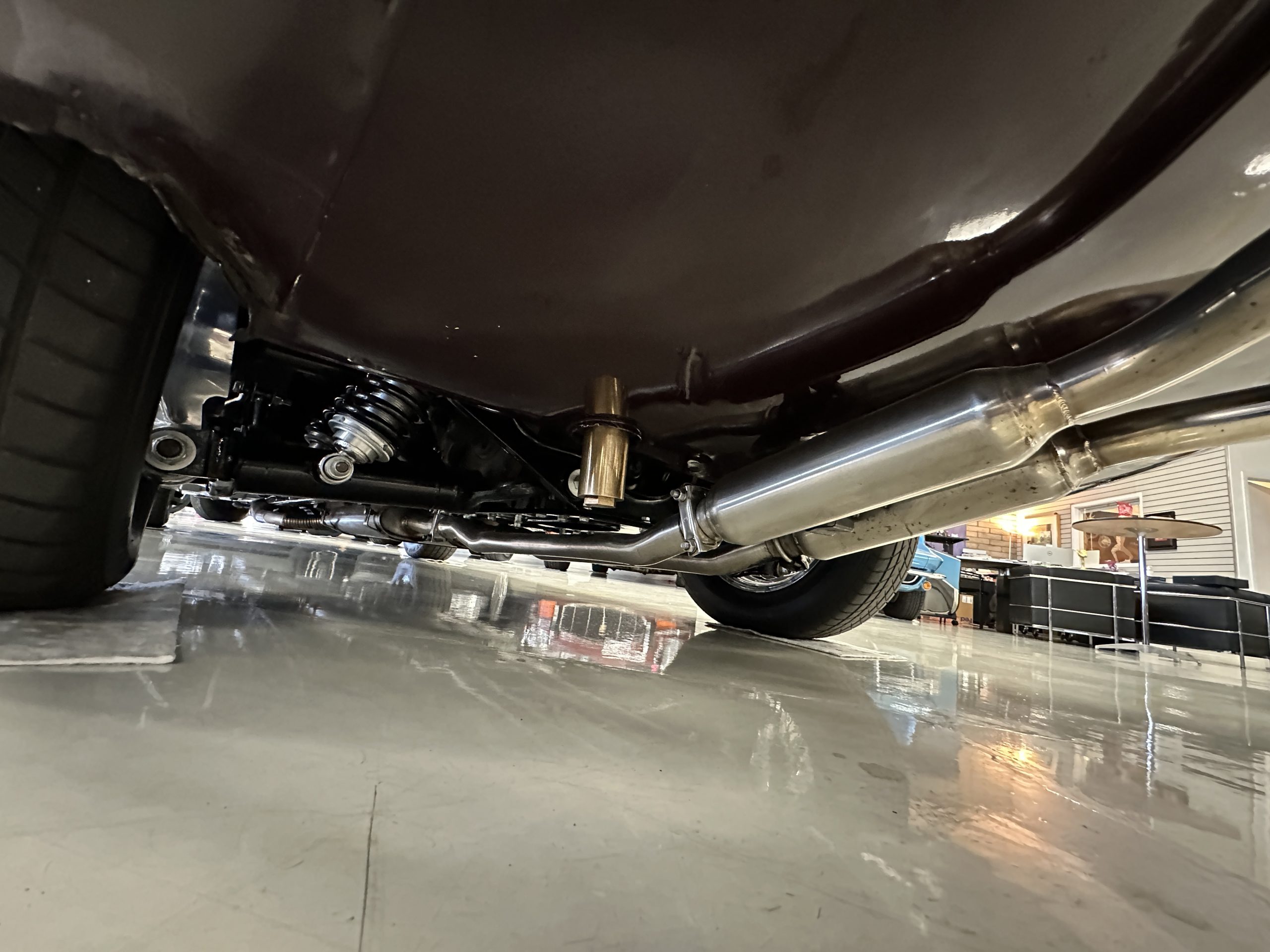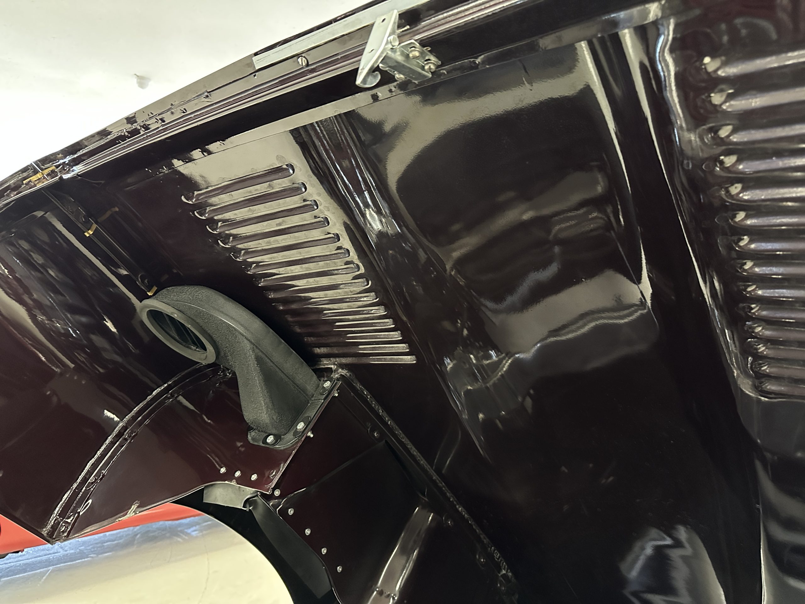 The Claret (Burgundy Paint Code 36) livery is gorgeous and has a uniquely elegant presence. The paint has excellent shine and luster and is in beautiful concours condition today. The Claret paint is its original and correct factory color. The chrome and stainless-steel trim have also been restored to concours condition. The chrome plated knock-off wire wheels are wrapped in era-correct looking Dunlap D40M2 tires and are also in excellent condition.