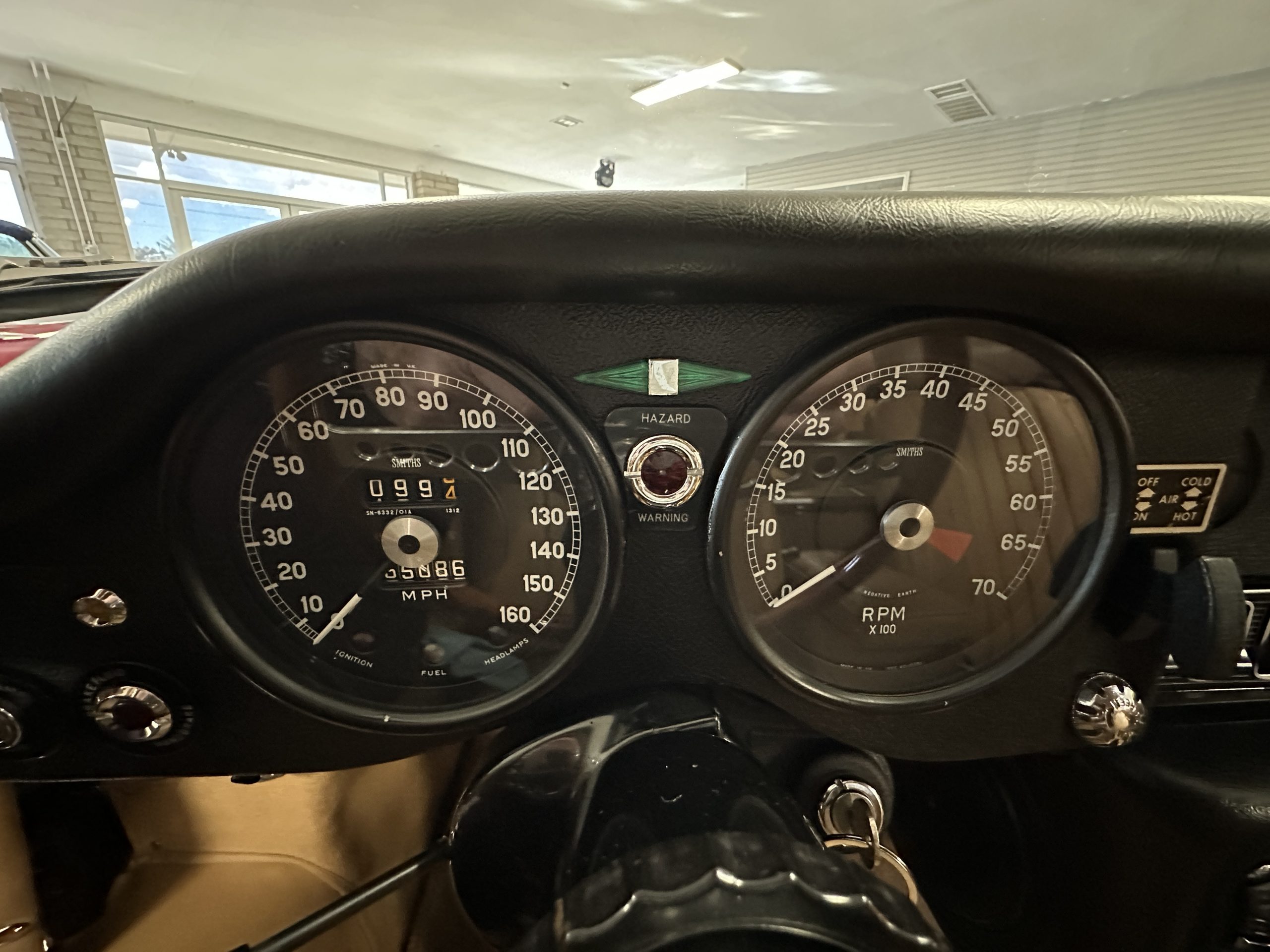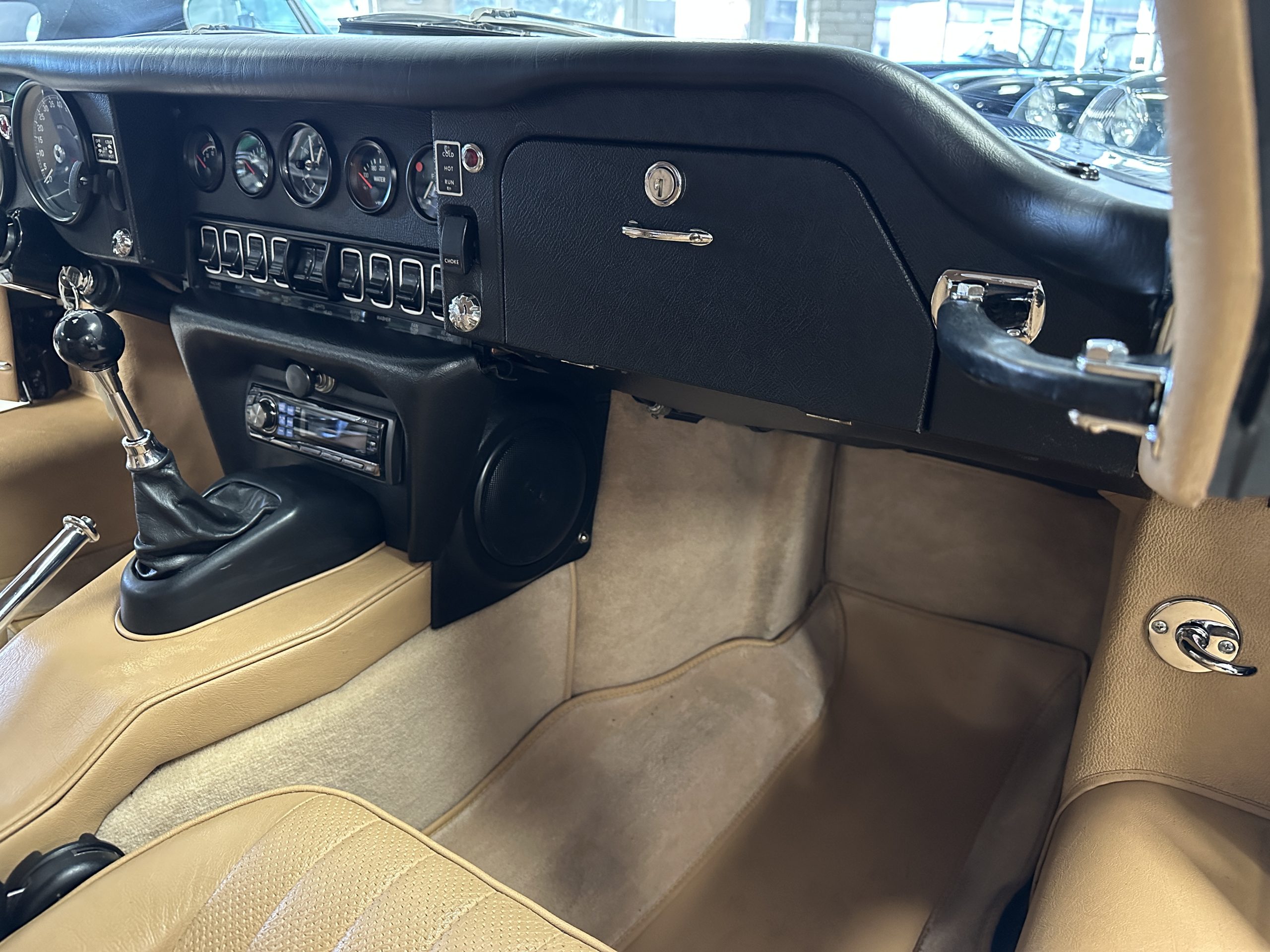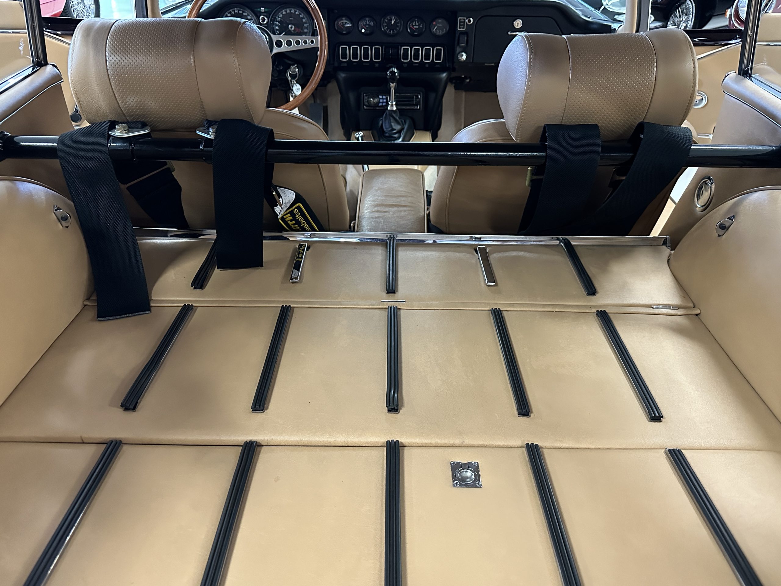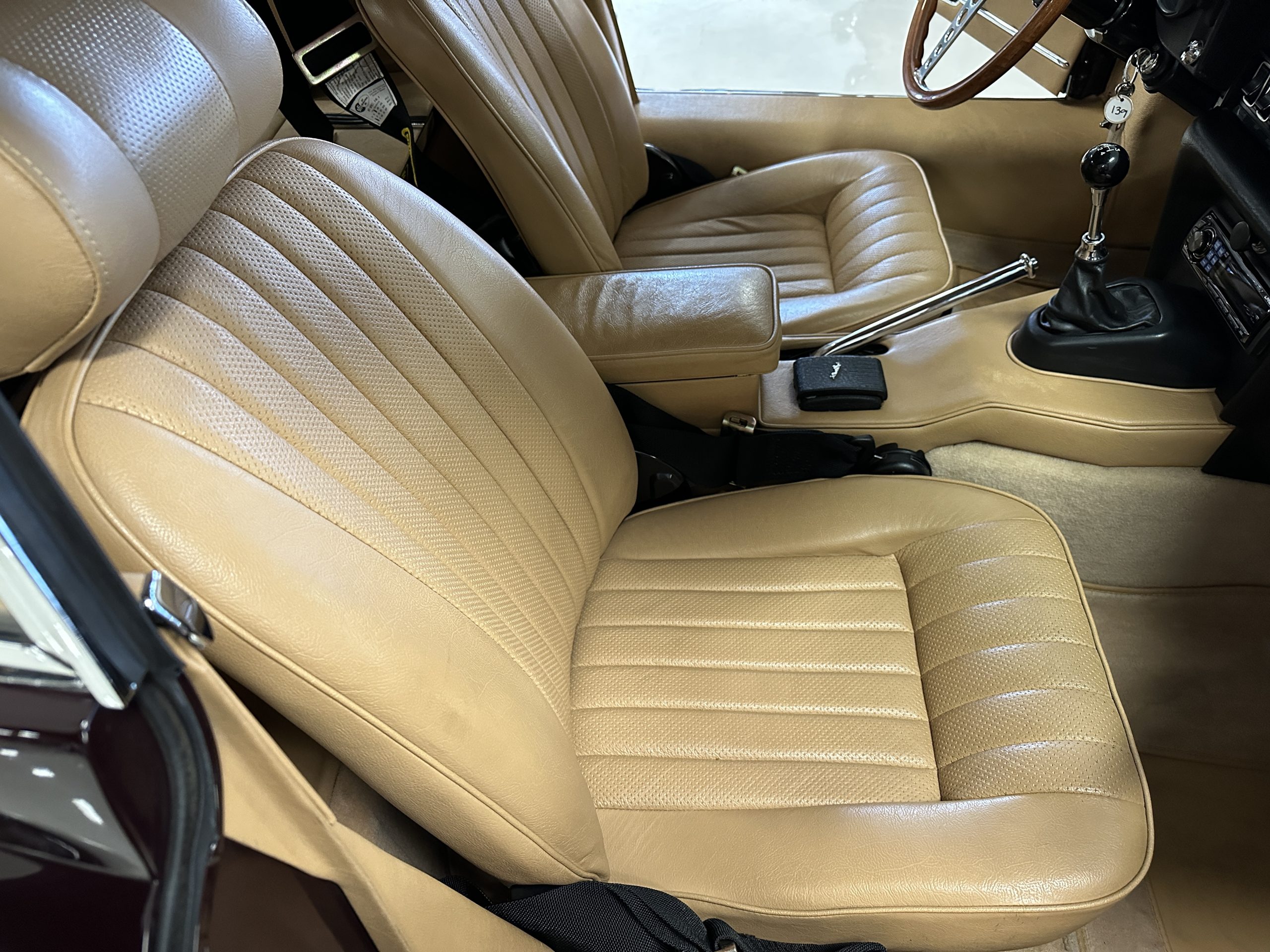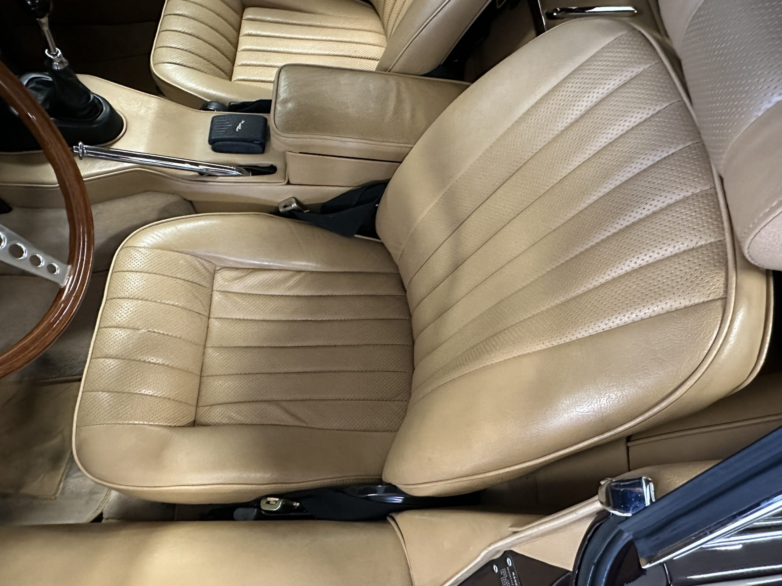 The interior has been refinished in the correct Biscuit Leather and beige wool carpeting. The interior overall is in concours condition today. The black dashboard is in excellent condition and the upgraded Momo wood rimmed steering wheel looks and feels great. The interior upgrades include a 7,000 RPM Jaguar branded tach from a V12 E-Type and a modern Alpine Stereo head unit.