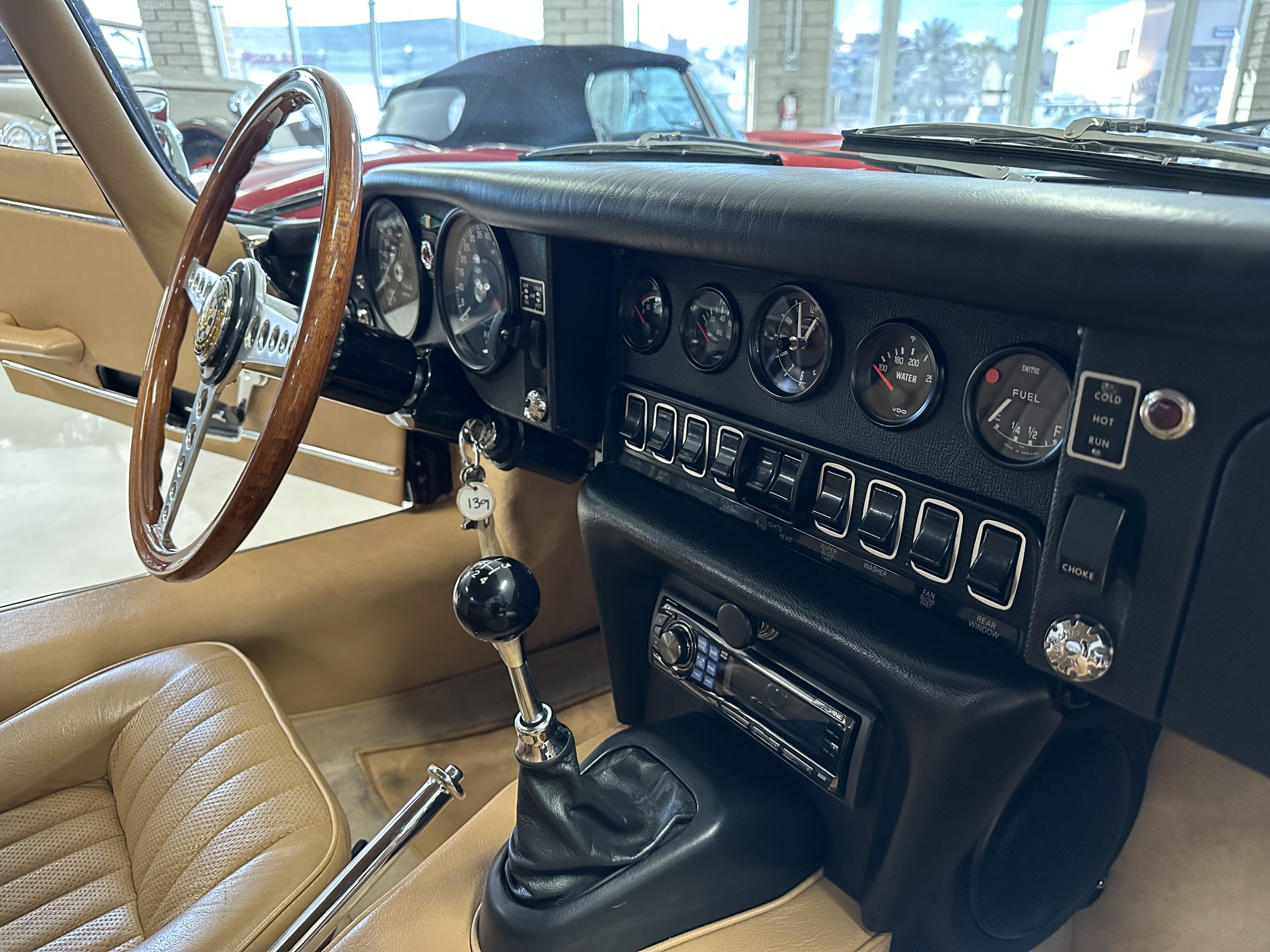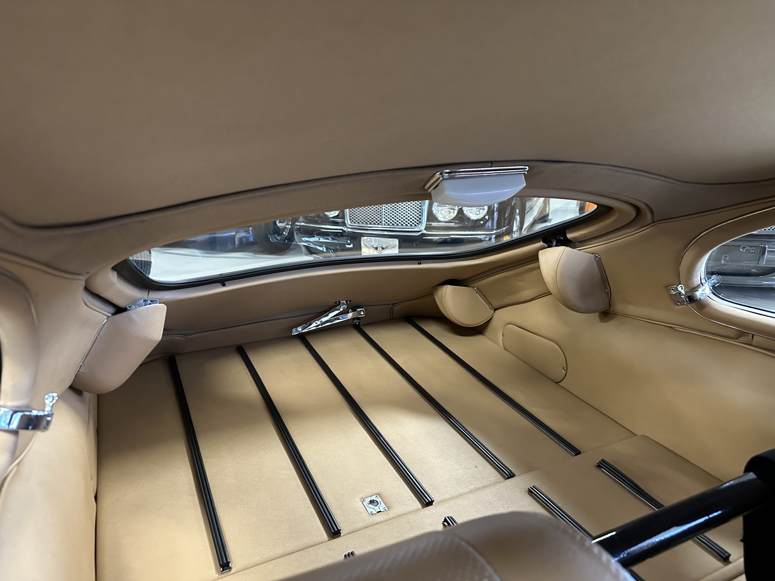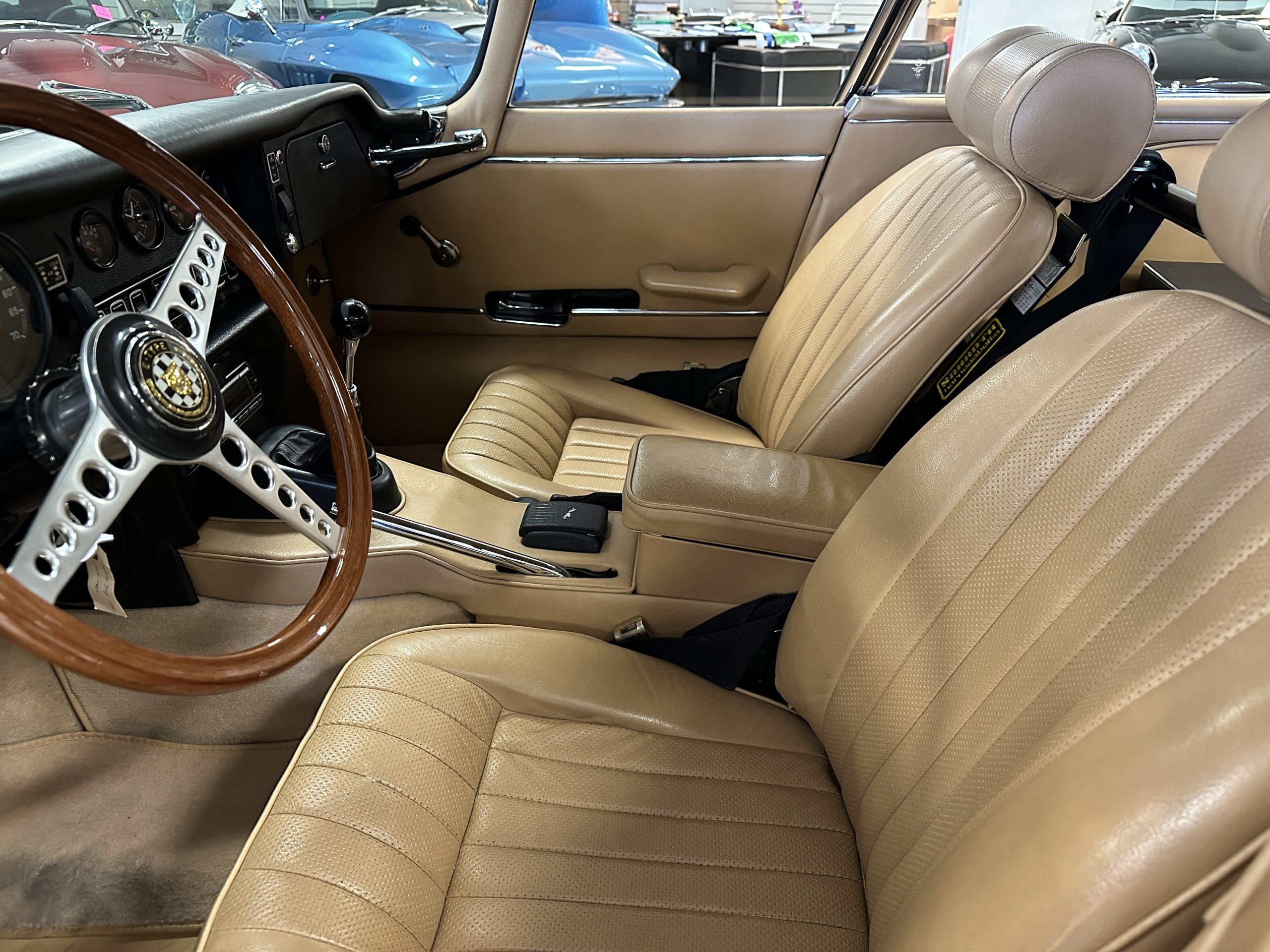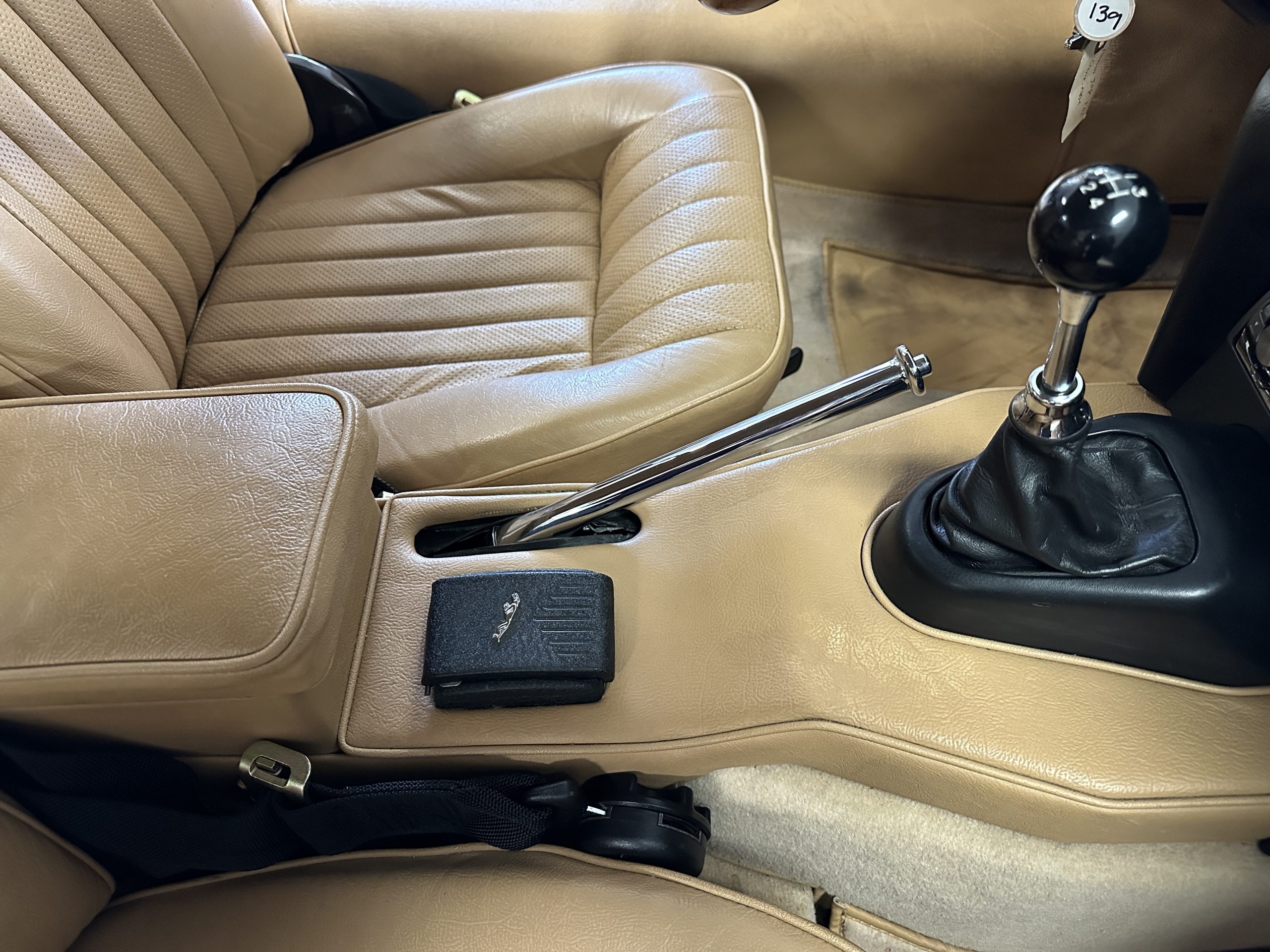 The interior has been refinished in the correct Biscuit Leather and beige wool carpeting. The interior overall is in concours condition today. The black dashboard is in excellent condition and the upgraded Momo wood rimmed steering wheel looks and feels great. The interior upgrades include a 7,000 RPM Jaguar branded tach from a V12 E-Type and a modern Alpine Stereo head unit.