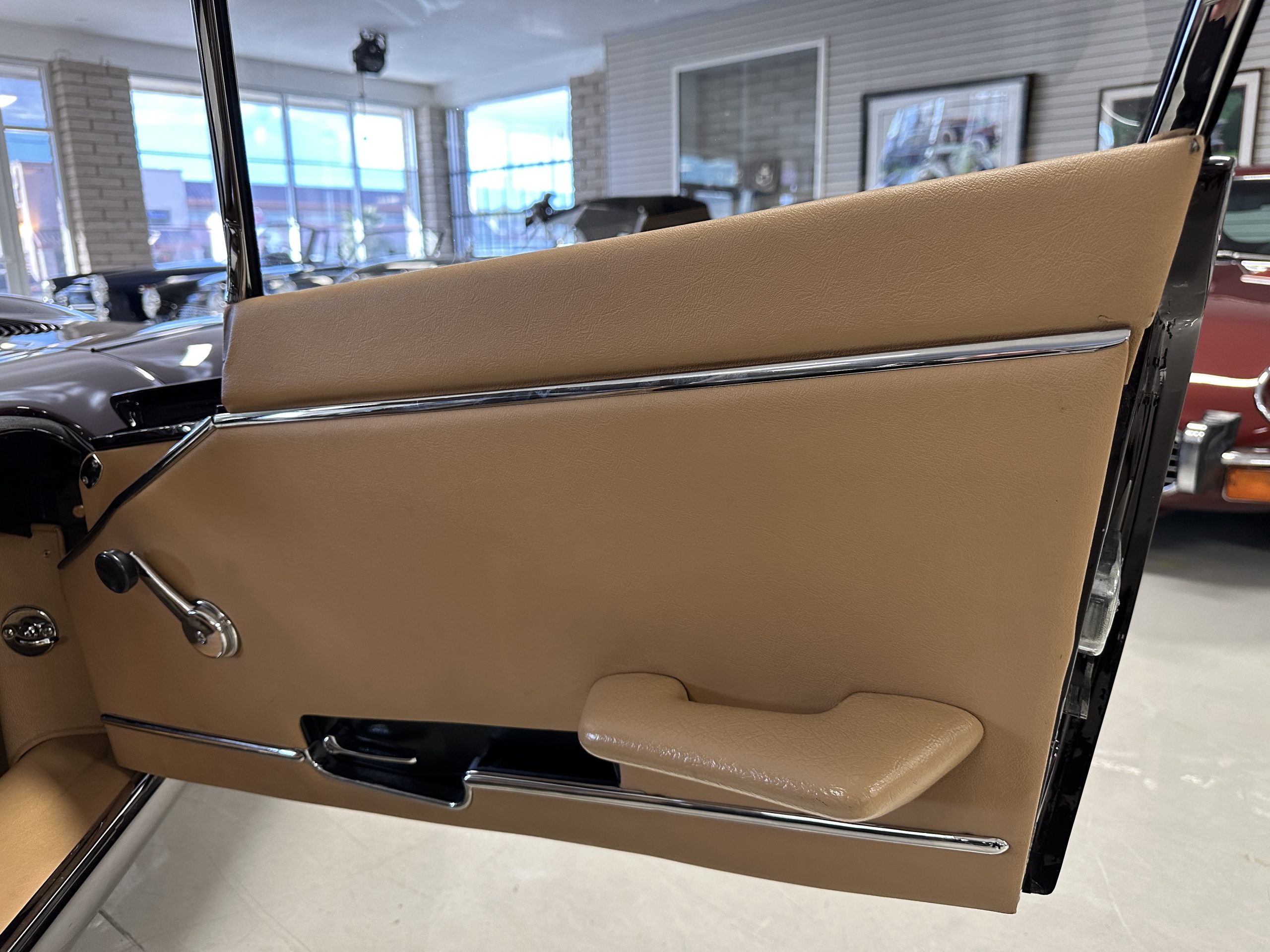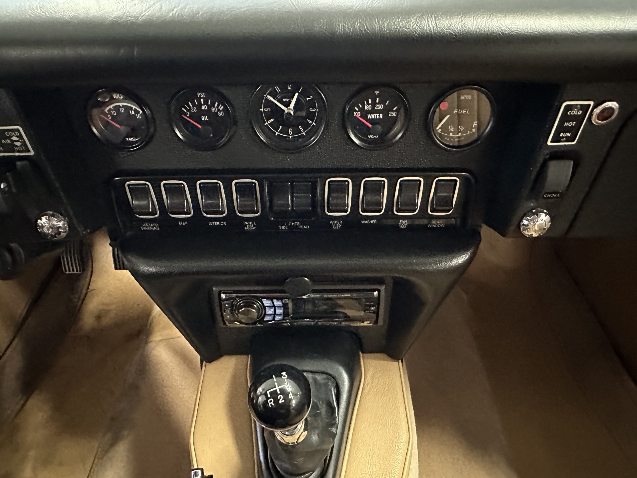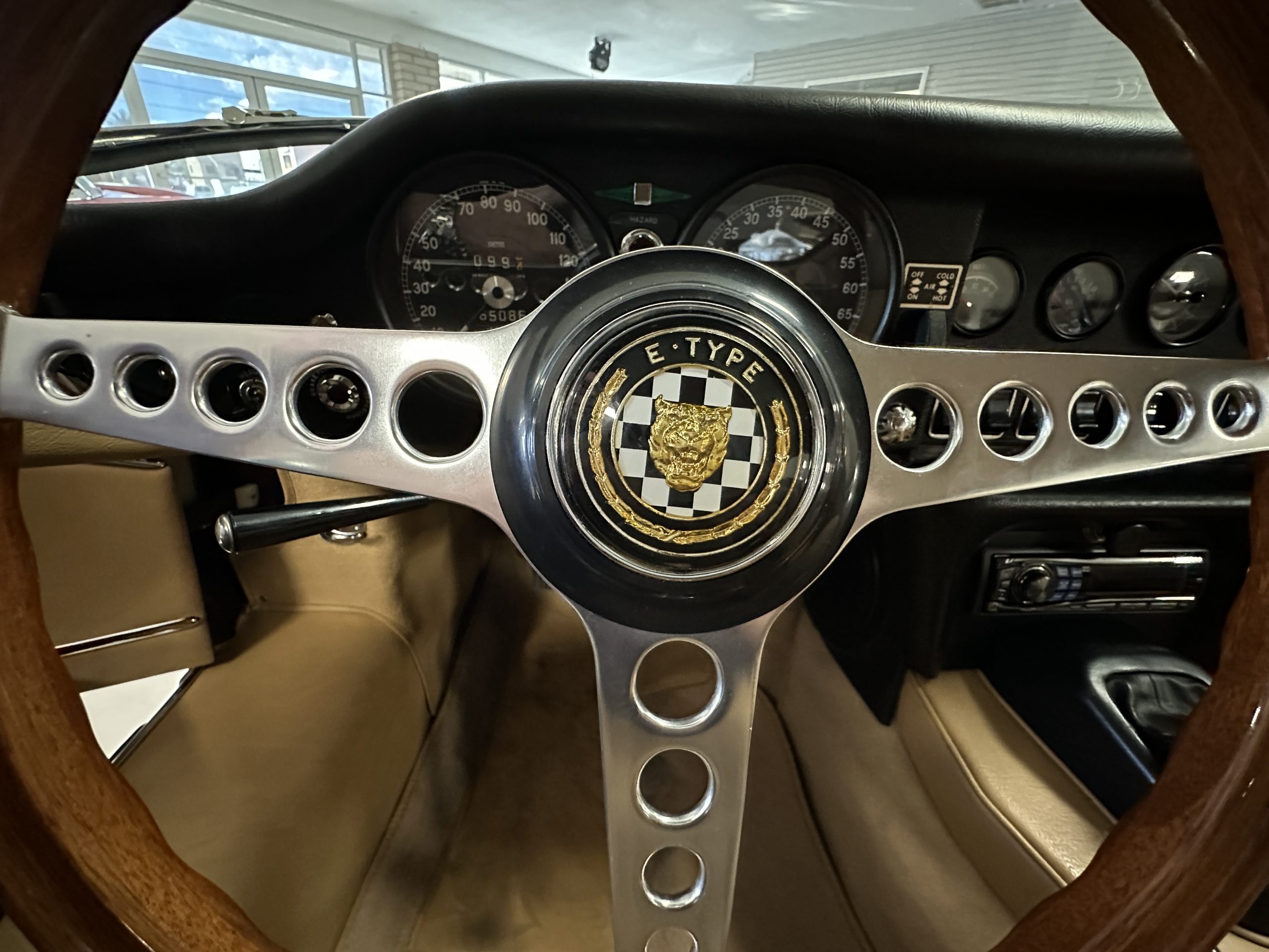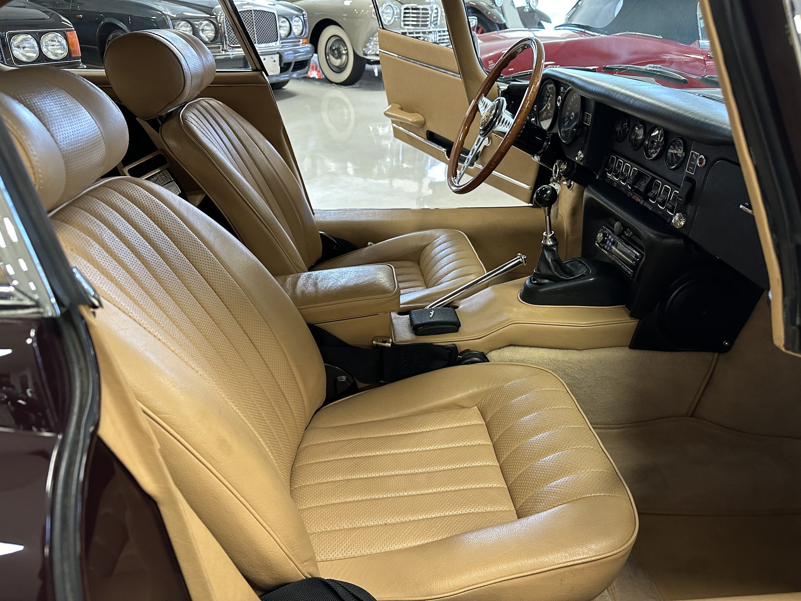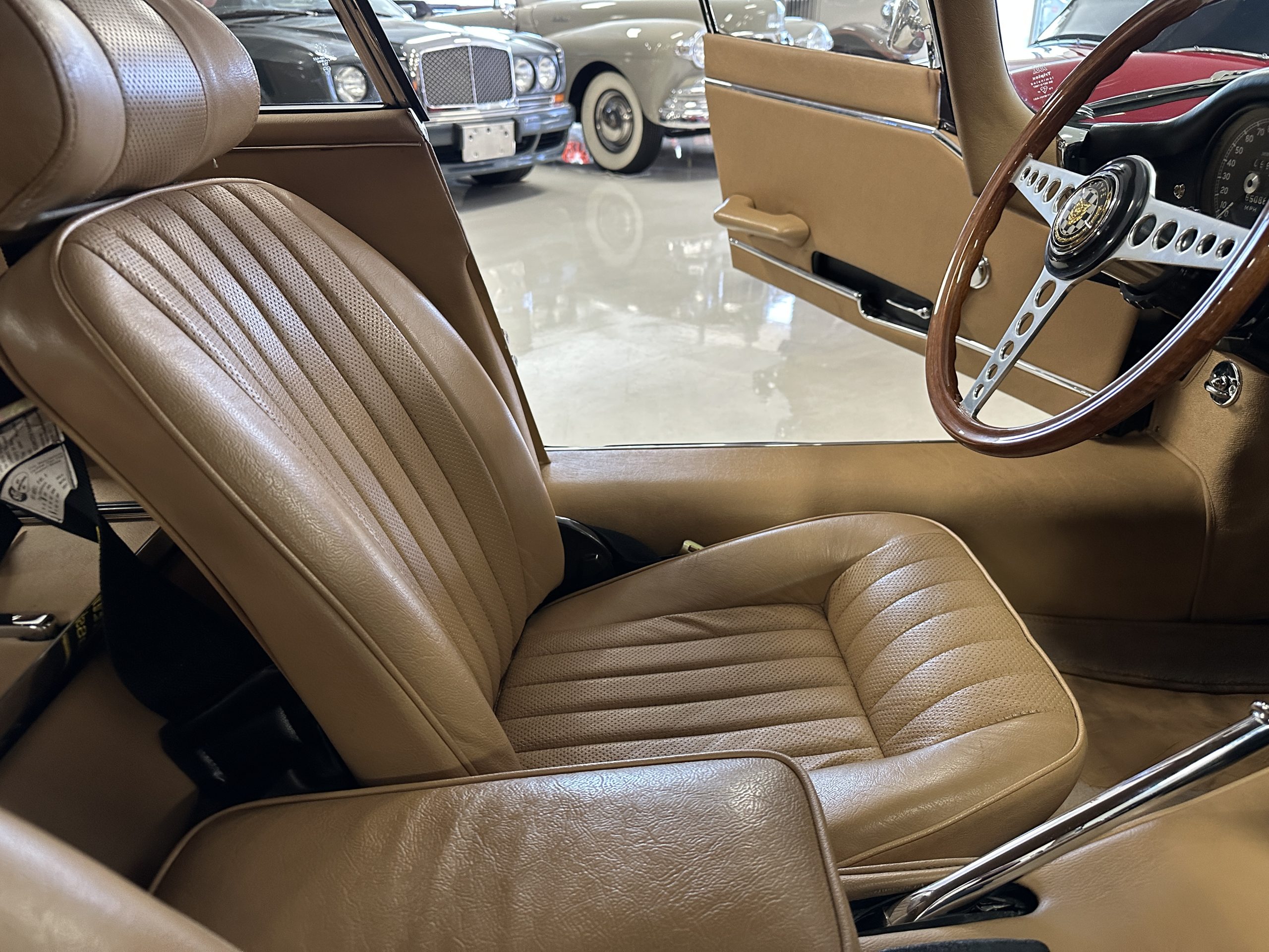 The interior has been refinished in the correct Biscuit Leather and beige wool carpeting. The interior overall is in concours condition today. The black dashboard is in excellent condition and the upgraded Momo wood rimmed steering wheel looks and feels great. The interior upgrades include a 7,000 RPM Jaguar branded tach from a V12 E-Type and a modern Alpine Stereo head unit.