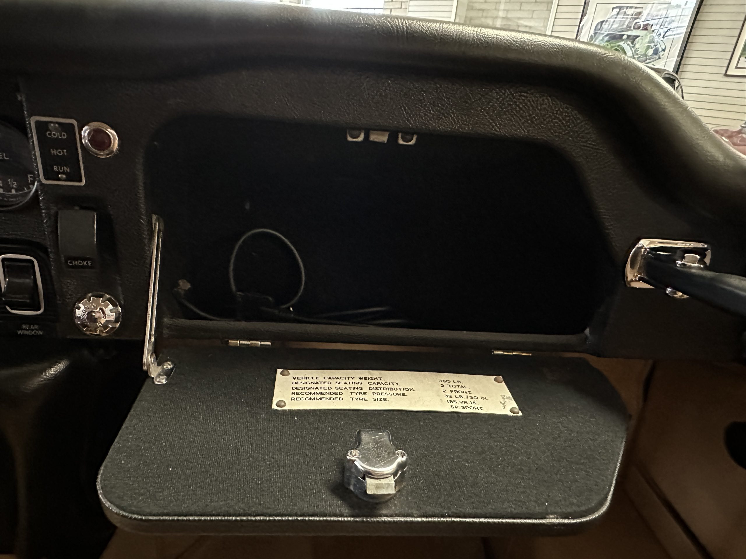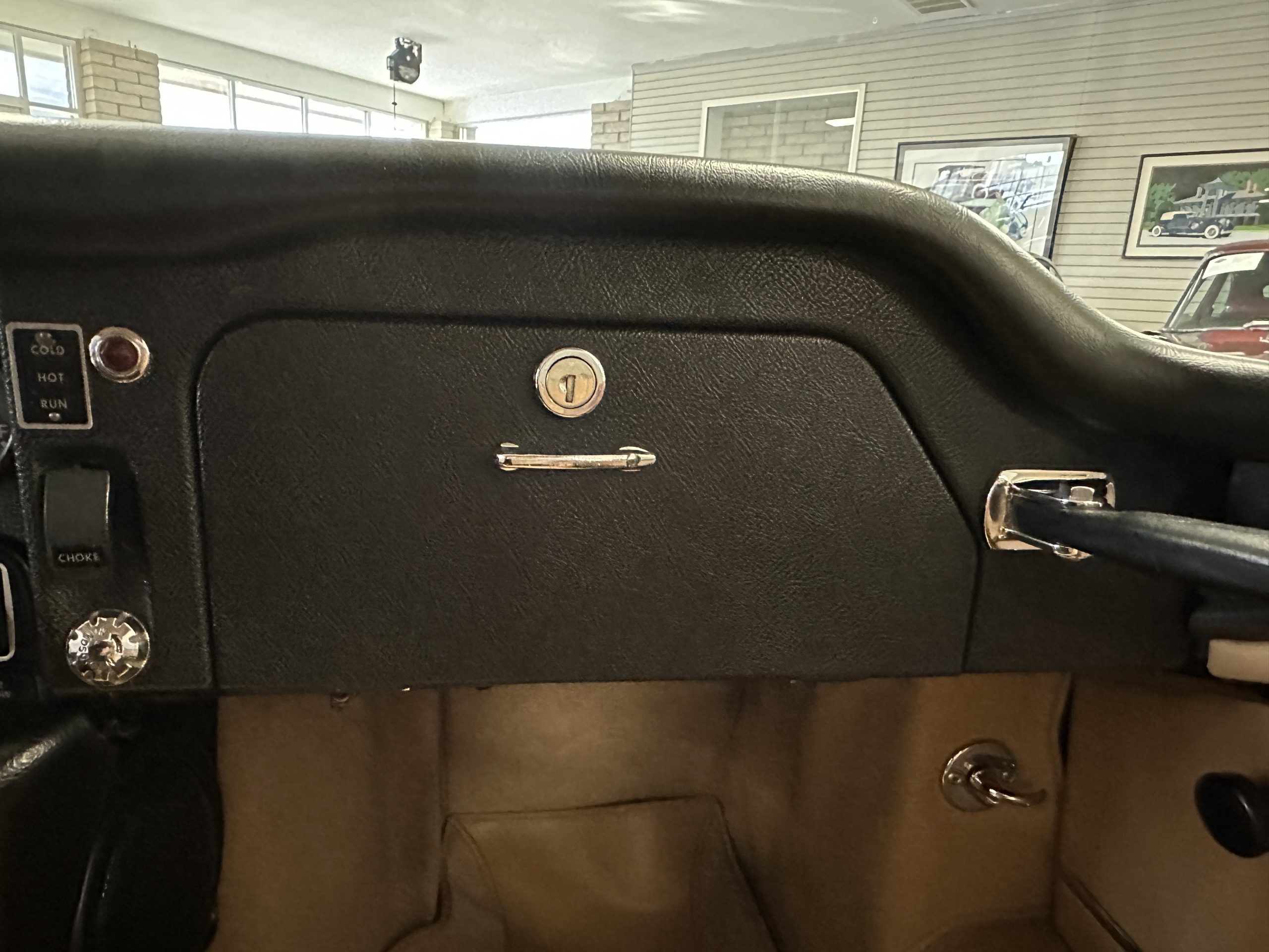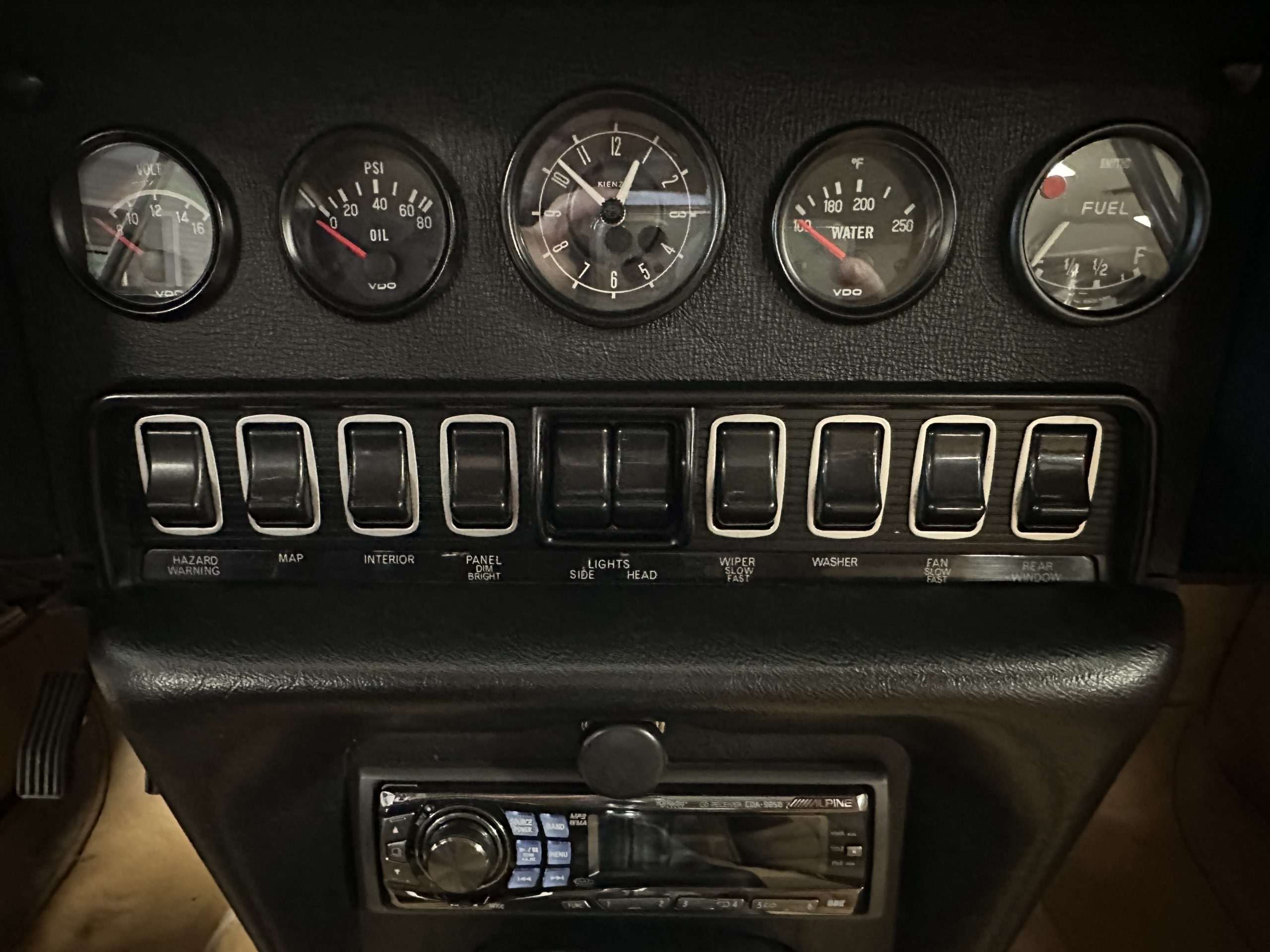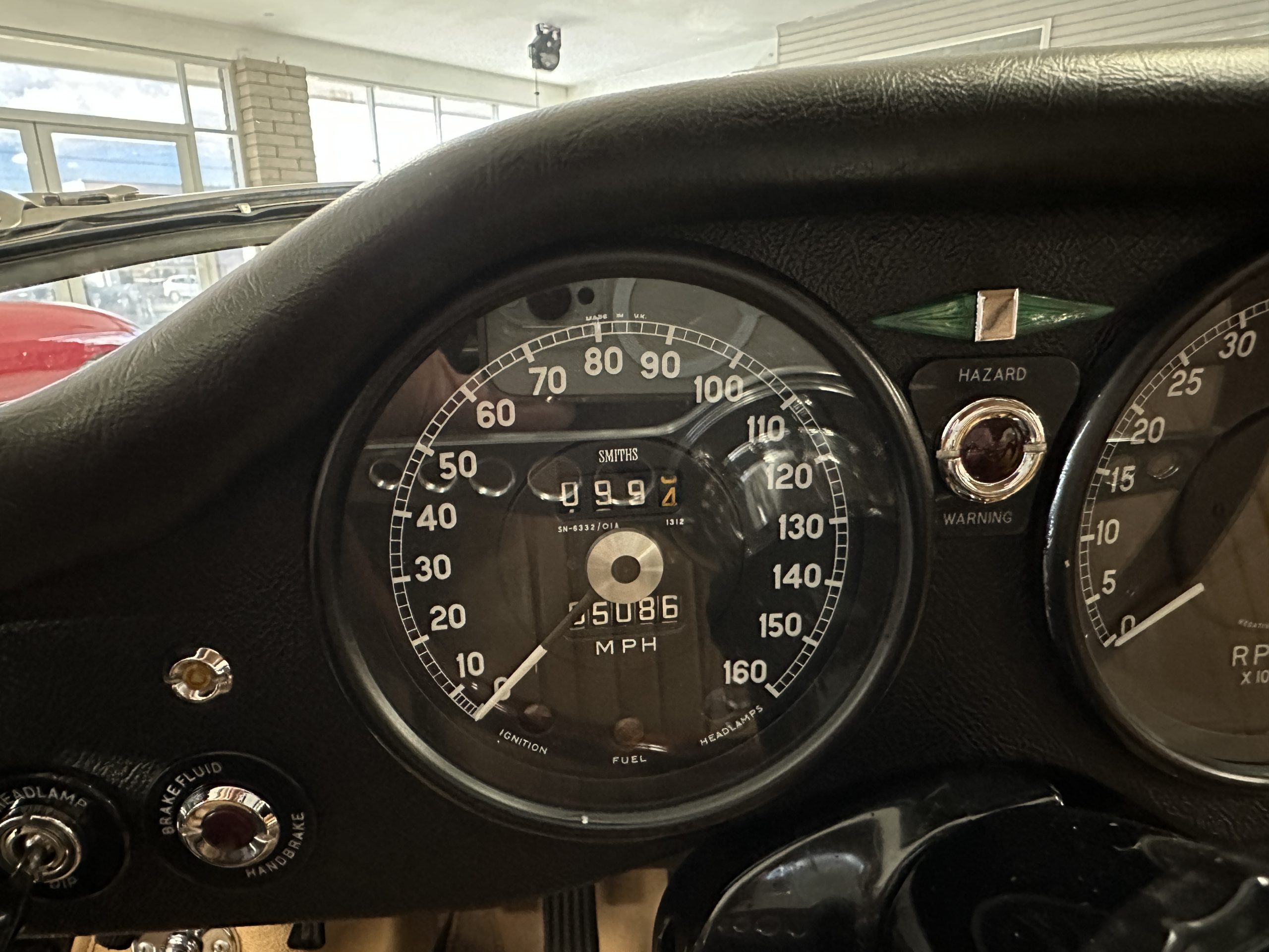 The interior has been refinished in the correct Biscuit Leather and beige wool carpeting. The interior overall is in concours condition today. The black dashboard is in excellent condition and the upgraded Momo wood rimmed steering wheel looks and feels great. The interior upgrades include a 7,000 RPM Jaguar branded tach from a V12 E-Type and a modern Alpine Stereo head unit.