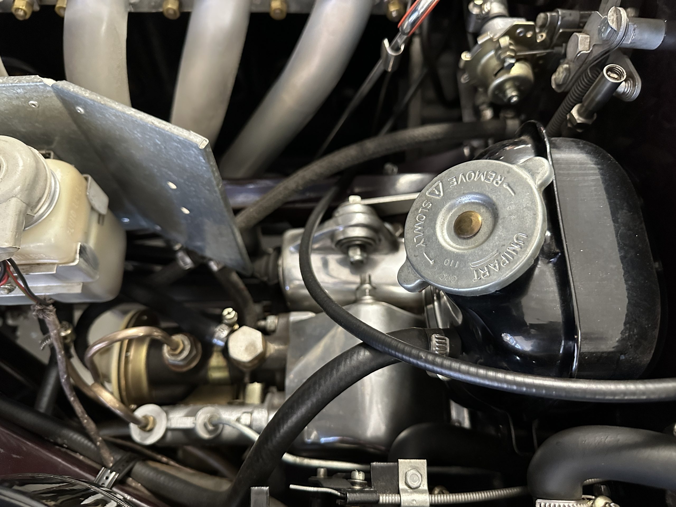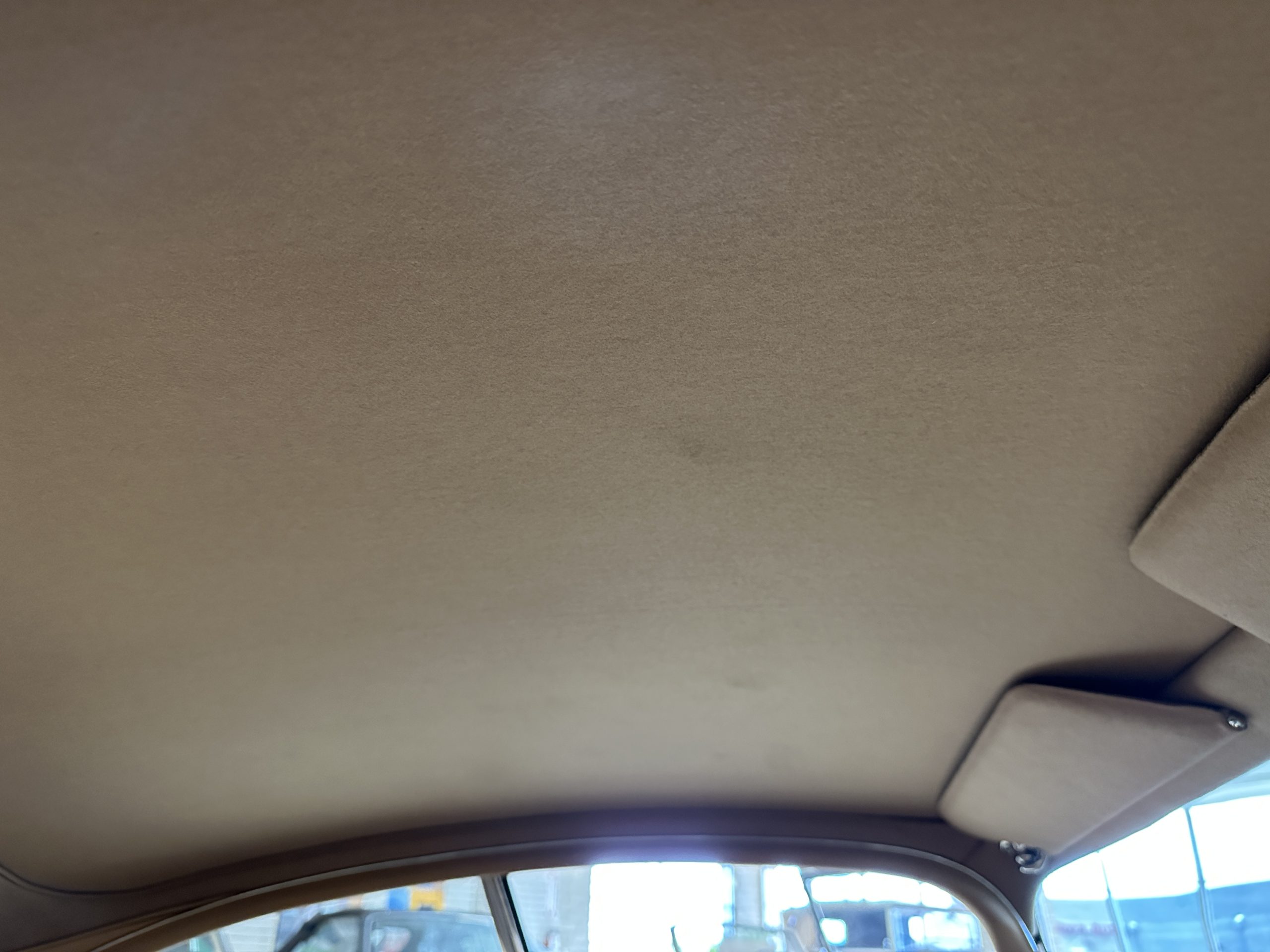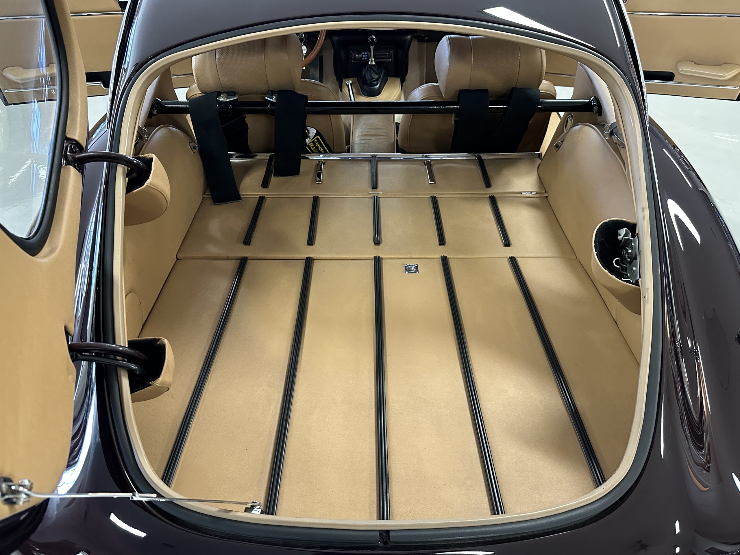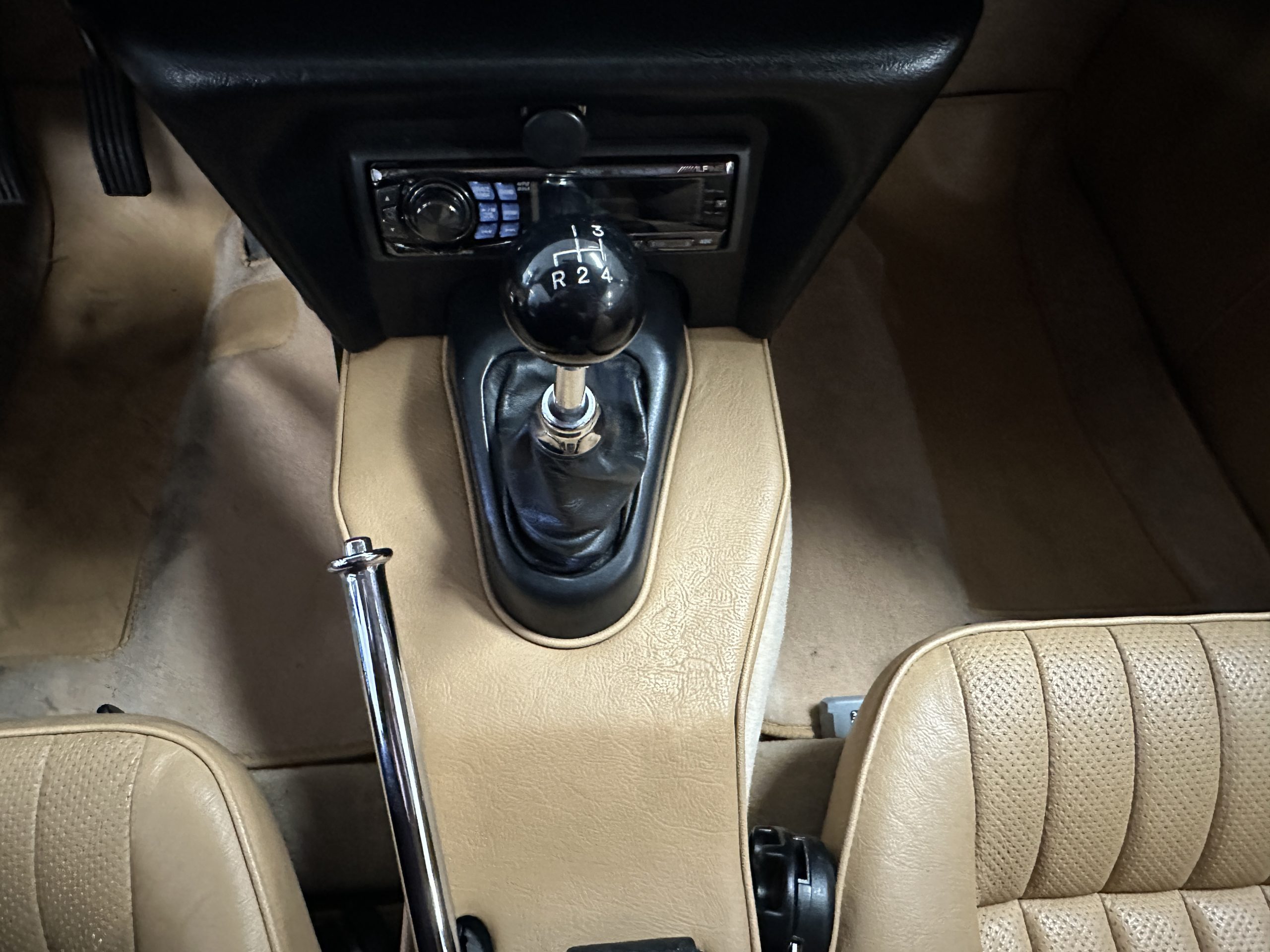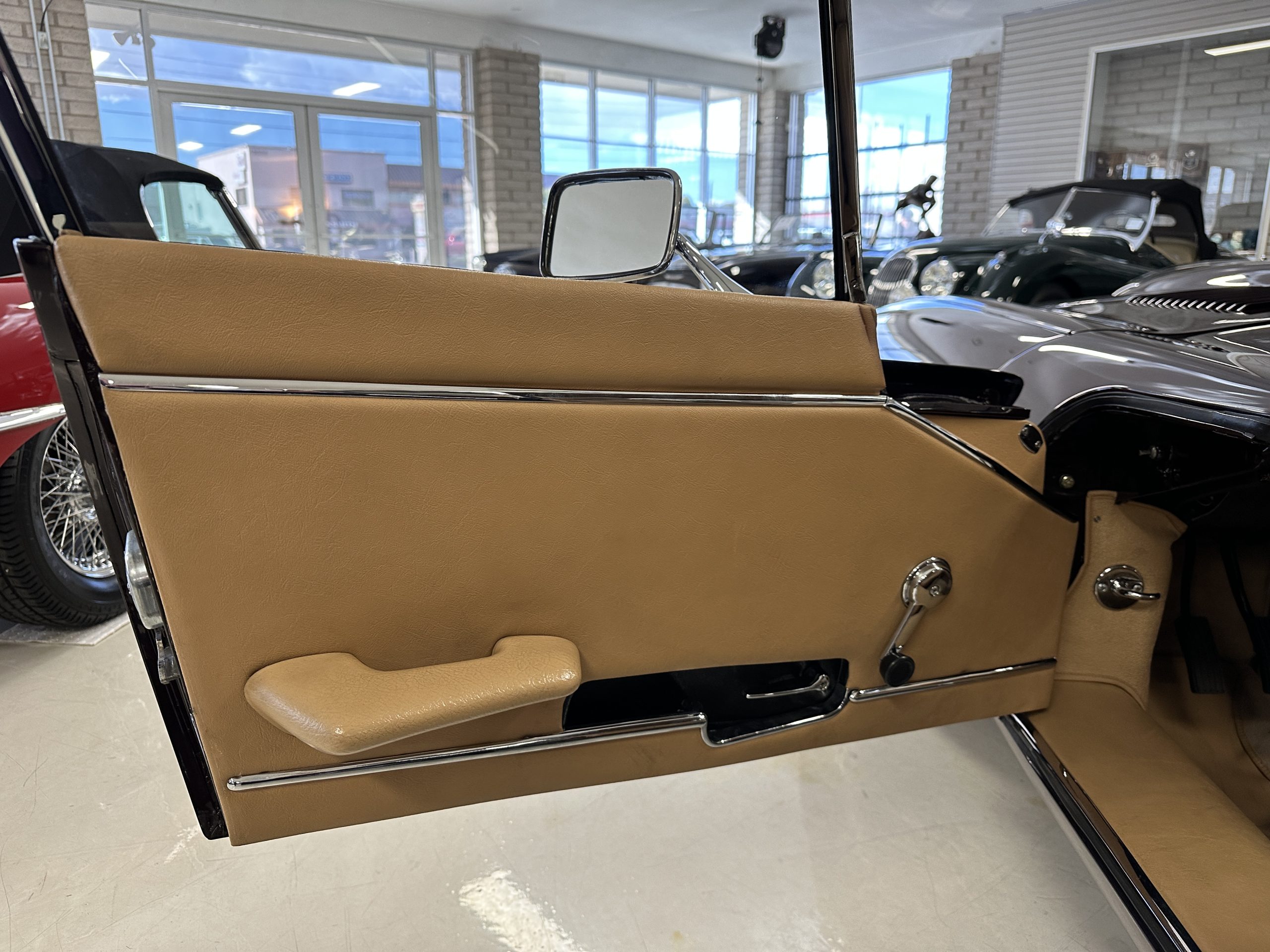 The interior has been refinished in the correct Biscuit Leather and beige wool carpeting. The interior overall is in concours condition today. The black dashboard is in excellent condition and the upgraded Momo wood rimmed steering wheel looks and feels great. The interior upgrades include a 7,000 RPM Jaguar branded tach from a V12 E-Type and a modern Alpine Stereo head unit.