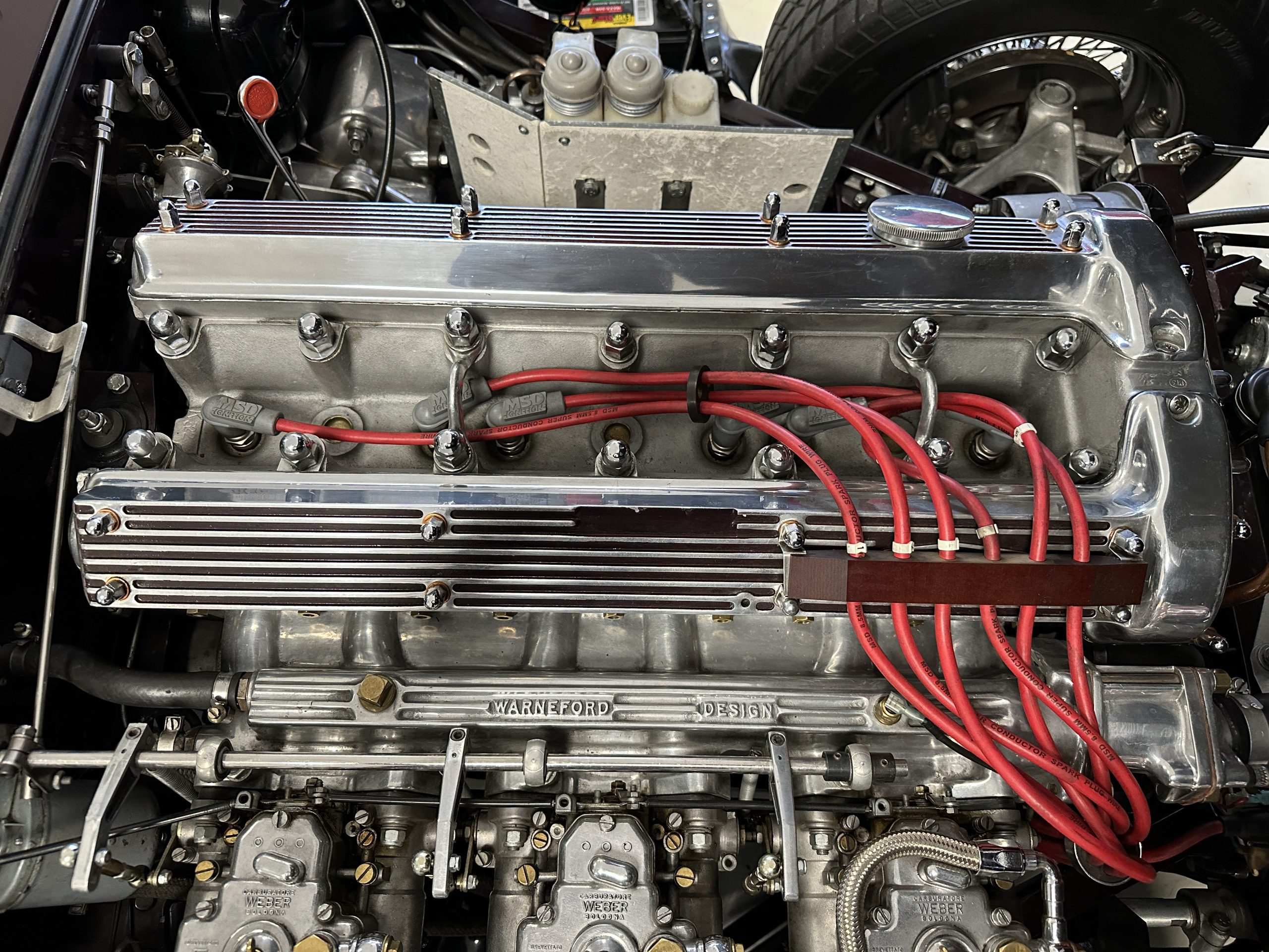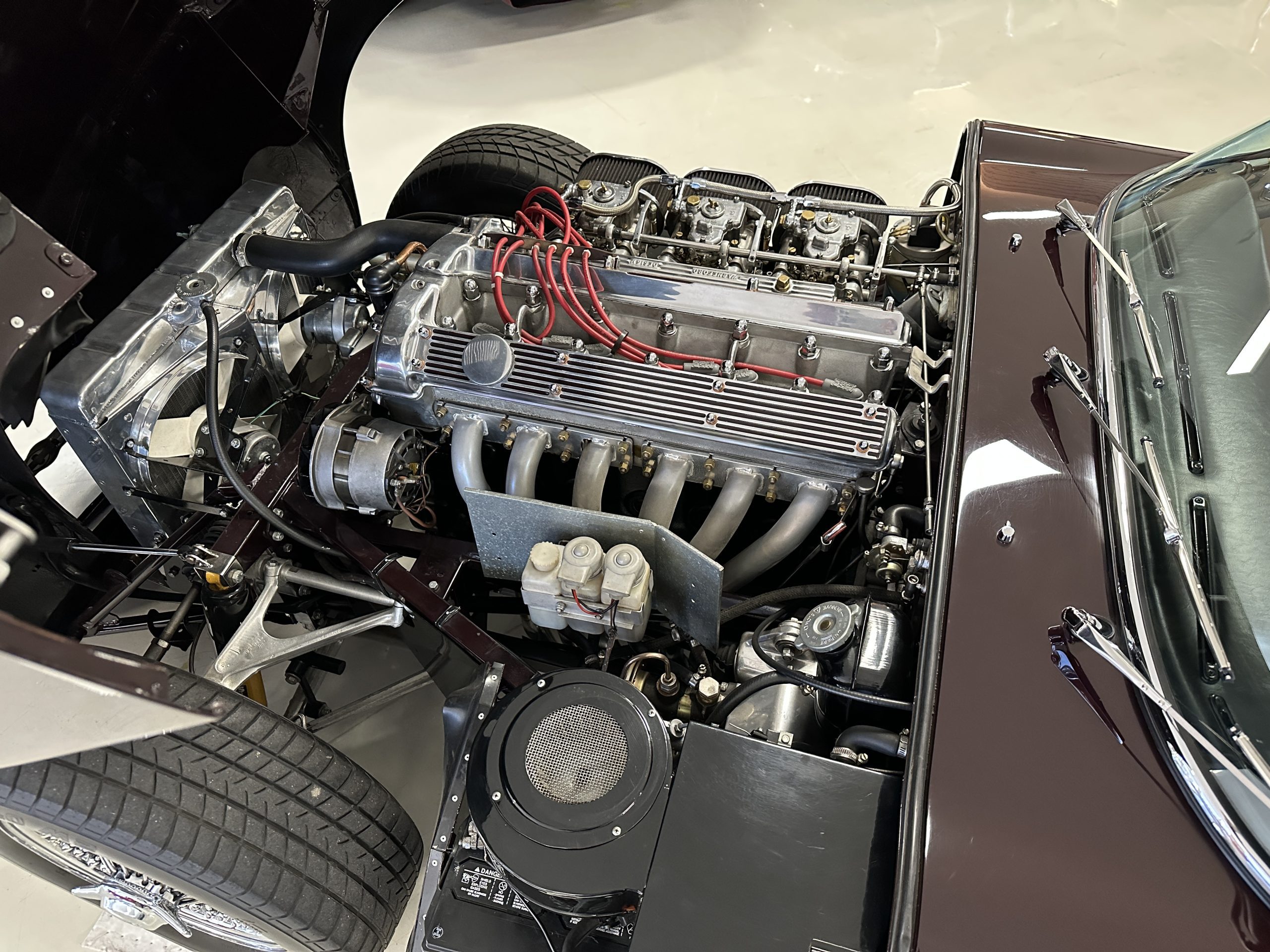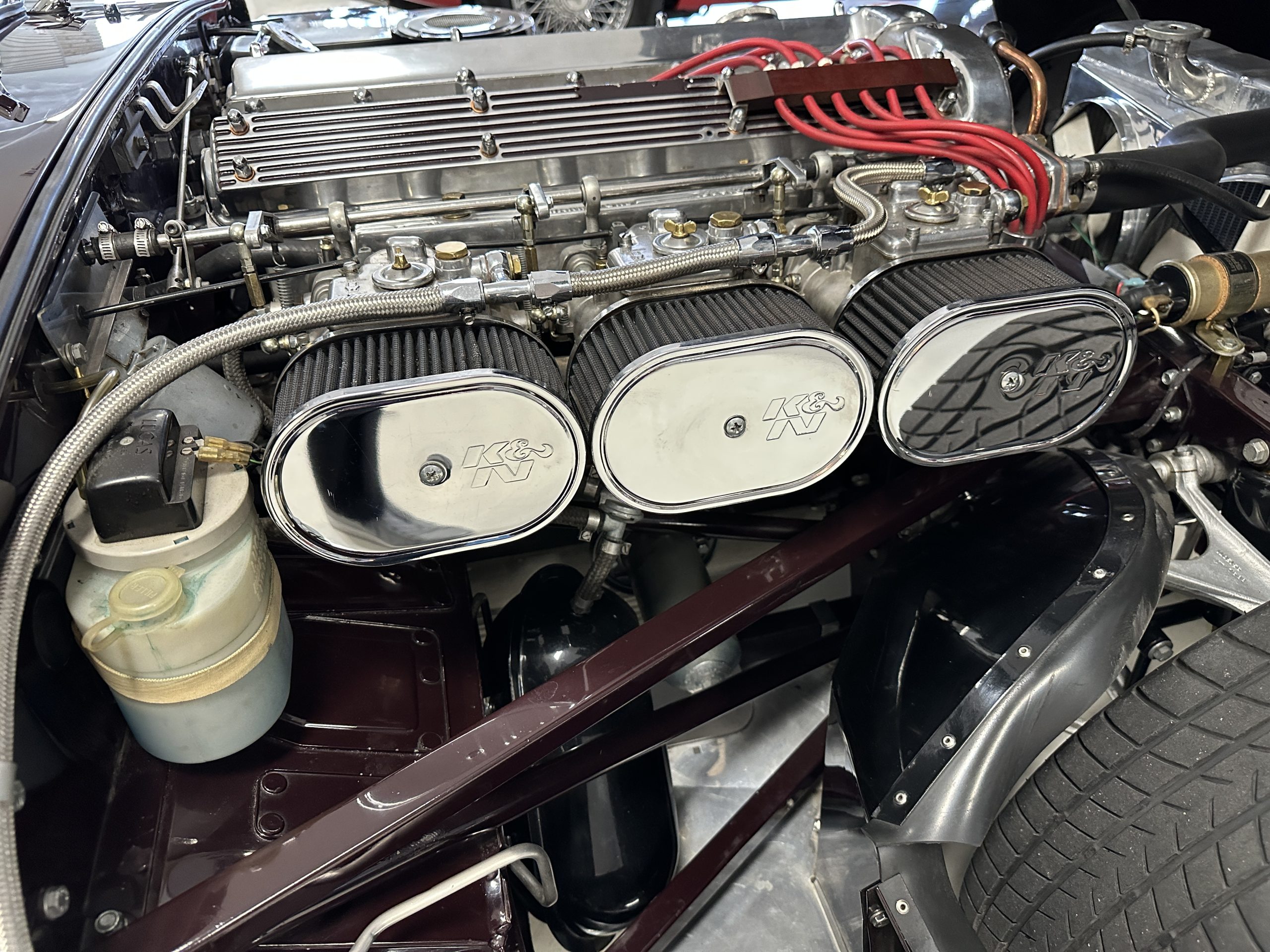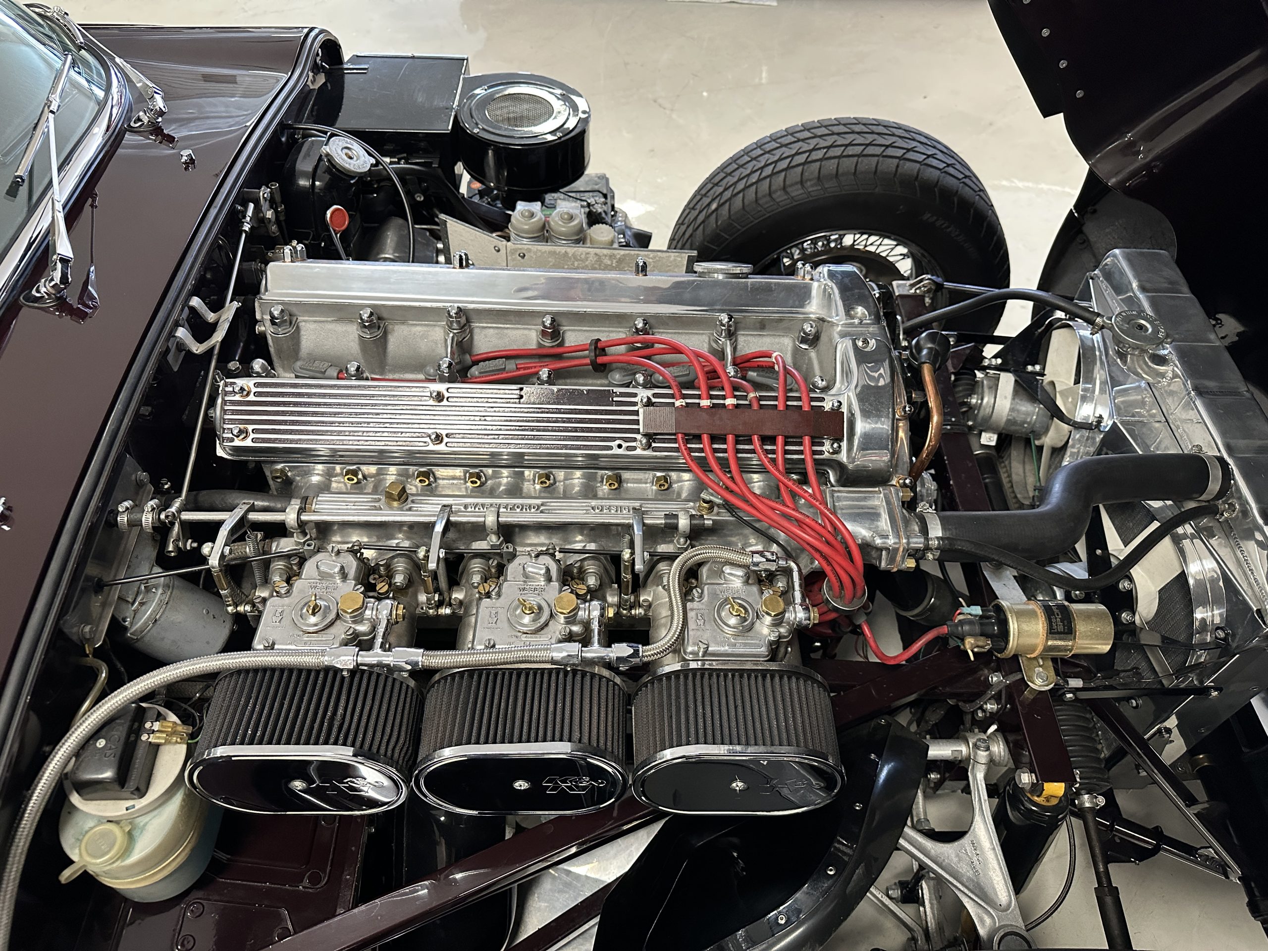 This Jaguar comes with a 4,235cc DOHC inline 6-cylinder big-valve engine with triple Weber 45DCOE carburetors. Its upgrades include the 10:1 high compression Venolia pistons, Isky-reground cams, reworked connecting rods with upgraded hardware, Mallory electronic ignition, brass freeze plugs and much more. A nicely fabricated custom dual-fan aluminum radiator shroud is also worth noting, as are ceramic-coated headers and a full stainless steel exhaust system. The power is transmitted through its 4-speed manual transmission with independent rear suspension. The engine compartment is beautifully detailed and shows very well. The chassis, brakes and suspension components have nearly all been upgraded for higher performance. This Jaguars undercarriage is also very well detailed and is in overall show condition.