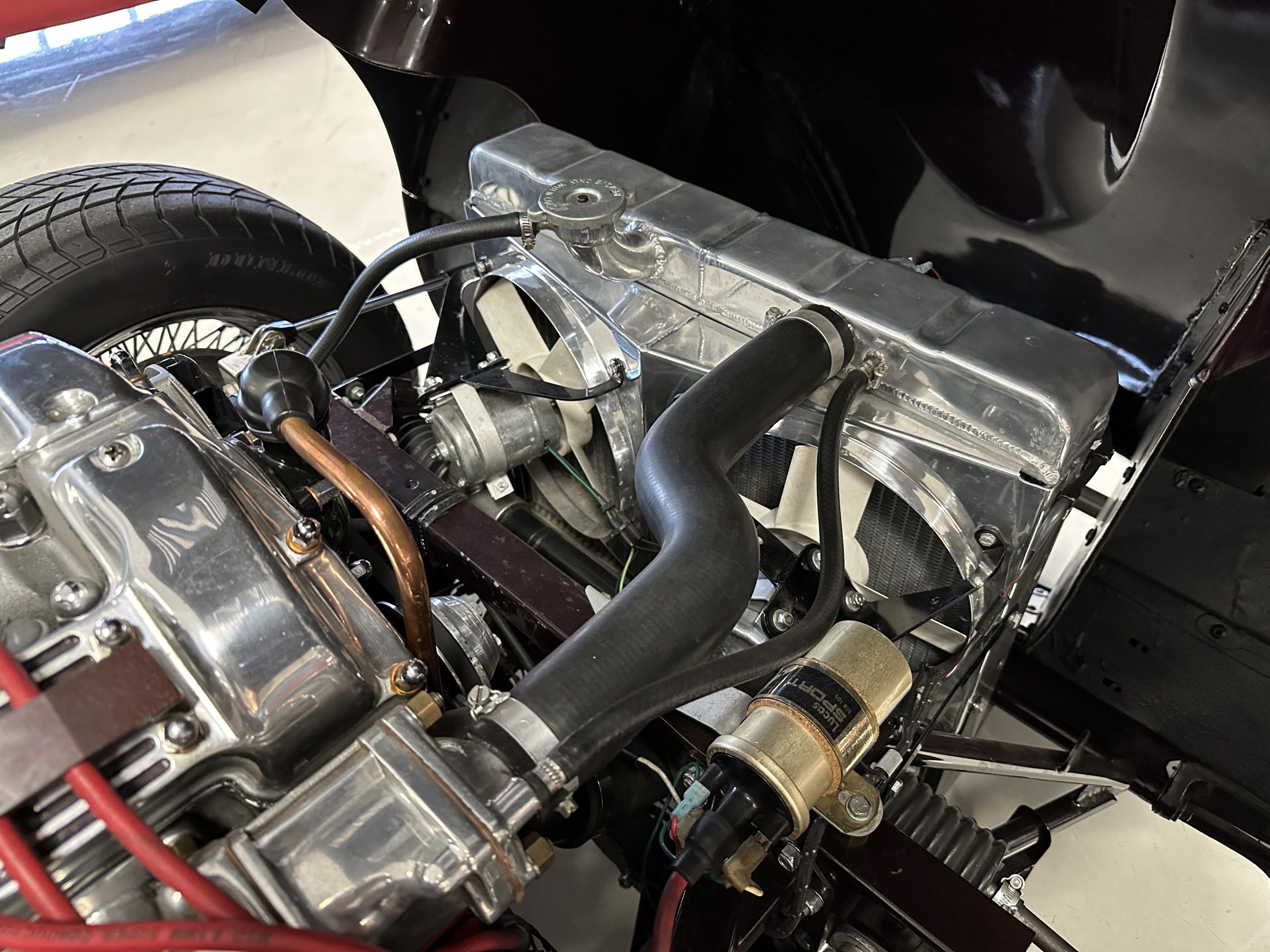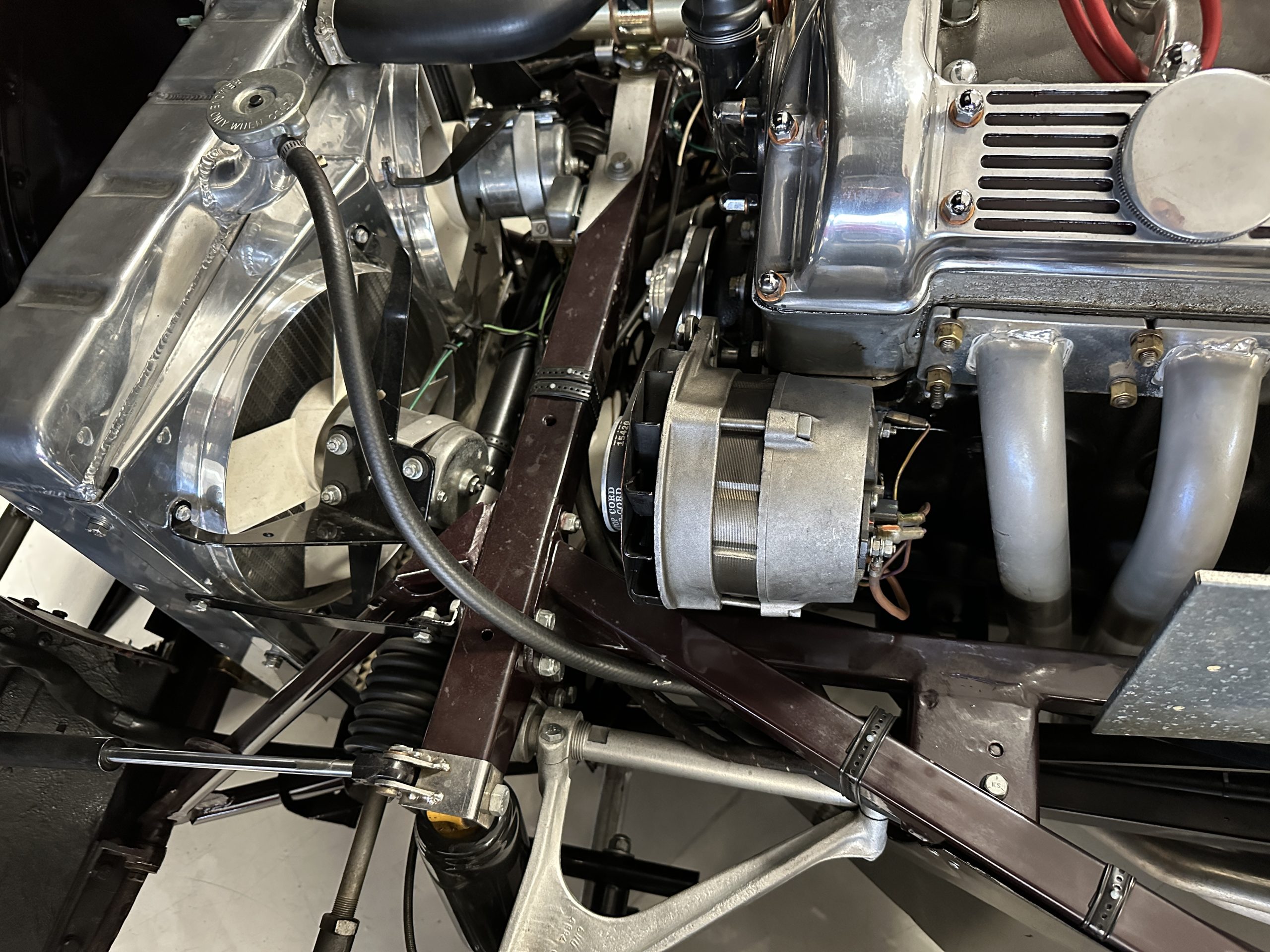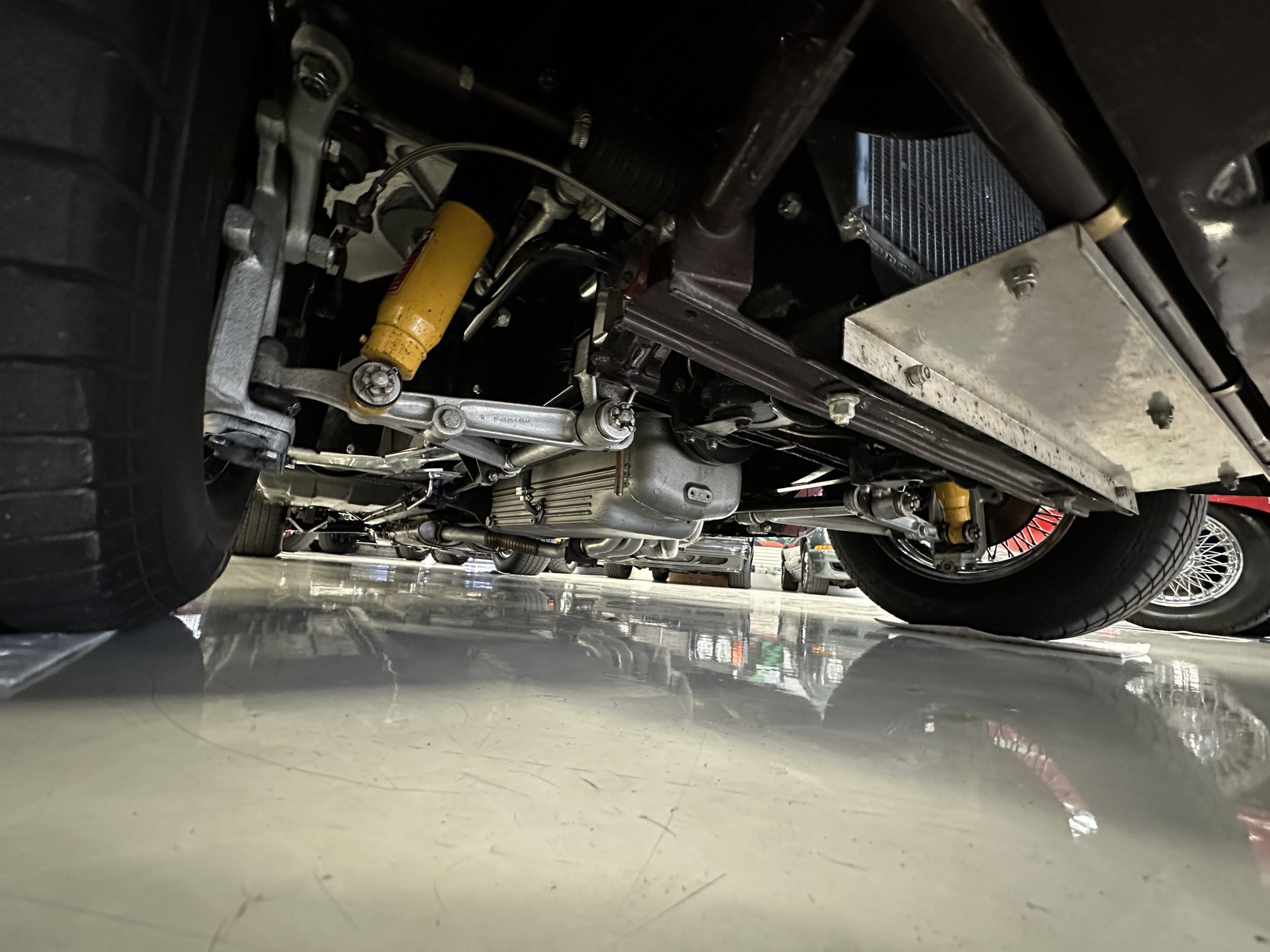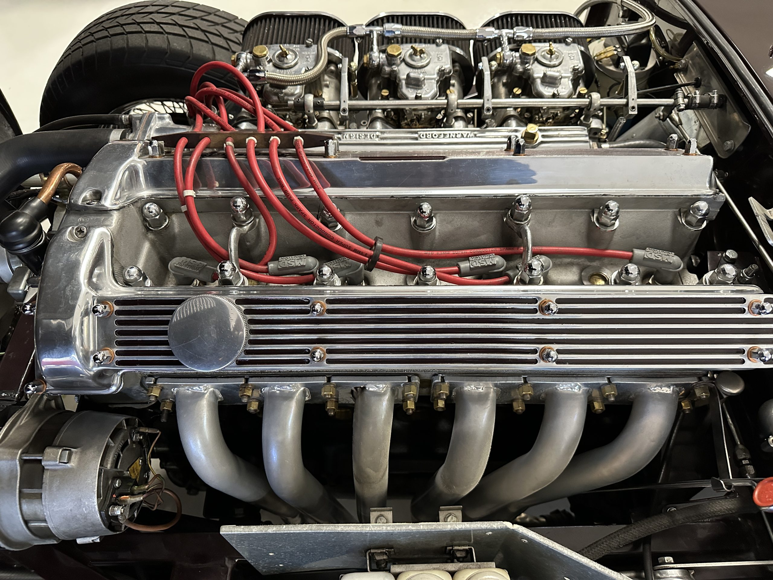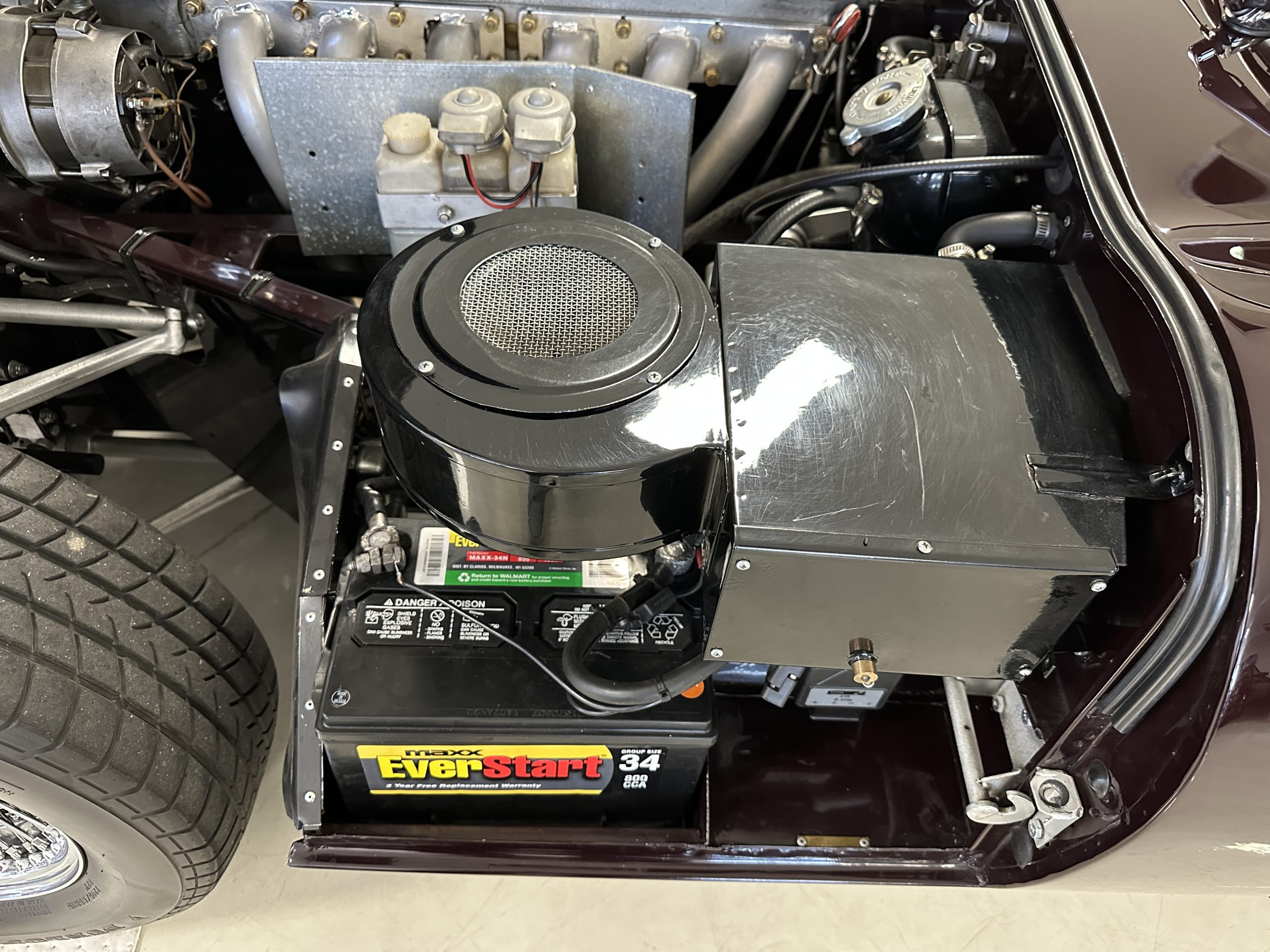 This Jaguar comes with a 4,235cc DOHC inline 6-cylinder big-valve engine with triple Weber 45DCOE carburetors. Its upgrades include the 10:1 high compression Venolia pistons, Isky-reground cams, reworked connecting rods with upgraded hardware, Mallory electronic ignition, brass freeze plugs and much more. A nicely fabricated custom dual-fan aluminum radiator shroud is also worth noting, as are ceramic-coated headers and a full stainless steel exhaust system. The power is transmitted through its 4-speed manual transmission with independent rear suspension. The engine compartment is beautifully detailed and shows very well. The chassis, brakes and suspension components have nearly all been upgraded for higher performance. This Jaguars undercarriage is also very well detailed and is in overall show condition.