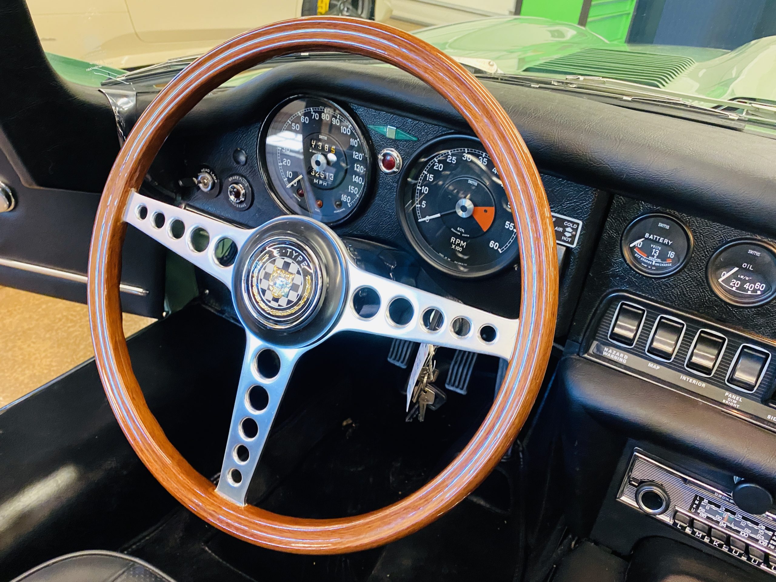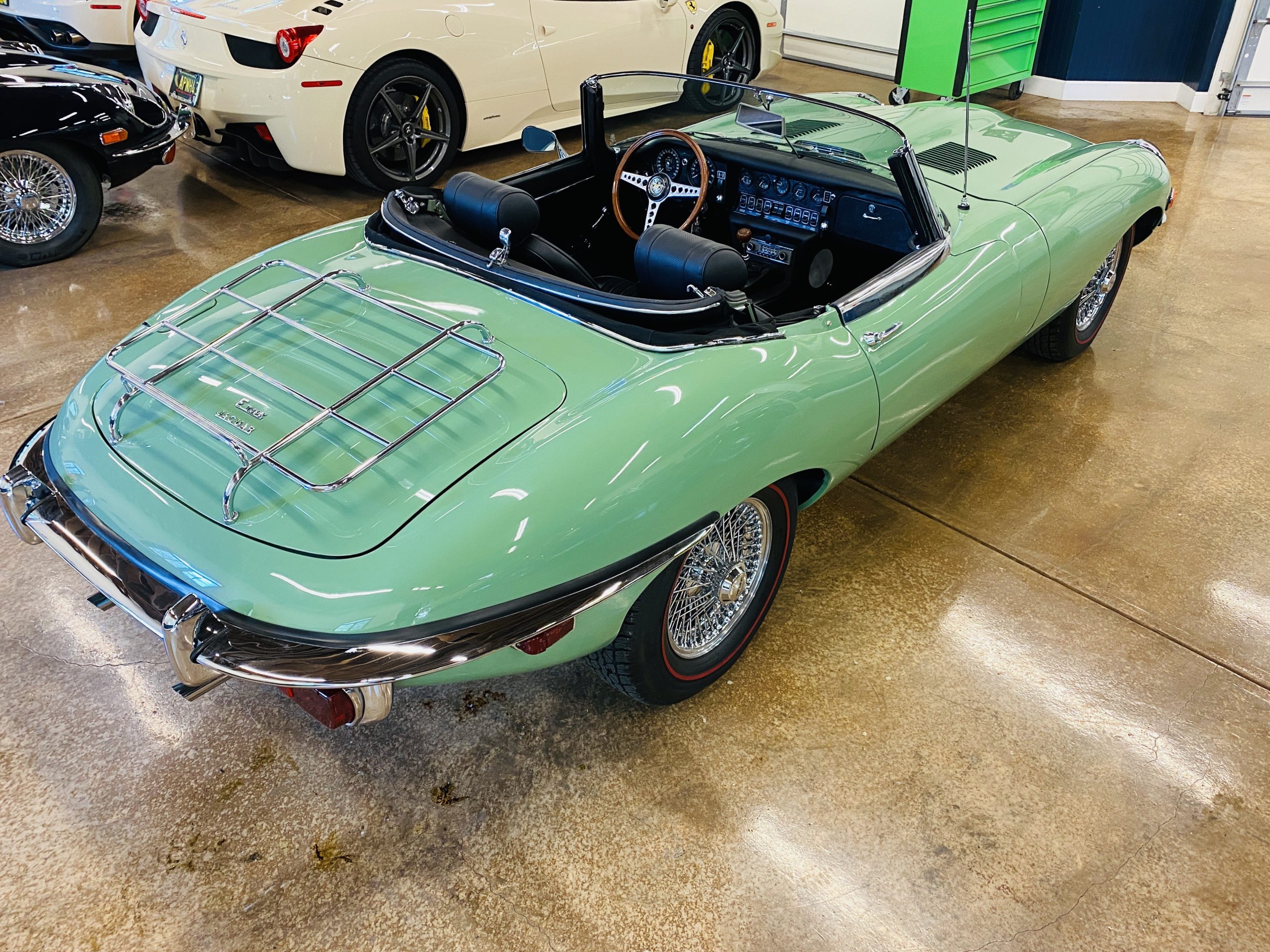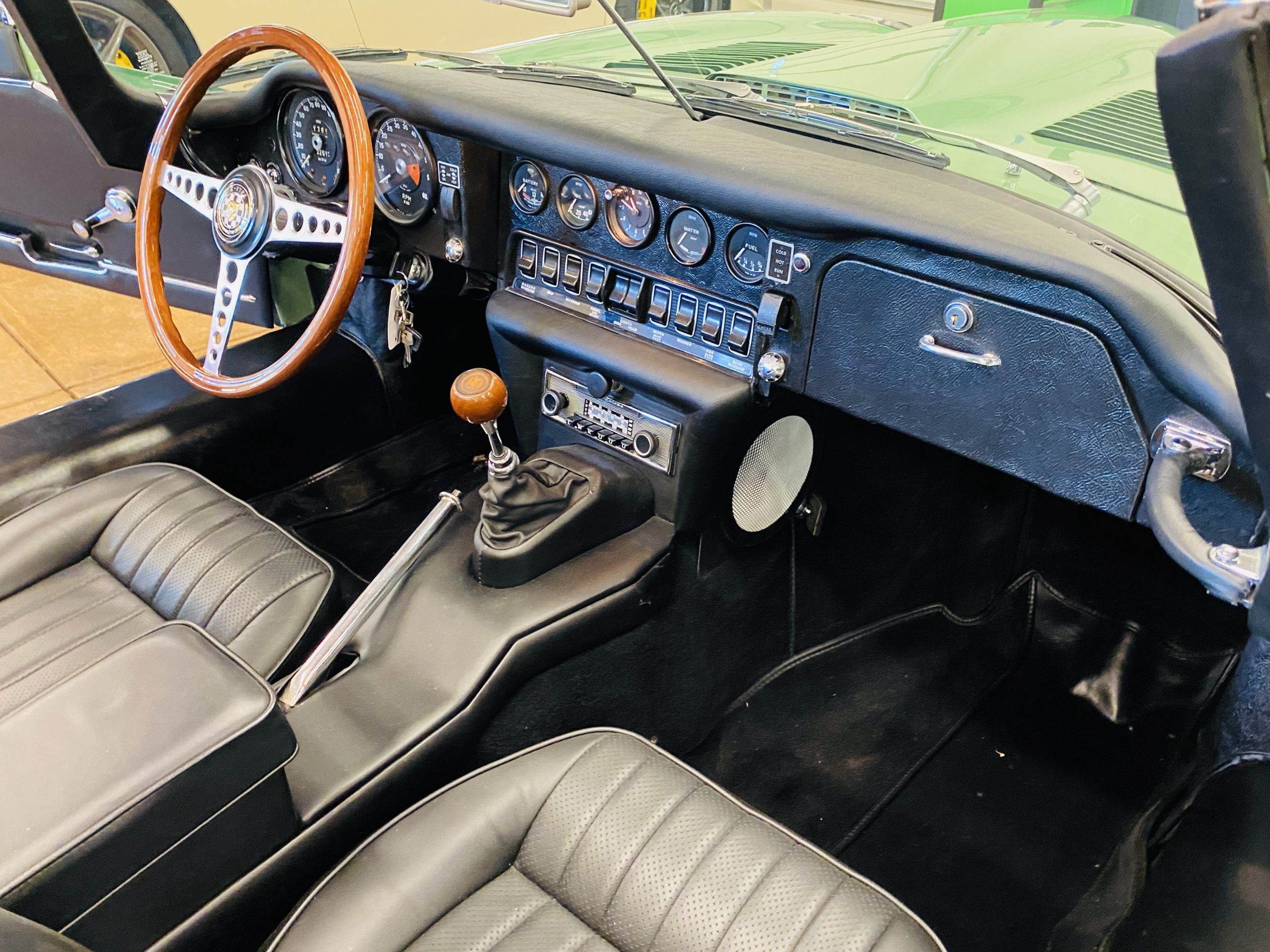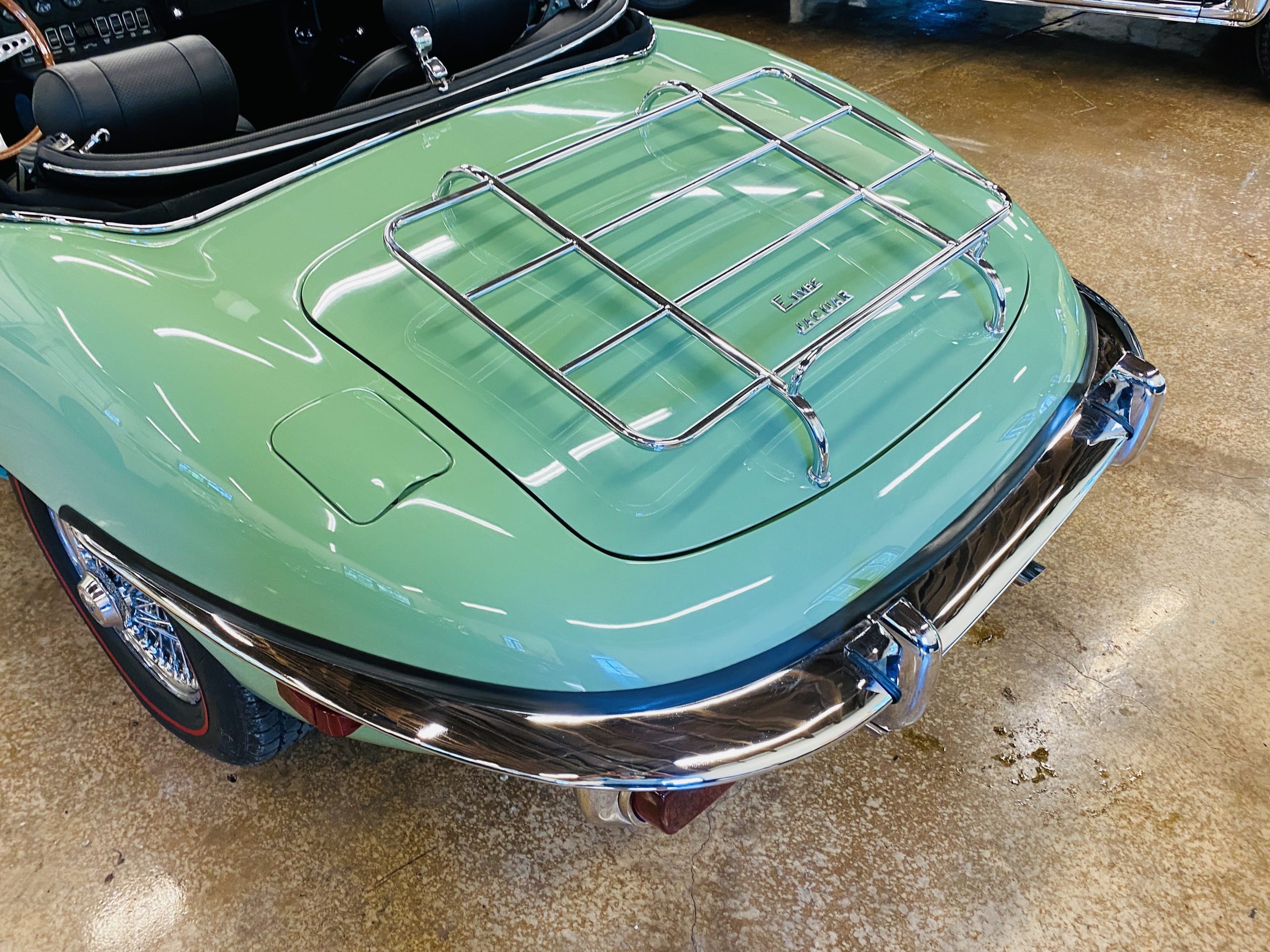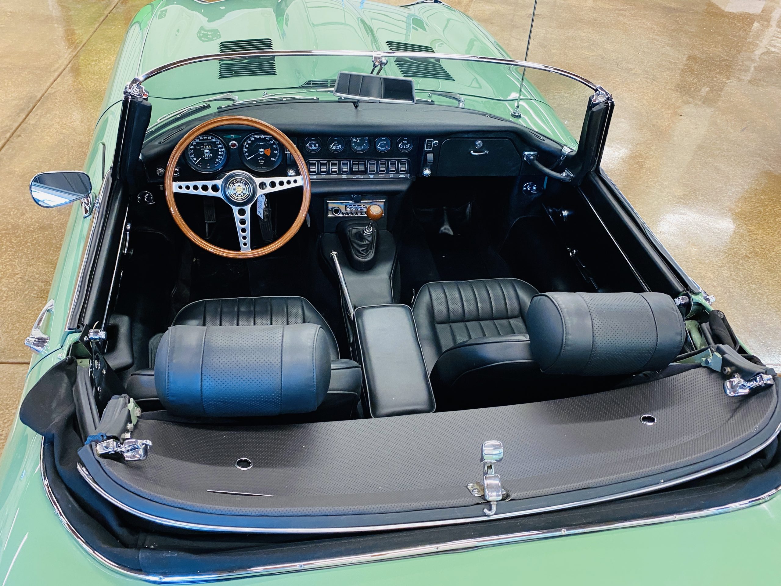 This E-Type has been beautifully finished in Willow Green and has the chrome wire wheels, giving it a spectacular look. The paint, chrome and all the finish work are all in excellent condition. This is ready to be competitive at concours events.