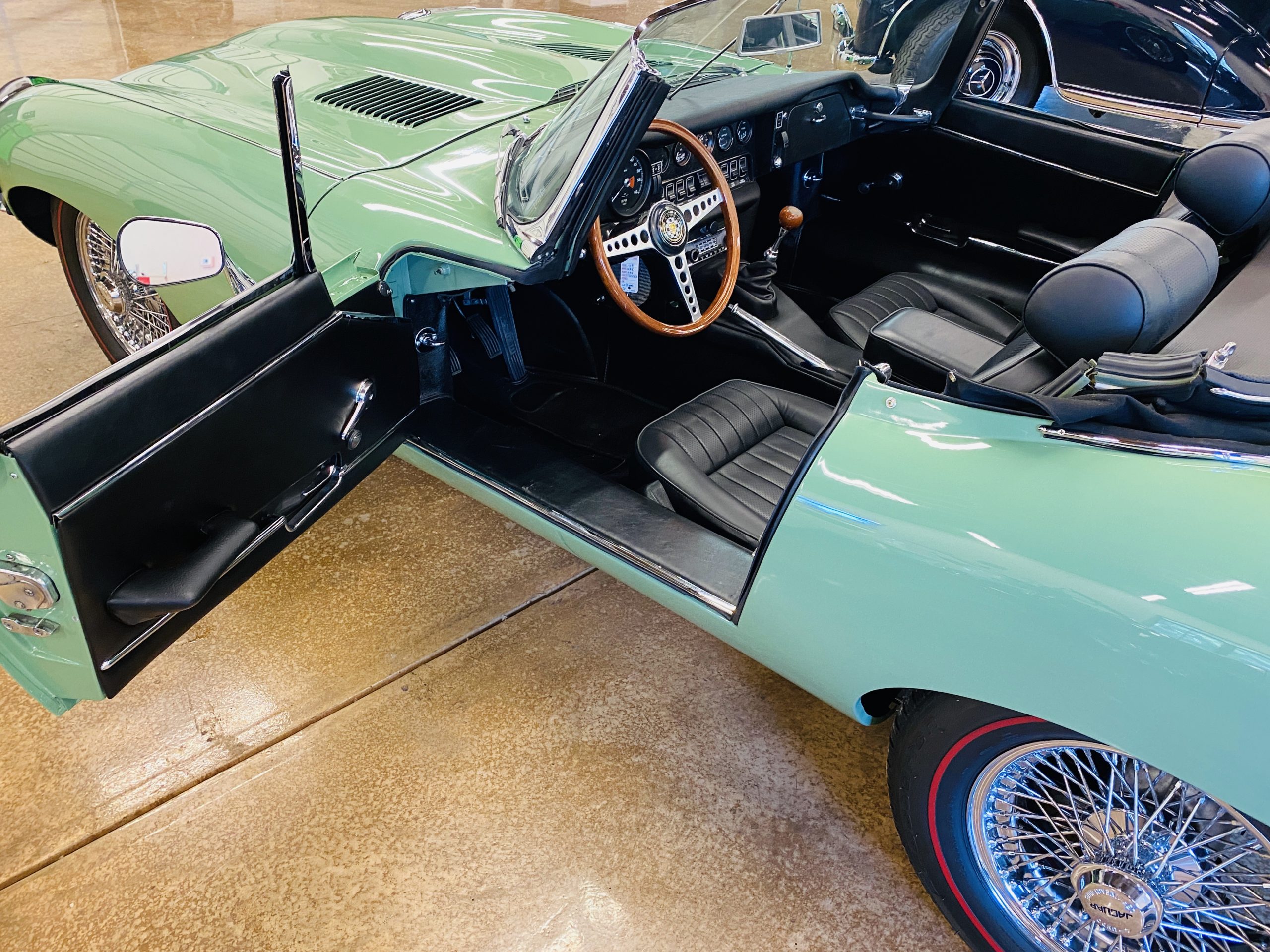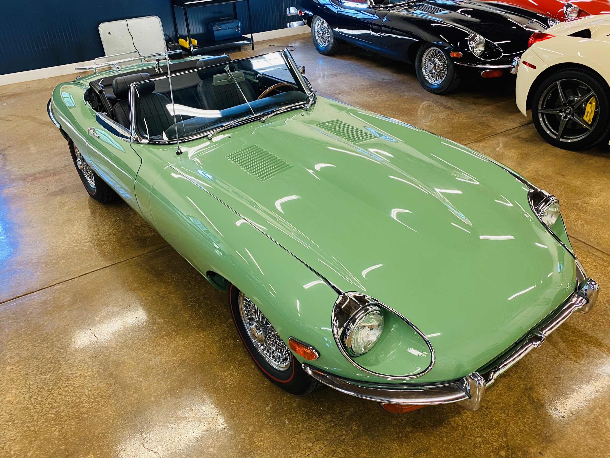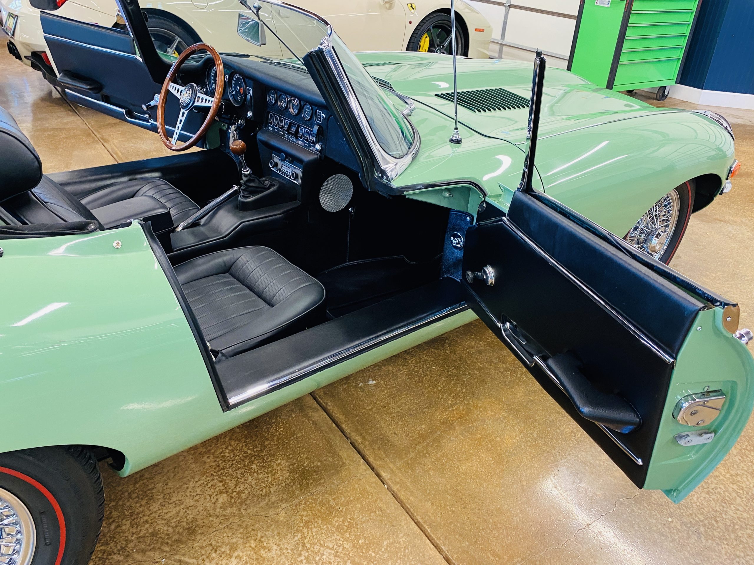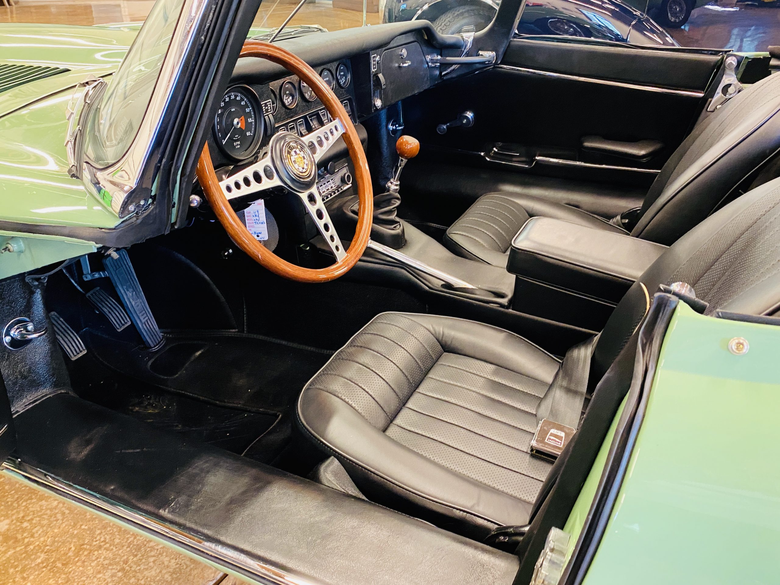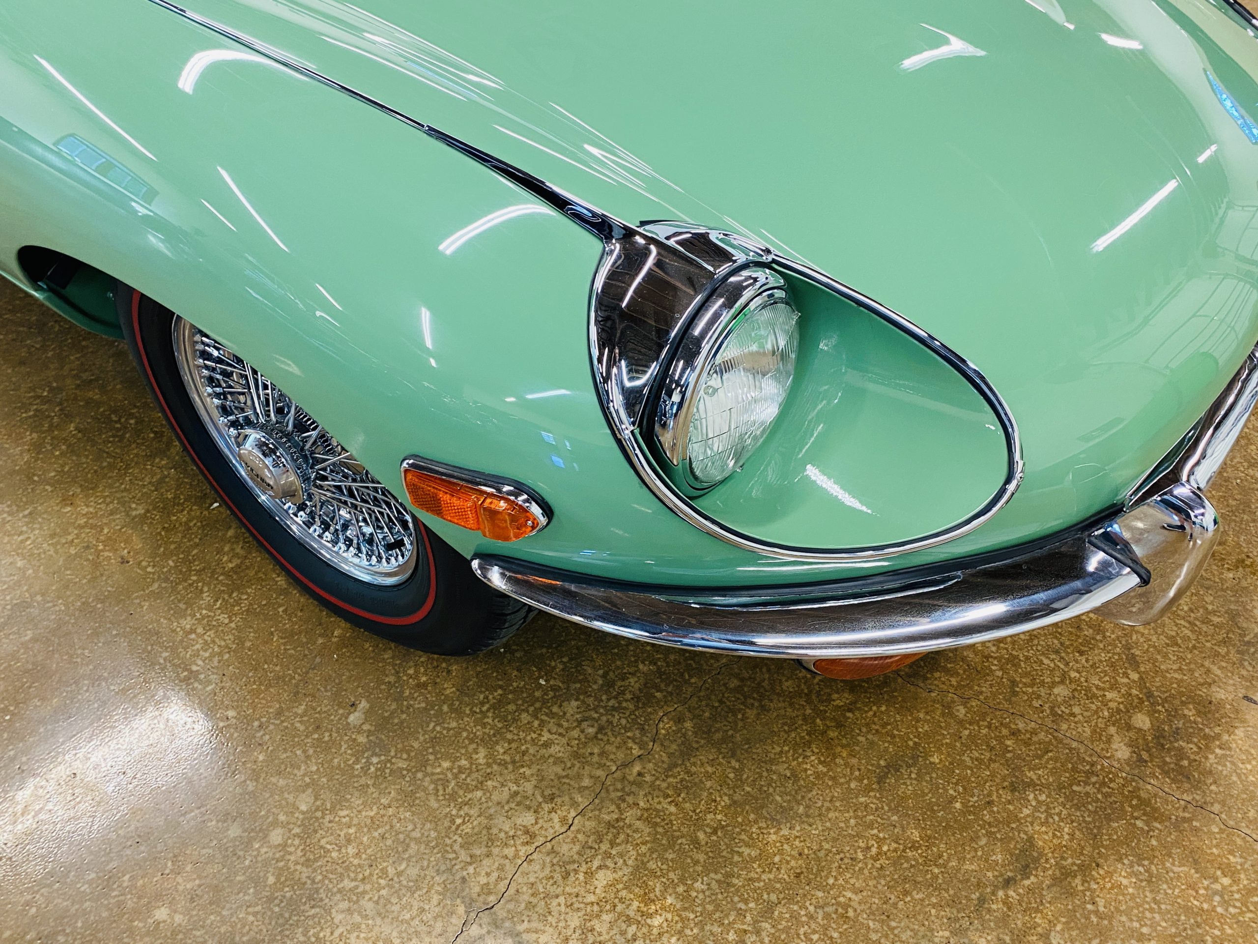 This E-Type has been beautifully finished in Willow Green and has the chrome wire wheels, giving it a spectacular look. The paint, chrome and all the finish work are all in excellent condition. This is ready to be competitive at concours events.