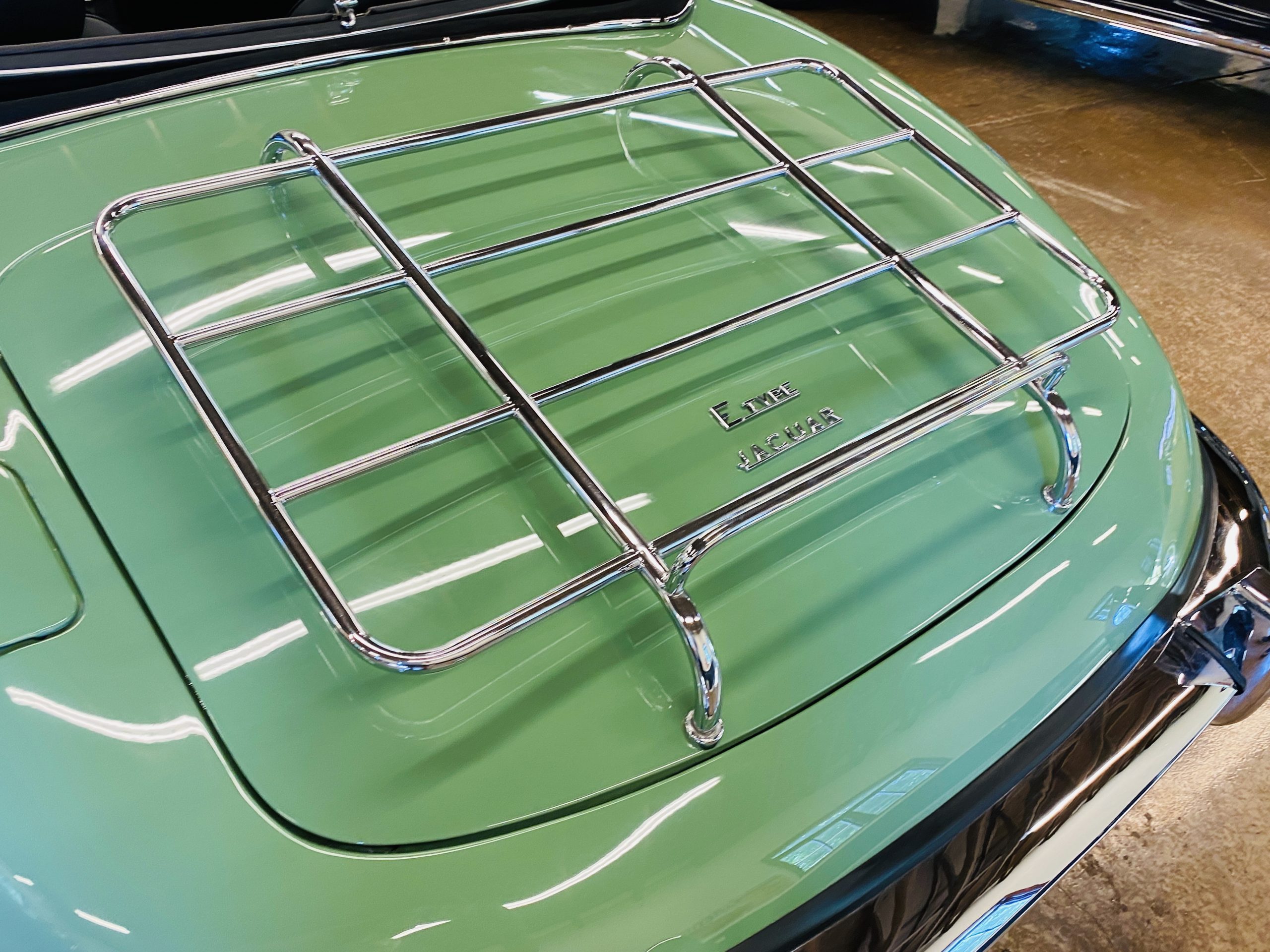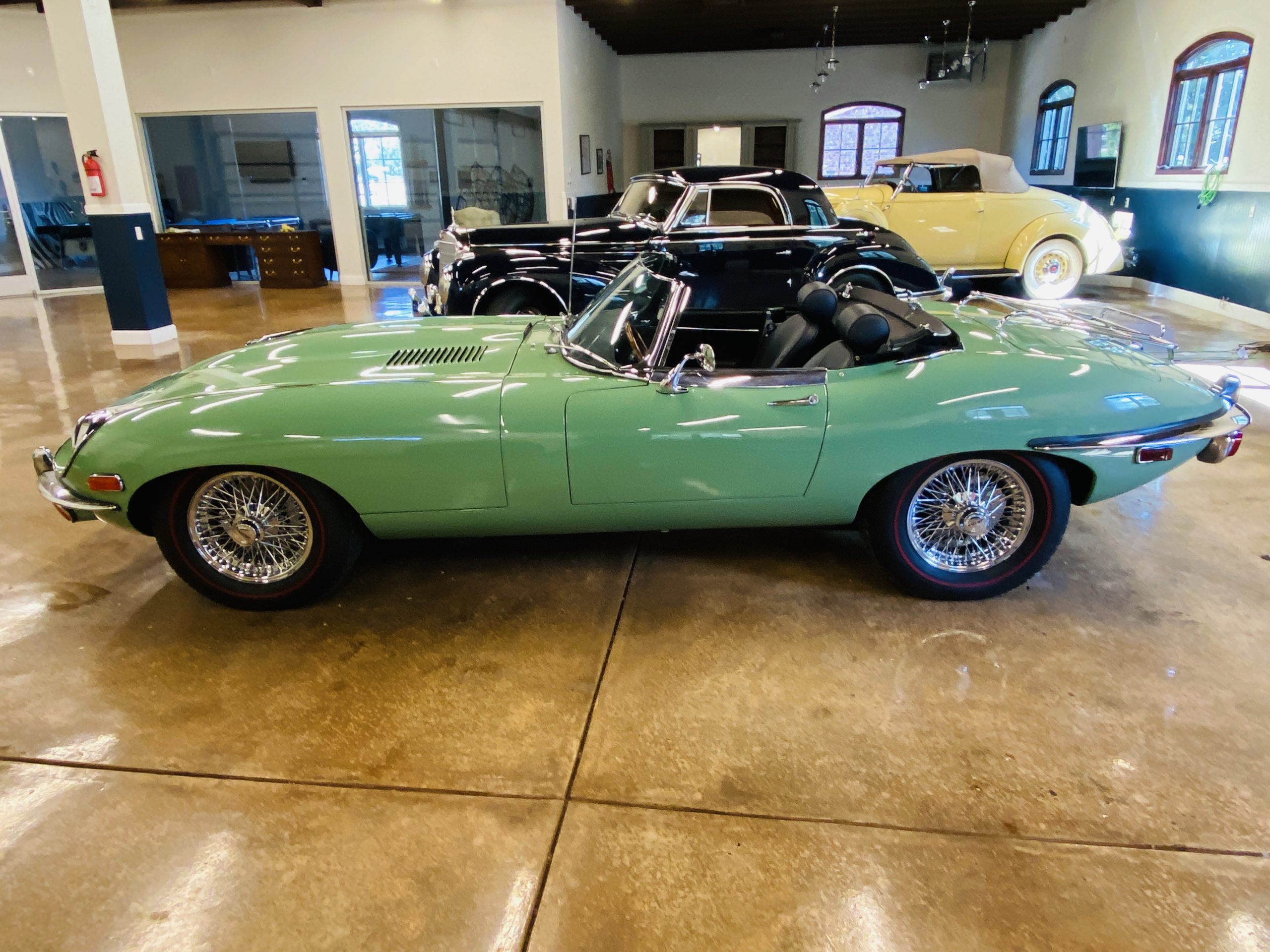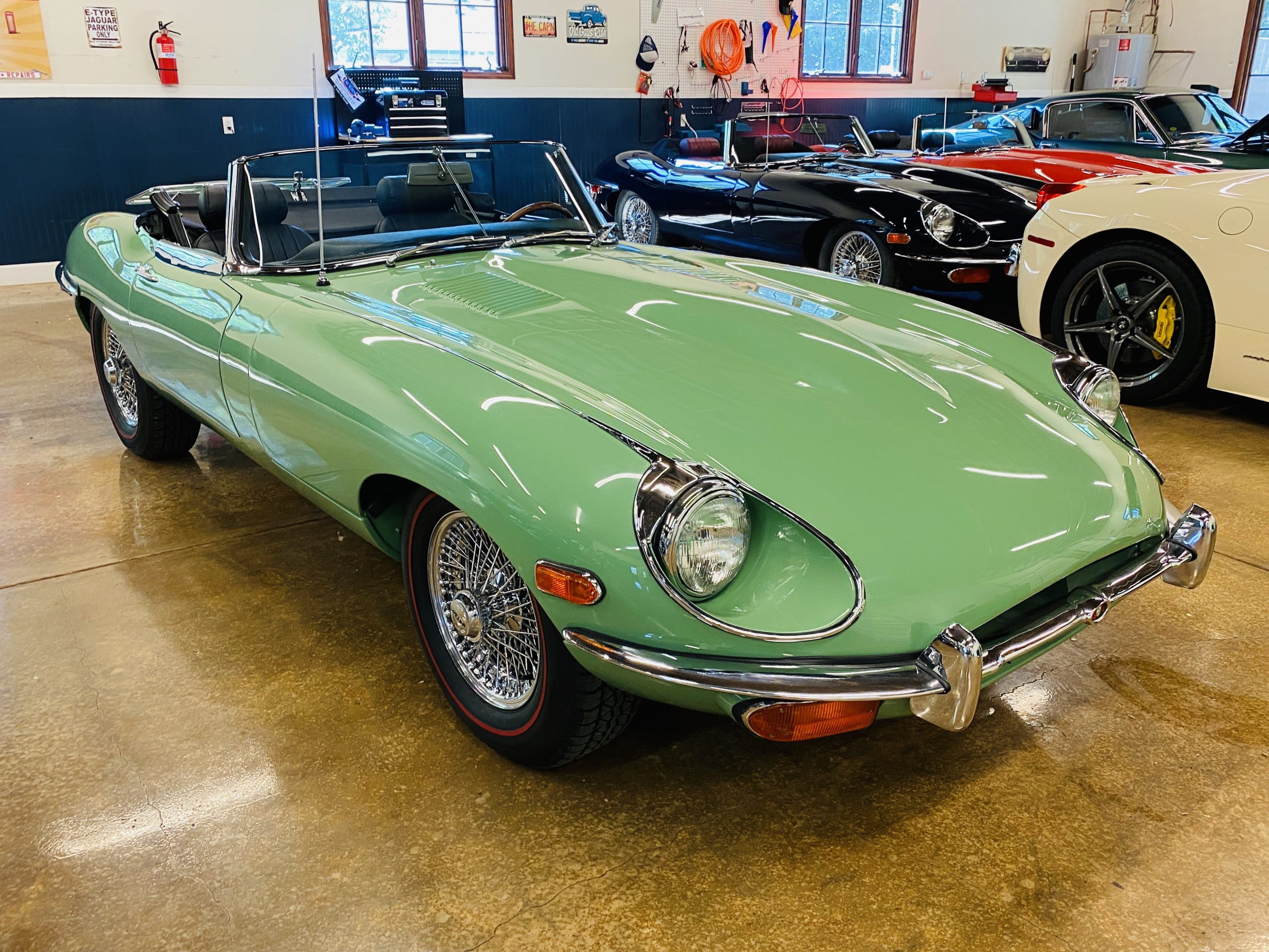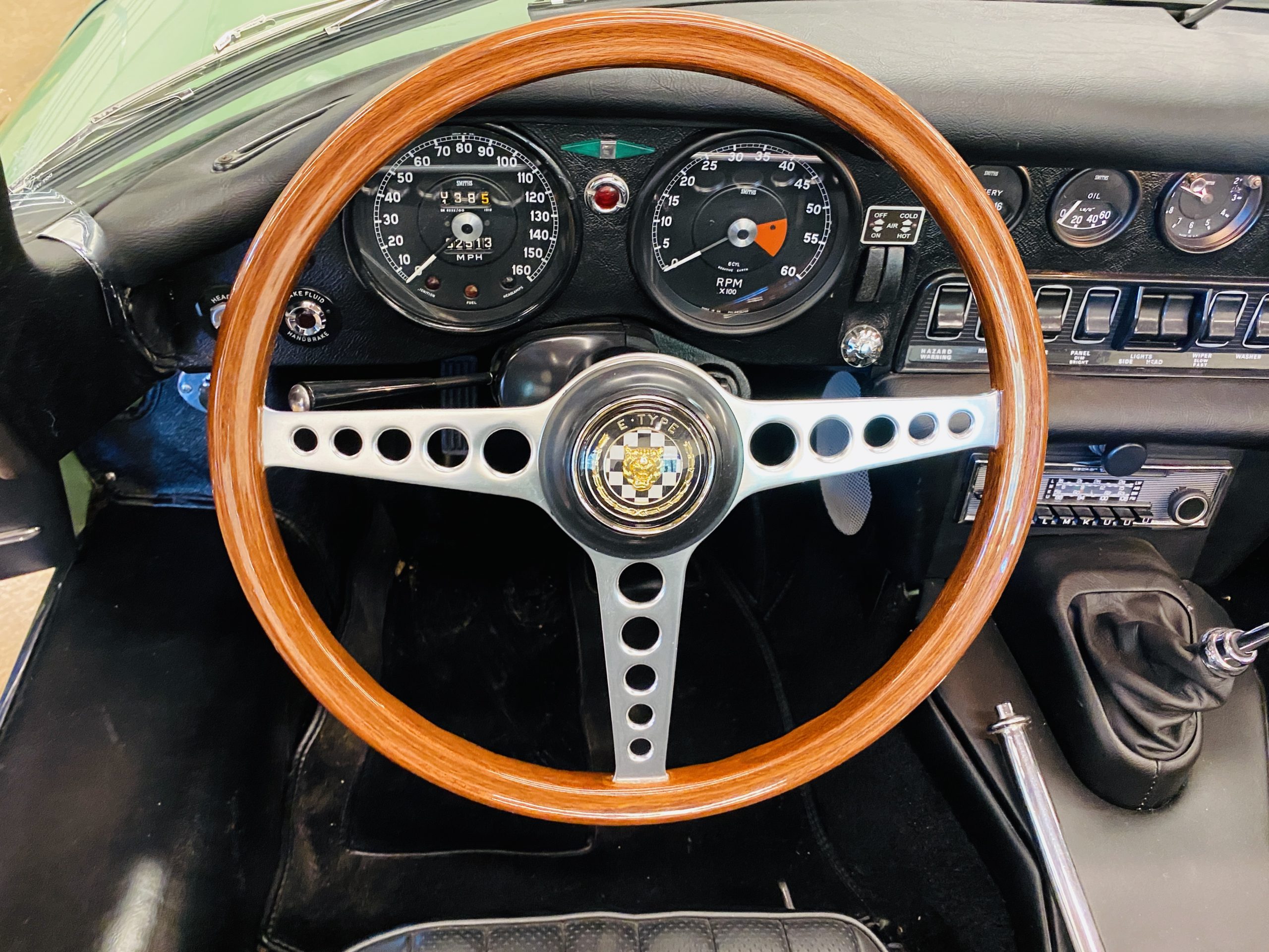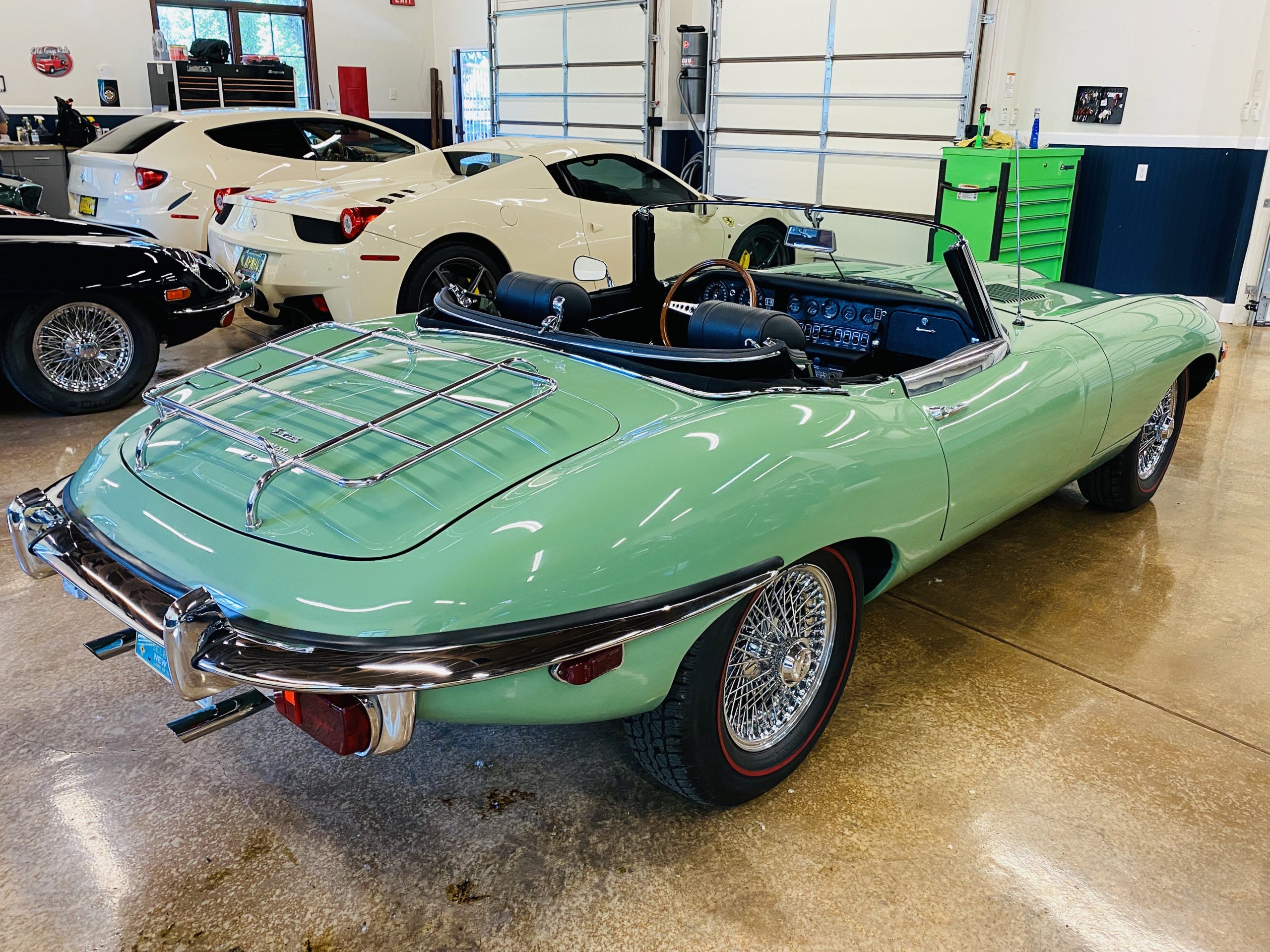 This E-Type has been beautifully finished in Willow Green and has the chrome wire wheels, giving it a spectacular look. The paint, chrome and all the finish work are all in excellent condition. This is ready to be competitive at concours events.