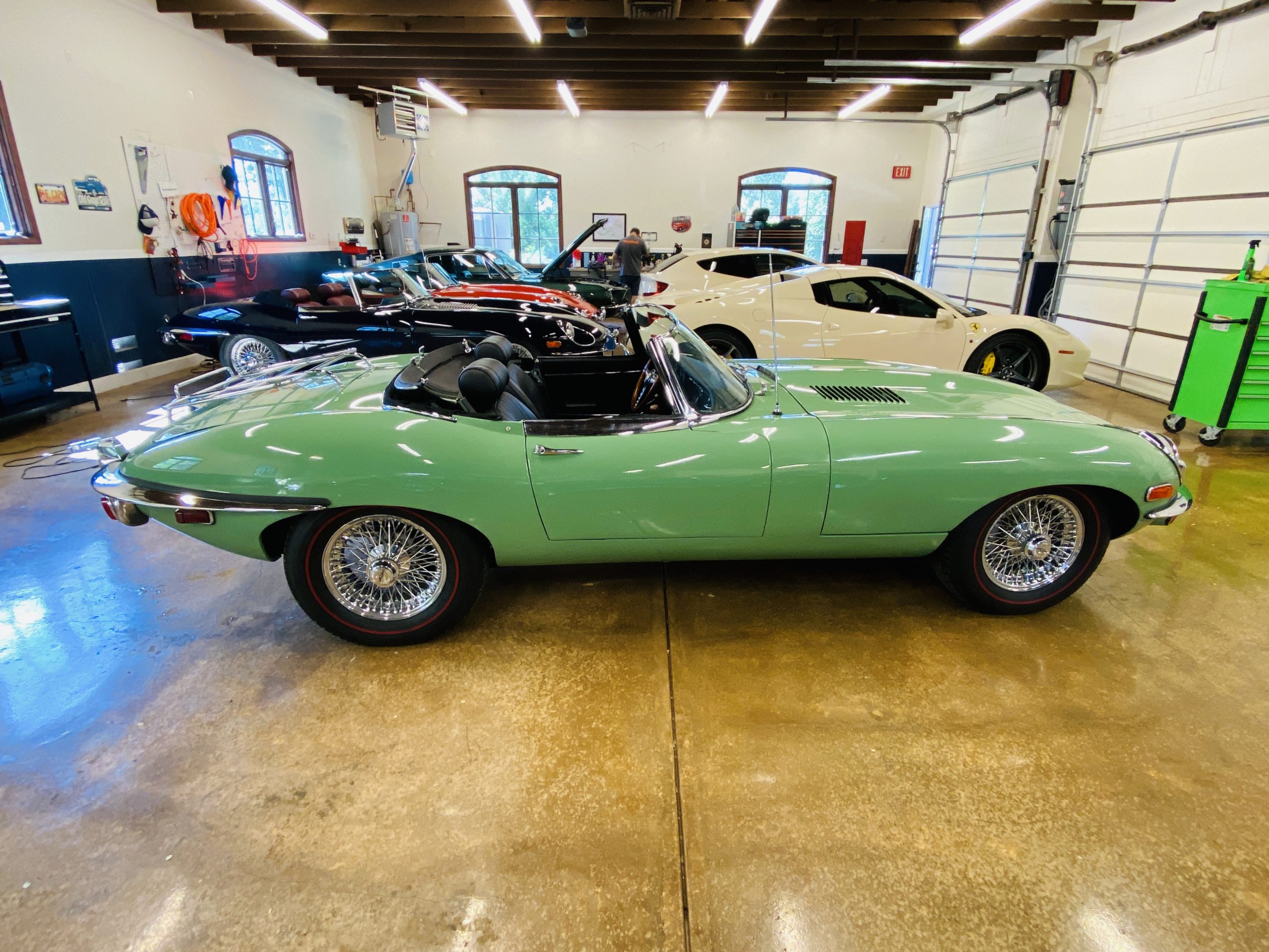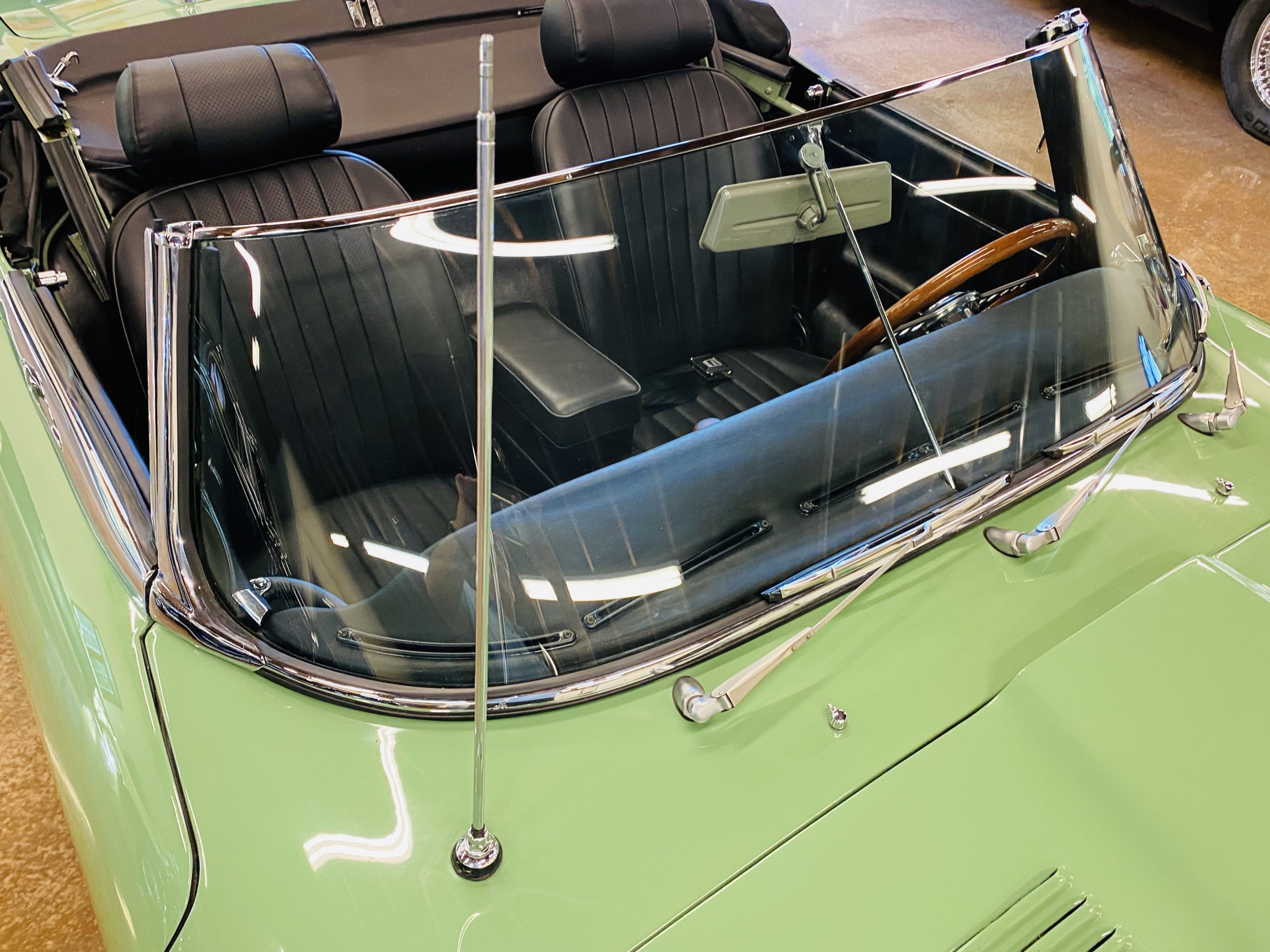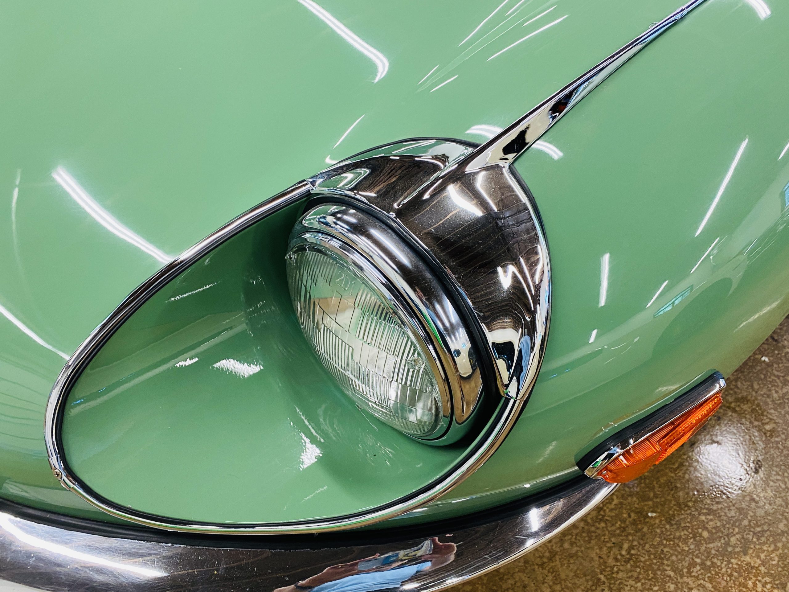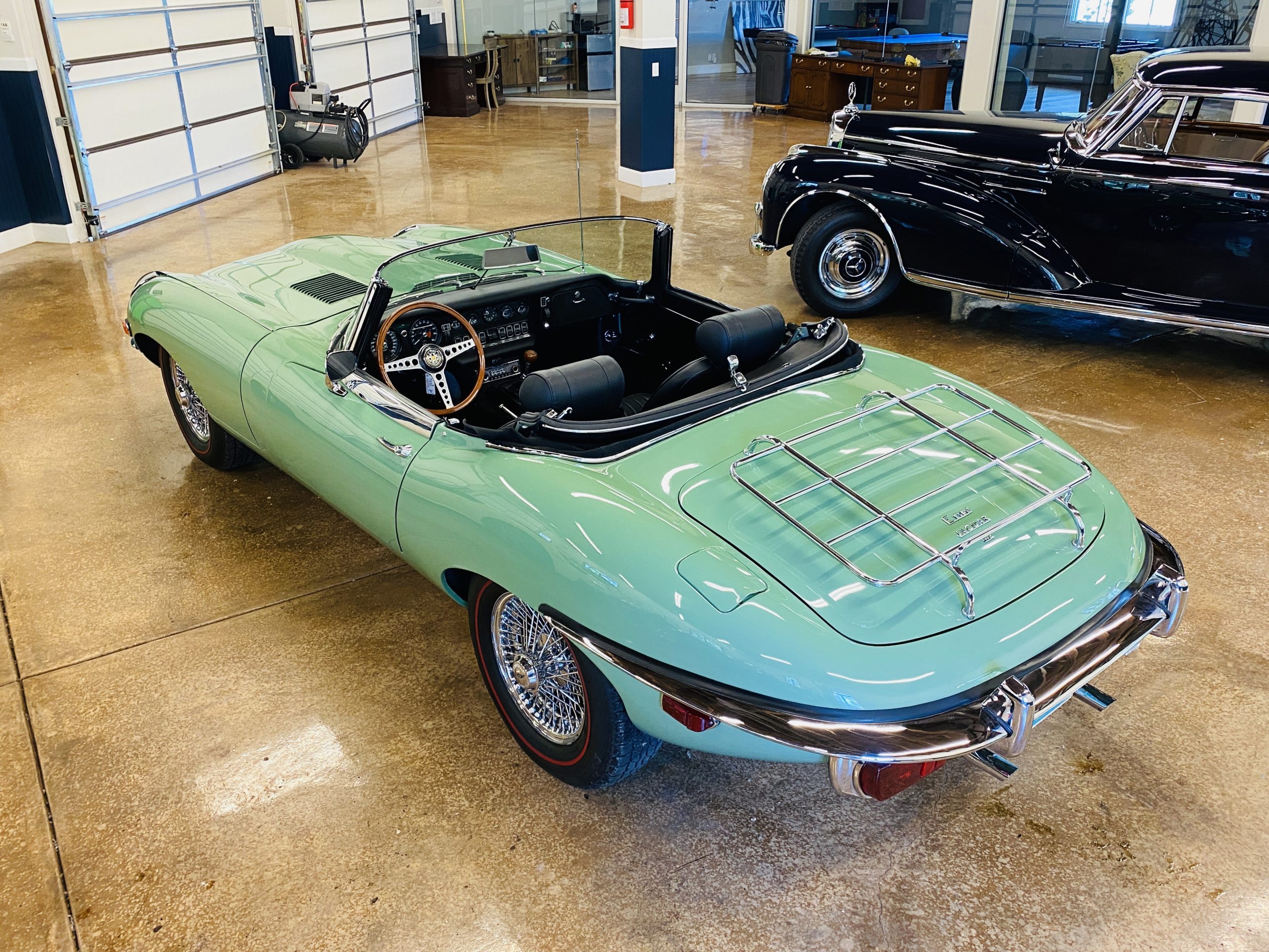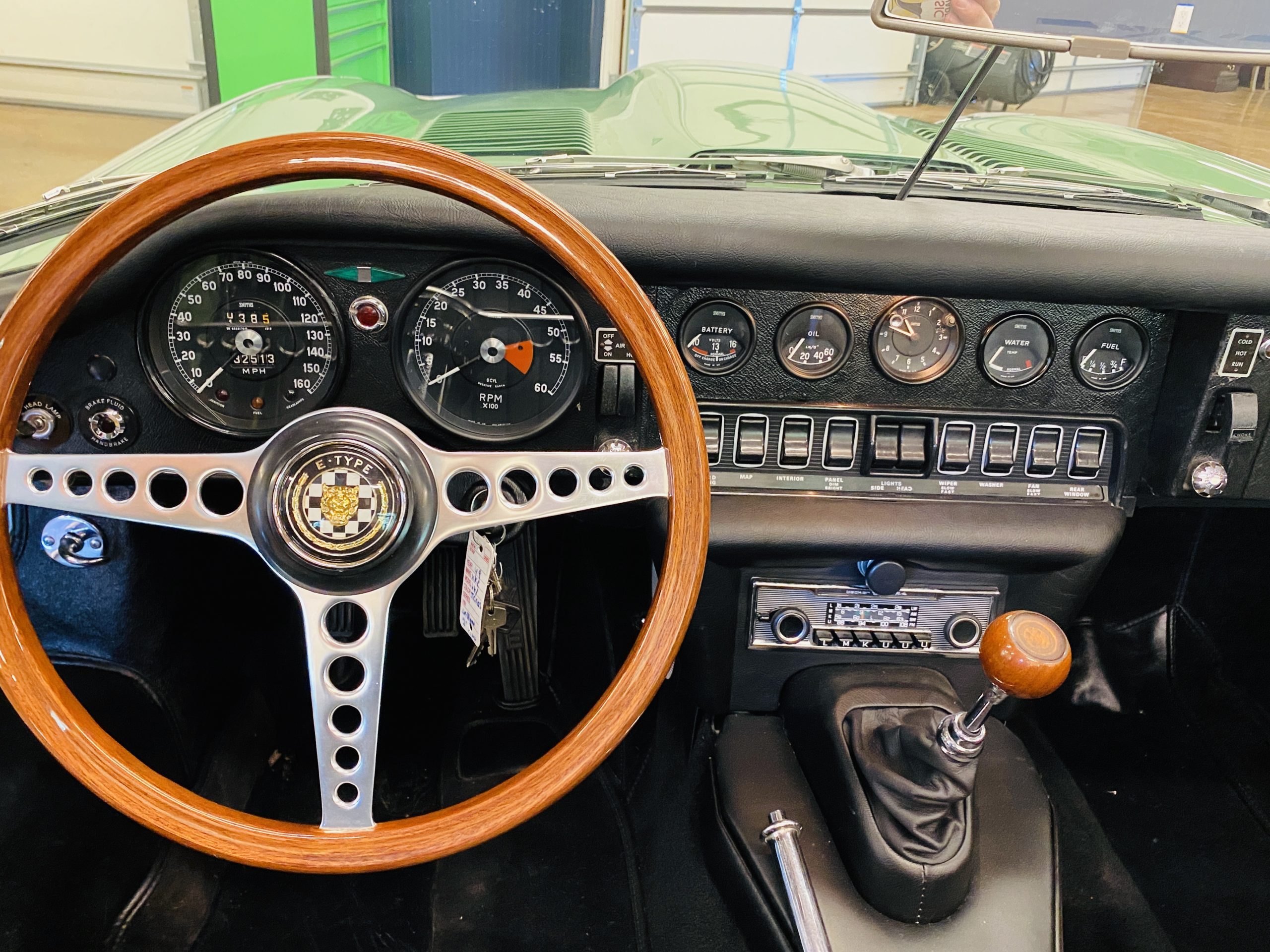 This E-Type has been beautifully finished in Willow Green and has the chrome wire wheels, giving it a spectacular look. The paint, chrome and all the finish work are all in excellent condition. This is ready to be competitive at concours events.