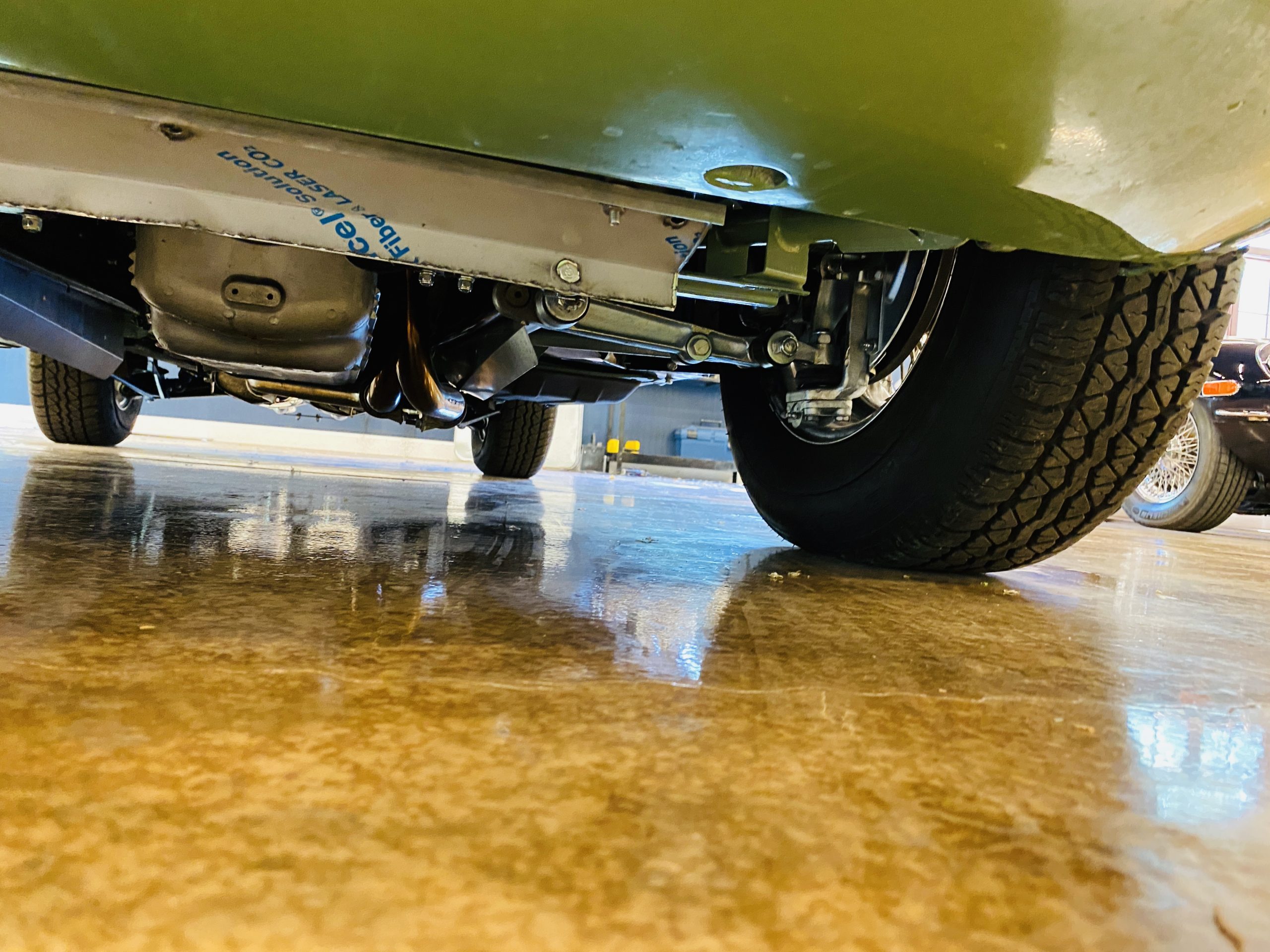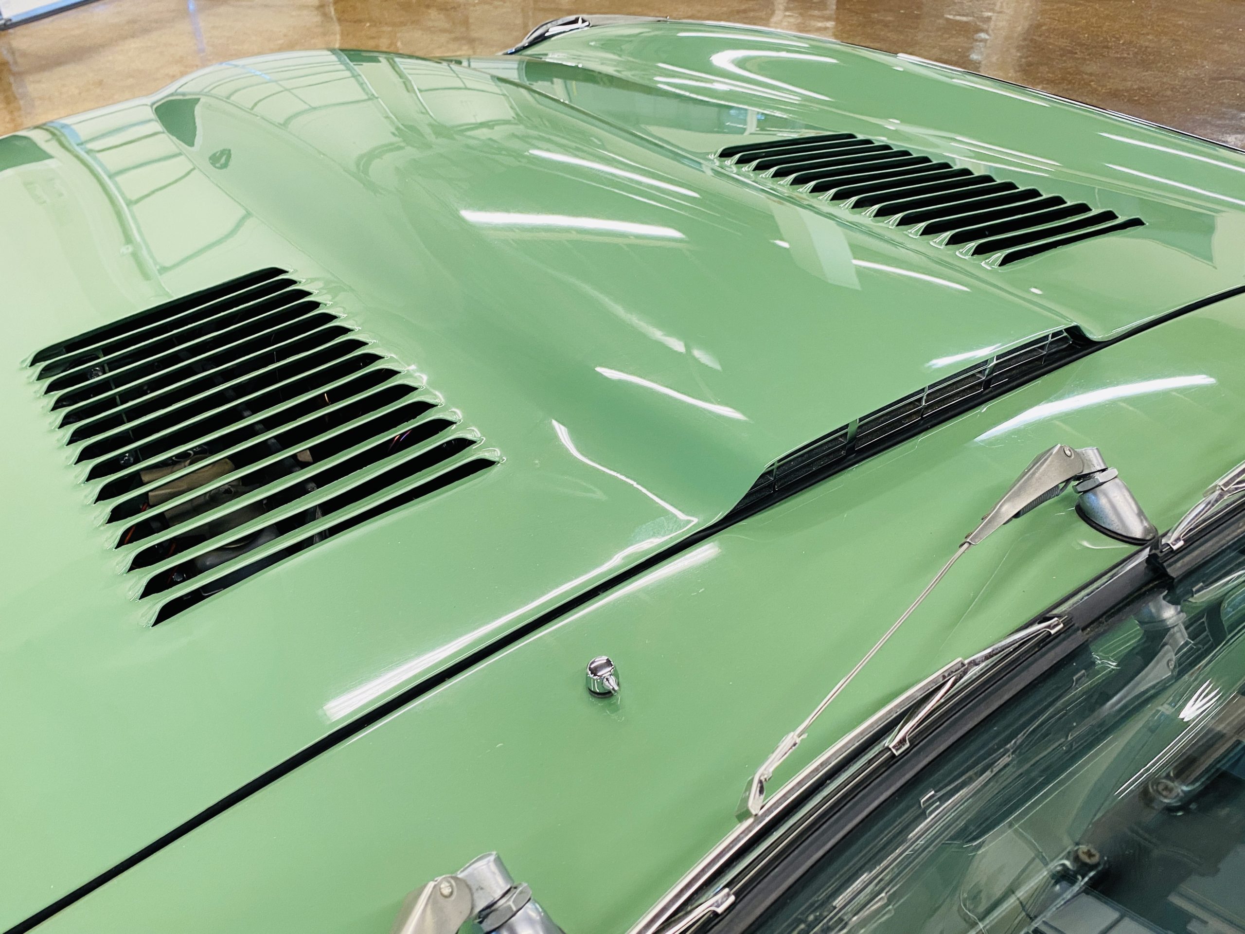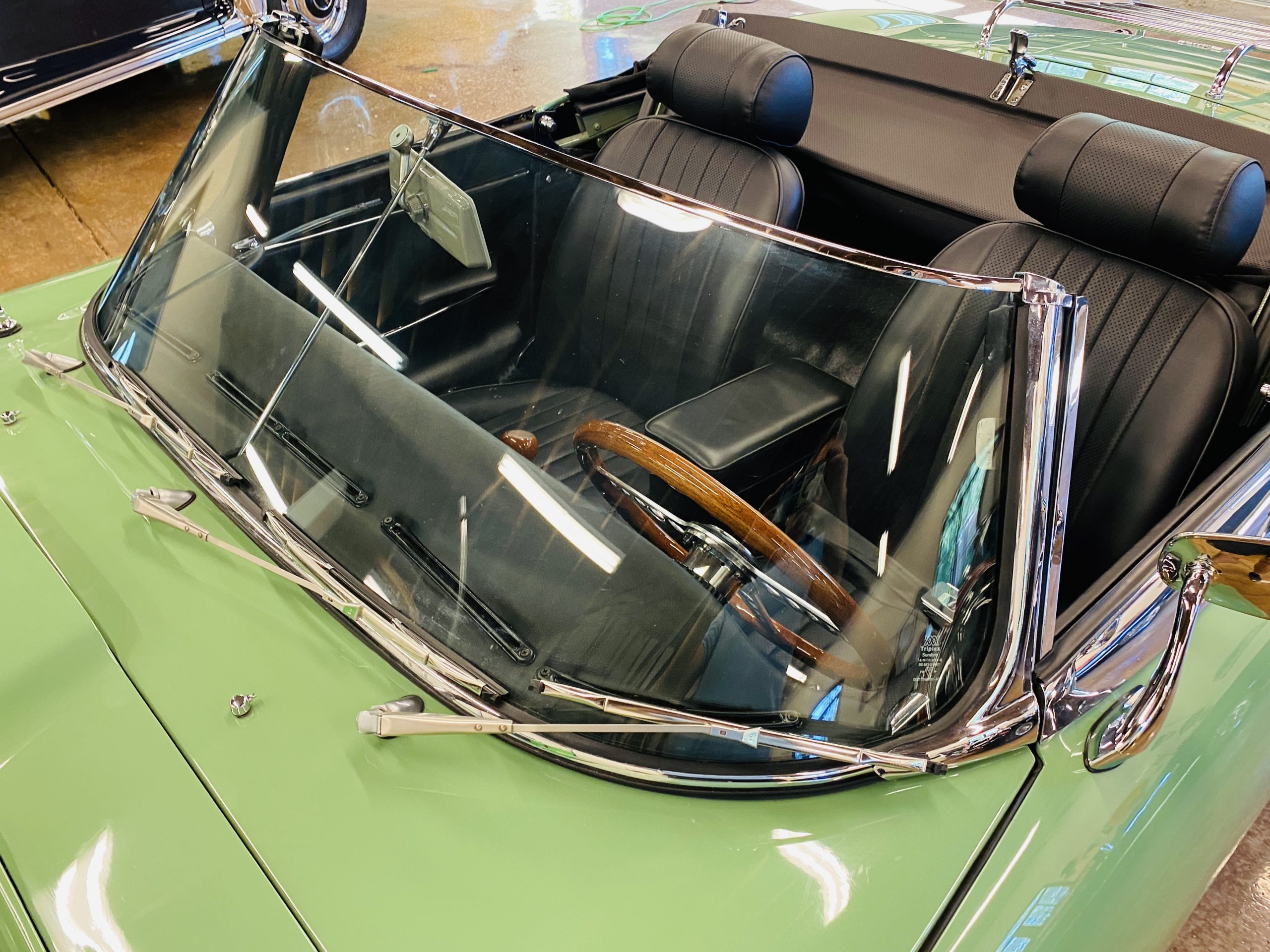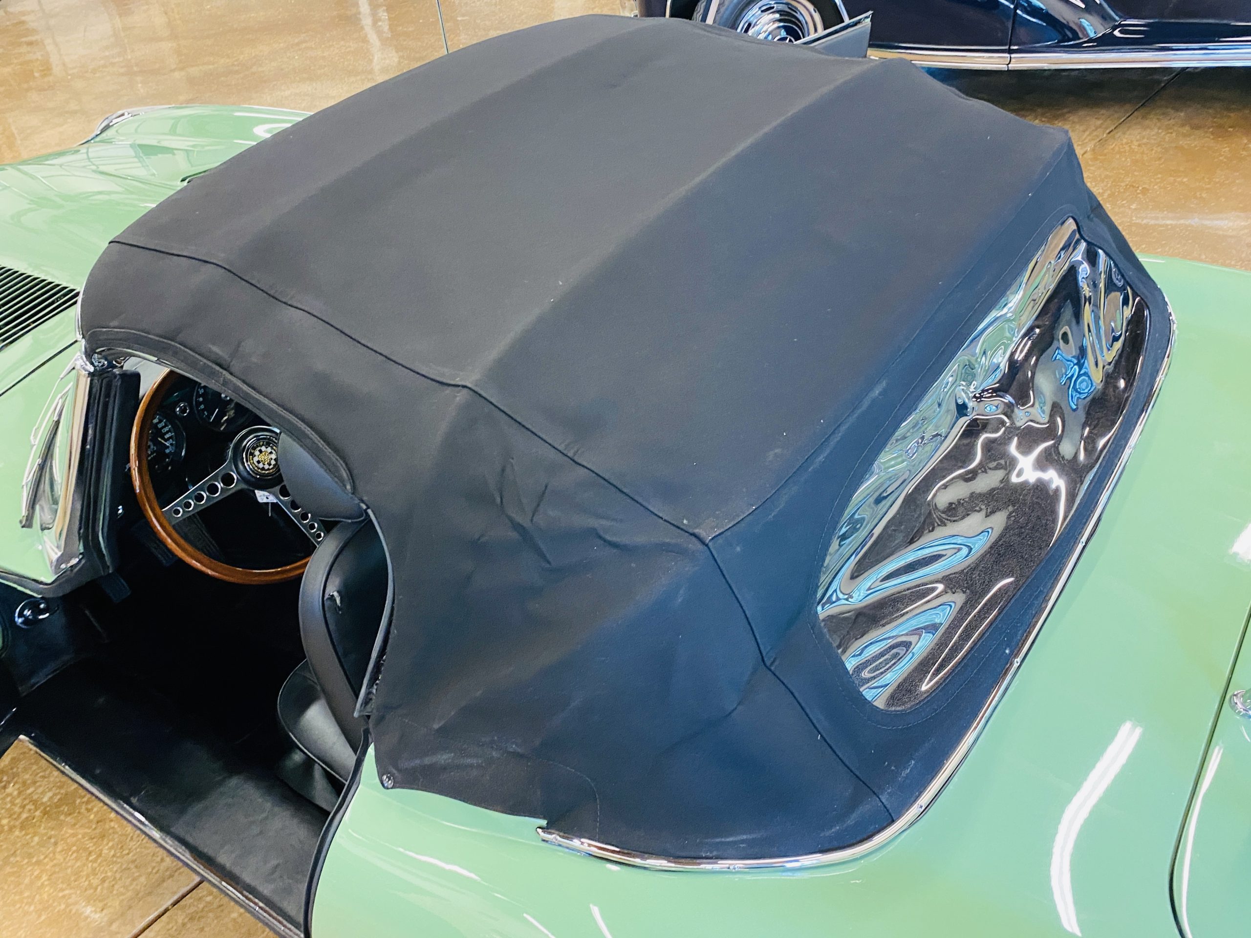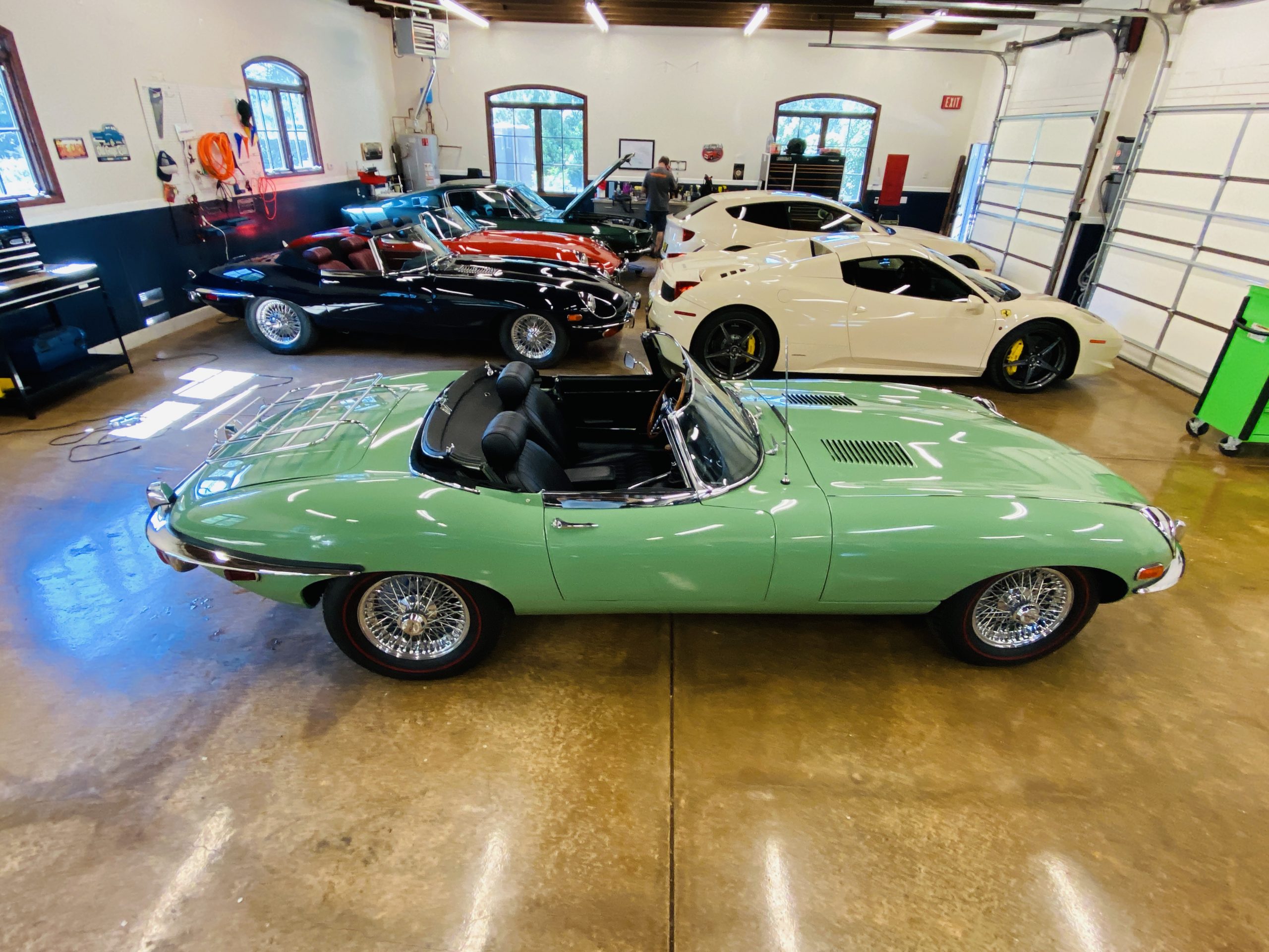 This E-Type has been beautifully finished in Willow Green and has the chrome wire wheels, giving it a spectacular look. The paint, chrome and all the finish work are all in excellent condition. This is ready to be competitive at concours events.