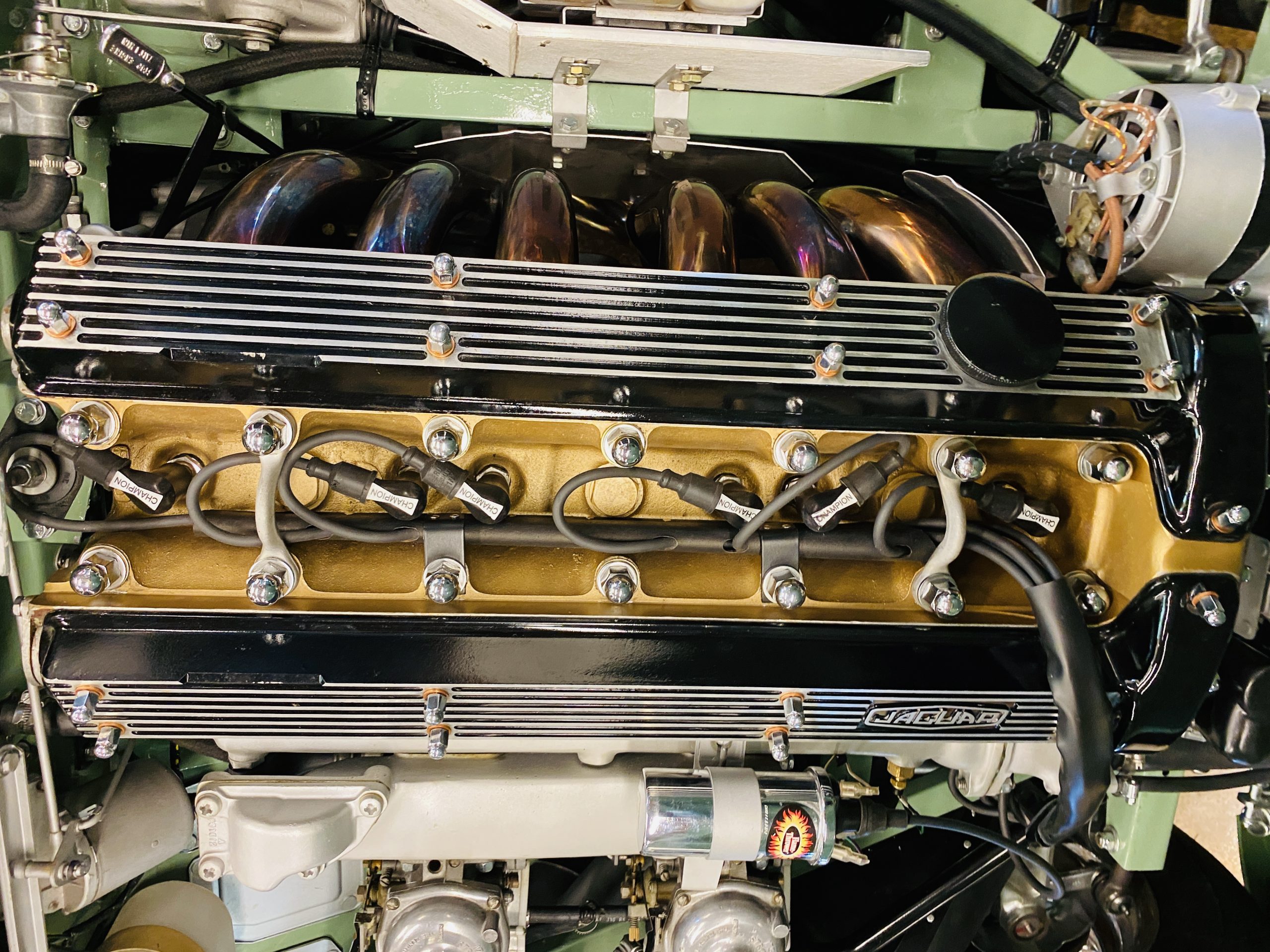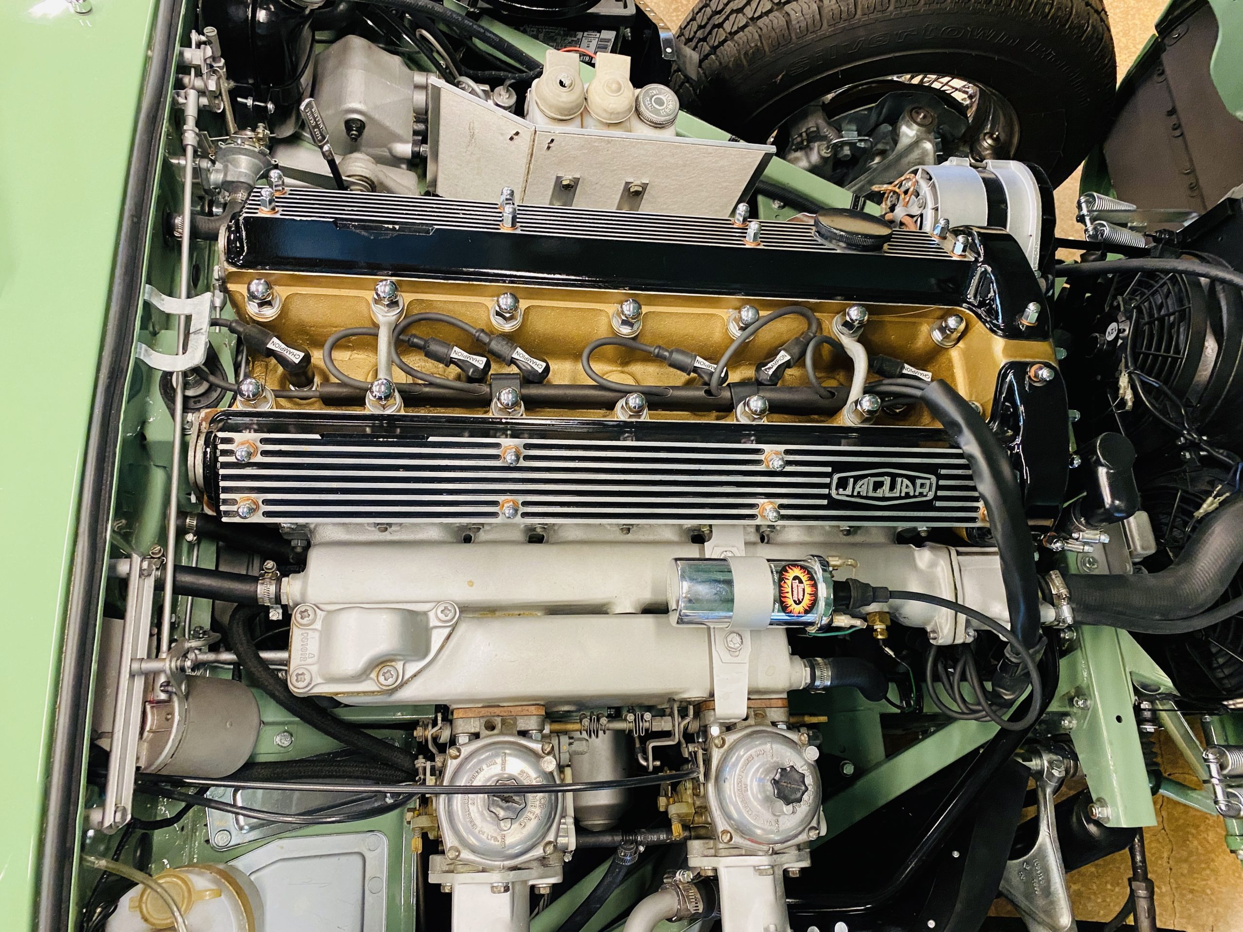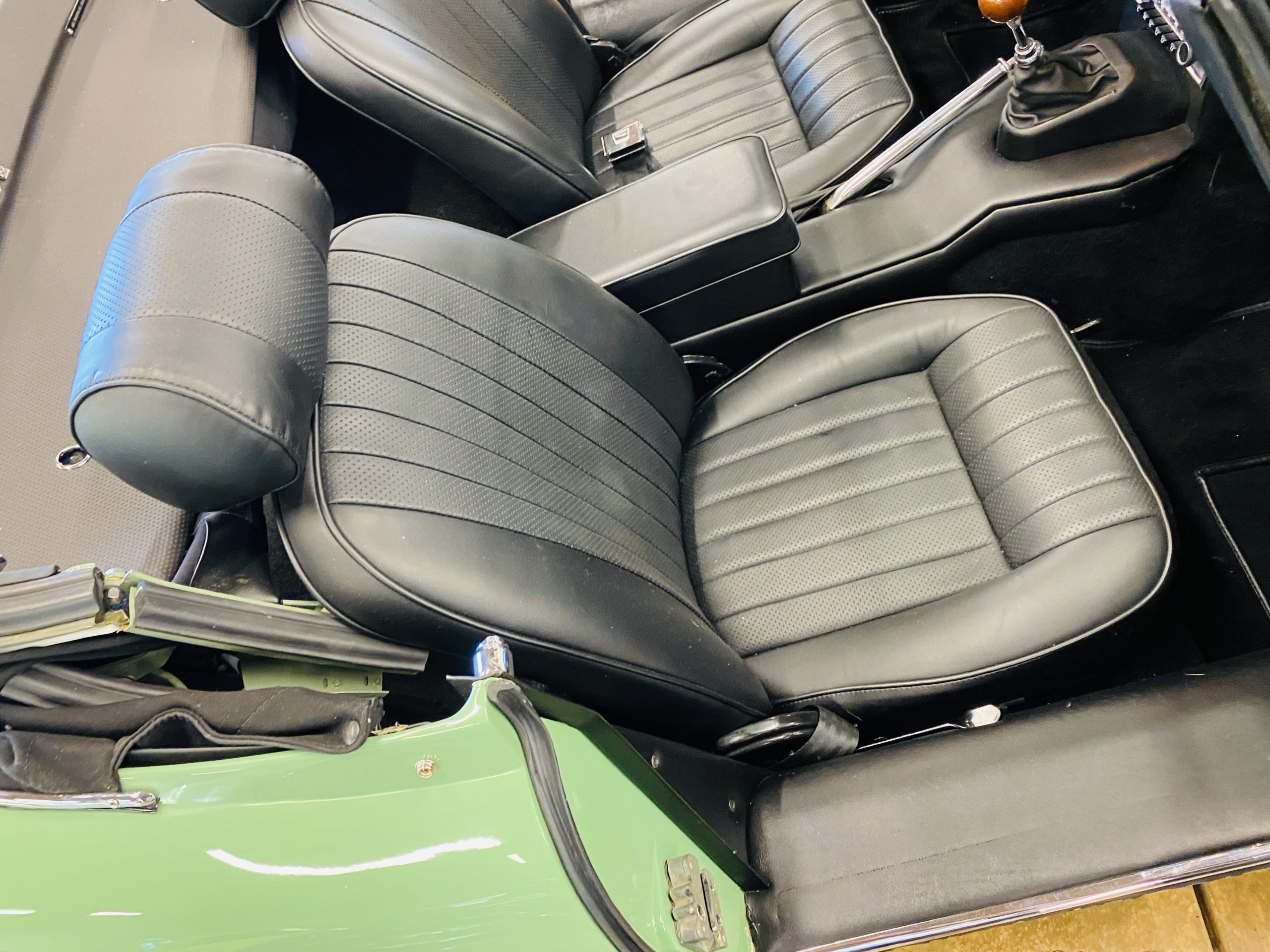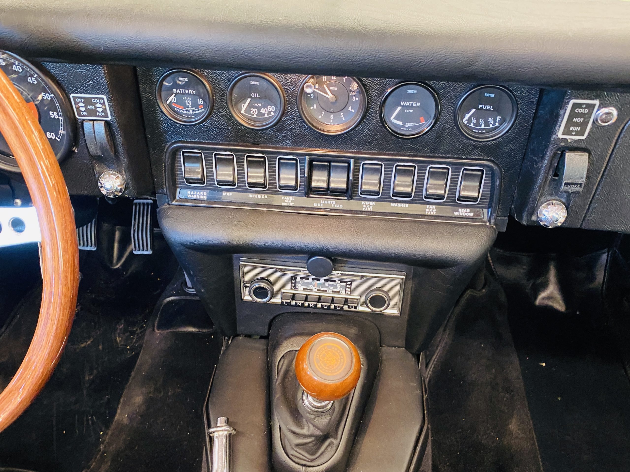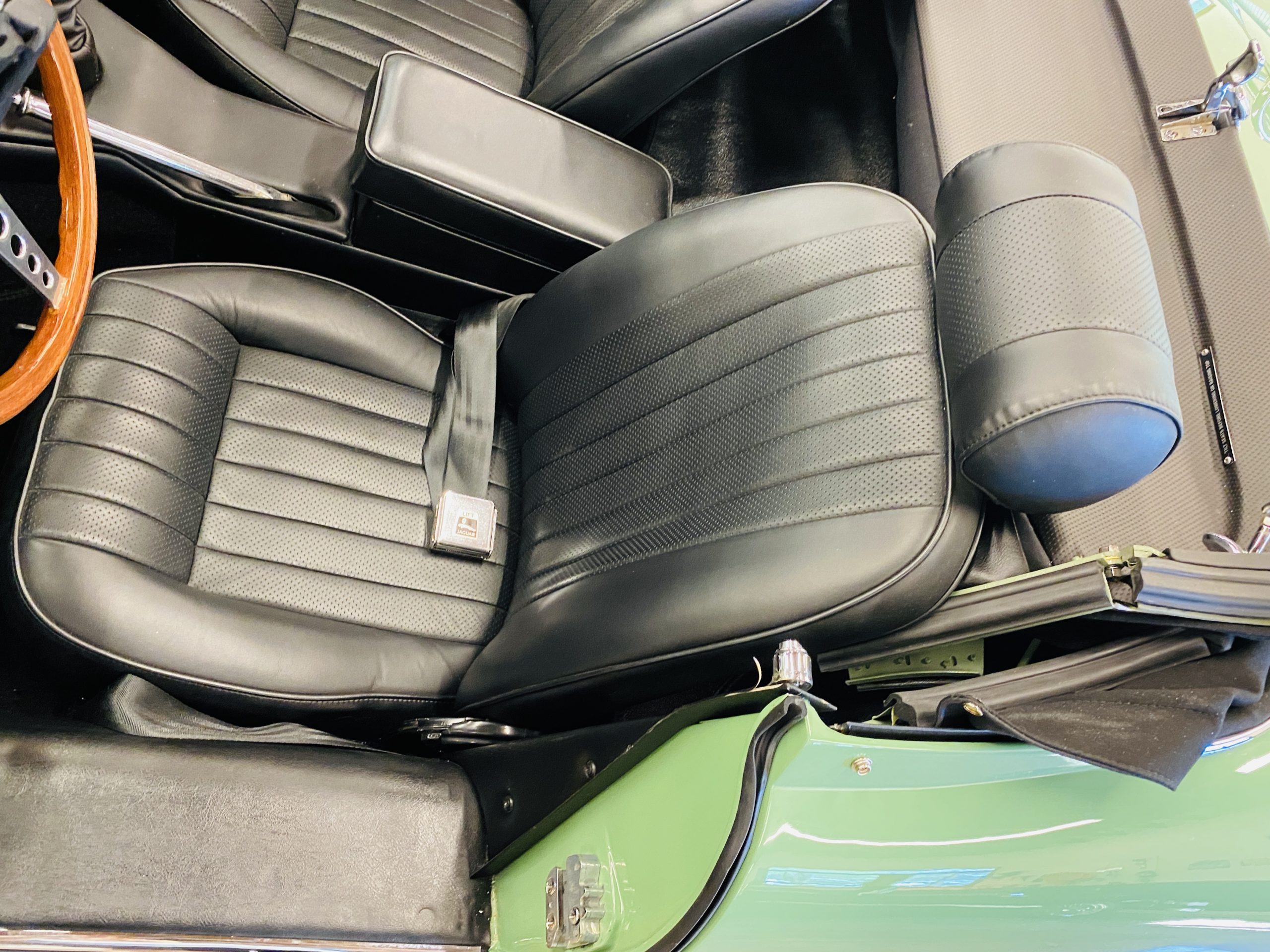 The gorgeous black leather interior and matching black carpeting is all new and without fault. New Jaguar branded seatbelts have been installed and everything in the interior is as-new. The dash, instruments and door panels are also either new or restored. Everything works as it should.