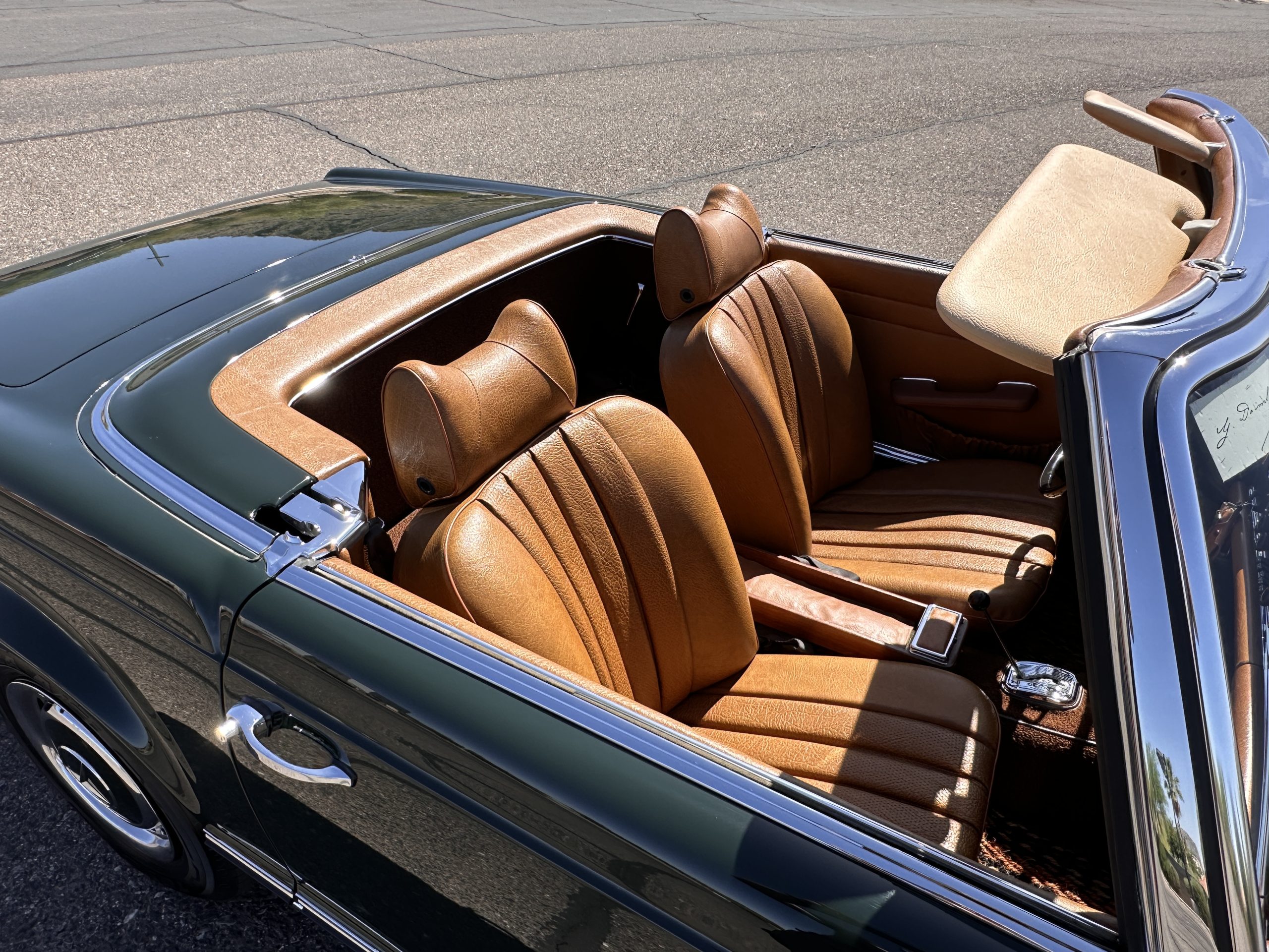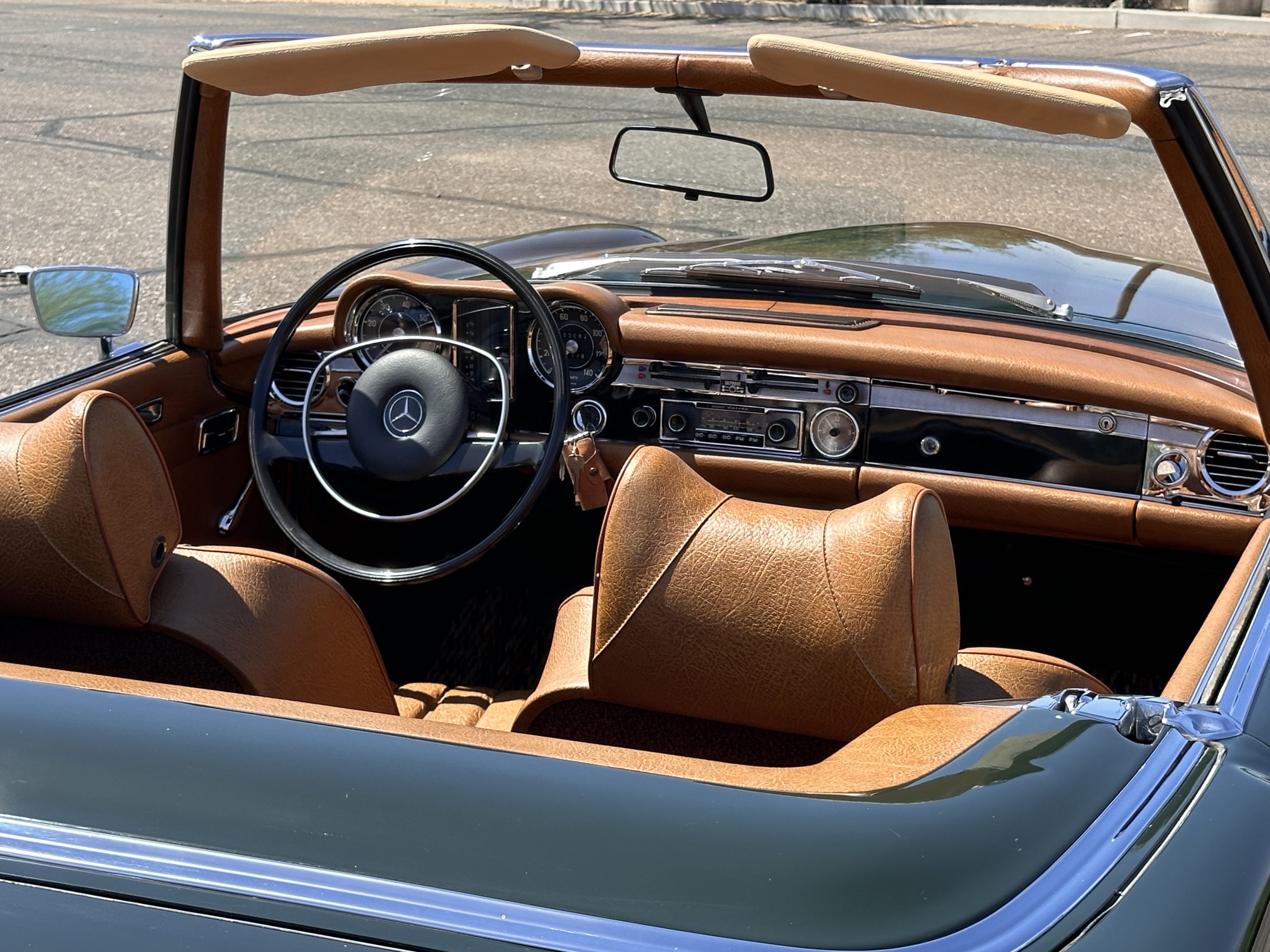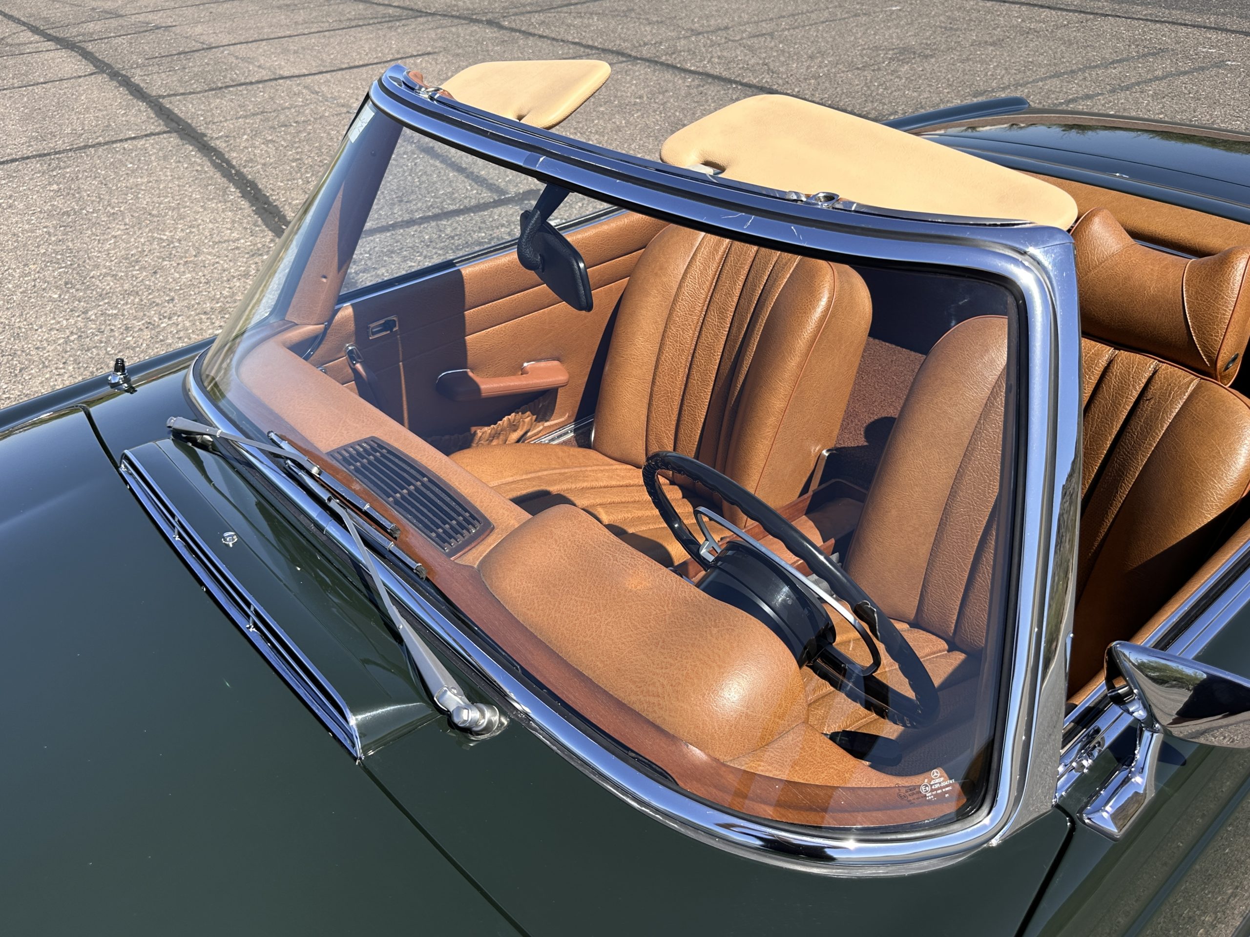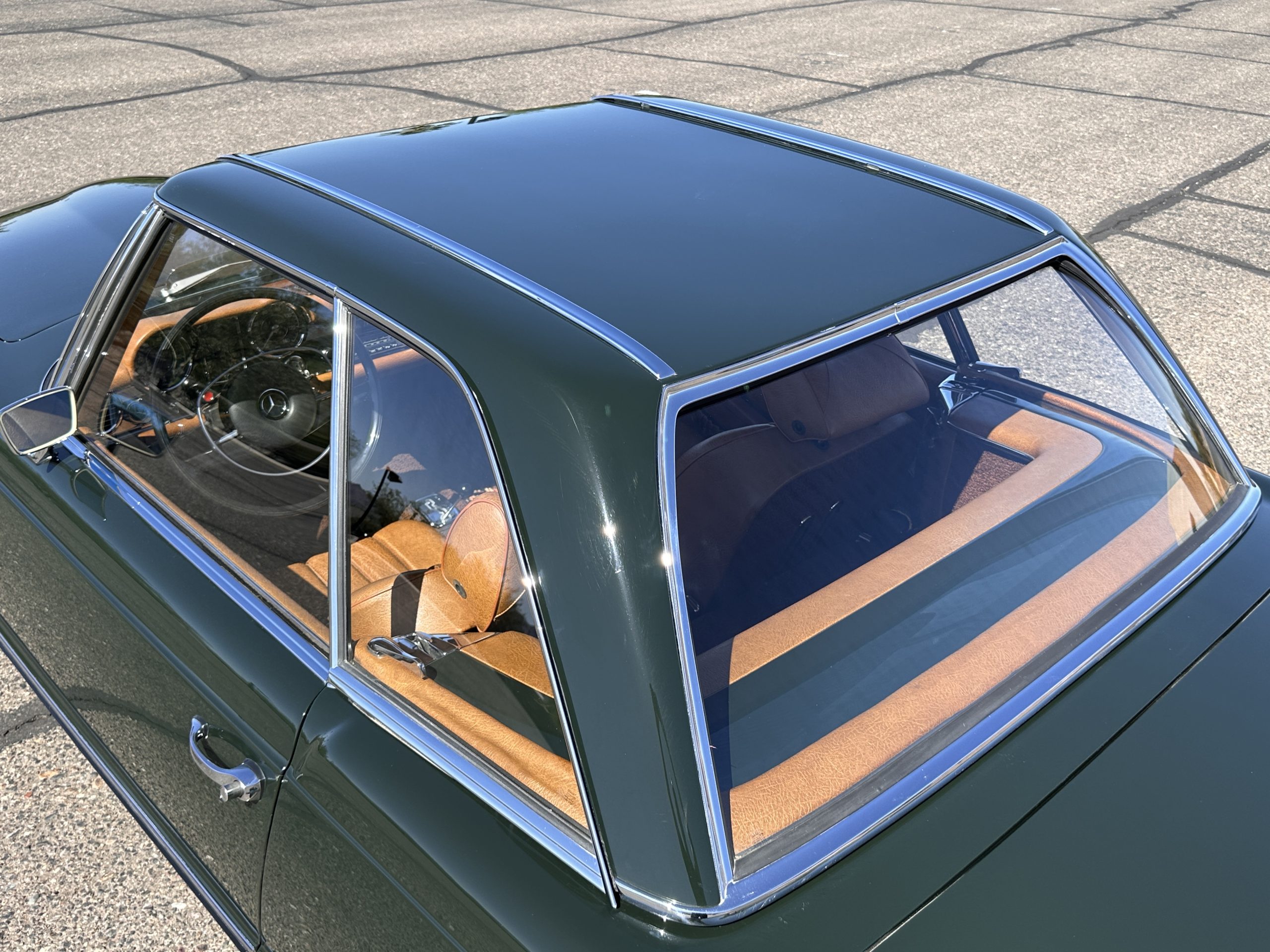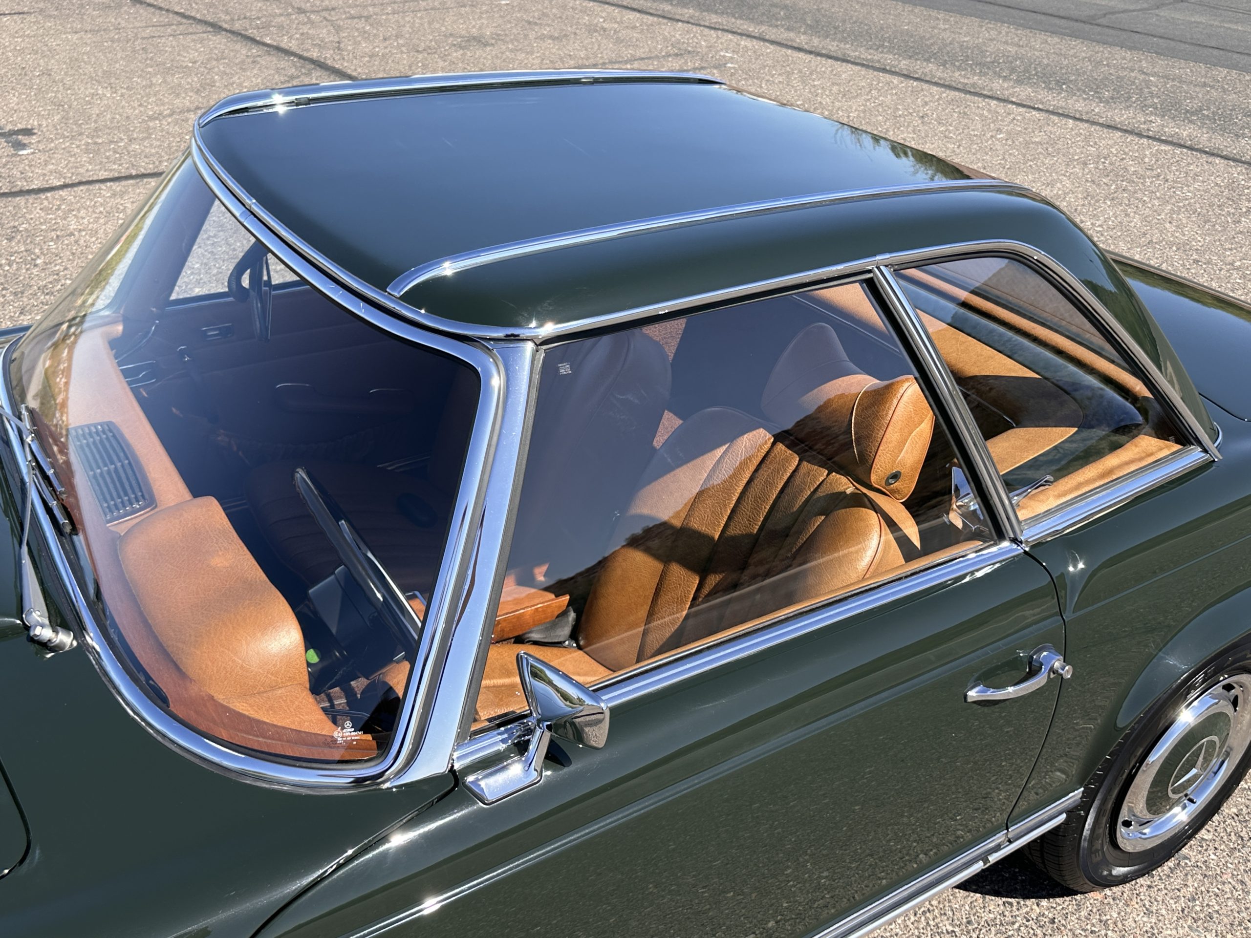 The livery is in concours-ready condition in its Dark Olive Green (Paint Code 291).  The paint is nearly perfect condition with a few very small imperfections that are only noticeable upon very close inspection (which is our role).  The body panel fit is perfect and all the important inspections for Pagoda’s check out: the spot welds in the engine compartment, the VIN stamp in the hood and hardtop, the notches in the headlight area, even the date code of July 1968 is revealed on the trunk seal.  Service stickers are still proudly displayed on the driver’s door from 1969 and 1970.  This 280SL is a proverbial time capsule.  The chrome and stainless-steel trim are all in excellent original condition.  The present owner had a Mercedes-Benz dealer install a new correct windshield and seals to add to the cars concours quality presentation.