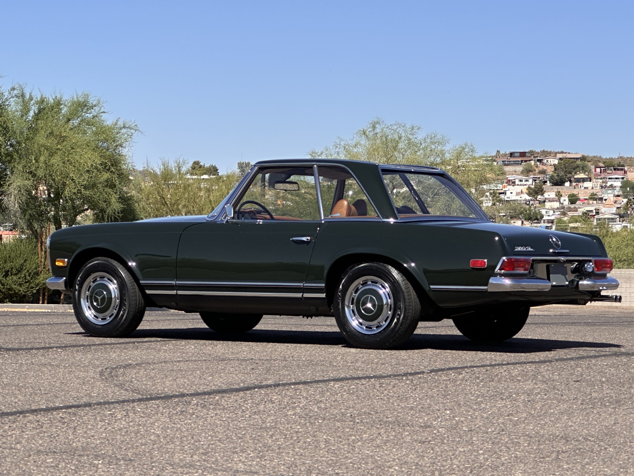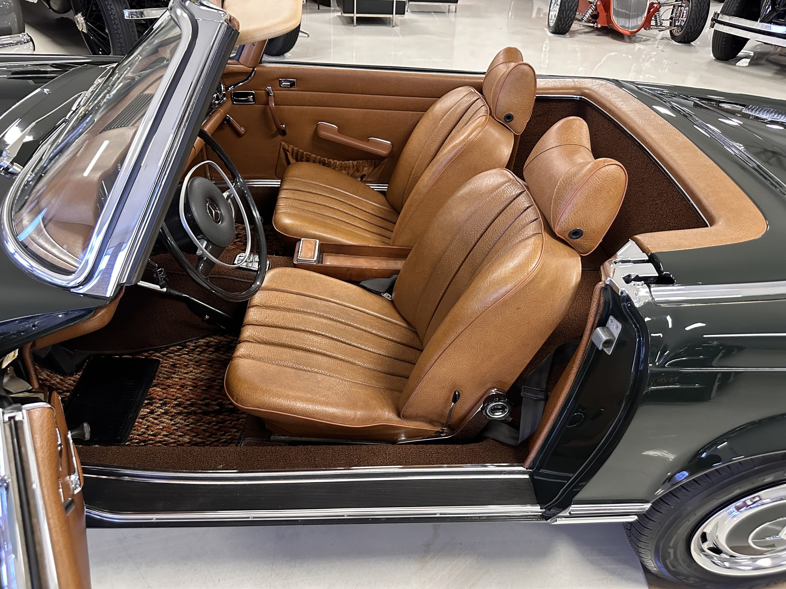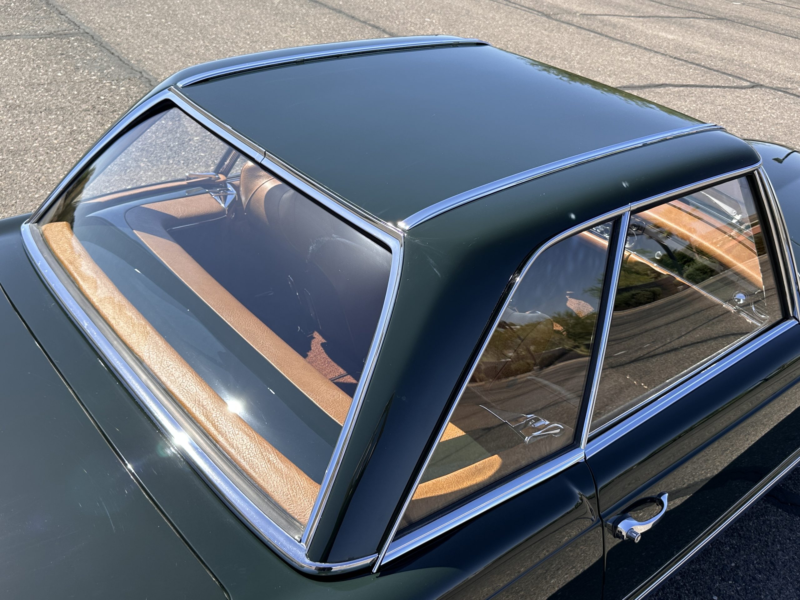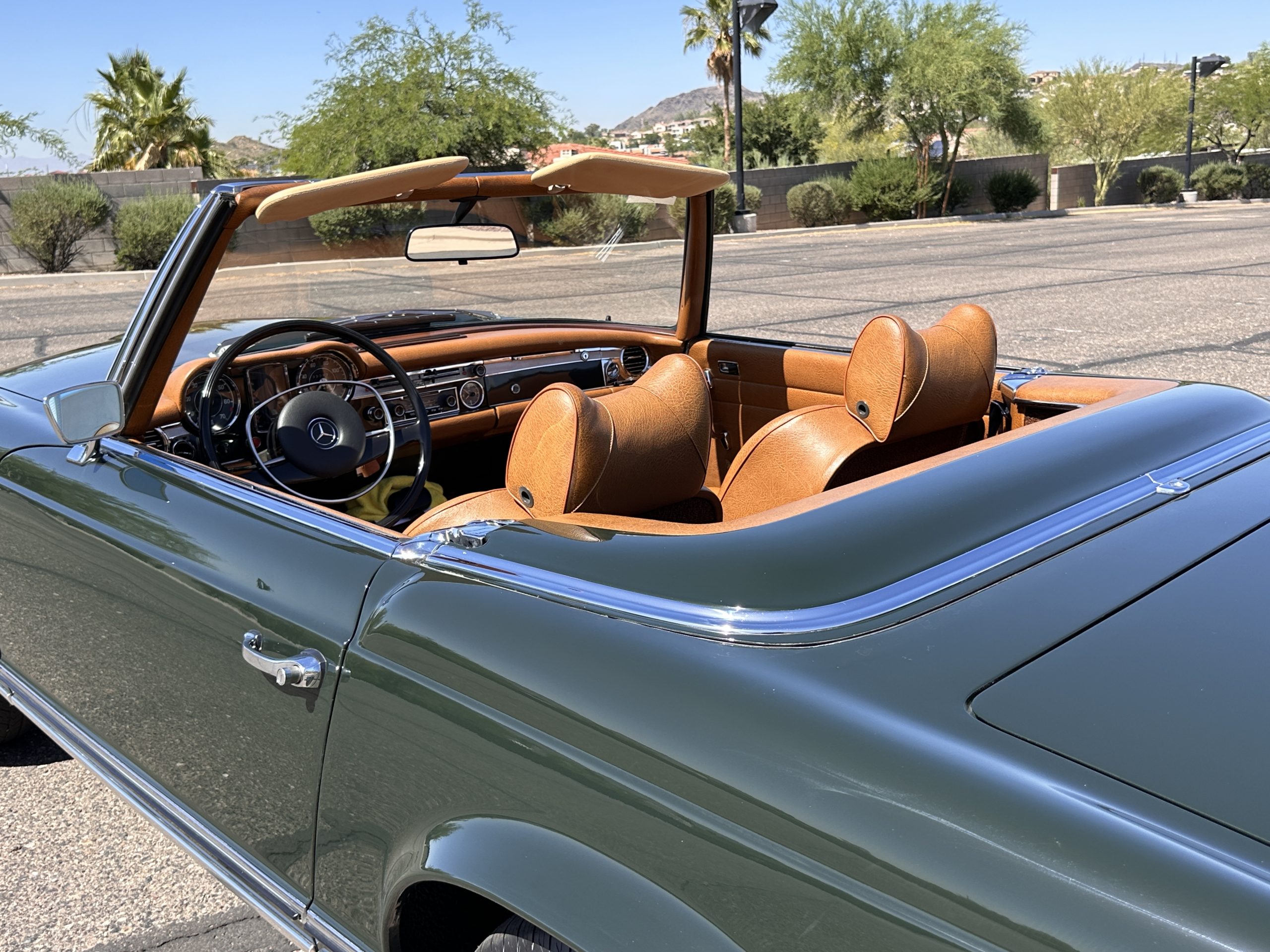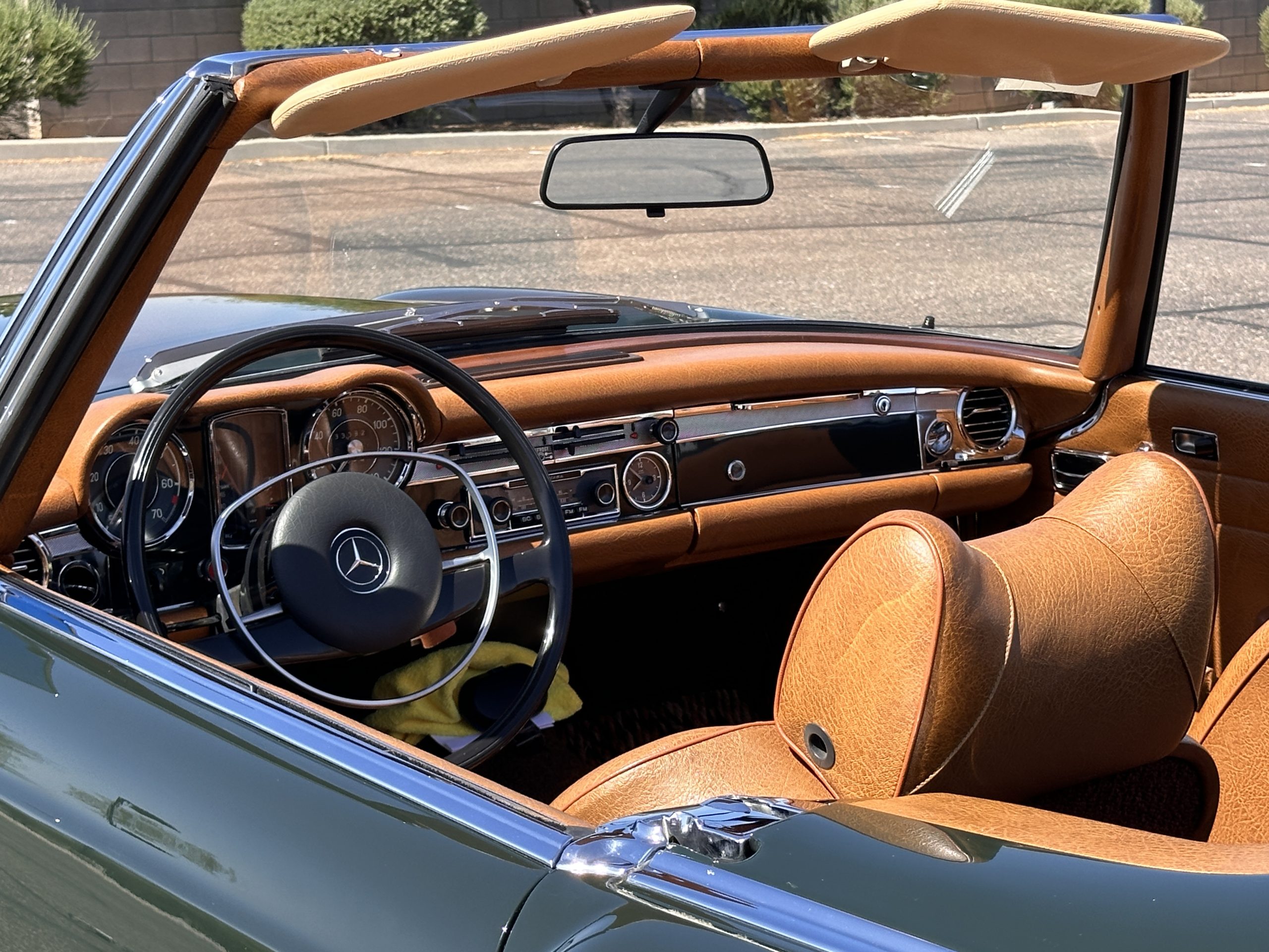 The livery is in concours-ready condition in its Dark Olive Green (Paint Code 291).  The paint is nearly perfect condition with a few very small imperfections that are only noticeable upon very close inspection (which is our role).  The body panel fit is perfect and all the important inspections for Pagoda’s check out: the spot welds in the engine compartment, the VIN stamp in the hood and hardtop, the notches in the headlight area, even the date code of July 1968 is revealed on the trunk seal.  Service stickers are still proudly displayed on the driver’s door from 1969 and 1970.  This 280SL is a proverbial time capsule.  The chrome and stainless-steel trim are all in excellent original condition.  The present owner had a Mercedes-Benz dealer install a new correct windshield and seals to add to the cars concours quality presentation.
