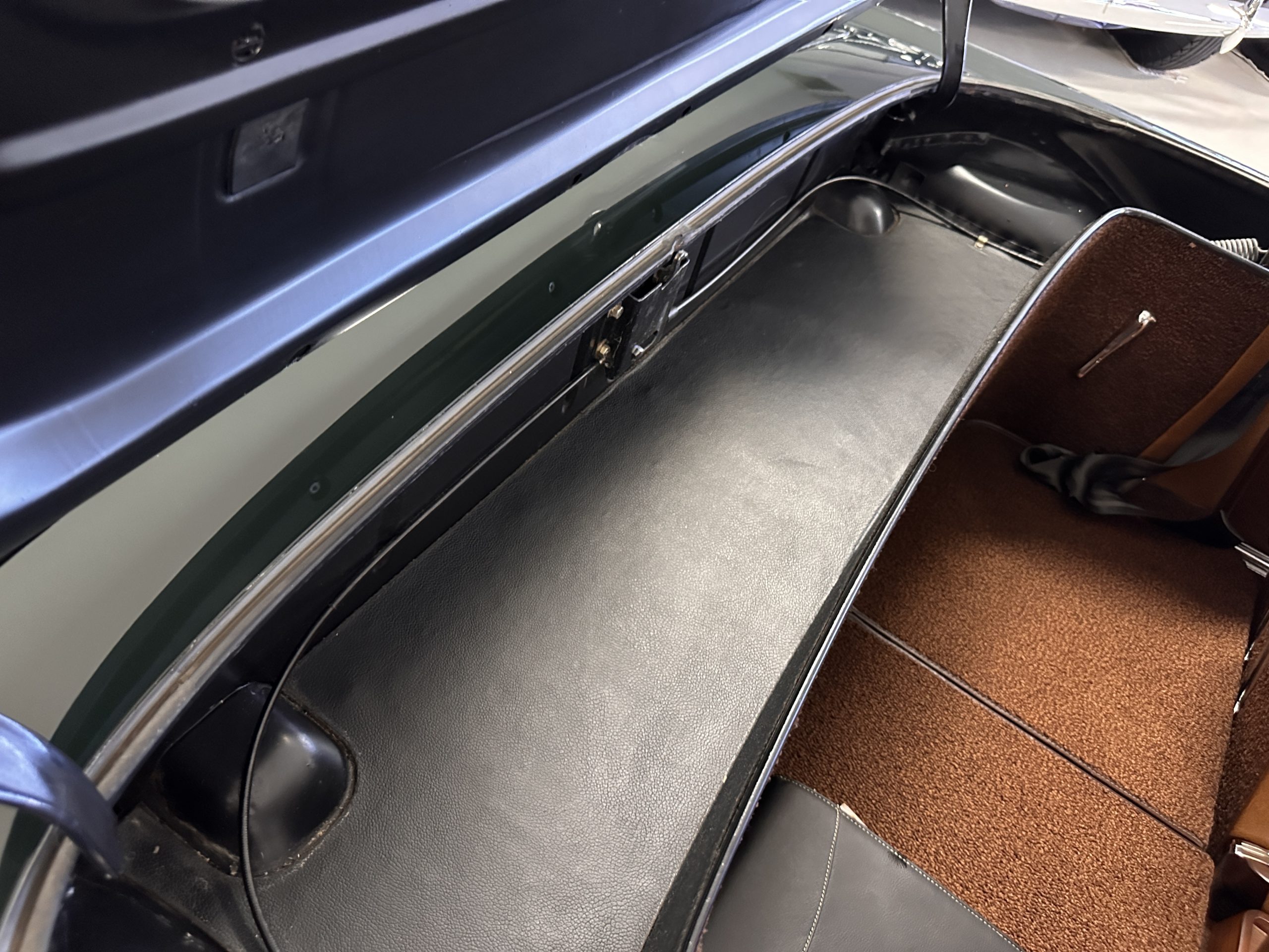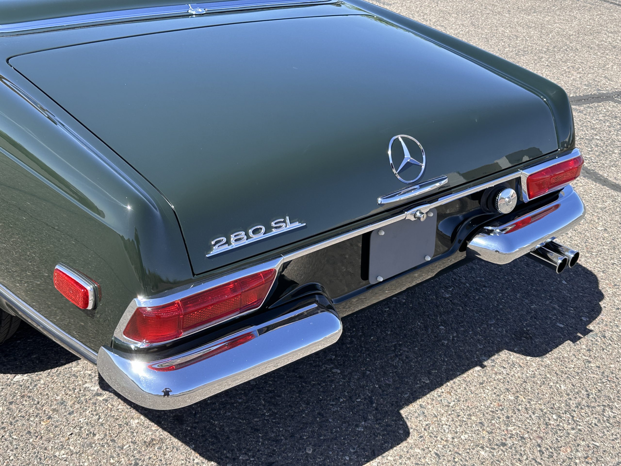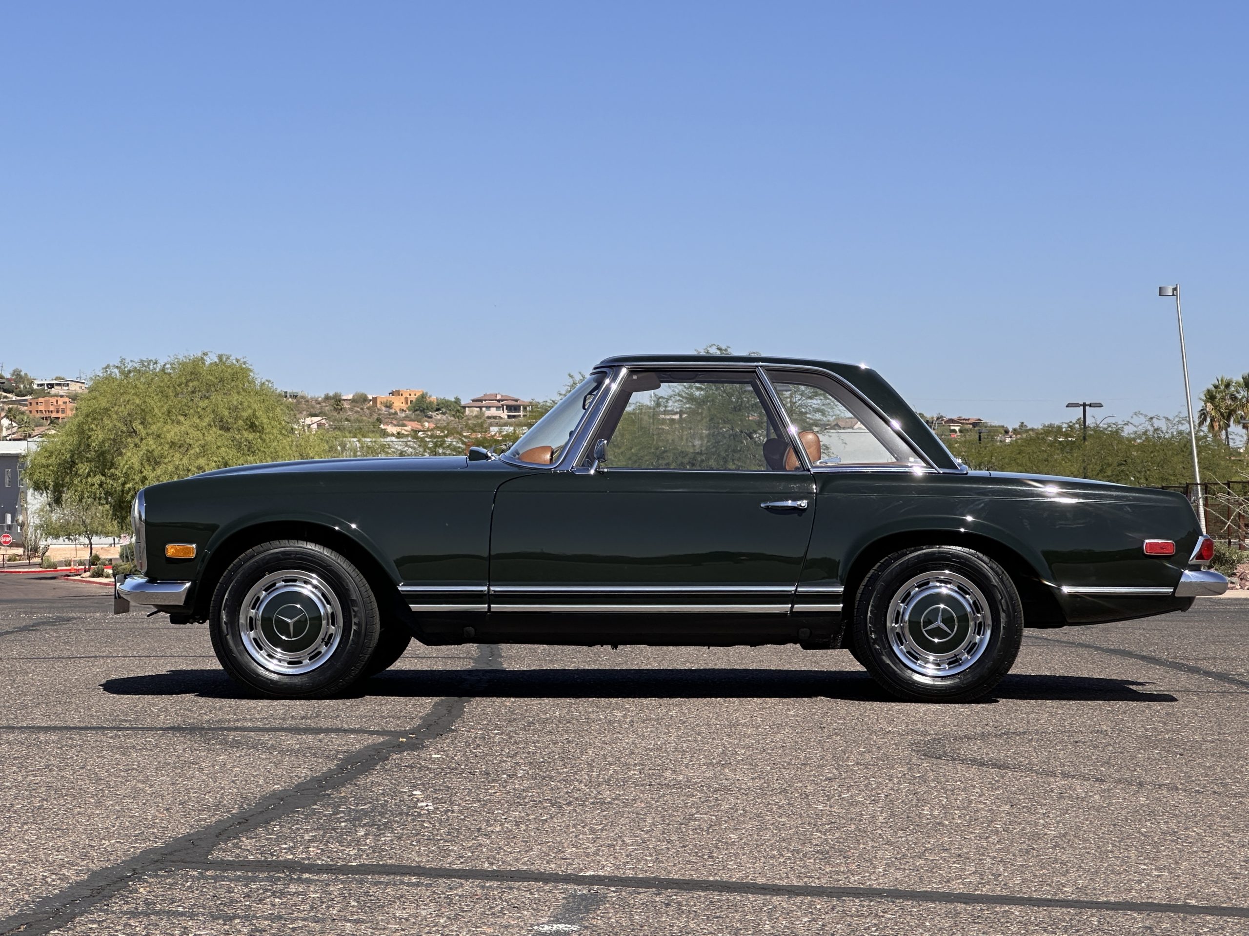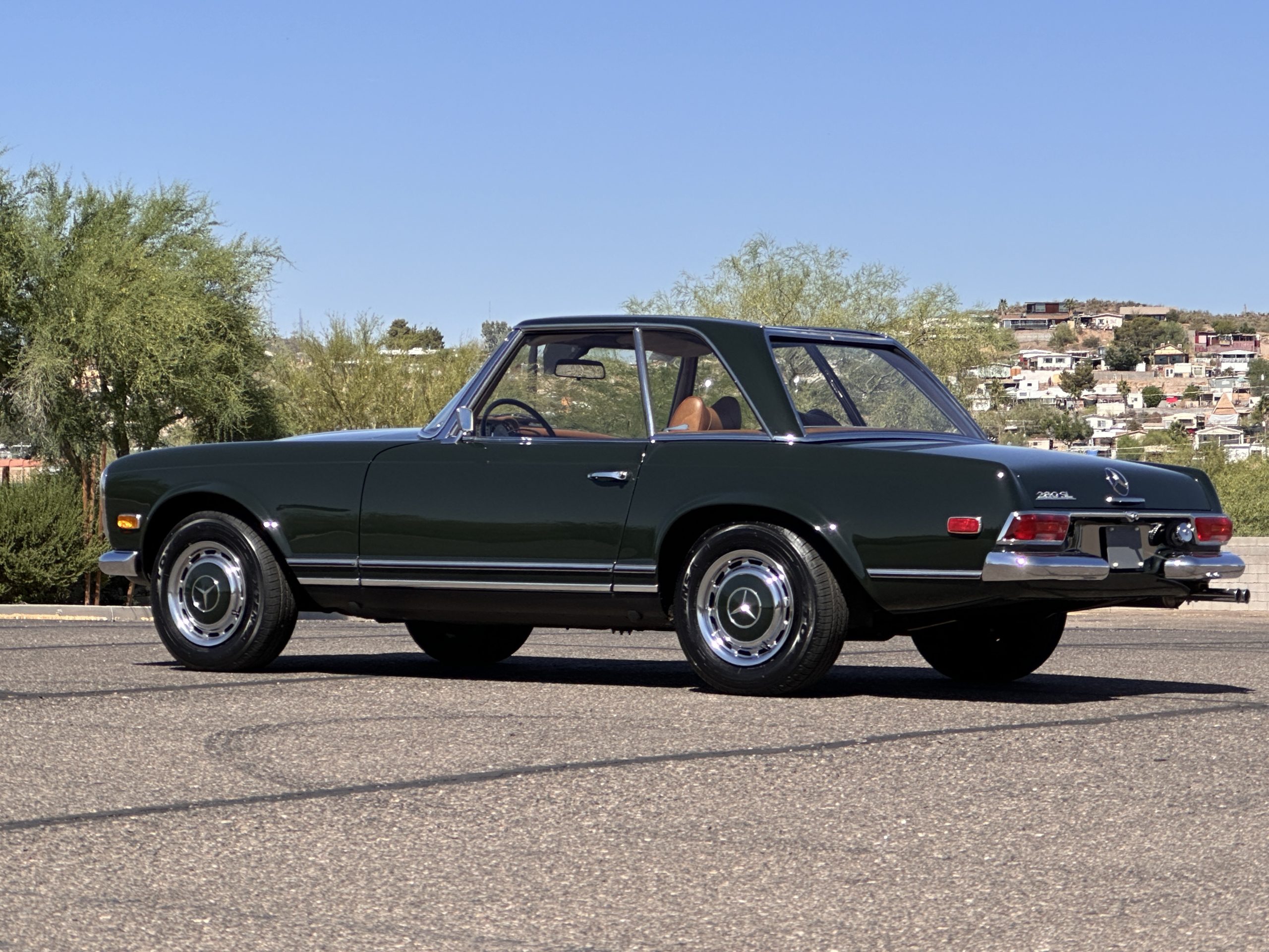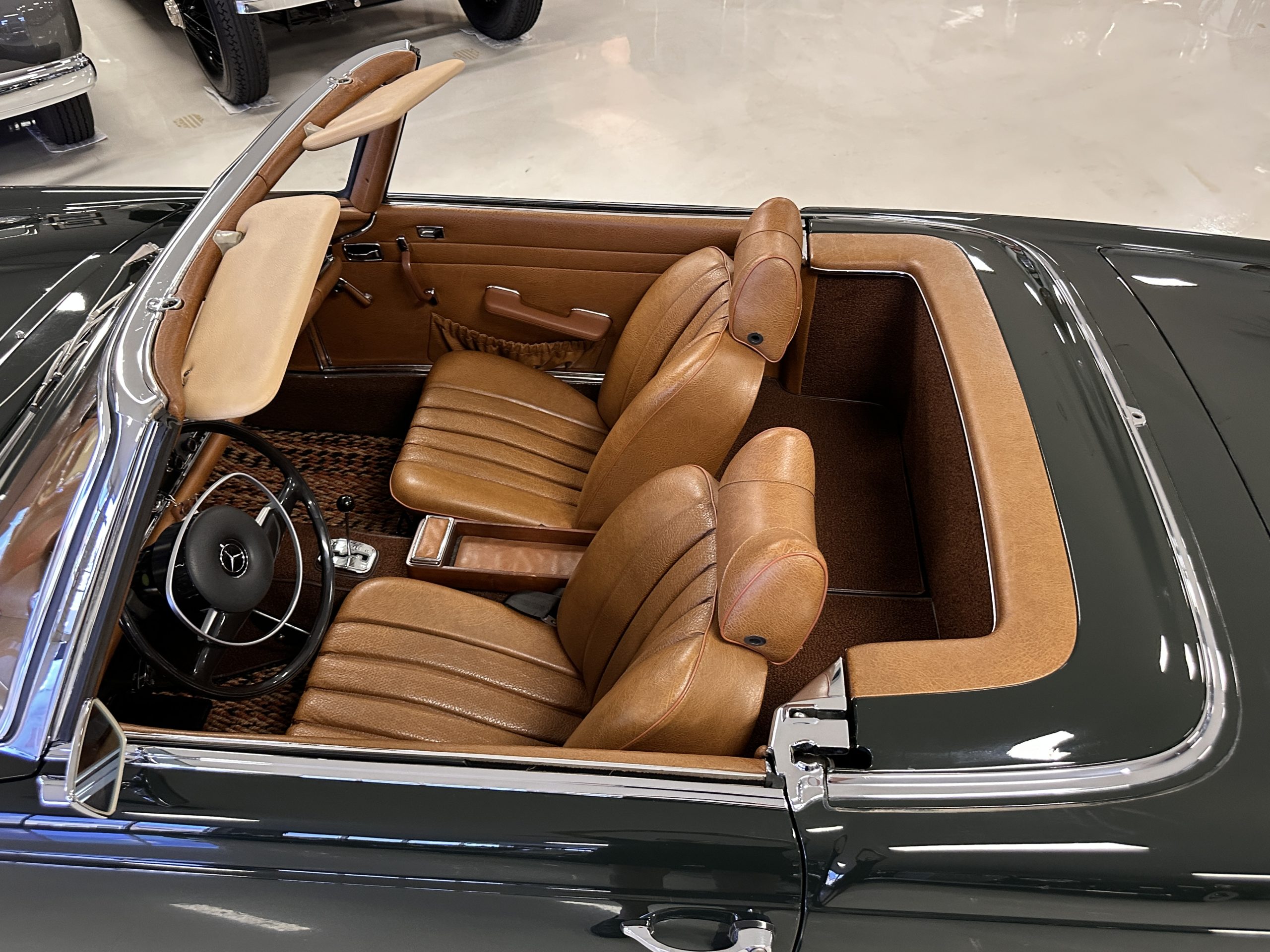 The livery is in concours-ready condition in its Dark Olive Green (Paint Code 291).  The paint is nearly perfect condition with a few very small imperfections that are only noticeable upon very close inspection (which is our role).  The body panel fit is perfect and all the important inspections for Pagoda’s check out: the spot welds in the engine compartment, the VIN stamp in the hood and hardtop, the notches in the headlight area, even the date code of July 1968 is revealed on the trunk seal.  Service stickers are still proudly displayed on the driver’s door from 1969 and 1970.  This 280SL is a proverbial time capsule.  The chrome and stainless-steel trim are all in excellent original condition.  The present owner had a Mercedes-Benz dealer install a new correct windshield and seals to add to the cars concours quality presentation.