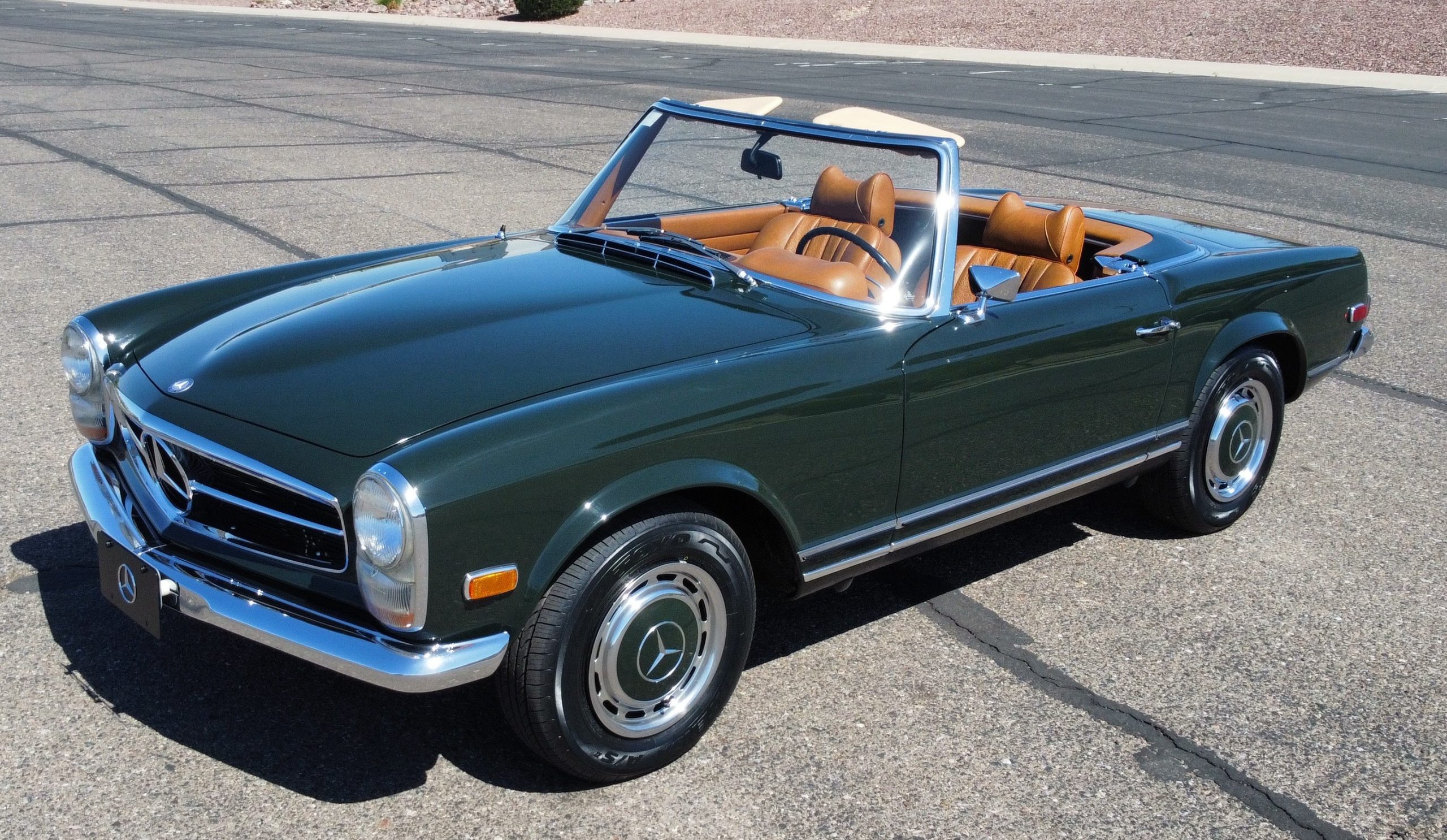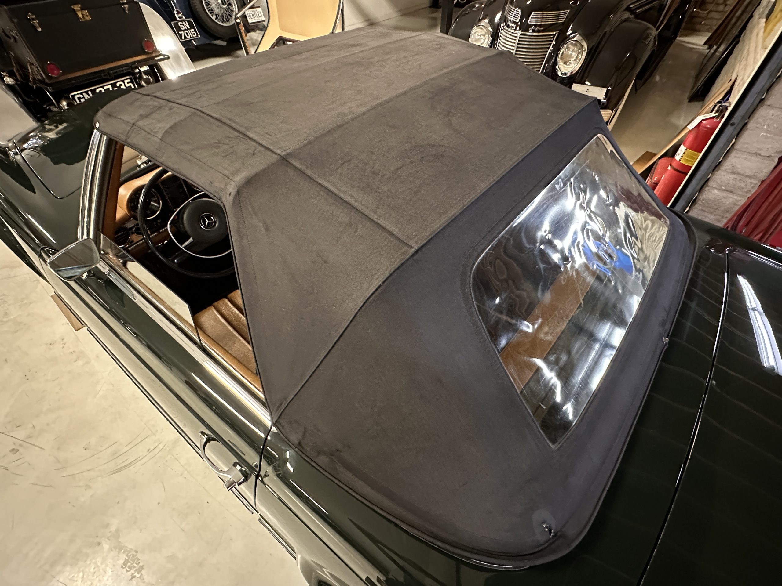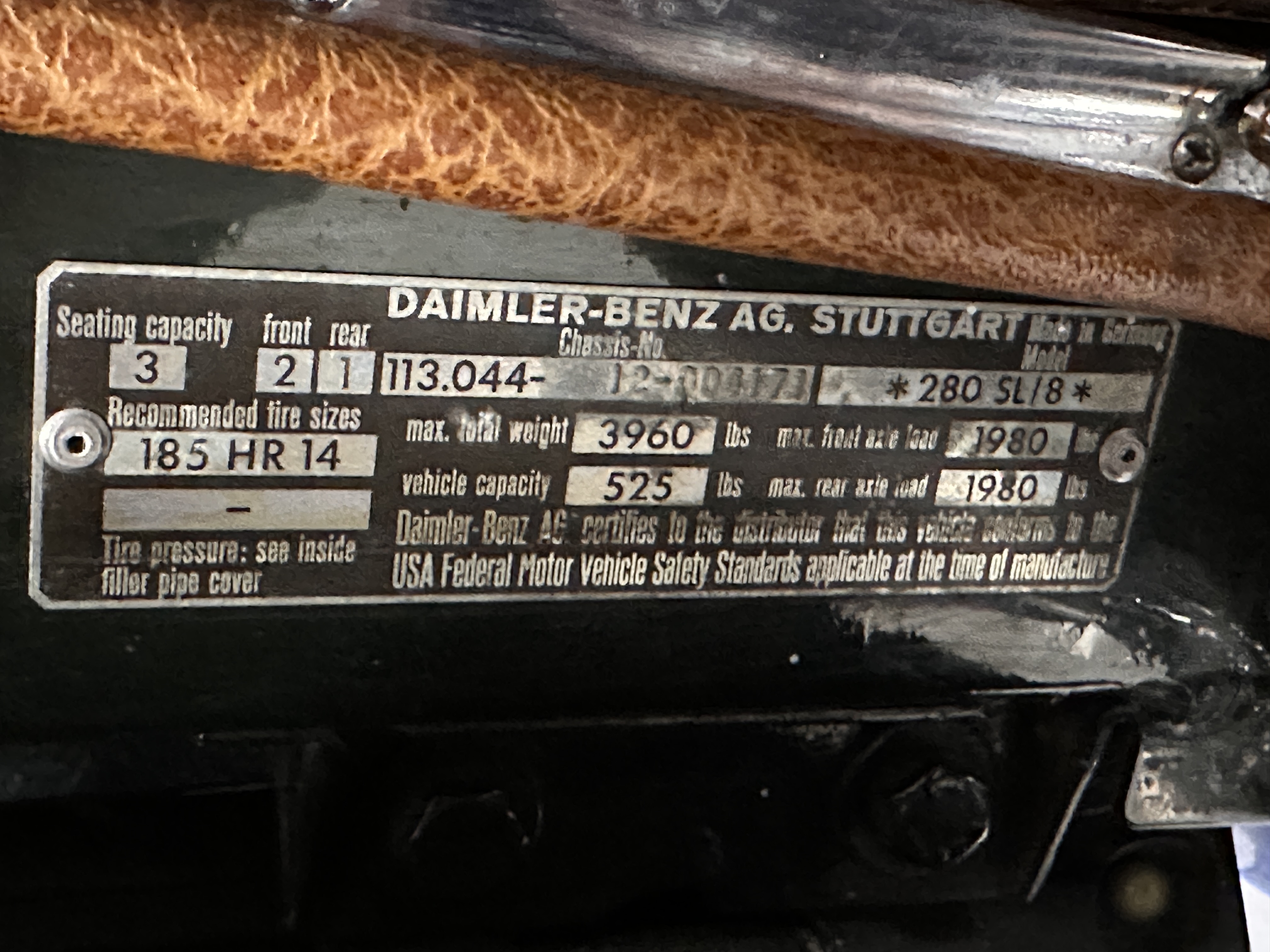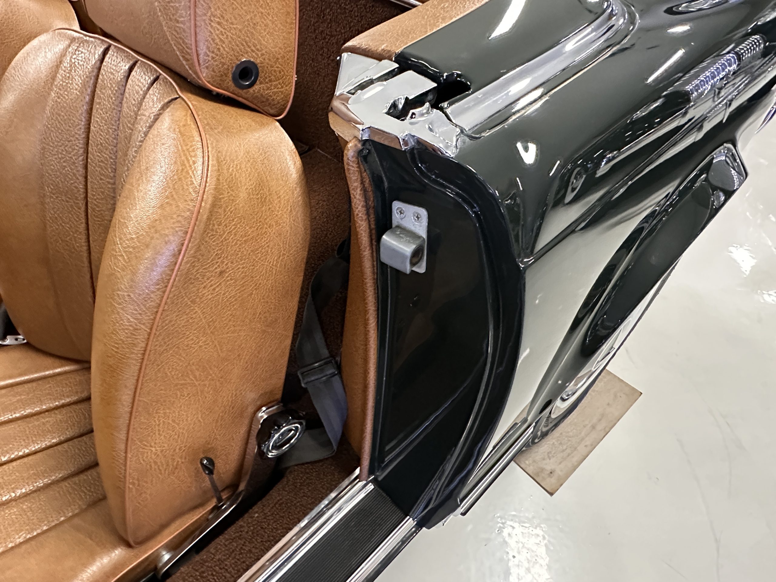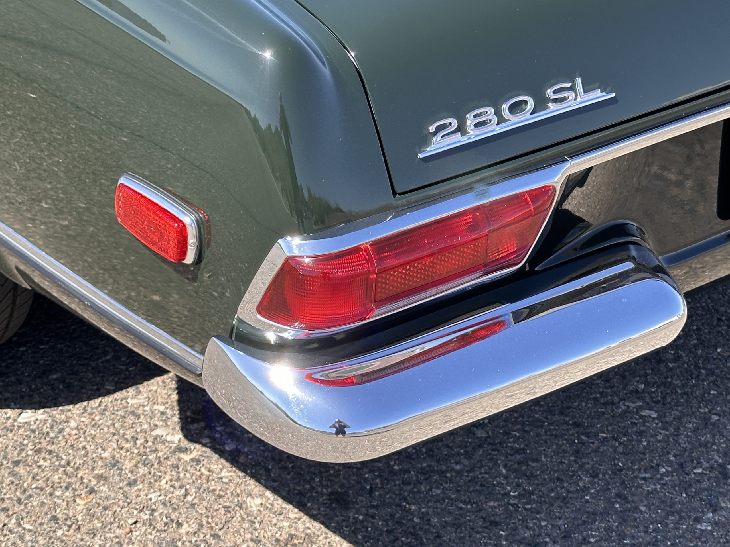 The livery is in concours-ready condition in its Dark Olive Green (Paint Code 291).  The paint is nearly perfect condition with a few very small imperfections that are only noticeable upon very close inspection (which is our role).  The body panel fit is perfect and all the important inspections for Pagoda’s check out: the spot welds in the engine compartment, the VIN stamp in the hood and hardtop, the notches in the headlight area, even the date code of July 1968 is revealed on the trunk seal.  Service stickers are still proudly displayed on the driver’s door from 1969 and 1970.  This 280SL is a proverbial time capsule.  The chrome and stainless-steel trim are all in excellent original condition.  The present owner had a Mercedes-Benz dealer install a new correct windshield and seals to add to the cars concours quality presentation.