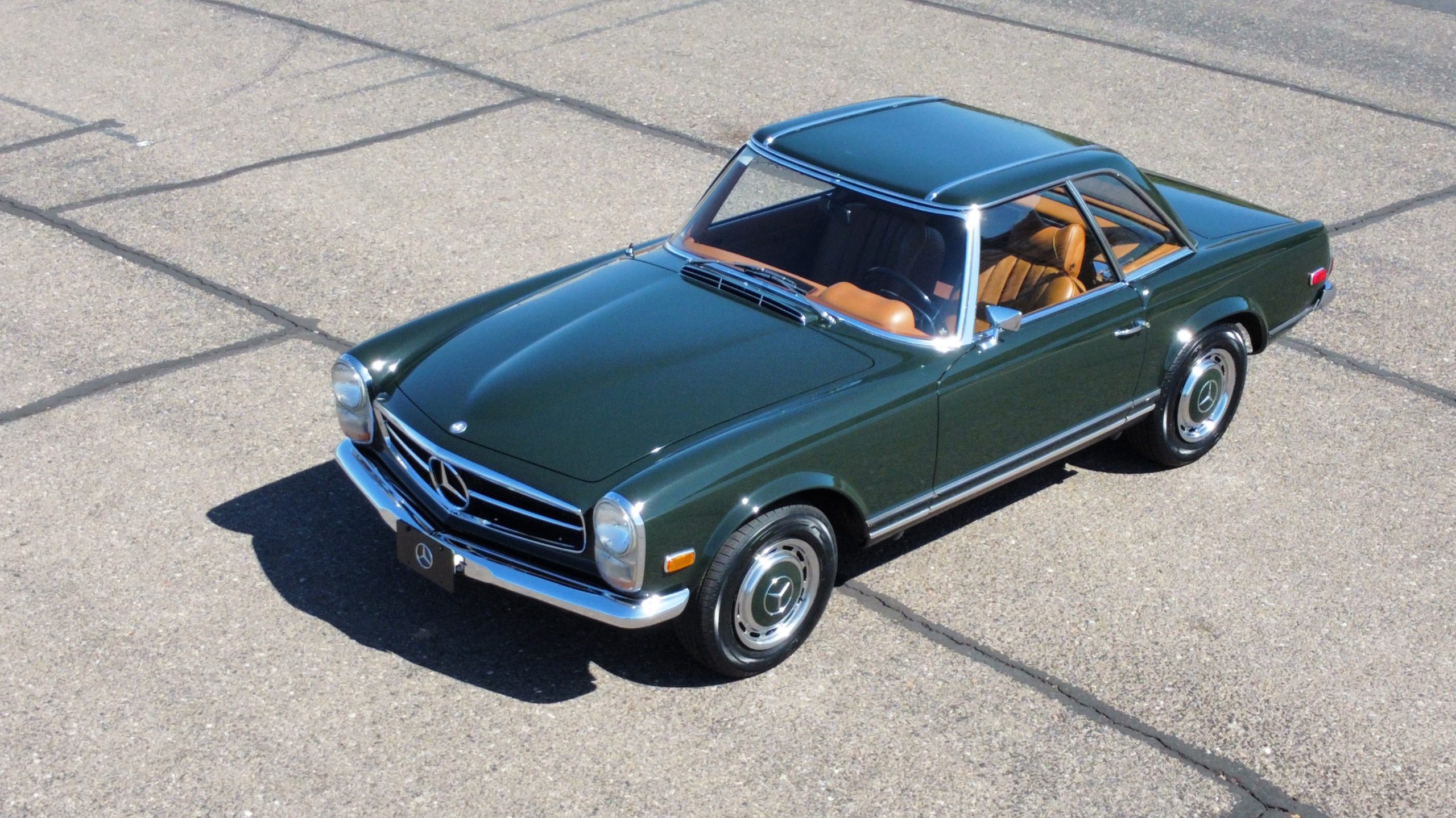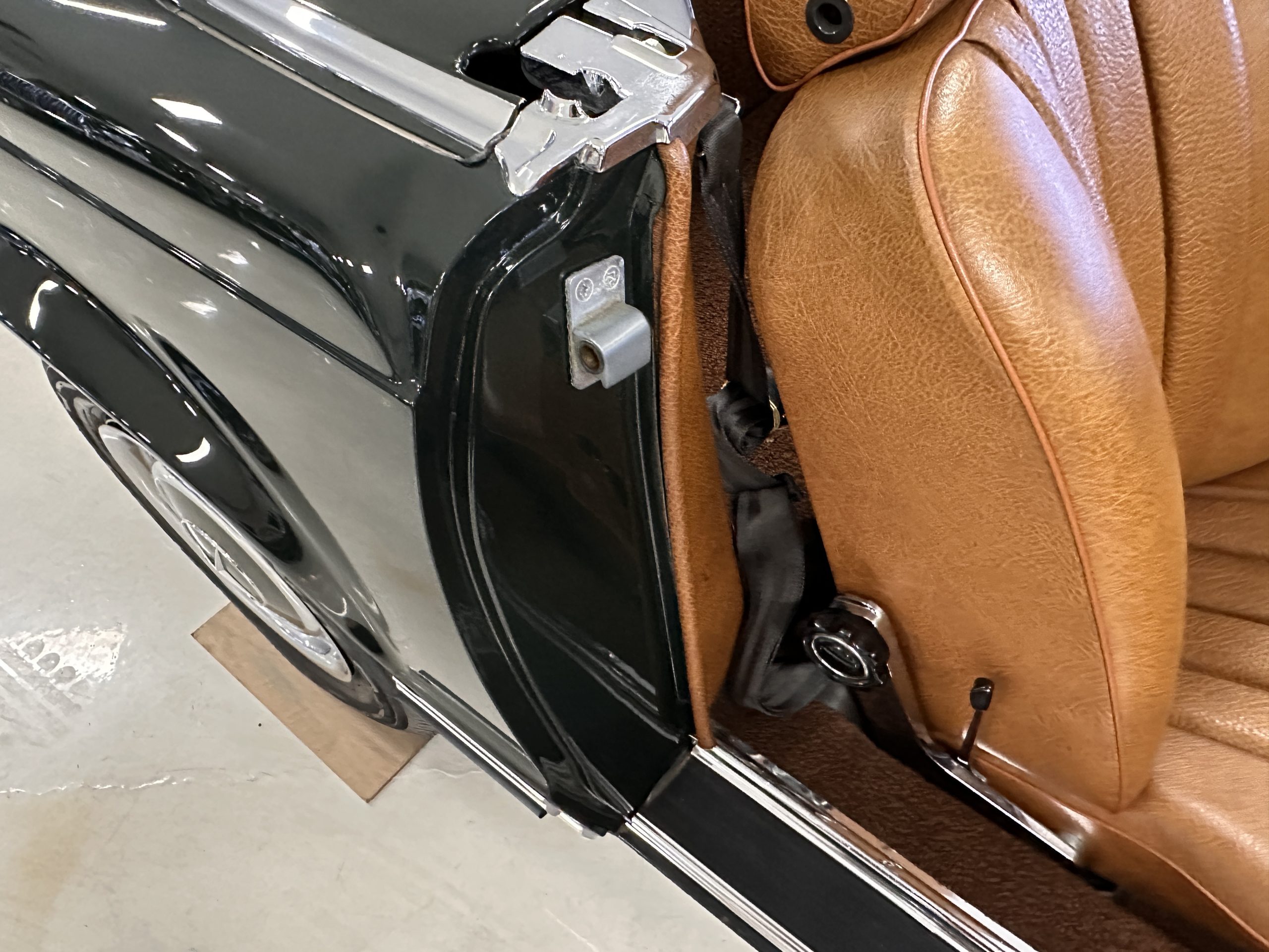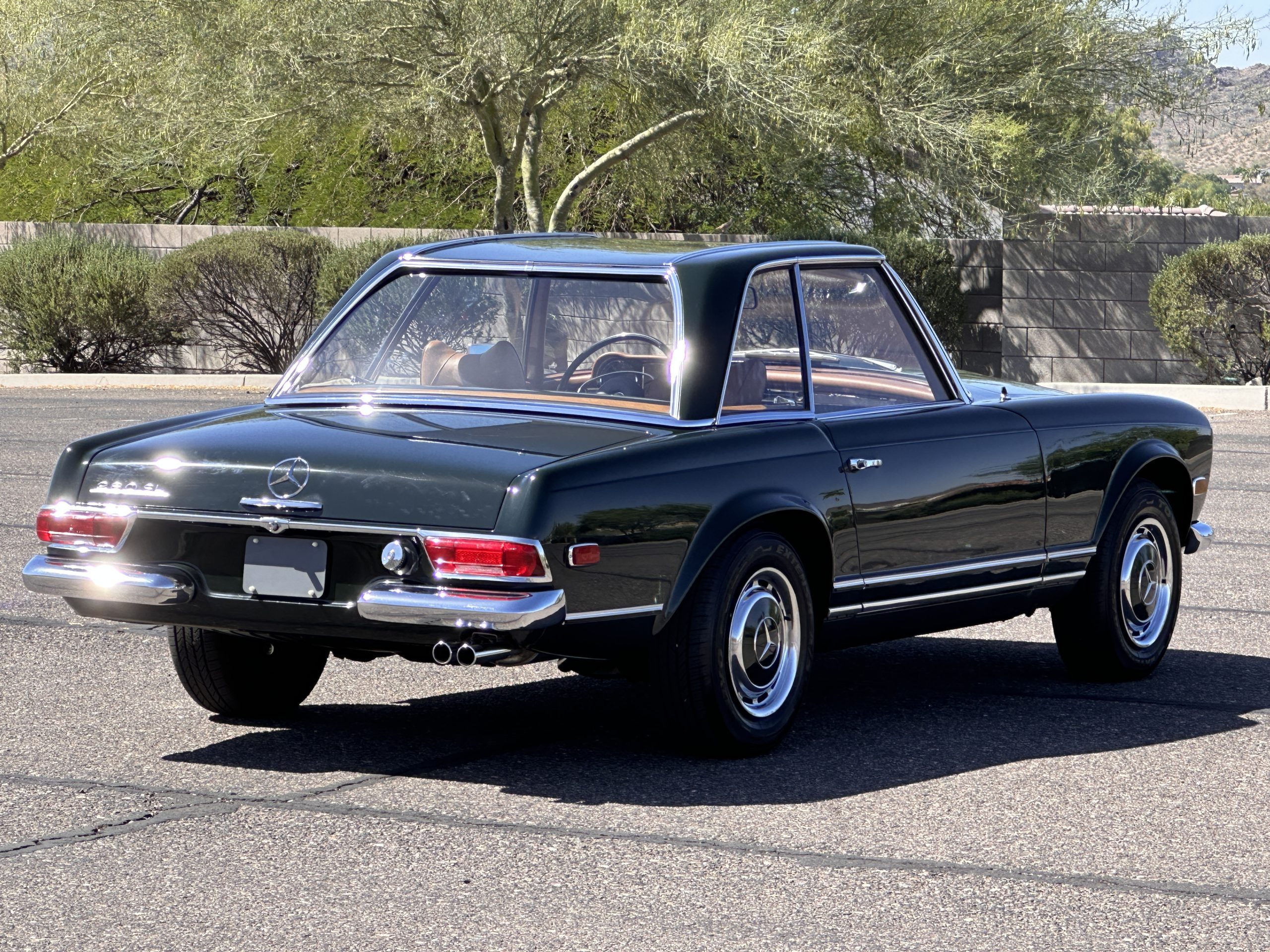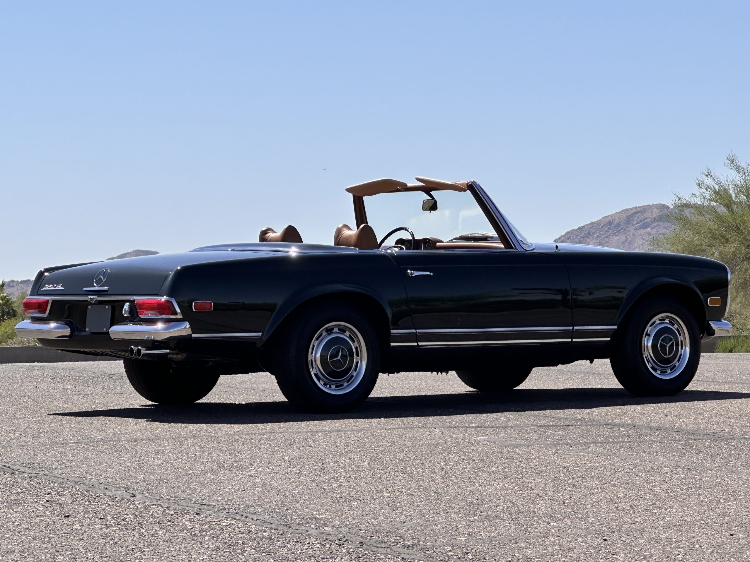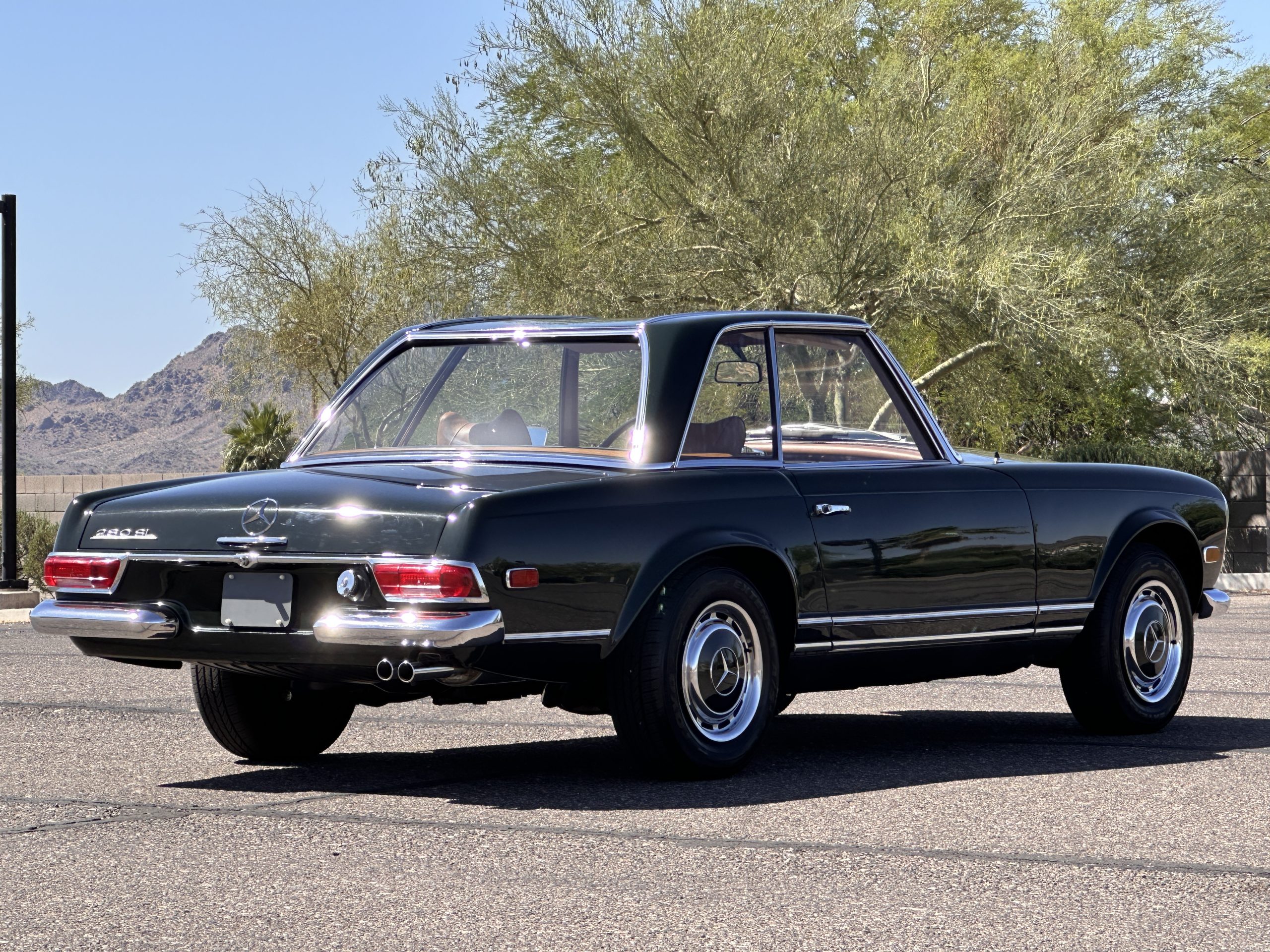 The livery is in concours-ready condition in its Dark Olive Green (Paint Code 291).  The paint is nearly perfect condition with a few very small imperfections that are only noticeable upon very close inspection (which is our role).  The body panel fit is perfect and all the important inspections for Pagoda’s check out: the spot welds in the engine compartment, the VIN stamp in the hood and hardtop, the notches in the headlight area, even the date code of July 1968 is revealed on the trunk seal.  Service stickers are still proudly displayed on the driver’s door from 1969 and 1970.  This 280SL is a proverbial time capsule.  The chrome and stainless-steel trim are all in excellent original condition.  The present owner had a Mercedes-Benz dealer install a new correct windshield and seals to add to the cars concours quality presentation.